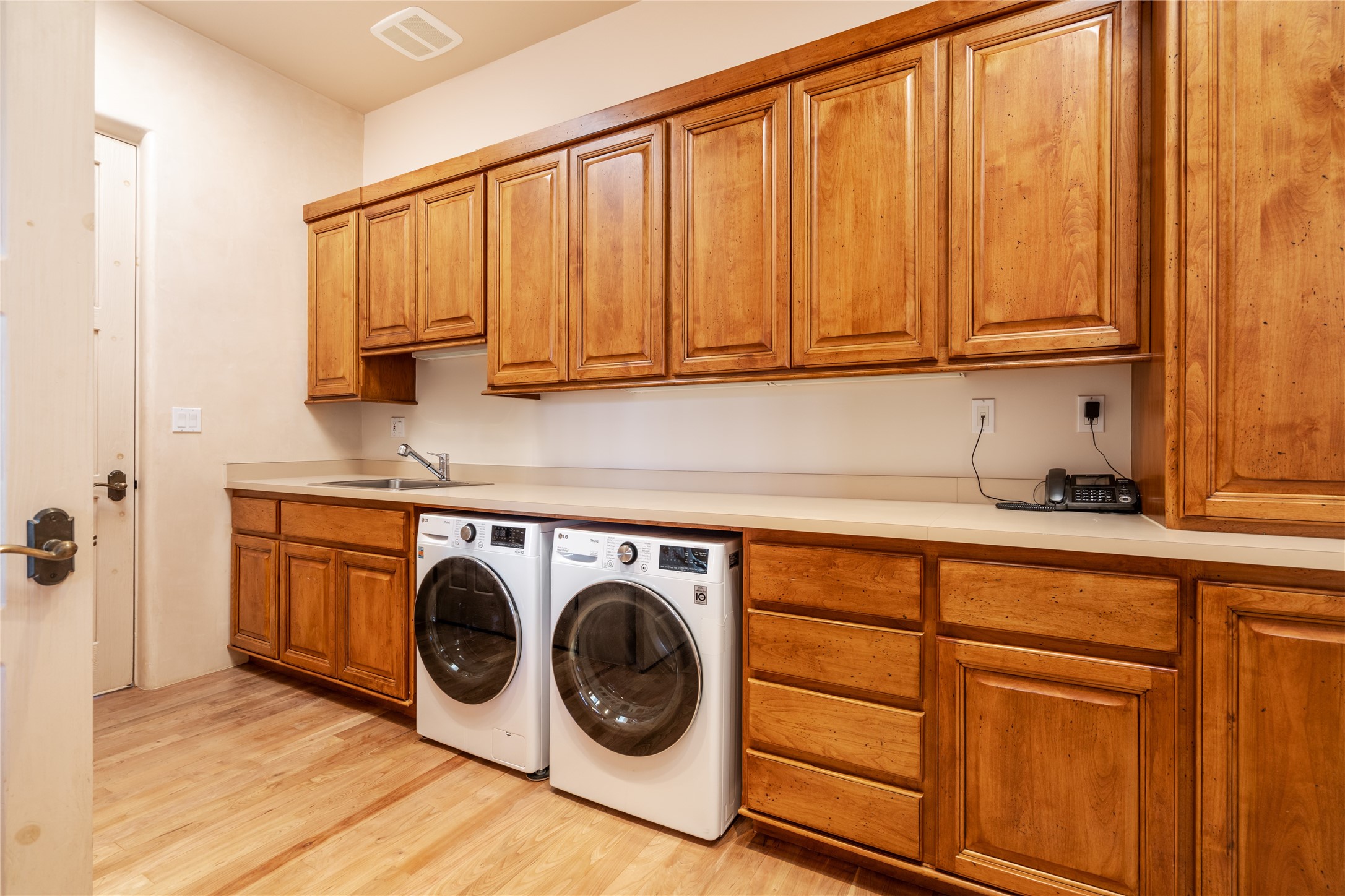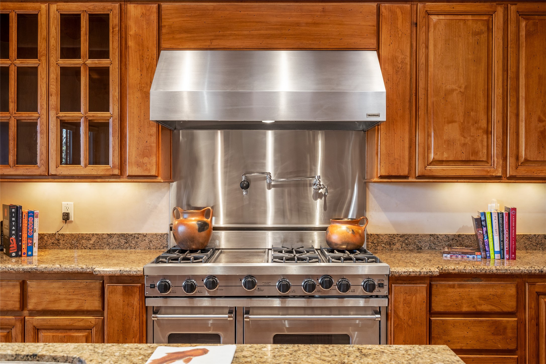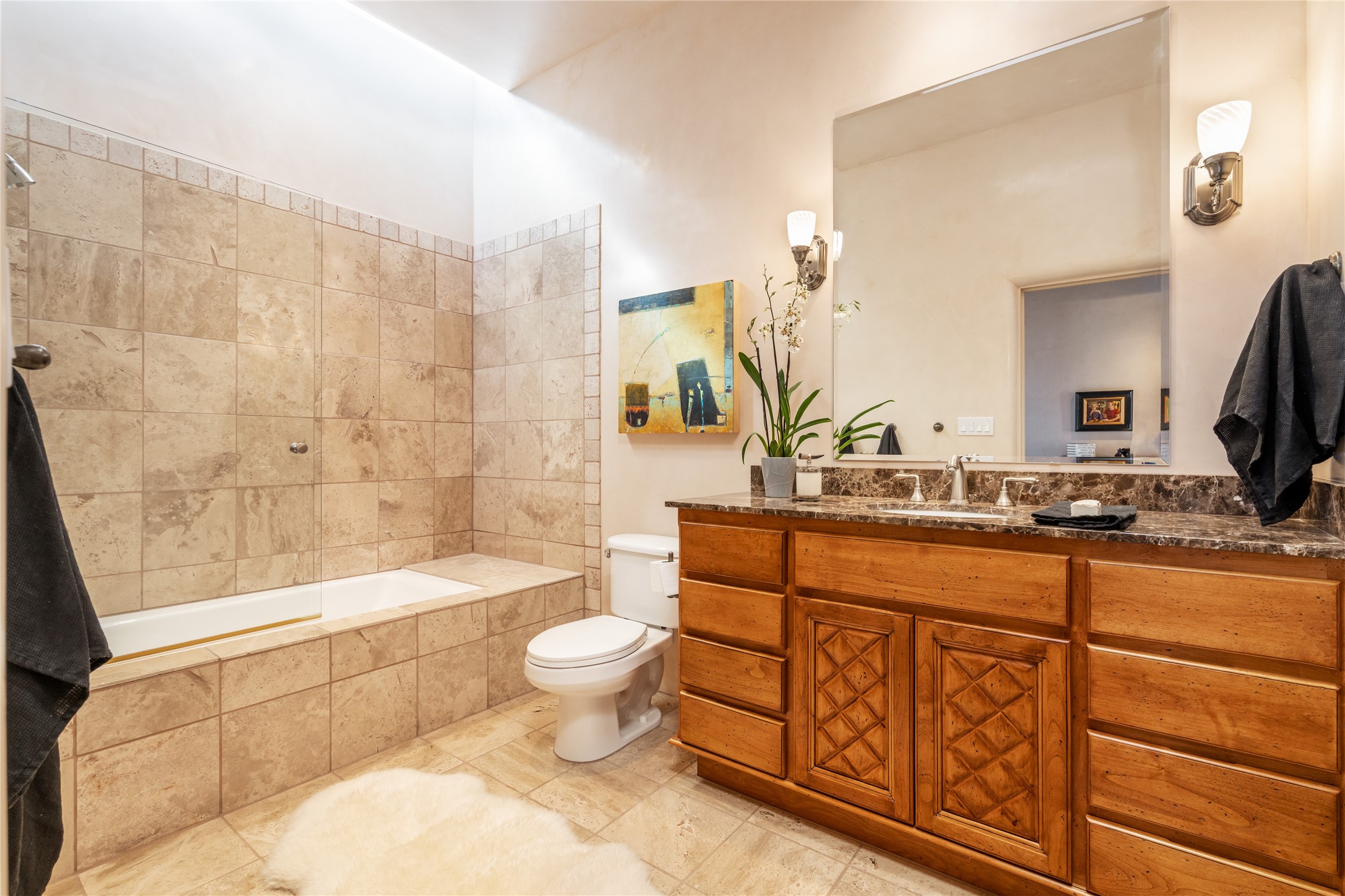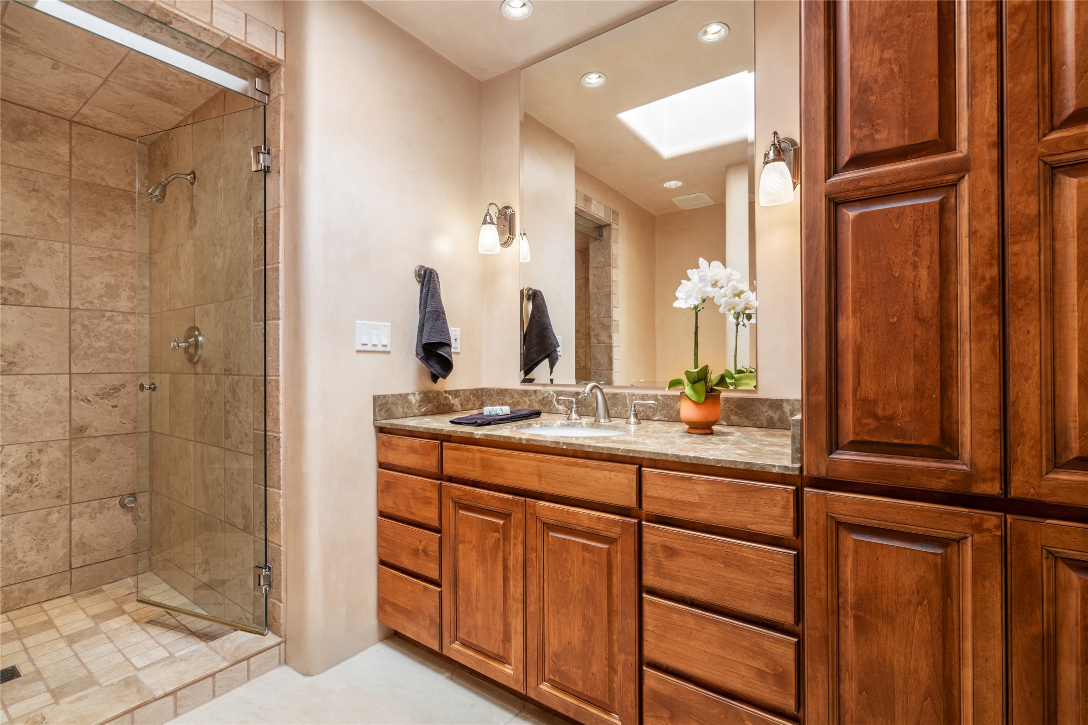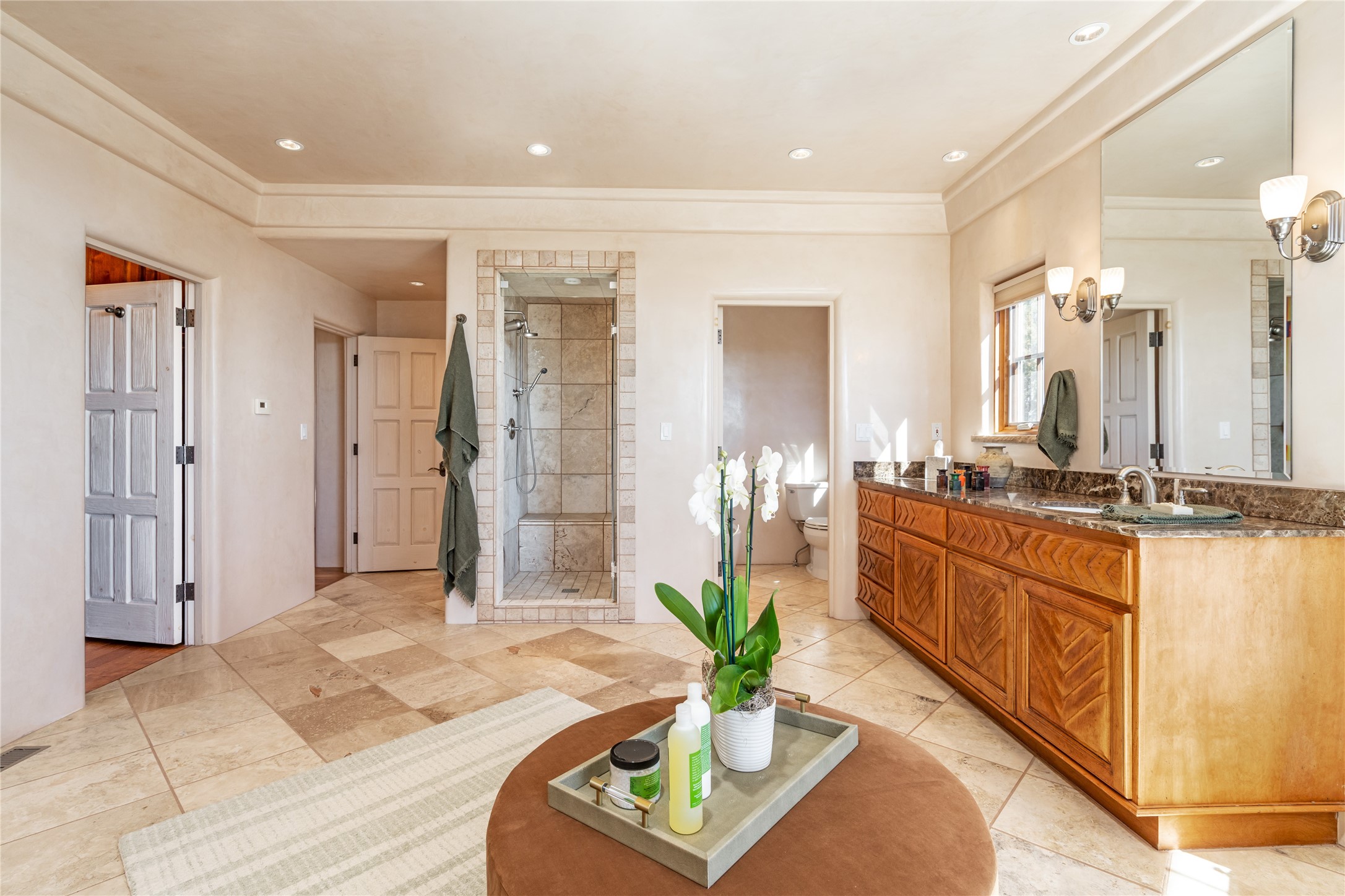 DYNAMIC AND CAPTIVATING MOUNTAIN VIEWS FROM THIS STUNNING LAS CAMPANAS ESTATE SITED HIGH ON A PRIME ELEVATED LOT AT THE END OF A TRANQUIL CUL-DE-SAC. This stunning estate captures the essence of Santa Fe living at its finest. Set on just over three acres, with sweeping views of the Sangre de Cristo mountains from every major room, the property offers a rare sense of privacy and luxe living. A beautifully landscaped courtyard welcomes you, with the soothing sound of water features and striking Anasazi stacked stone columns setting the stage for what awaits you inside. Enter through impressive tall wooden entry doors, and the mountains unfold before you - framed by warm wood and hand-detailed features. Traditional vigas stretch across the ceilings, while soft diamond plaster walls glow in the changing light of the day... With eight fireplaces throughout, the home feels both elegant and deeply comforting. Designed for effortless living and entertaining, the main house features formal and informal living and dining areas, a chef's kitchen with high-end appliances, and expansive counters. The home easily spans inside and outside areas - perfect for soaking in Santa Fe's breathtaking sunsets. The owner's suite is a retreat of its own, opening to the front courtyard and a private covered portal. A cozy sitting room, an oversized spa-like bath, and a custom walk-in closet set the tone for this personal sanctuary. Across the courtyard, the guest house offers a private space with its own bedroom, bath, and all the warmth of the main home. And when the moment calls for something truly special, the rooftop terrace offers a front-row seat to Santa Fe's endless vistas. Tucked just out of sight, the oversized yet discreet three-car garage keeps the home's approach pristine, allowing its timeless beauty to shine. This is more than just a home - it's an experience, a place where traditional Santa Fe charm meets refined comfort in the most effortless way.