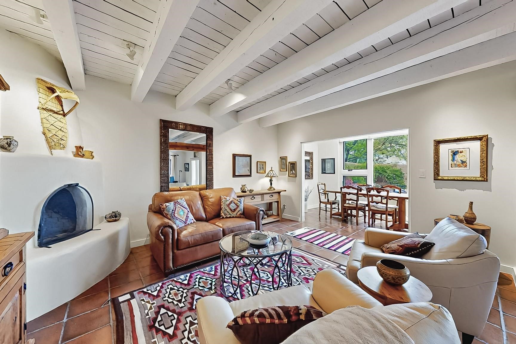 Perfectly located in the Historic Eastside, this 3 bedroom, 3 bath home with an attached 2 car garage is a rare offering. Located in the desirable La Vereda Compound, the home has been lovingly updated by the current and previous owners. Recent improvements include the kitchen with new counters and Miele appliances, central air conditioning and heating and bathroom upgrades. The open floor plan is perfect for entertaining and flows beautifully between the private patio and the living/dining areas. As an end unit it is bright and airy. The living room with a kiva fireplace, high ceilings, and glass roofed dining area is an inviting space. The drip irrigated, well landscaped gardens, with a zen-like water feature and mature trees offer a relaxing respite. The spacious upper-level primary bedroom suite features a kiva fireplace, walk-in closet, en-suite bath and opens onto a private deck overlooking the trees. The 2 guest bedrooms and baths are separated nicely offering privacy. The rarely found 2 car attached garage features a 220V vehicle charger, new opener, and bicycle storage. This home can be a perfect full-time residence or pied a tierre for a discerning buyer.