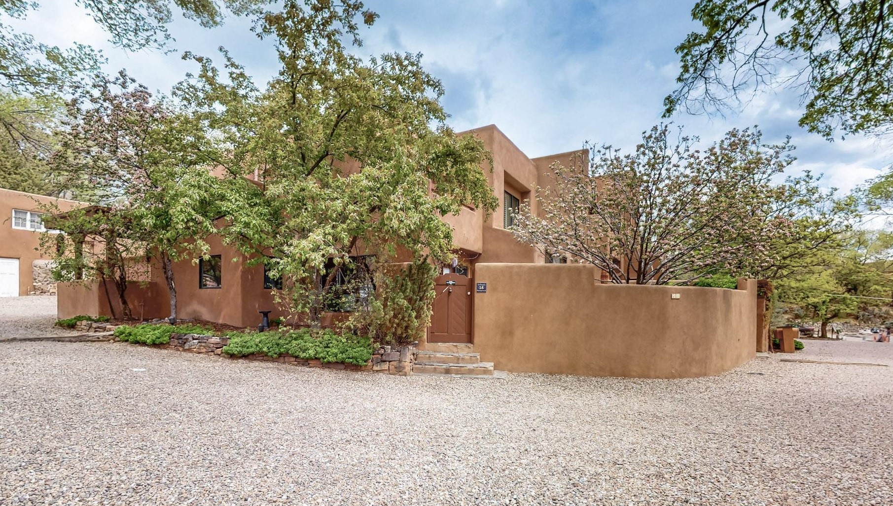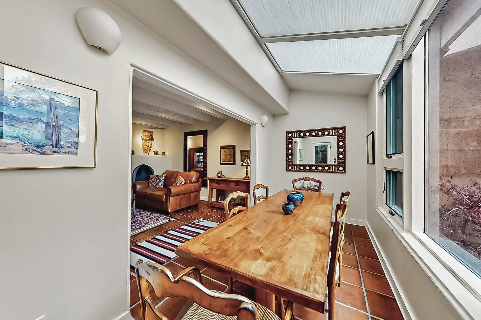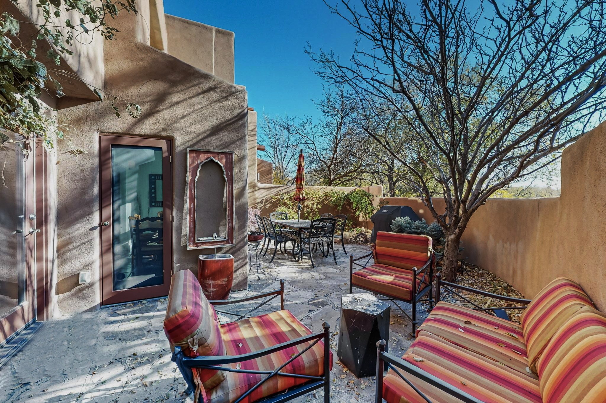 Perfectly located in the Historic Eastside, this 3 bedroom, 3 bath home with an attached 2 car garage is a rare offering. Located in the desirable La Vereda Compound, the home has been lovingly updated by the current and previous owners. Recent improvements include the kitchen with new counters and Miele appliances, central air conditioning and heating and bathroom upgrades. The open floor plan is perfect for entertaining and flows beautifully between the private patio and the living/dining areas. As an end unit it is bright and airy. The living room with a kiva fireplace, high ceilings, and glass roofed dining area is an inviting space. The drip irrigated, well landscaped gardens, with a zen-like water feature and mature trees offer a relaxing respite. The spacious upper-level primary bedroom suite features a kiva fireplace, walk-in closet, en-suite bath and opens onto a private deck overlooking the trees. The 2 guest bedrooms and baths are separated nicely offering privacy. The rarely found 2 car attached garage features a 220V vehicle charger, new opener, and bicycle storage. This home can be a perfect full-time residence or pied a tierre for a discerning buyer.