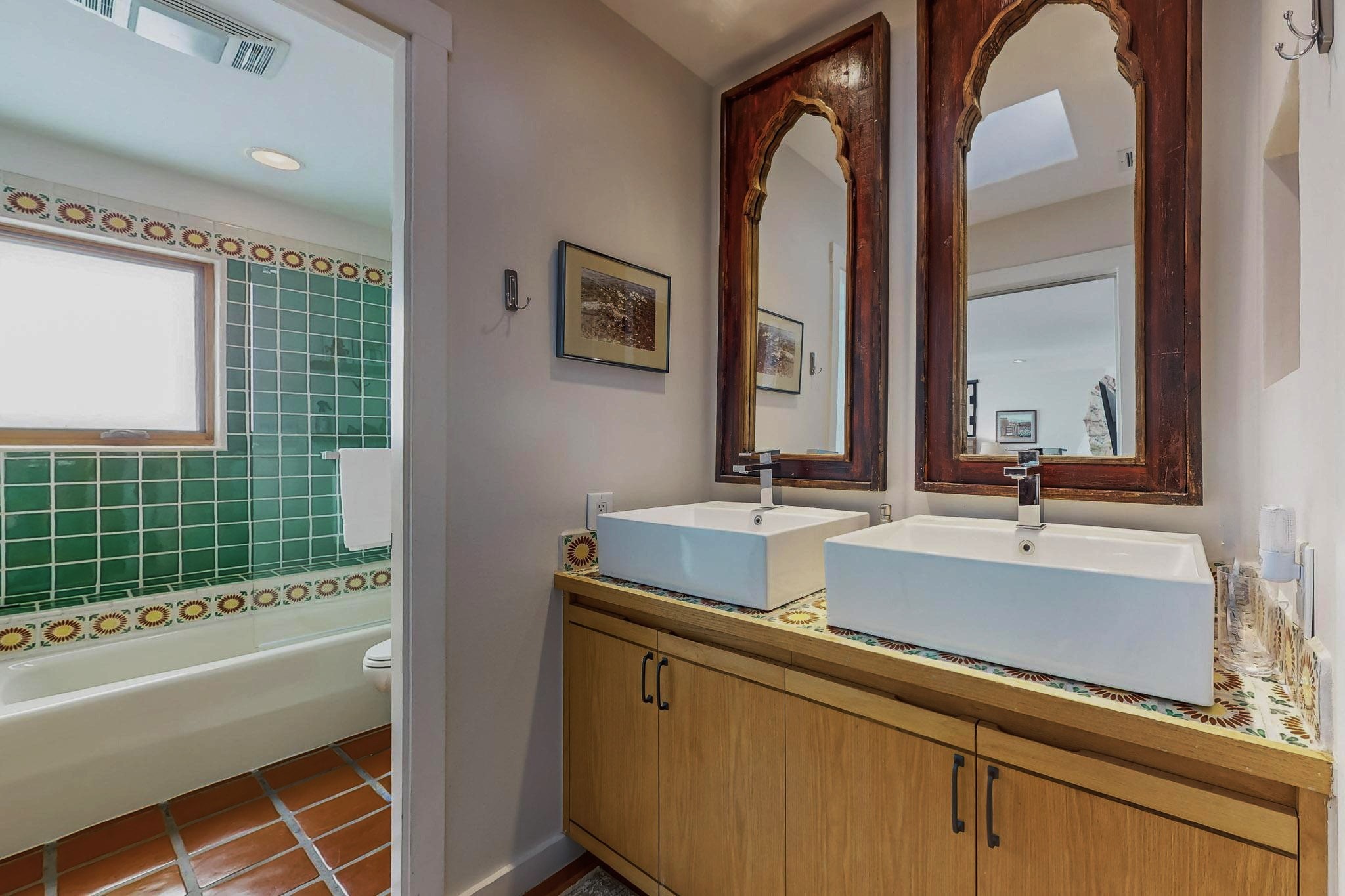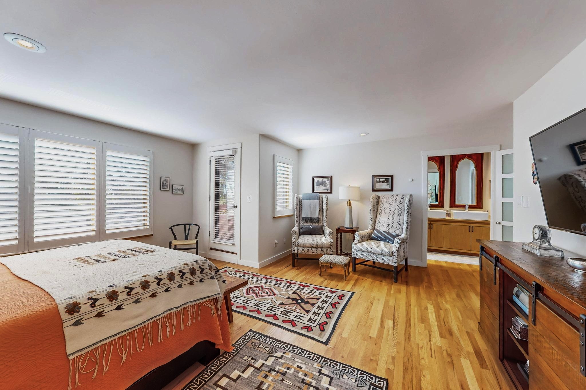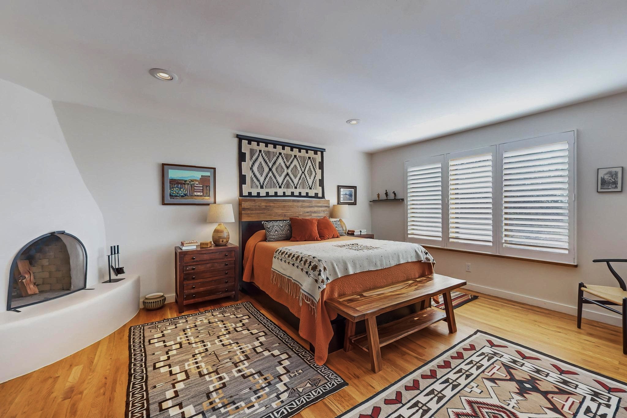 Perfectly located in the Historic Eastside, this 3 bedroom, 3 bath home with an attached 2 car garage is a rare offering. Located in the desirable La Vereda Compound, the home has been lovingly updated by the current and previous owners. Recent improvements include the kitchen with new counters and Miele appliances, central air conditioning and heating and bathroom upgrades. The open floor plan is perfect for entertaining and flows beautifully between the private patio and the living/dining areas. As an end unit it is bright and airy. The living room with a kiva fireplace, high ceilings, and glass roofed dining area is an inviting space. The drip irrigated, well landscaped gardens, with a zen-like water feature and mature trees offer a relaxing respite. The spacious upper-level primary bedroom suite features a kiva fireplace, walk-in closet, en-suite bath and opens onto a private deck overlooking the trees. The 2 guest bedrooms and baths are separated nicely offering privacy. The rarely found 2 car attached garage features a 220V vehicle charger, new opener, and bicycle storage. This home can be a perfect full-time residence or pied a tierre for a discerning buyer.
