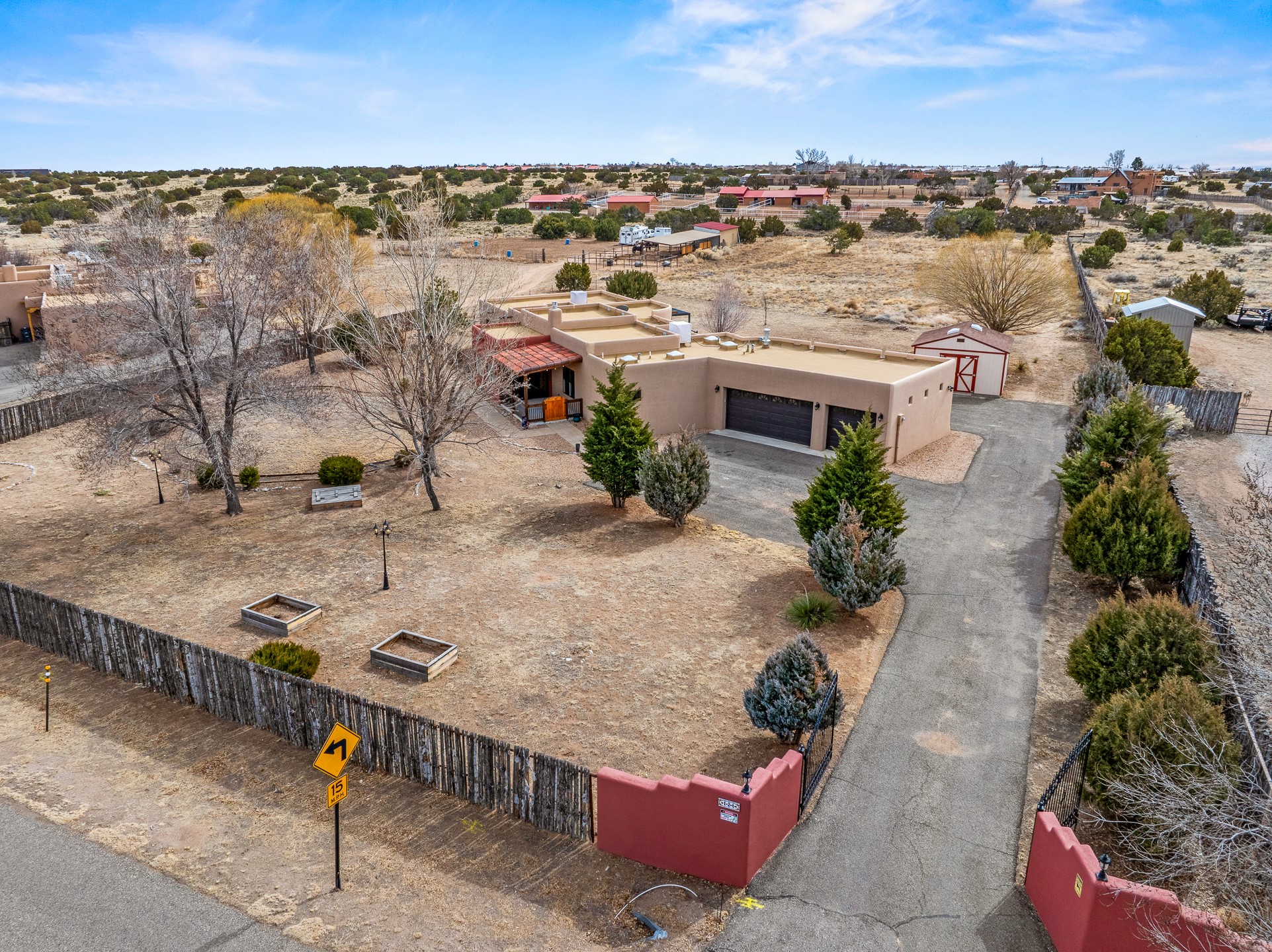 This beautiful single-level home boasts a spacious 2,727 +/- square foot split-bedroom floor plan with 4 bedrooms, a sunroom, 3 full baths, and a 3-car garage. 2025: home has been appx 80% re-stuccoed, & is situated on a fenced & gated 2.5-acre lot with breathtaking mountain views in all directions, offering a serene rural setting allowing horses, no HOA, just minutes from hospitals, restaurants, & grocery stores. The large kitchen is a chef's dream, featuring NEW MOSAIC TILE BACKSPLASH, abundant cabinetry & drawers for ample storage, granite countertops, an island/breakfast bar, pantry and stainless-steel appliances. Adjacent to the kitchen is the formal dining room with tiled accents and plaster finished wall/ceiling. The grand living room impresses with high ceilings, vigas, can lighting, and a REMODELED GAS FIREPLACE WITH MANTLE. From the living room, step into the NEW SUNROOM, which opens to a NEW COVERED PORCH perfect for relaxing & enjoying the views. The spacious owner's suite has NEW ENGINEERED WOOD FLOORING, walk-in closet with built-ins, vigas with tongue & groove ceiling and a ceiling fan. The ensuite bath has a NEW TUB, NEW LOVELY TILED SHOWER, AND NEW DOUBLE SINK VANITY. Additional bedrooms are thoughtfully designed with ample space & functionality. The hall bath has been updated with a NEW VANITY, while the laundry room, complete with plentiful cabinets and drawers, a skylight, and an NEWELY ADDED SINK, offers convenience and style. Many wonderful features and amenities include: Radiant heat-2 Evaporative cooling units-Tons of skylights-Wood doors-NEW PERGOLA-NEW 16X16 TUFF SHED (13K)-Plaster finish walls-Hunter Douglas blinds-Ceiling fans-NEW BRICK TILED ACCENT WALLS in hallway-Plenty of wall space for artwork-FRESHLY PAINTED INTERIOR (Almost every room)-Multiple covered enclosed patios, perfect for outdoor living, and entertaining. This property combines comfort and functionality with stunning views. Please read agent only remarks.