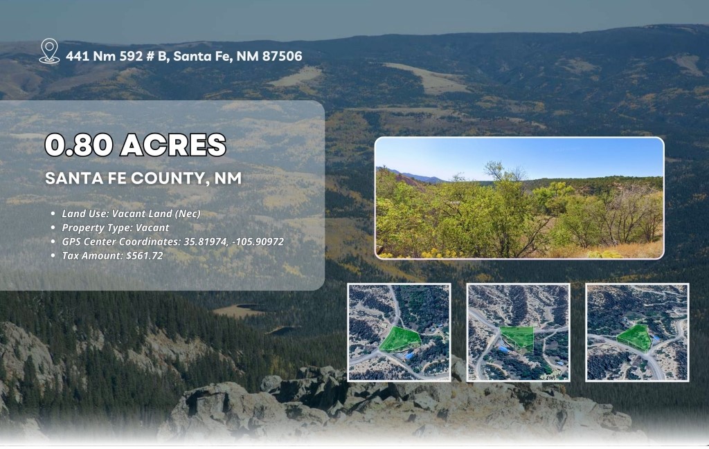 Nestled in the heart of Santa Fe County, this .8 acre property along NM-592 offers a rare opportunity to own land in one of New Mexico's most breathtaking regions. Located just 12.8 miles north of downtown Santa Fe, this lot provides a perfect balance of seclusion and convenience, making it an ideal investment for those seeking tranquility while staying close to modern amenities. Surrounded by stunning mountain landscapes and endless outdoor adventure, this property is a dream for nature lovers. Explore the many nearby trails, take in the fresh mountain air and enjoy the peaceful surroundings that make this area so special. Whether you're looking to build a private retreat, a vacation getaway or a forever home, this land provides endless possibilities. With its prime location and easy access to Santa Fe's vibrant arts, culture and dining scene, this property is perfect for those who want the best of both worlds. Don't miss out on this opportunity to invest in one of New Mexico's.