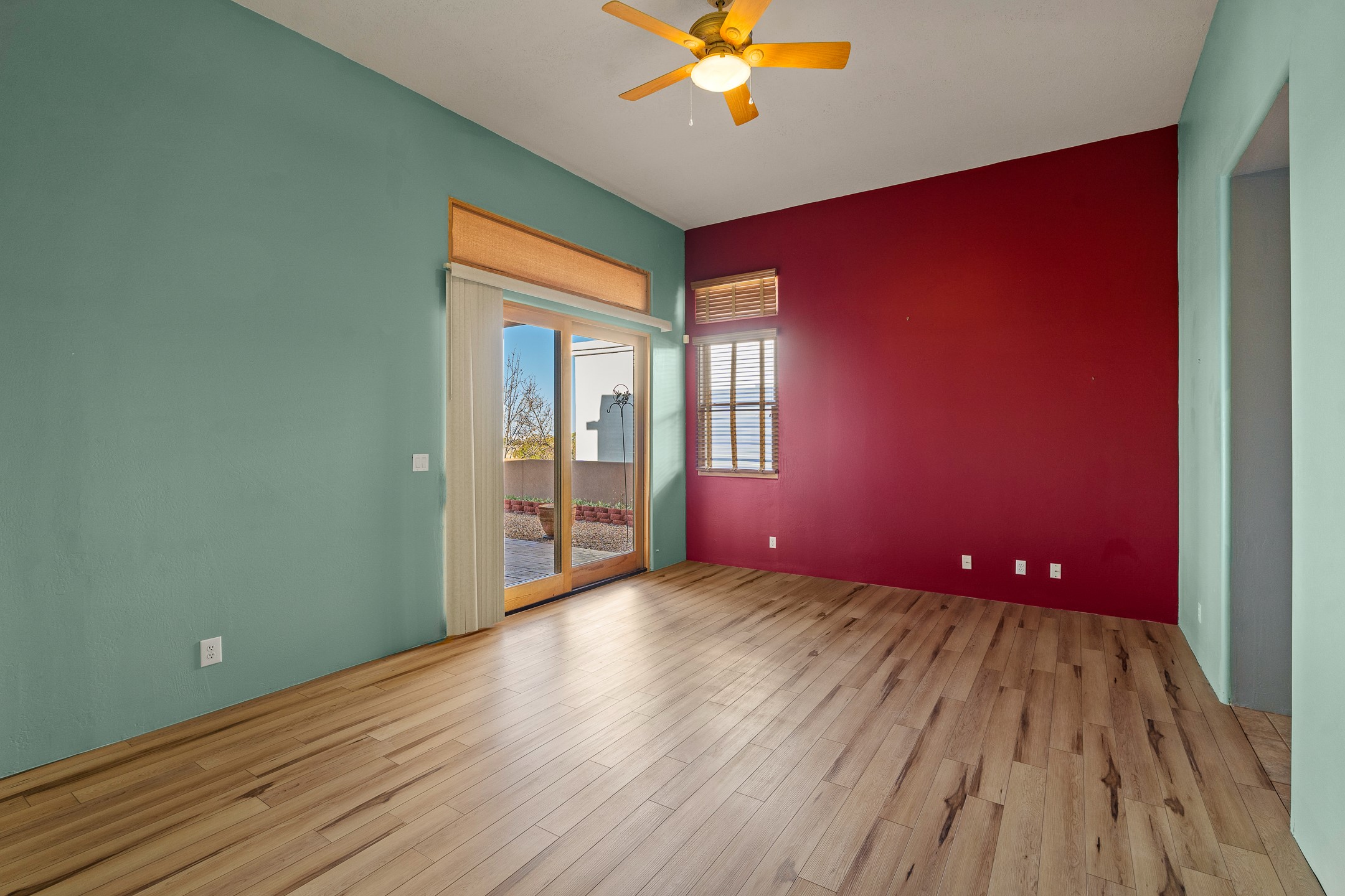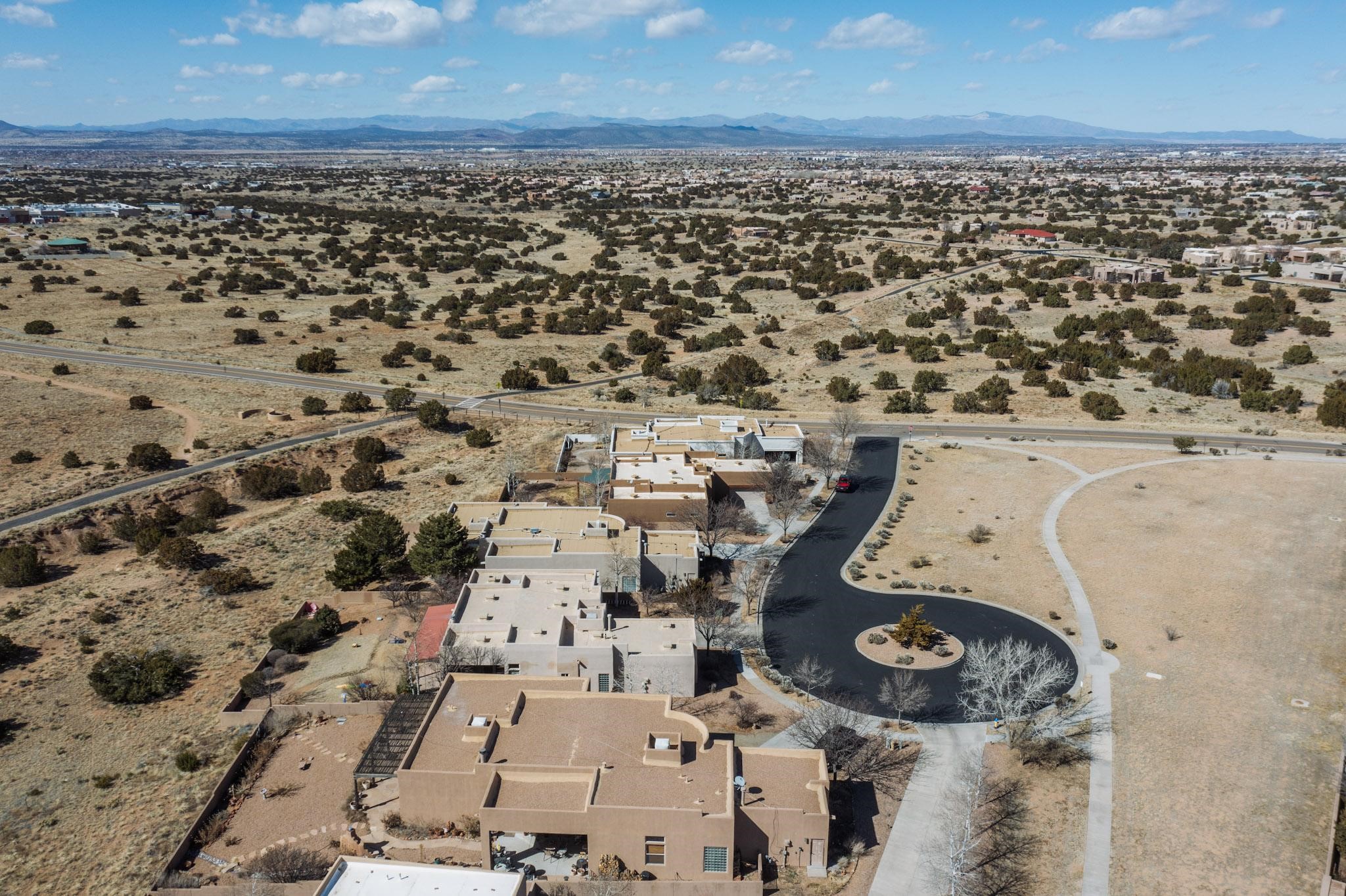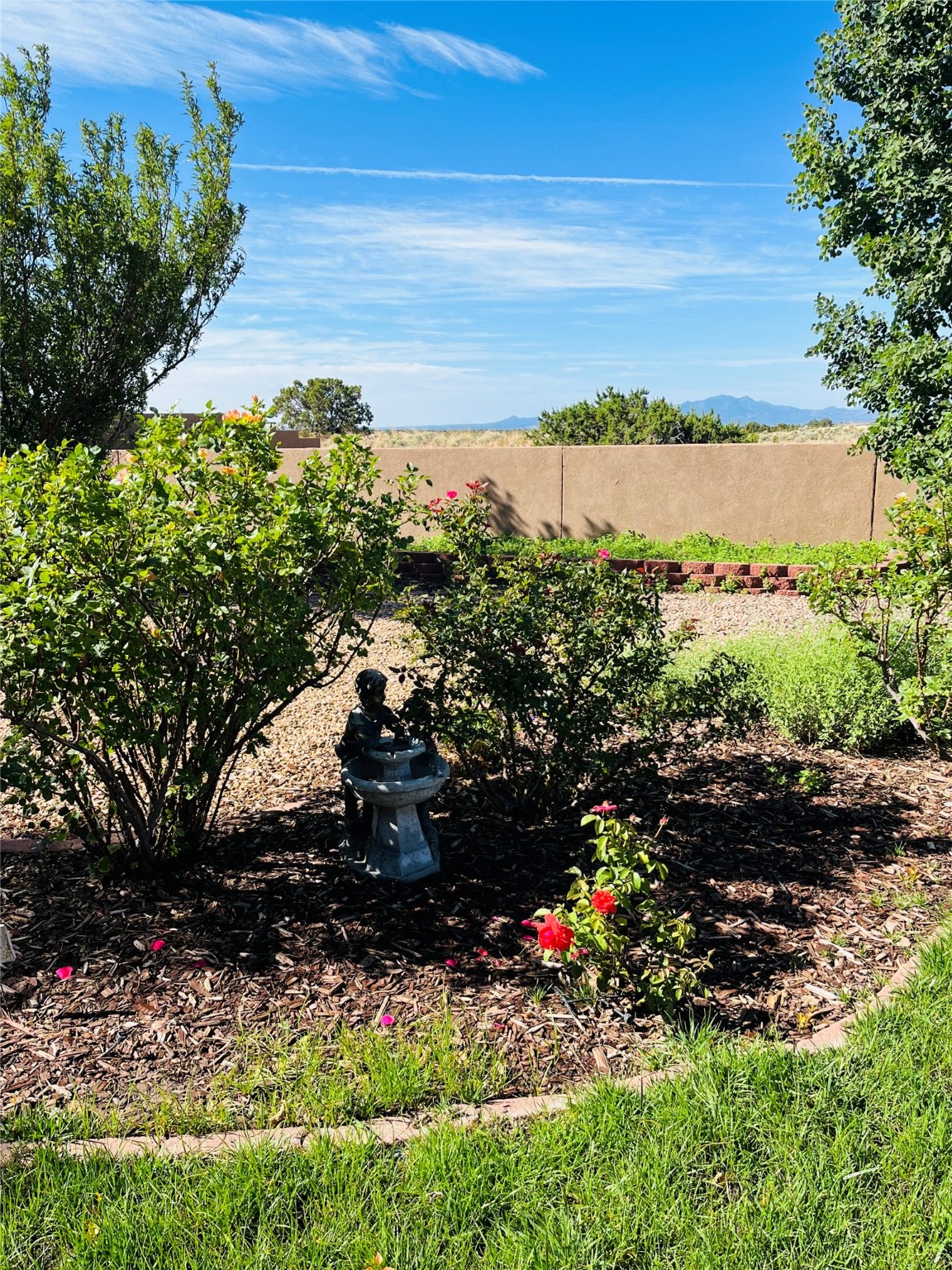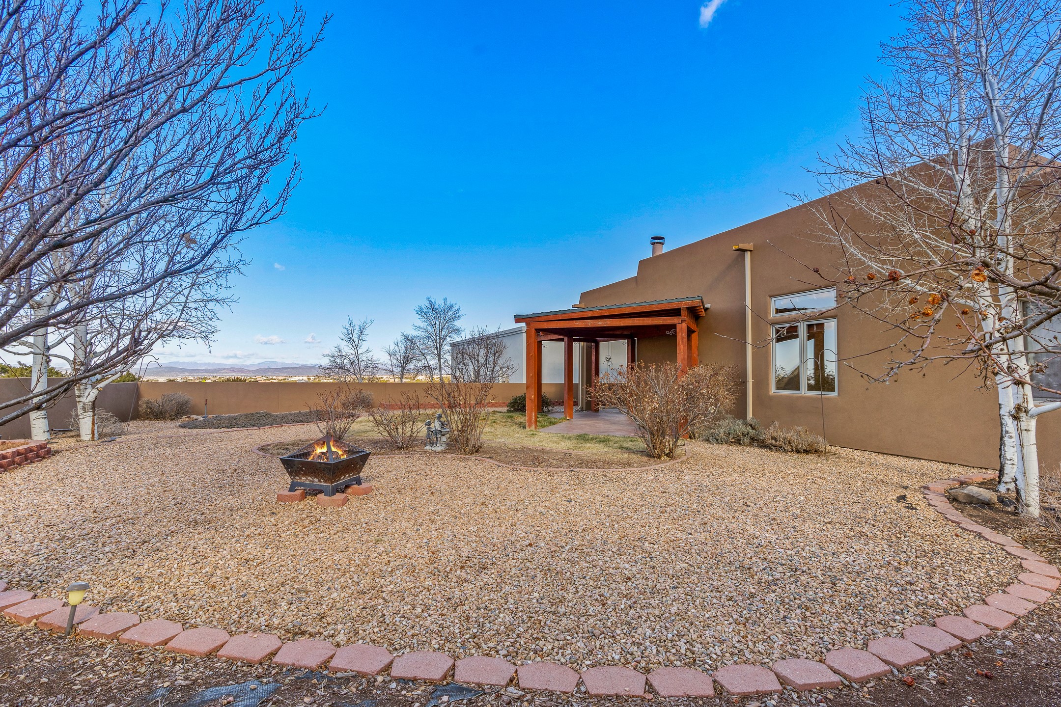 Mountain views from every room. On a quiet cul-de-sac street with open space in front and back of home with spectacular sunsets and views from the back yard. This recently updated Pueblo-style home in Rancho Viejo with new roof, new stucco, fresh interior paint, fully remodeled primary bath, added covered portal and granite island in kitchen is on a premium lot backing to vast greenbelt. The popular Mesa Verde open floor plan has four bedrooms and three full baths plus lots of usable space and storage room. The versatile 4th bedroom with private bath can serve as office, guest room, library or den. Large walled backyard for landscaping and pets with fruit trees. Behind the home is part of the 15 miles of paved walking/biking trails in the neighborhood. Near everything in Santa Fe but just far enough out for a quiet, peaceful life.
