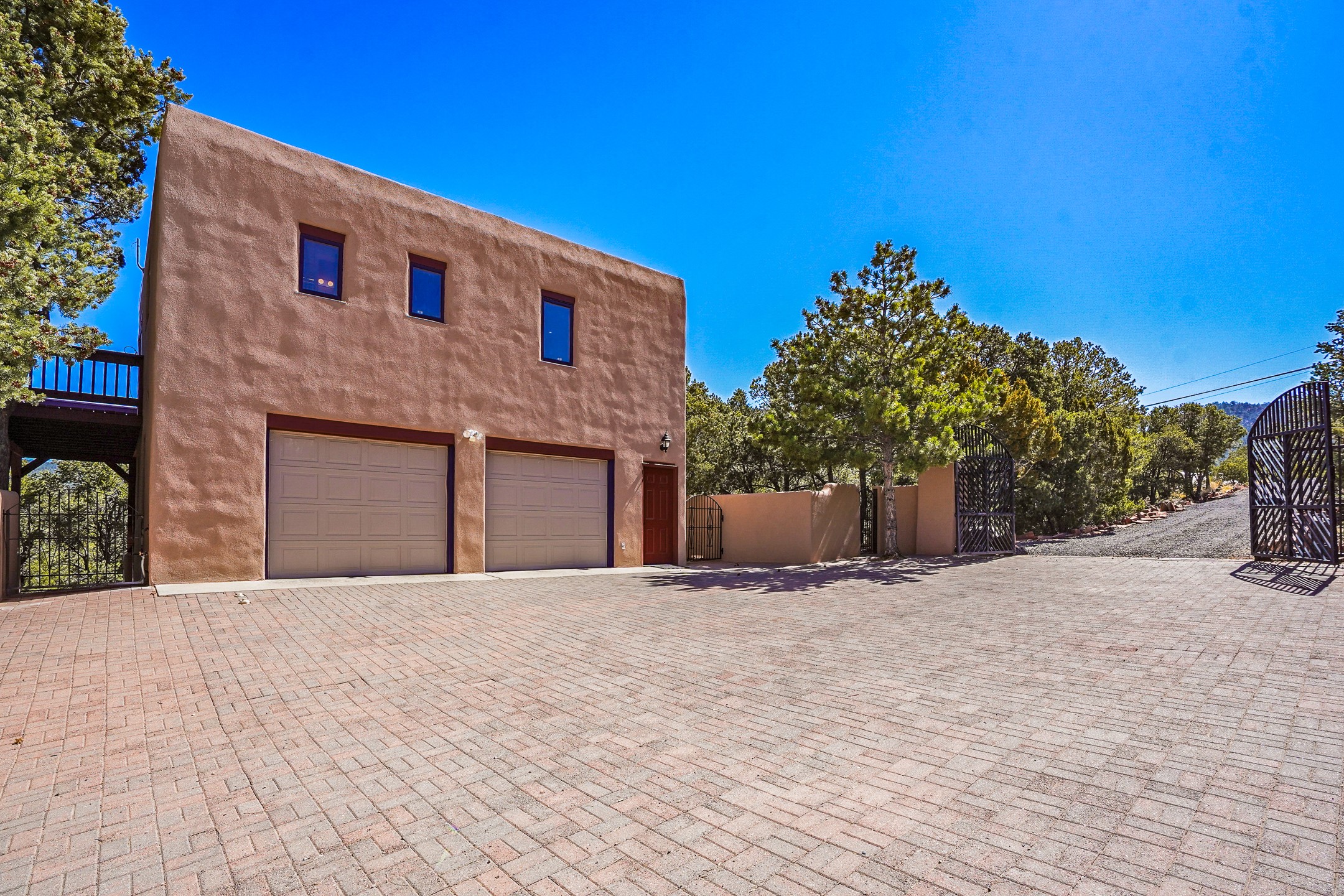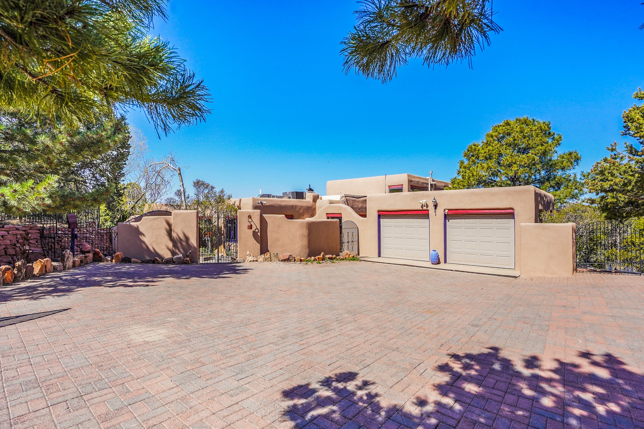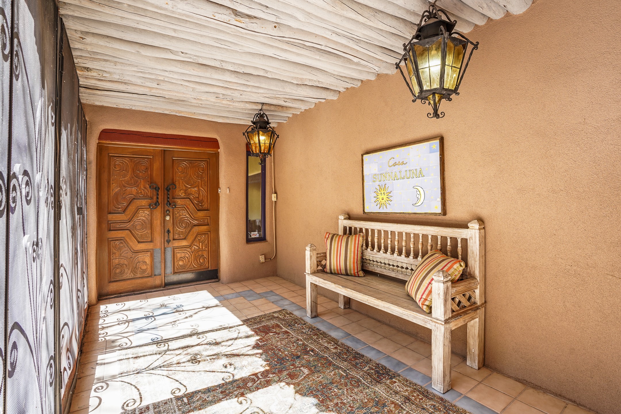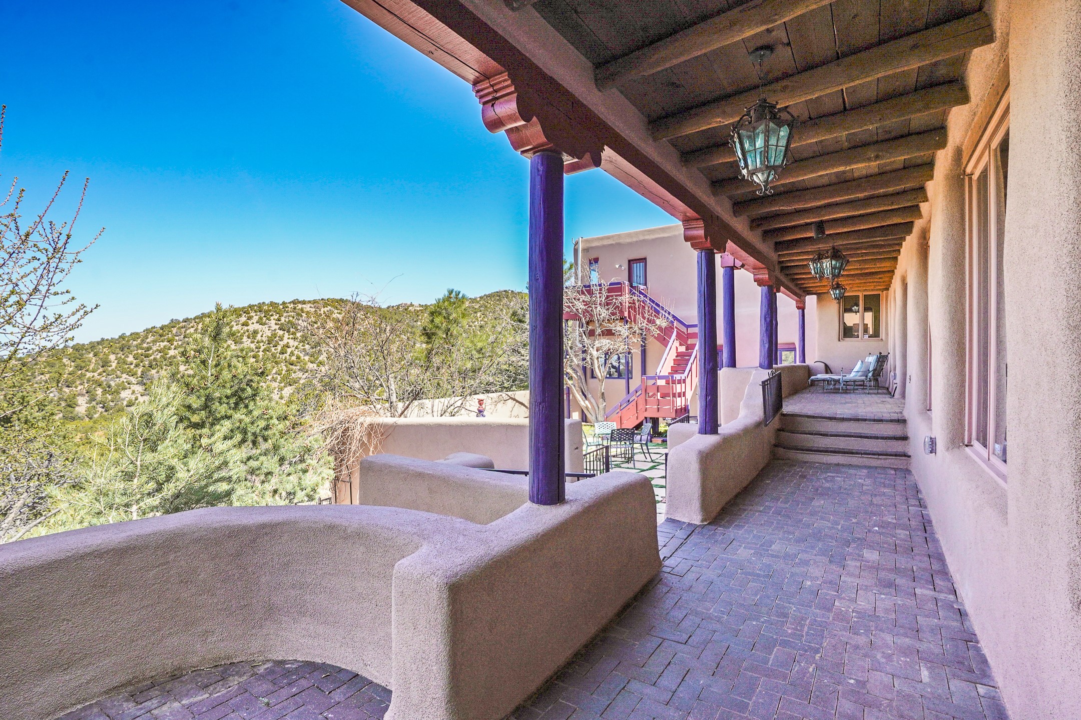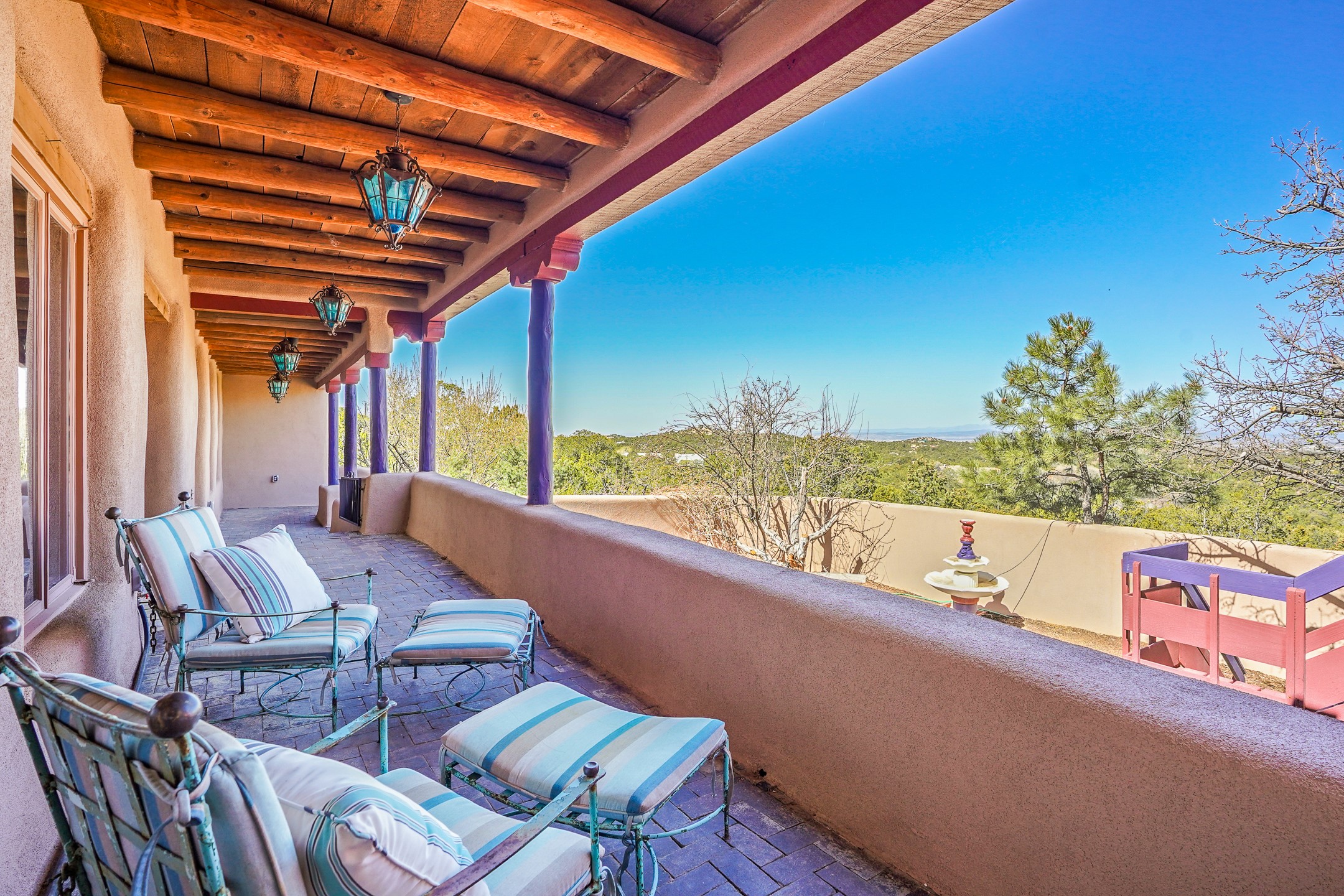 CASA SUNNA LUNA. Nestled just minutes off of the historic Old Santa Fe Trail and only 15 minutes from the heart of downtown Santa Fe, this adobe estate captures the essence of classic Southwestern elegance and modern comfort. Set on 5-acres, the property offers total privacy and breathtaking panoramic vistas of the Jemez Mountains and Santa Fe city lights.The main residence features a grand living and entertaining space adorned with multiple cozy kiva fireplaces, high viga accented ceilings, brick floors, iron work, colorful floral wall motifs, and traditional craftsmanship. Many recent practical improvements to the roof, exterior, and systems have also been made.Four spacious bedrooms make this a comfortable retreat for full-time living or hosting of guests. Not to be missed is the spacious, upstairs artist's retreat with panoramic views - the perfect place to paint, work, write, and create! The primary suite is private and appointed with a large ensuite bathroom, access to the enclosed in-ground spa, patio access, and sweeping sightlines across the high desert landscape. The grounds are equally serene with water features and fountains, multiple garden beds, and private patio enclaves. A long western-facing, covered portal, spanning the length of the main living room is the perfect outdoor extension to the main home's grand indoor living. A detached 1BD-1BA guest house, with its own garage, offers privacy and comfort for visitors, family or invites the potential for rental generating income. Whether you're soaking in the golden hour light from one of the many outdoor living spaces or relaxing by one of the property's four fireplaces, this one-of-a-kind property offers an unparalleled canvas equipped with undeniable tranquility, vistas and convenience to Santa Fe's exquisite destinations.