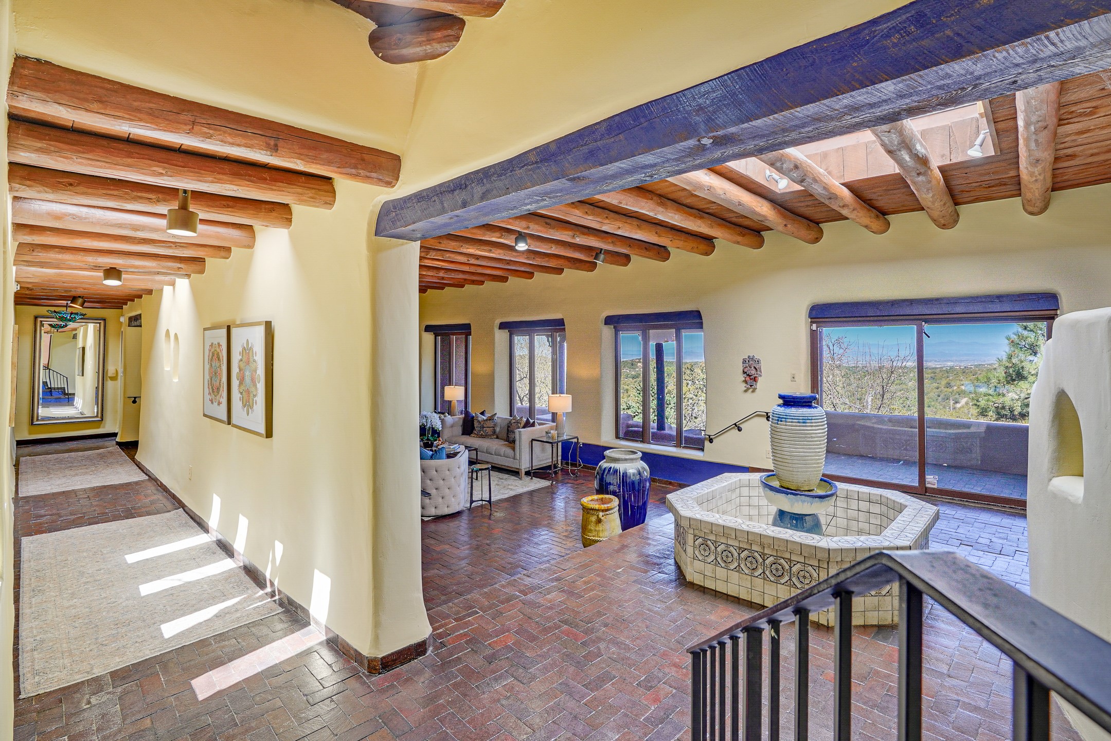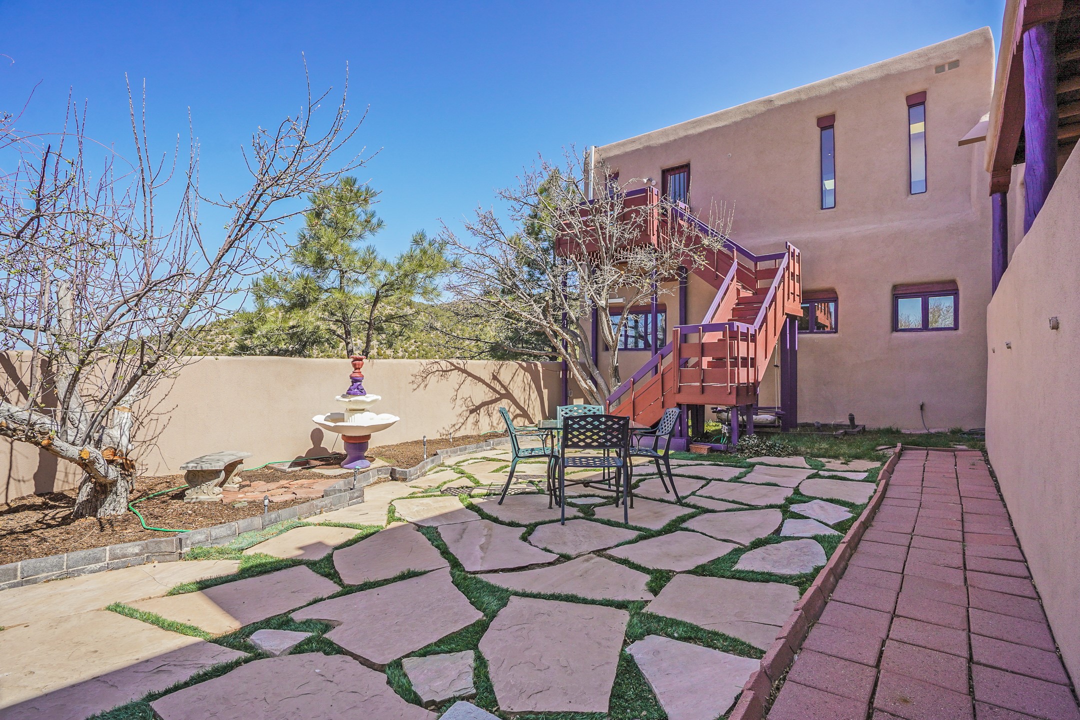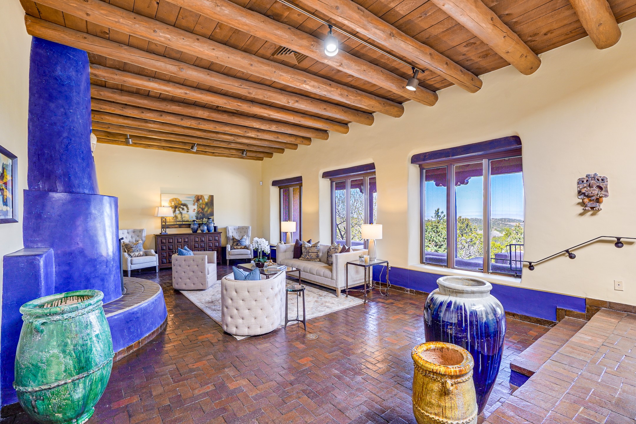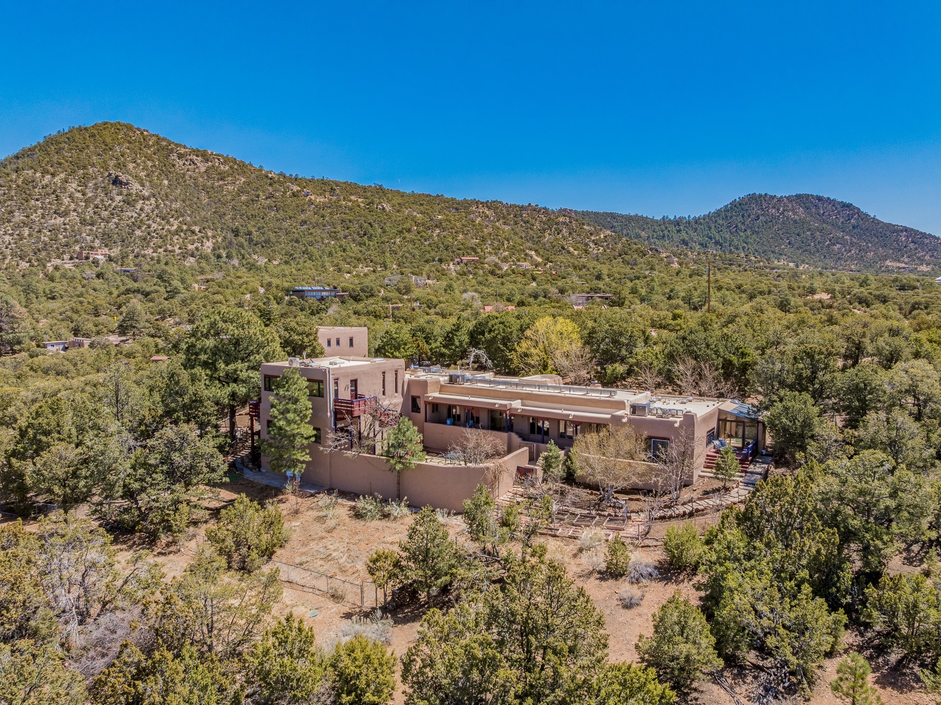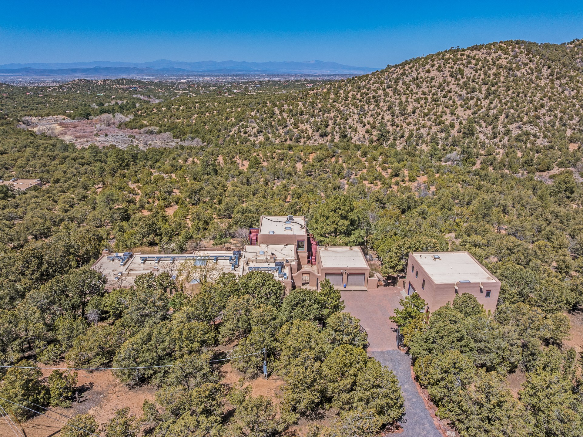 CASA SUNNA LUNA. Nestled just minutes off of the historic Old Santa Fe Trail and only 15 minutes from the heart of downtown Santa Fe, this adobe estate captures the essence of classic Southwestern elegance and modern comfort. Set on 5-acres, the property offers total privacy and breathtaking panoramic vistas of the Jemez Mountains and Santa Fe city lights.The main residence features a grand living and entertaining space adorned with multiple cozy kiva fireplaces, high viga accented ceilings, brick floors, iron work, colorful floral wall motifs, and traditional craftsmanship. Many recent practical improvements to the roof, exterior, and systems have also been made.Four spacious bedrooms make this a comfortable retreat for full-time living or hosting of guests. Not to be missed is the spacious, upstairs artist's retreat with panoramic views - the perfect place to paint, work, write, and create! The primary suite is private and appointed with a large ensuite bathroom, access to the enclosed in-ground spa, patio access, and sweeping sightlines across the high desert landscape. The grounds are equally serene with water features and fountains, multiple garden beds, and private patio enclaves. A long western-facing, covered portal, spanning the length of the main living room is the perfect outdoor extension to the main home's grand indoor living. A detached 1BD-1BA guest house, with its own garage, offers privacy and comfort for visitors, family or invites the potential for rental generating income. Whether you're soaking in the golden hour light from one of the many outdoor living spaces or relaxing by one of the property's four fireplaces, this one-of-a-kind property offers an unparalleled canvas equipped with undeniable tranquility, vistas and convenience to Santa Fe's exquisite destinations.