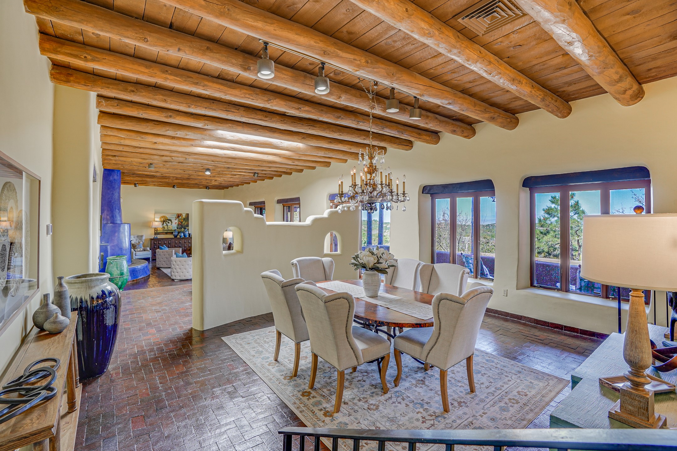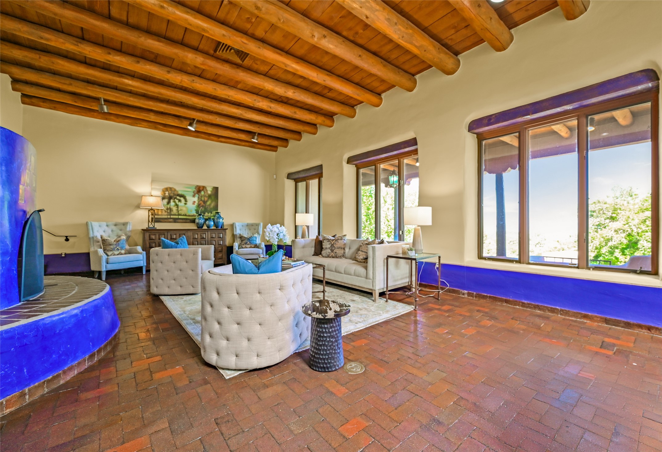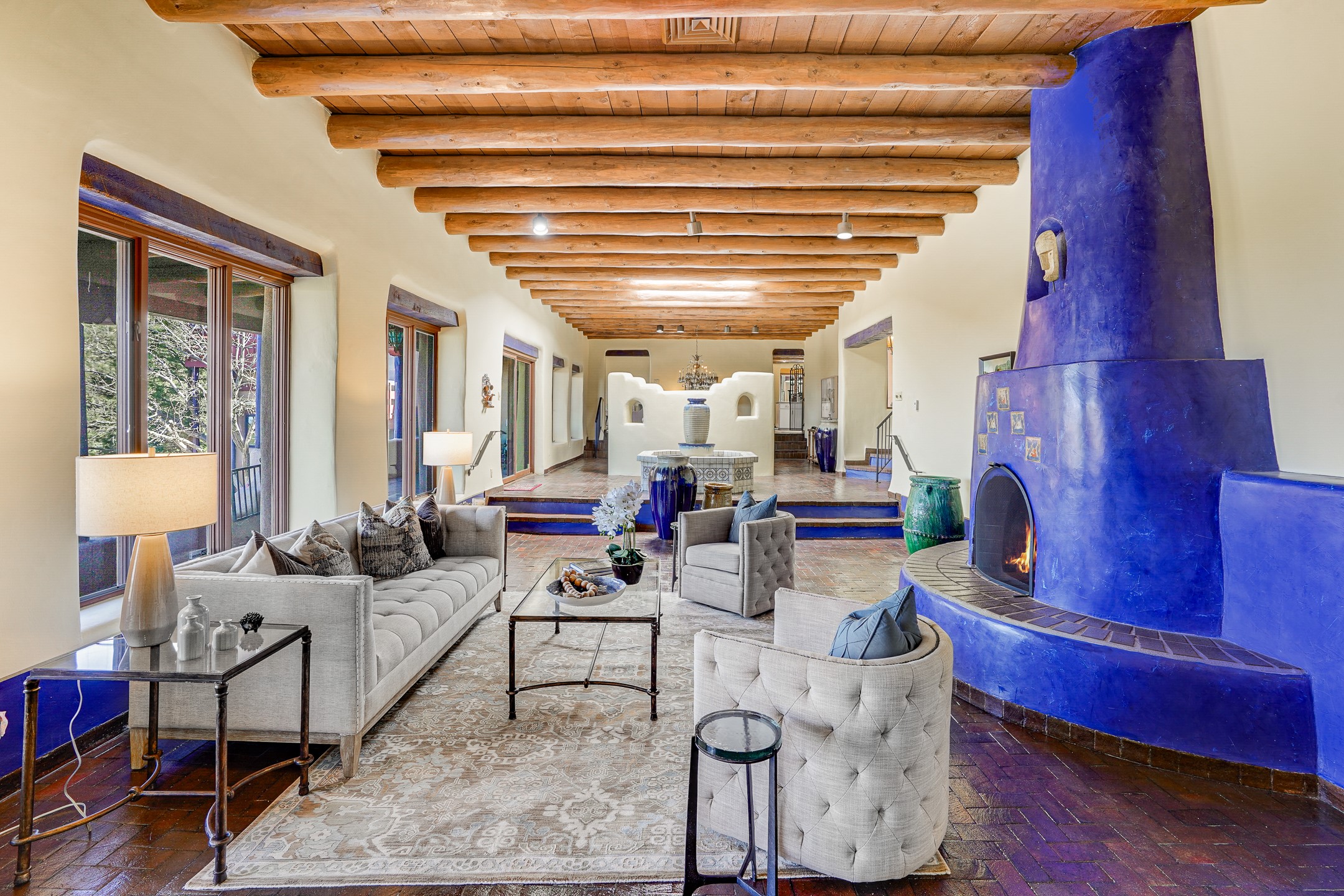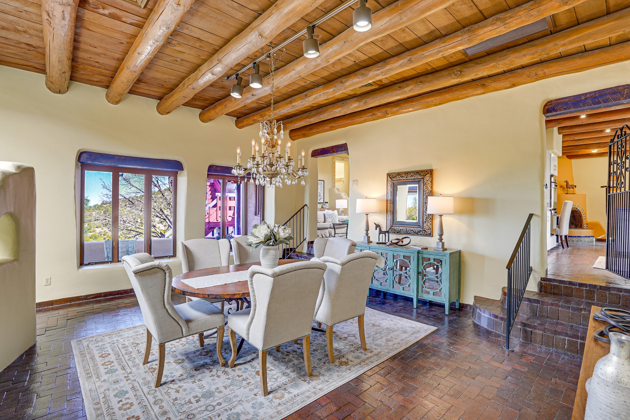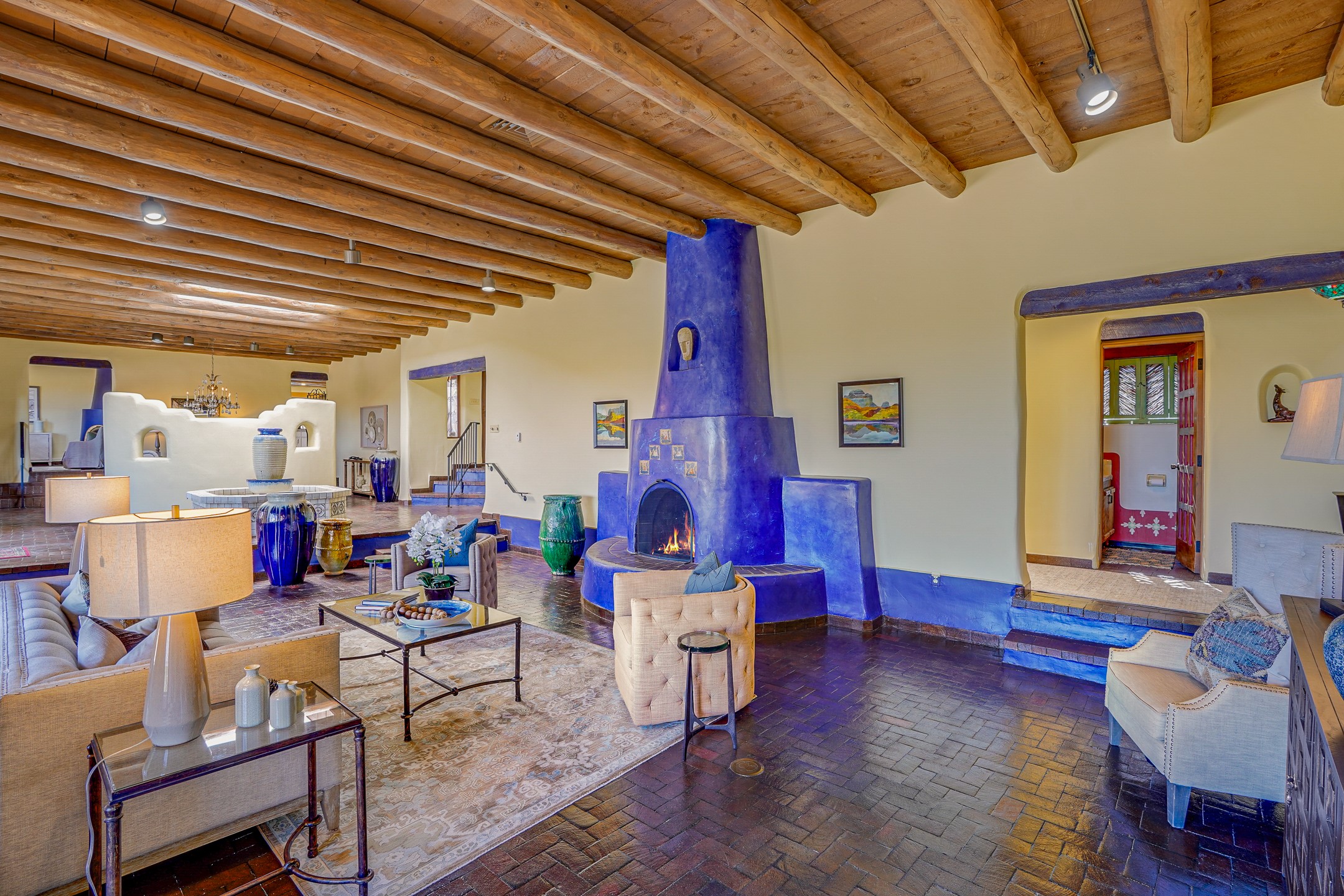CASA SUNNA LUNA. Nestled just minutes off of the historic Old Santa Fe Trail and only 15 minutes from the heart of downtown Santa Fe, this adobe estate captures the essence of classic Southwestern elegance and modern comfort. Set on 5-acres, the property offers total privacy and breathtaking panoramic vistas of the Jemez Mountains and Santa Fe city lights.The main residence features a grand living and entertaining space adorned with multiple cozy kiva fireplaces, high viga accented ceilings, brick floors, iron work, colorful floral wall motifs, and traditional craftsmanship. Many recent practical improvements to the roof, exterior, and systems have also been made.Four spacious bedrooms make this a comfortable retreat for full-time living or hosting of guests. Not to be missed is the spacious, upstairs artist's retreat with panoramic views - the perfect place to paint, work, write, and create! The primary suite is private and appointed with a large ensuite bathroom, access to the enclosed in-ground spa, patio access, and sweeping sightlines across the high desert landscape. The grounds are equally serene with water features and fountains, multiple garden beds, and private patio enclaves. A long western-facing, covered portal, spanning the length of the main living room is the perfect outdoor extension to the main home's grand indoor living. A detached 1BD-1BA guest house, with its own garage, offers privacy and comfort for visitors, family or invites the potential for rental generating income. Whether you're soaking in the golden hour light from one of the many outdoor living spaces or relaxing by one of the property's four fireplaces, this one-of-a-kind property offers an unparalleled canvas equipped with undeniable tranquility, vistas and convenience to Santa Fe's exquisite destinations.