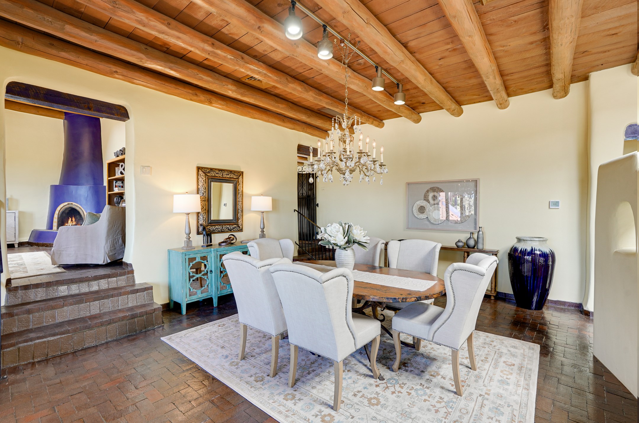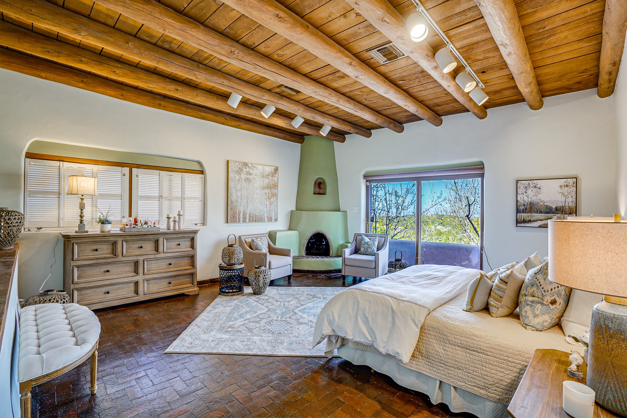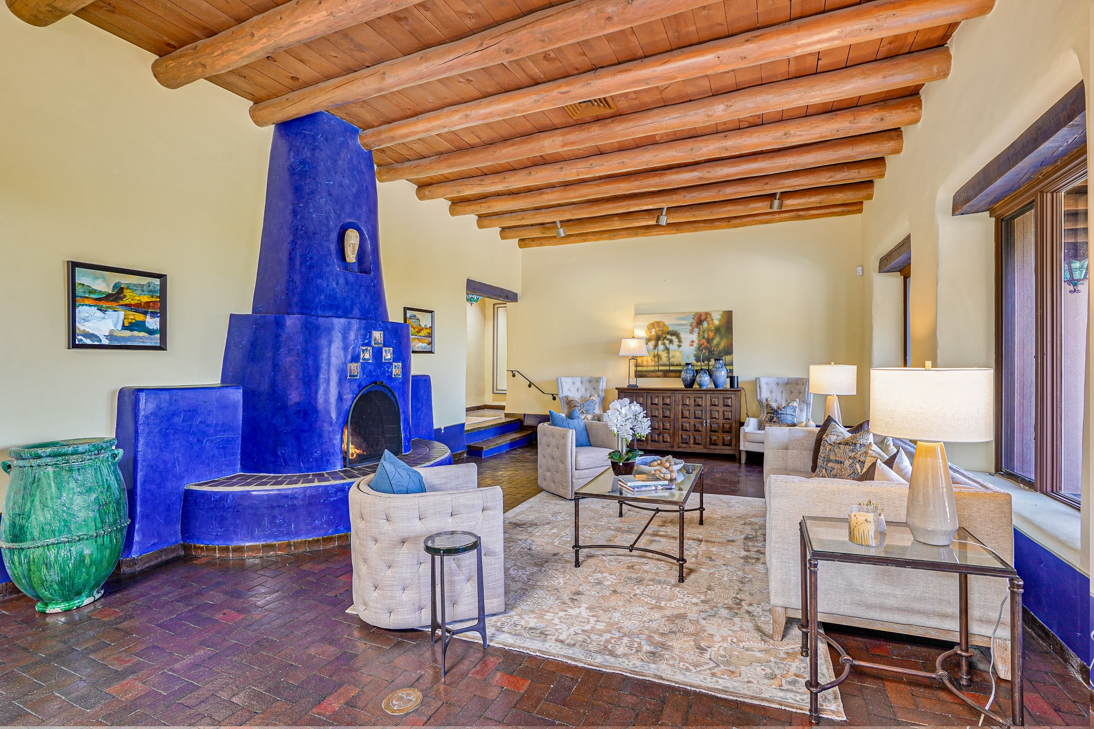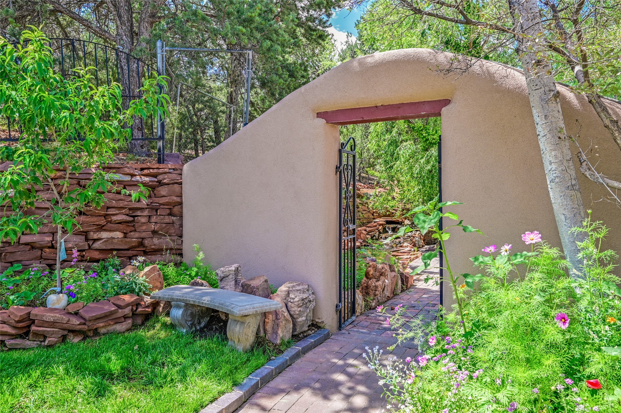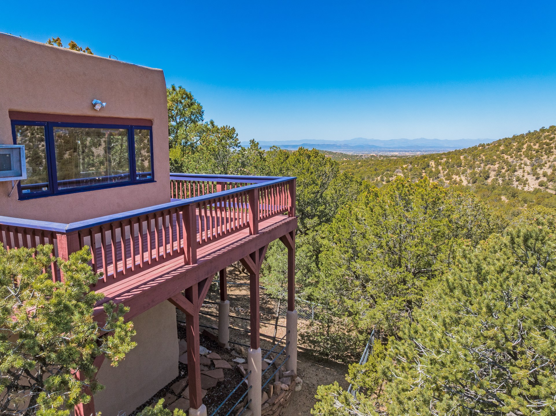 CASA SUNNA LUNA. Nestled just minutes off of the historic Old Santa Fe Trail and only 15 minutes from the heart of downtown Santa Fe, this adobe estate captures the essence of classic Southwestern elegance and modern comfort. Set on 5-acres, the property offers total privacy and breathtaking panoramic vistas of the Jemez Mountains and Santa Fe city lights.The main residence features a grand living and entertaining space adorned with multiple cozy kiva fireplaces, high viga accented ceilings, brick floors, iron work, colorful floral wall motifs, and traditional craftsmanship. Many recent practical improvements to the roof, exterior, and systems have also been made.Four spacious bedrooms make this a comfortable retreat for full-time living or hosting of guests. Not to be missed is the spacious, upstairs artist's retreat with panoramic views - the perfect place to paint, work, write, and create! The primary suite is private and appointed with a large ensuite bathroom, access to the enclosed in-ground spa, patio access, and sweeping sightlines across the high desert landscape. The grounds are equally serene with water features and fountains, multiple garden beds, and private patio enclaves. A long western-facing, covered portal, spanning the length of the main living room is the perfect outdoor extension to the main home's grand indoor living. A detached 1BD-1BA guest house, with its own garage, offers privacy and comfort for visitors, family or invites the potential for rental generating income. Whether you're soaking in the golden hour light from one of the many outdoor living spaces or relaxing by one of the property's four fireplaces, this one-of-a-kind property offers an unparalleled canvas equipped with undeniable tranquility, vistas and convenience to Santa Fe's exquisite destinations.