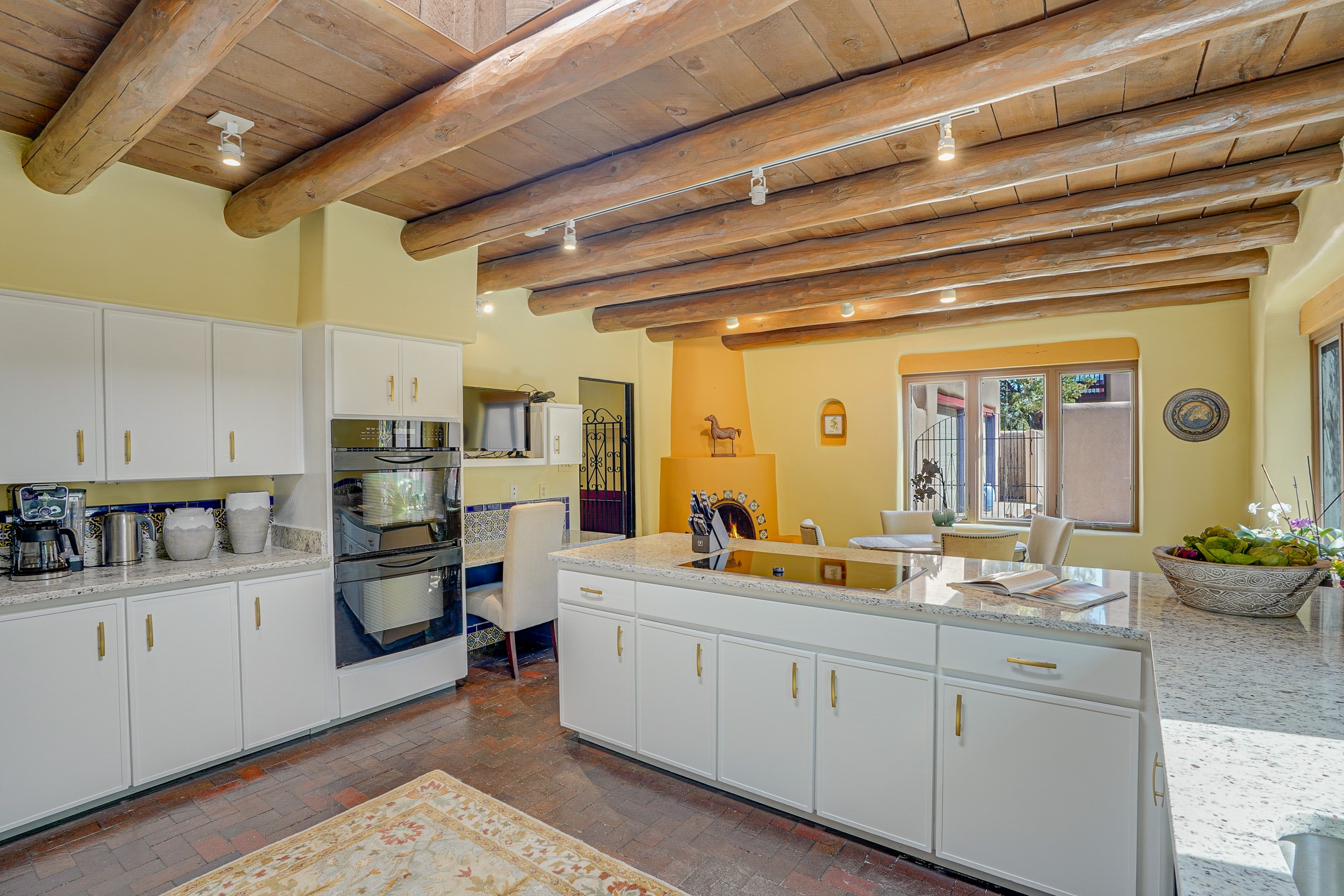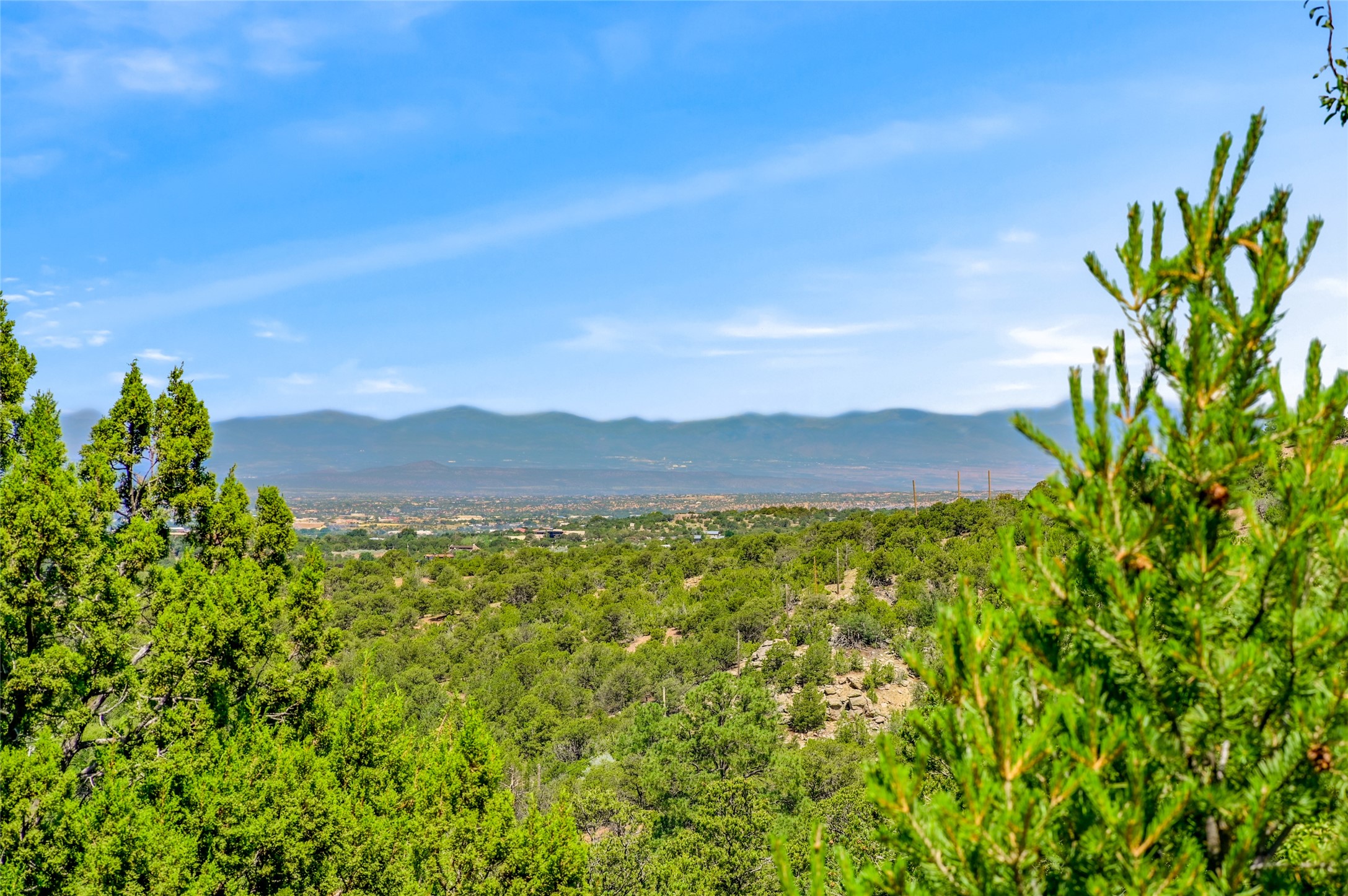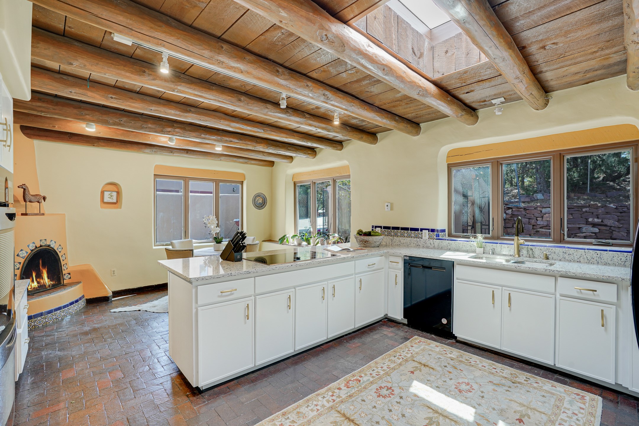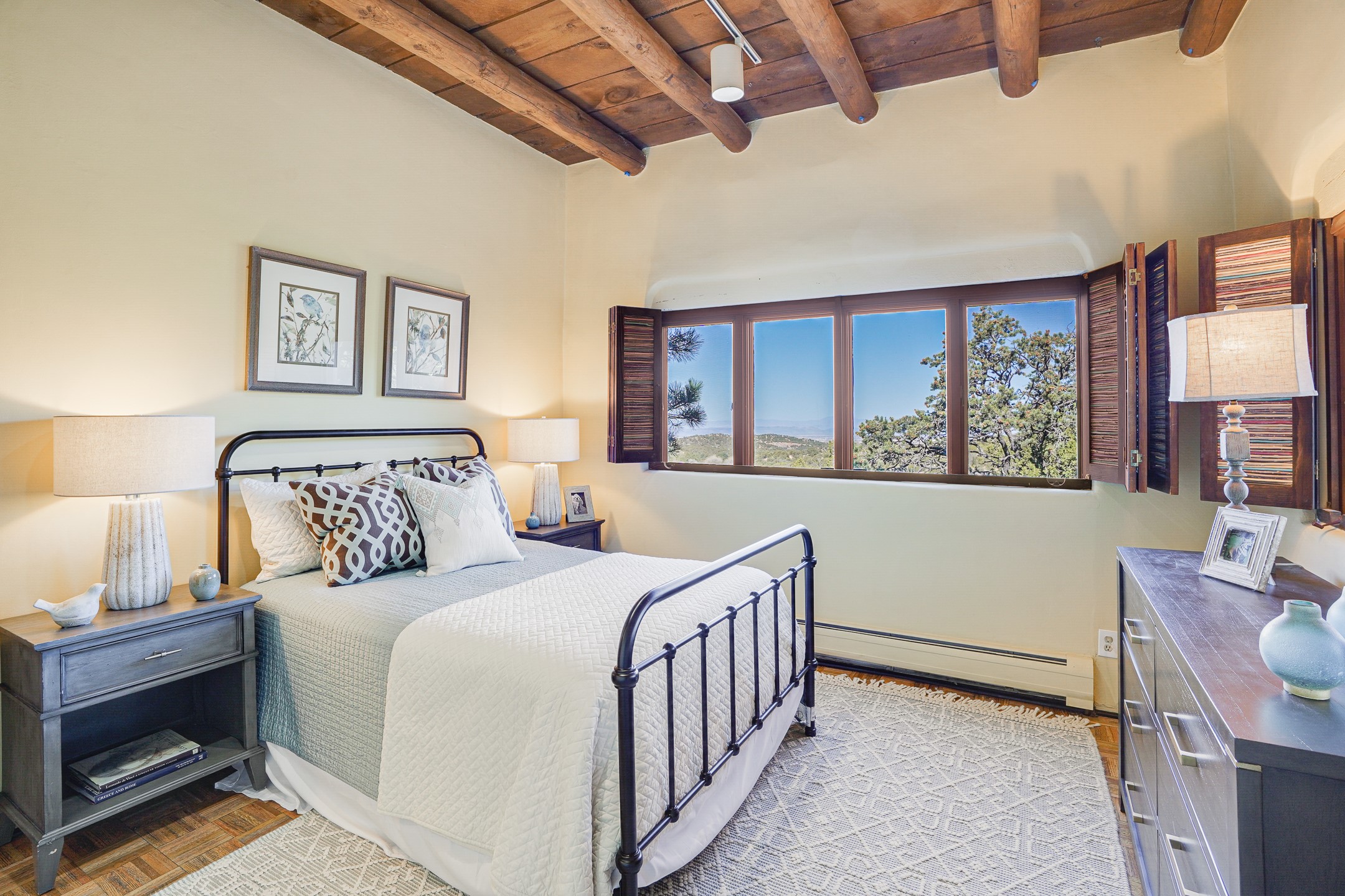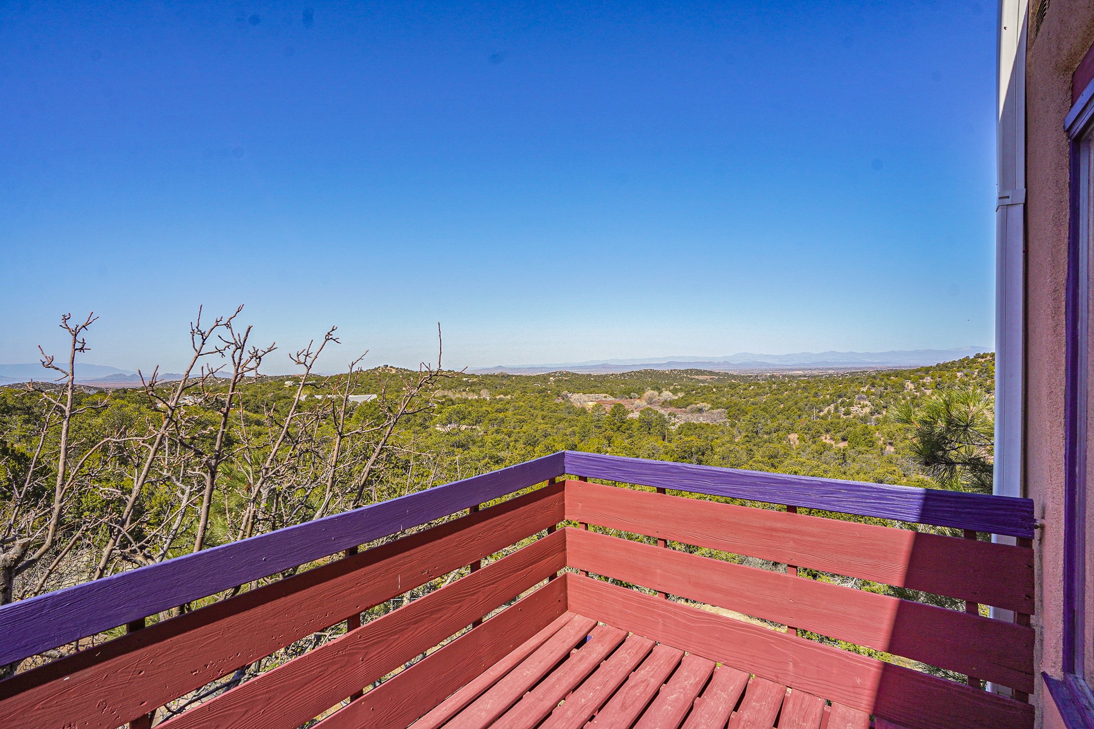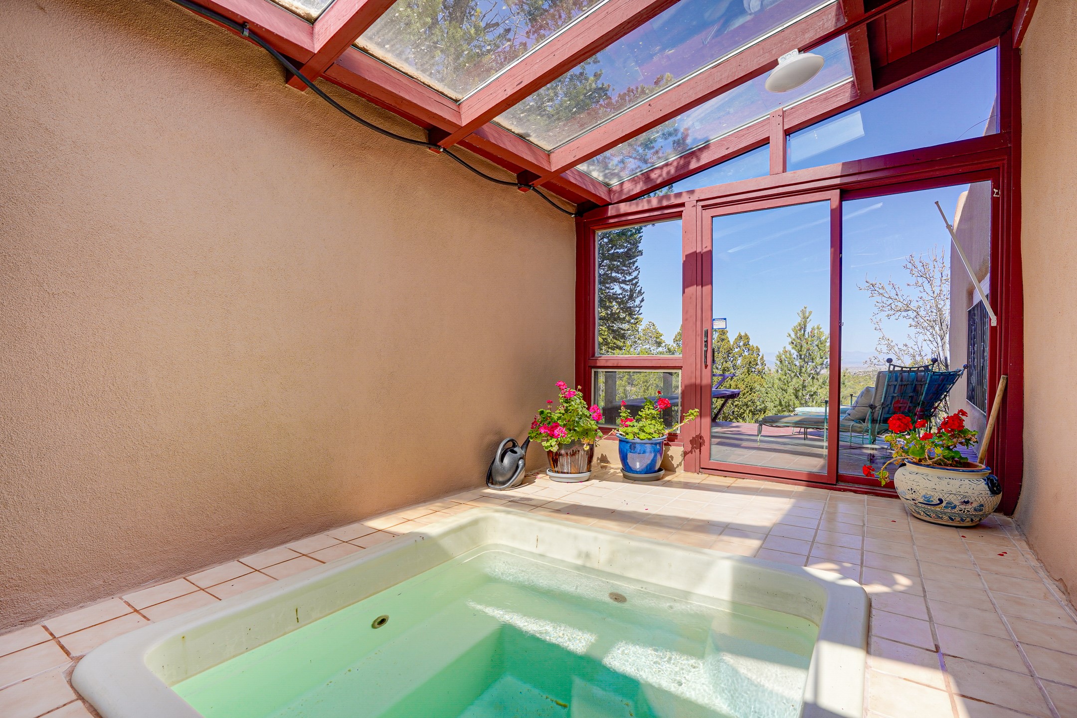 CASA SUNNA LUNA. Nestled just minutes off of the historic Old Santa Fe Trail and only 15 minutes from the heart of downtown Santa Fe, this adobe estate captures the essence of classic Southwestern elegance and modern comfort. Set on 5-acres, the property offers total privacy and breathtaking panoramic vistas of the Jemez Mountains and Santa Fe city lights.The main residence features a grand living and entertaining space adorned with multiple cozy kiva fireplaces, high viga accented ceilings, brick floors, iron work, colorful floral wall motifs, and traditional craftsmanship. Many recent practical improvements to the roof, exterior, and systems have also been made.Four spacious bedrooms make this a comfortable retreat for full-time living or hosting of guests. Not to be missed is the spacious, upstairs artist's retreat with panoramic views - the perfect place to paint, work, write, and create! The primary suite is private and appointed with a large ensuite bathroom, access to the enclosed in-ground spa, patio access, and sweeping sightlines across the high desert landscape. The grounds are equally serene with water features and fountains, multiple garden beds, and private patio enclaves. A long western-facing, covered portal, spanning the length of the main living room is the perfect outdoor extension to the main home's grand indoor living. A detached 1BD-1BA guest house, with its own garage, offers privacy and comfort for visitors, family or invites the potential for rental generating income. Whether you're soaking in the golden hour light from one of the many outdoor living spaces or relaxing by one of the property's four fireplaces, this one-of-a-kind property offers an unparalleled canvas equipped with undeniable tranquility, vistas and convenience to Santa Fe's exquisite destinations.