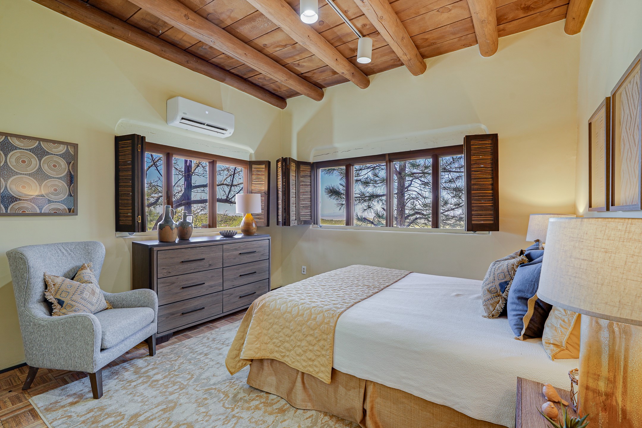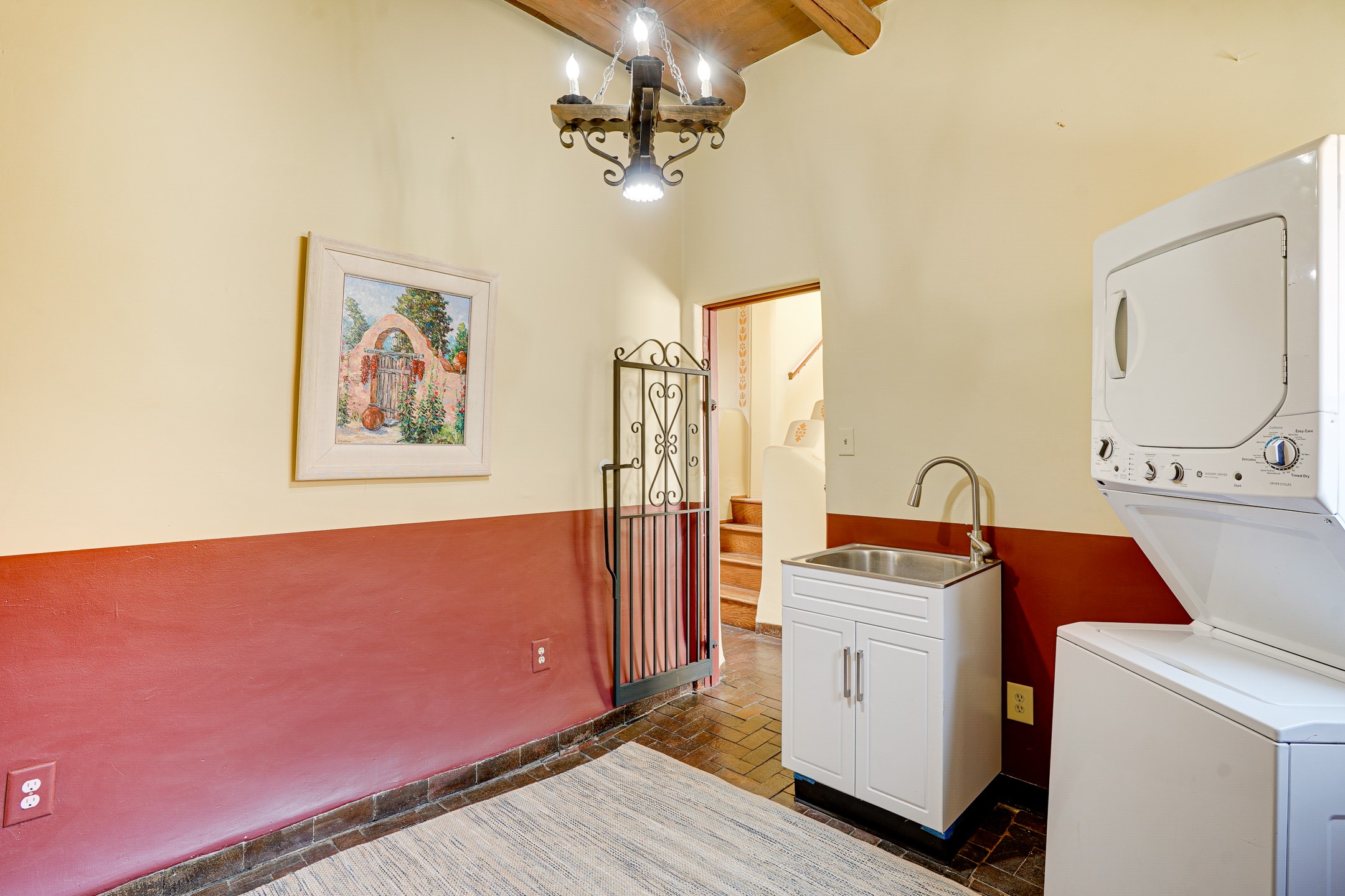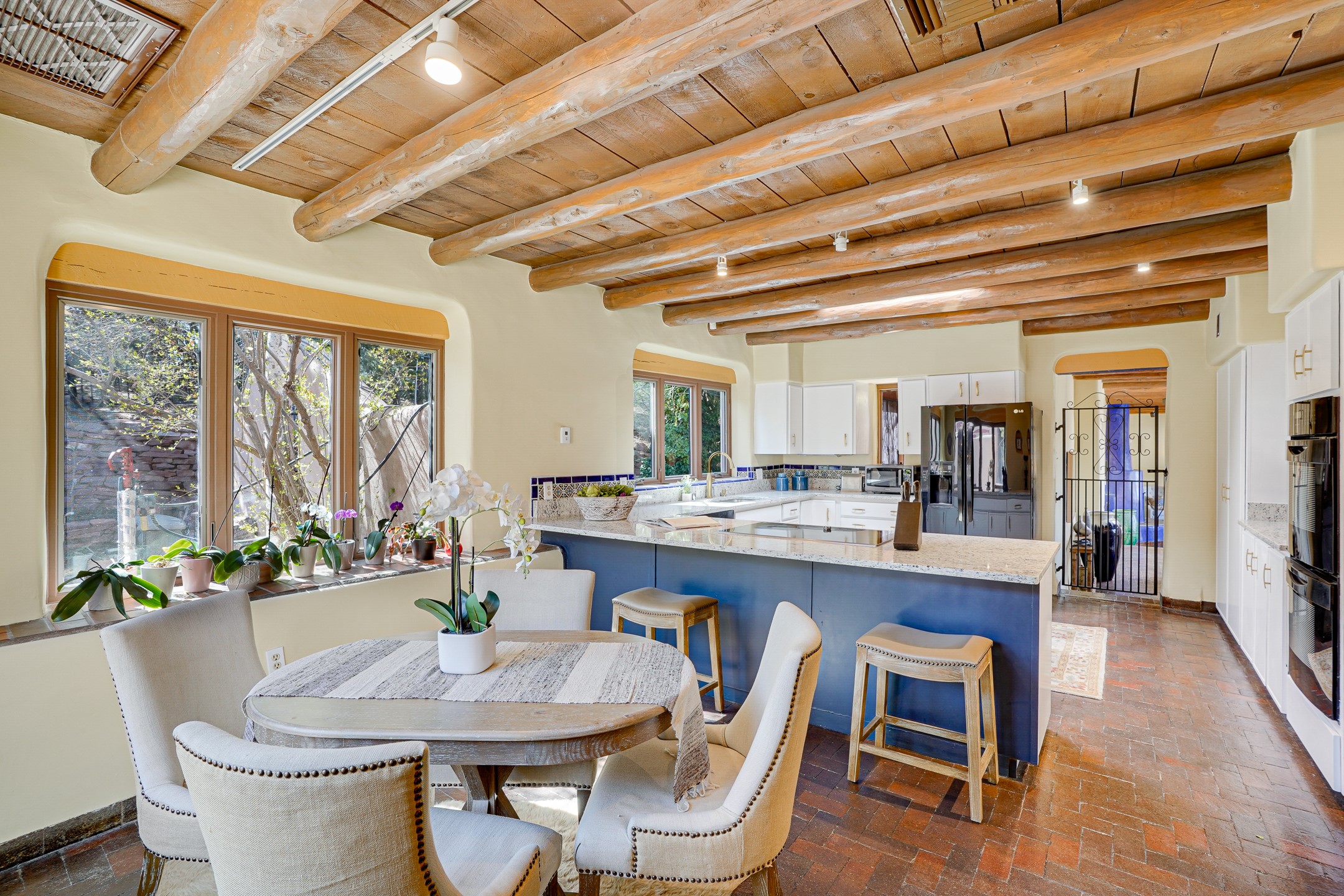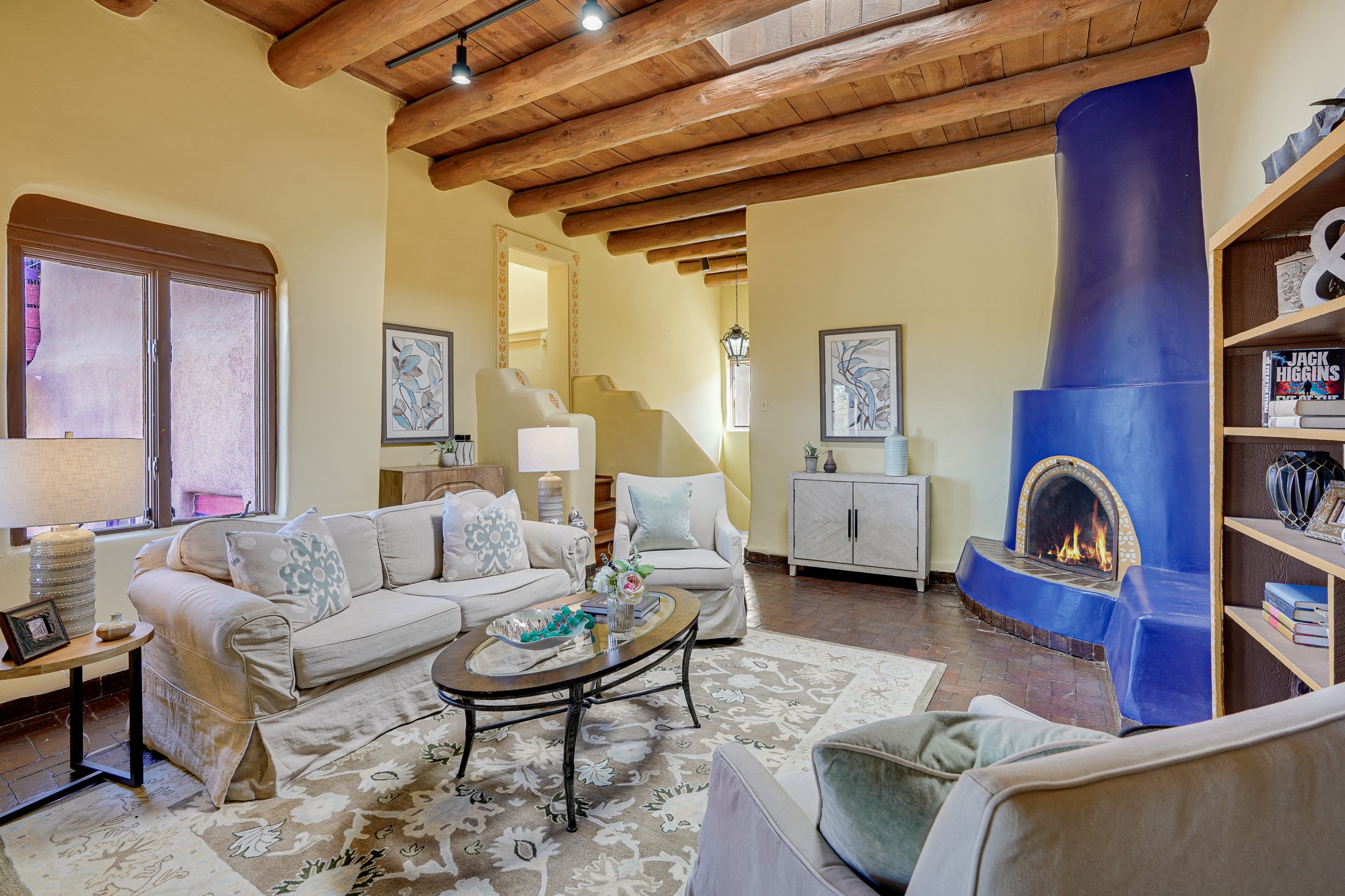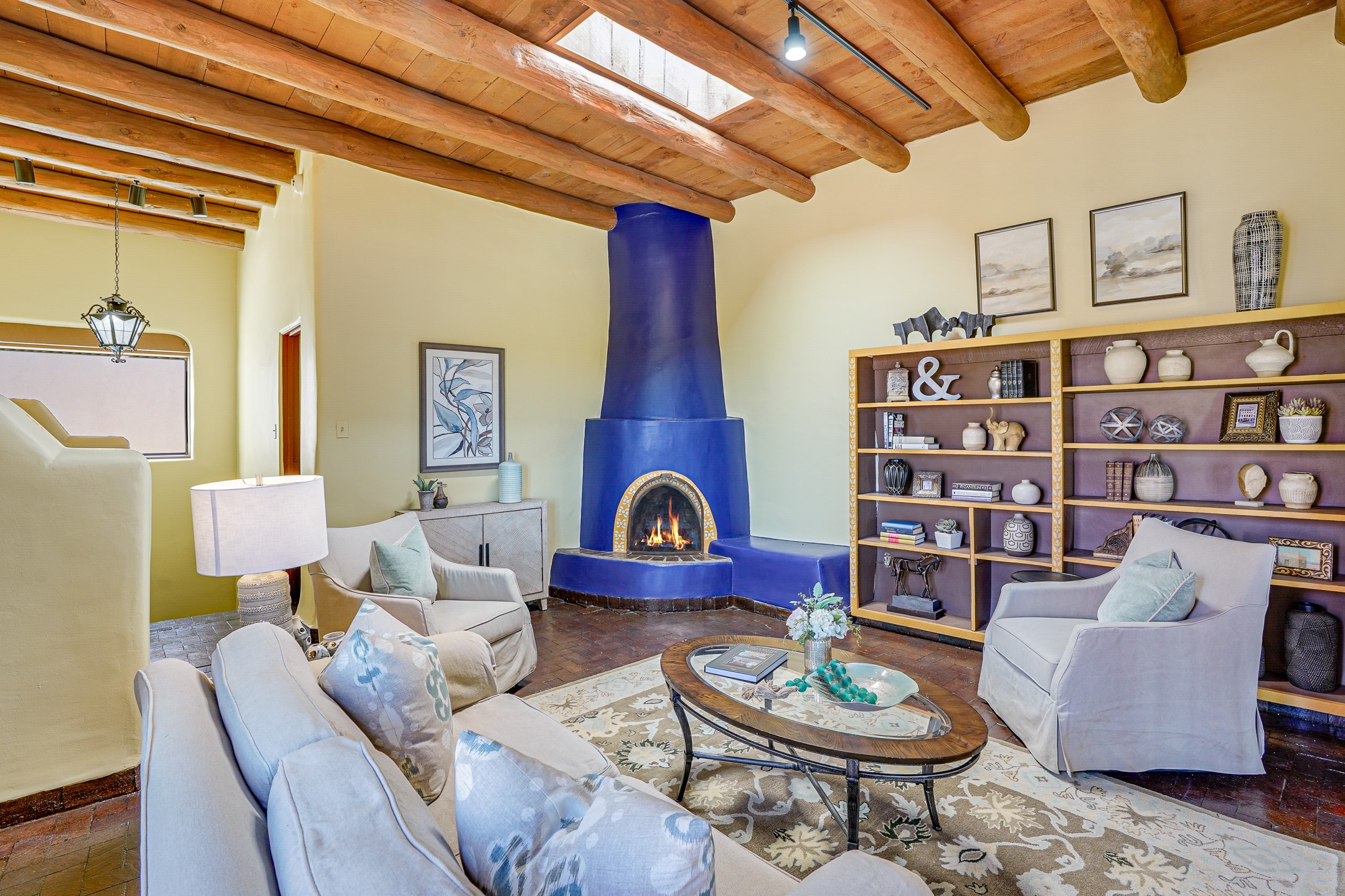 CASA SUNNA LUNA. Nestled just minutes off of the historic Old Santa Fe Trail and only 15 minutes from the heart of downtown Santa Fe, this adobe estate captures the essence of classic Southwestern elegance and modern comfort. Set on 5-acres, the property offers total privacy and breathtaking panoramic vistas of the Jemez Mountains and Santa Fe city lights.The main residence features a grand living and entertaining space adorned with multiple cozy kiva fireplaces, high viga accented ceilings, brick floors, iron work, colorful floral wall motifs, and traditional craftsmanship. Many recent practical improvements to the roof, exterior, and systems have also been made.Four spacious bedrooms make this a comfortable retreat for full-time living or hosting of guests. Not to be missed is the spacious, upstairs artist's retreat with panoramic views - the perfect place to paint, work, write, and create! The primary suite is private and appointed with a large ensuite bathroom, access to the enclosed in-ground spa, patio access, and sweeping sightlines across the high desert landscape. The grounds are equally serene with water features and fountains, multiple garden beds, and private patio enclaves. A long western-facing, covered portal, spanning the length of the main living room is the perfect outdoor extension to the main home's grand indoor living. A detached 1BD-1BA guest house, with its own garage, offers privacy and comfort for visitors, family or invites the potential for rental generating income. Whether you're soaking in the golden hour light from one of the many outdoor living spaces or relaxing by one of the property's four fireplaces, this one-of-a-kind property offers an unparalleled canvas equipped with undeniable tranquility, vistas and convenience to Santa Fe's exquisite destinations.