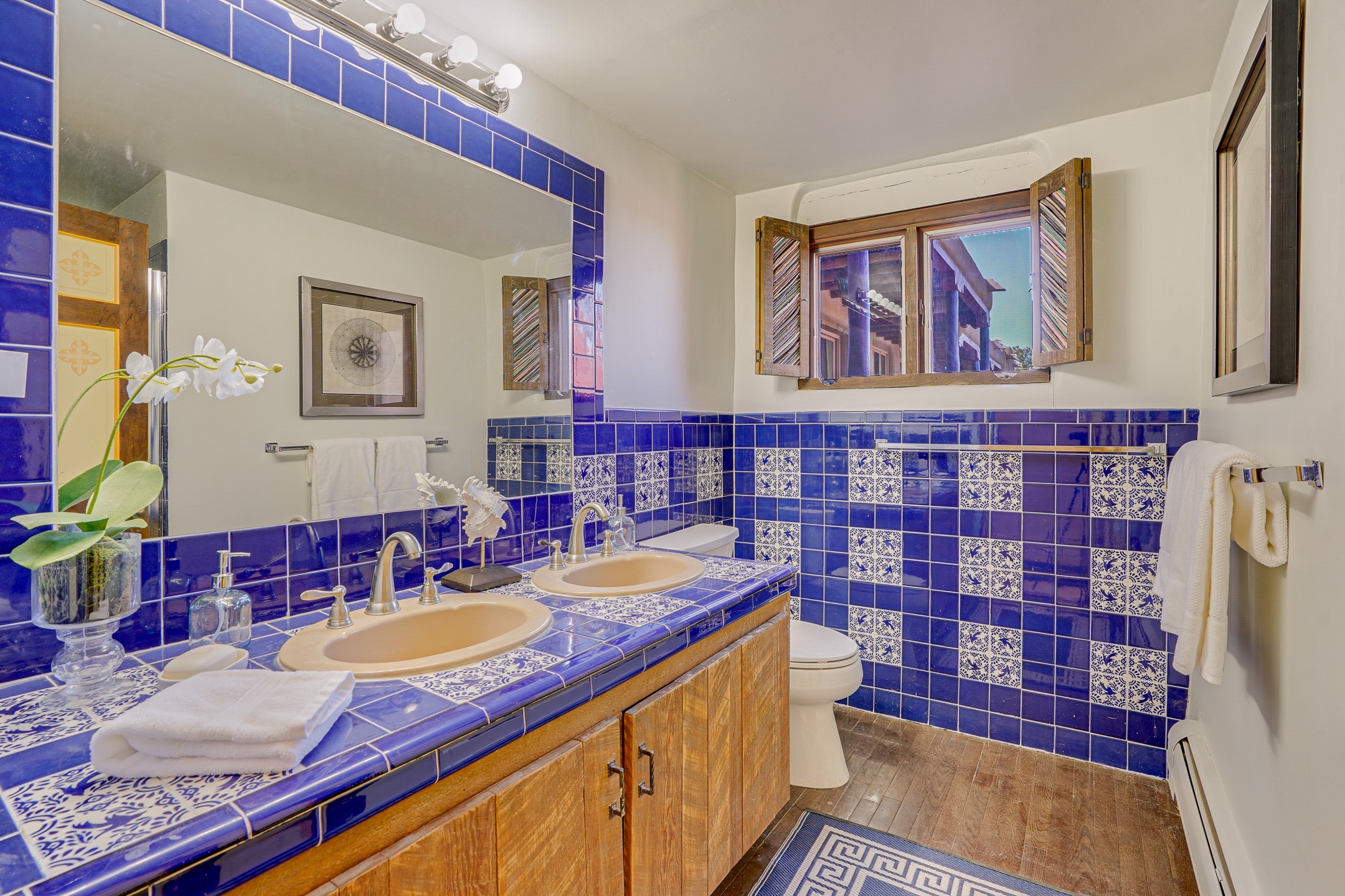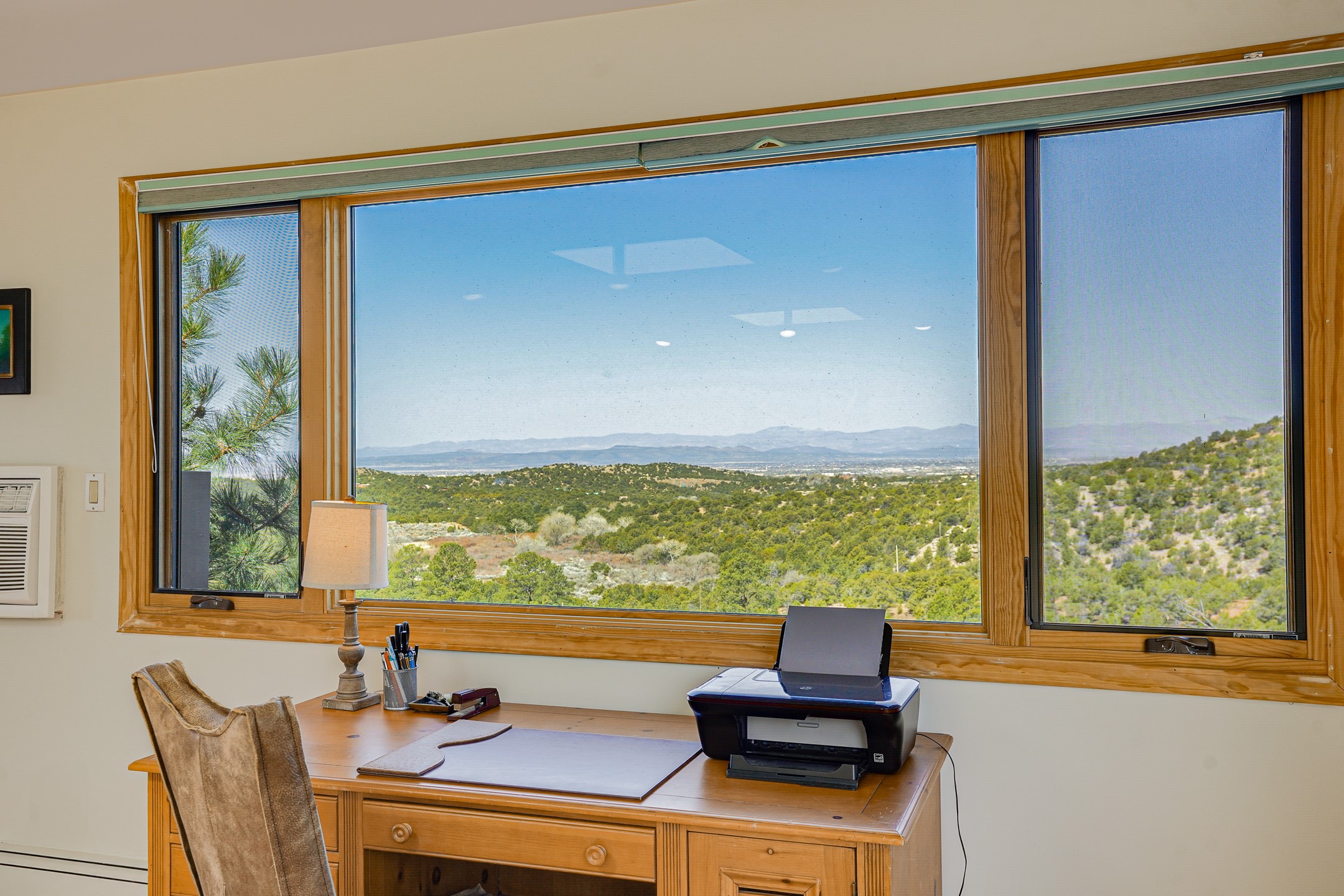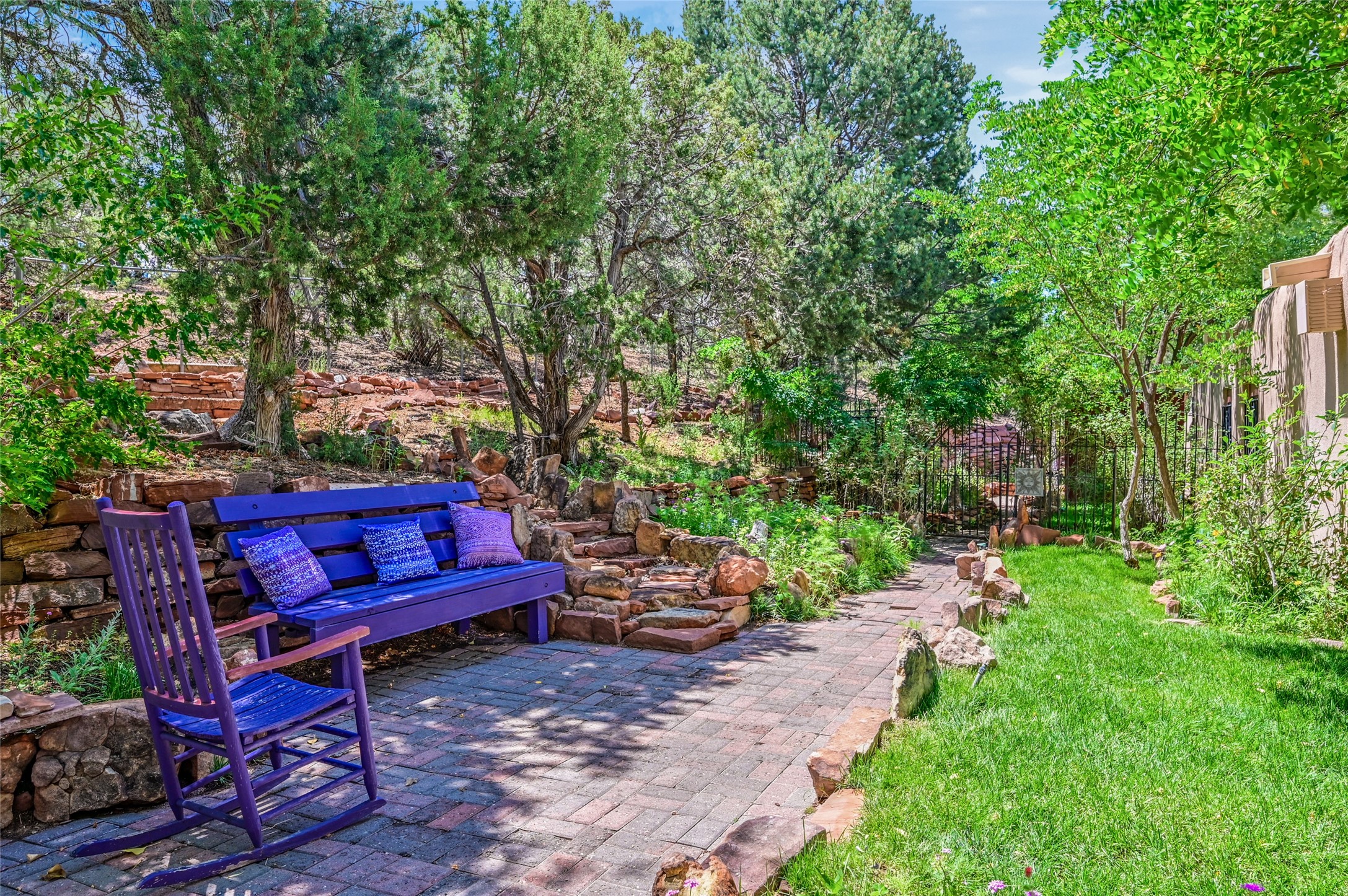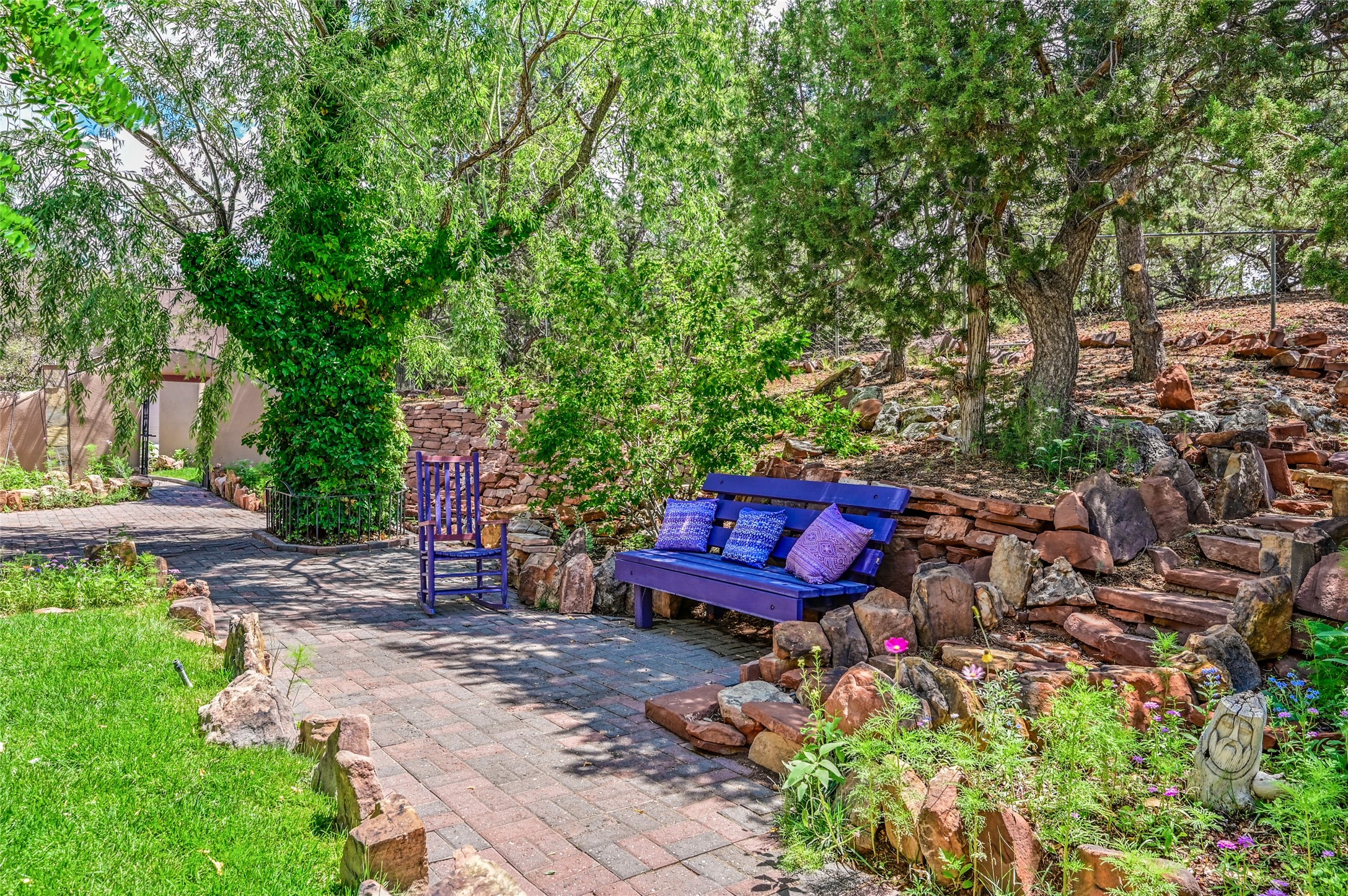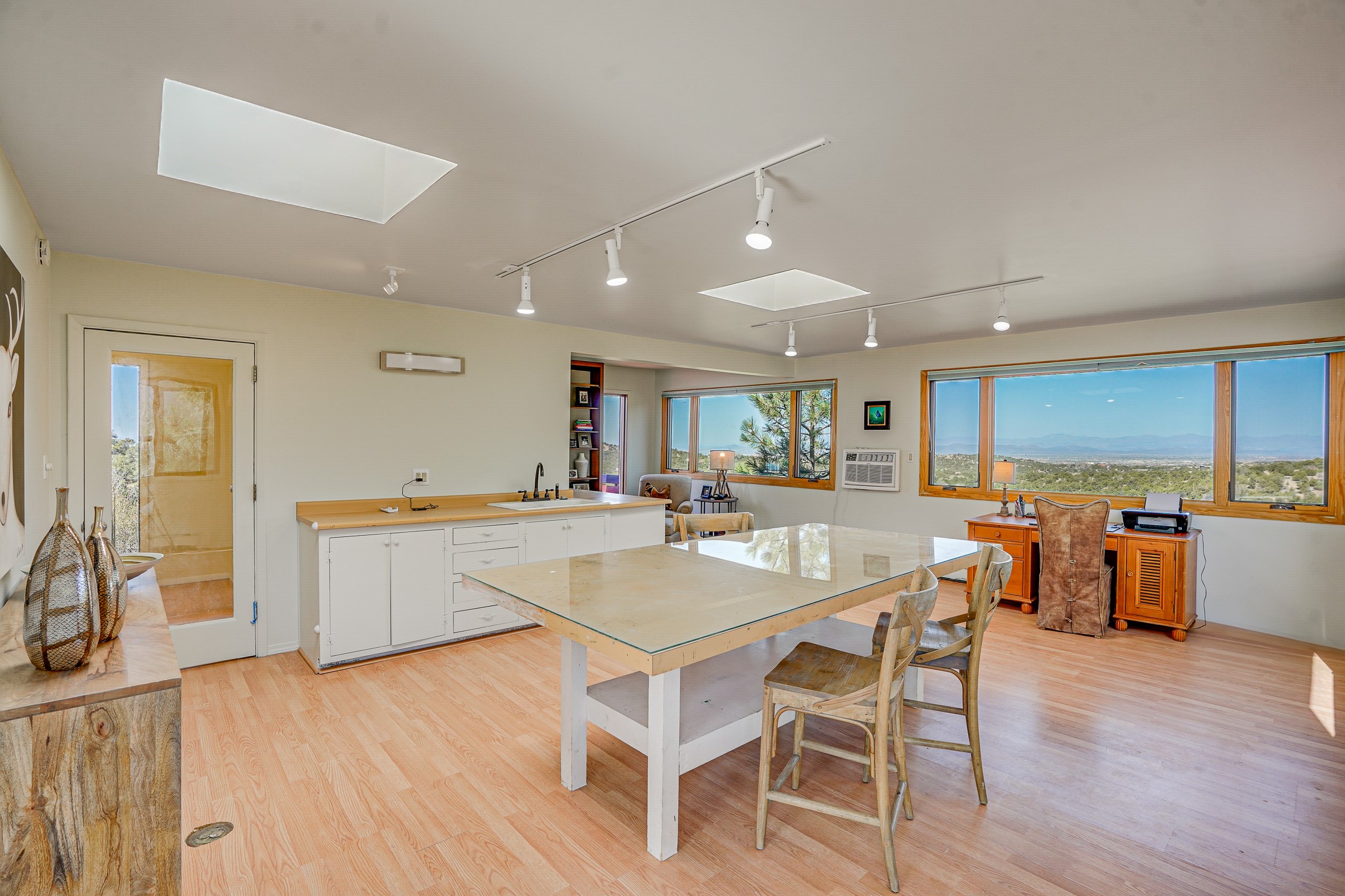 CASA SUNNA LUNA. Nestled just minutes off of the historic Old Santa Fe Trail and only 15 minutes from the heart of downtown Santa Fe, this adobe estate captures the essence of classic Southwestern elegance and modern comfort. Set on 5-acres, the property offers total privacy and breathtaking panoramic vistas of the Jemez Mountains and Santa Fe city lights.The main residence features a grand living and entertaining space adorned with multiple cozy kiva fireplaces, high viga accented ceilings, brick floors, iron work, colorful floral wall motifs, and traditional craftsmanship. Many recent practical improvements to the roof, exterior, and systems have also been made.Four spacious bedrooms make this a comfortable retreat for full-time living or hosting of guests. Not to be missed is the spacious, upstairs artist's retreat with panoramic views - the perfect place to paint, work, write, and create! The primary suite is private and appointed with a large ensuite bathroom, access to the enclosed in-ground spa, patio access, and sweeping sightlines across the high desert landscape. The grounds are equally serene with water features and fountains, multiple garden beds, and private patio enclaves. A long western-facing, covered portal, spanning the length of the main living room is the perfect outdoor extension to the main home's grand indoor living. A detached 1BD-1BA guest house, with its own garage, offers privacy and comfort for visitors, family or invites the potential for rental generating income. Whether you're soaking in the golden hour light from one of the many outdoor living spaces or relaxing by one of the property's four fireplaces, this one-of-a-kind property offers an unparalleled canvas equipped with undeniable tranquility, vistas and convenience to Santa Fe's exquisite destinations.