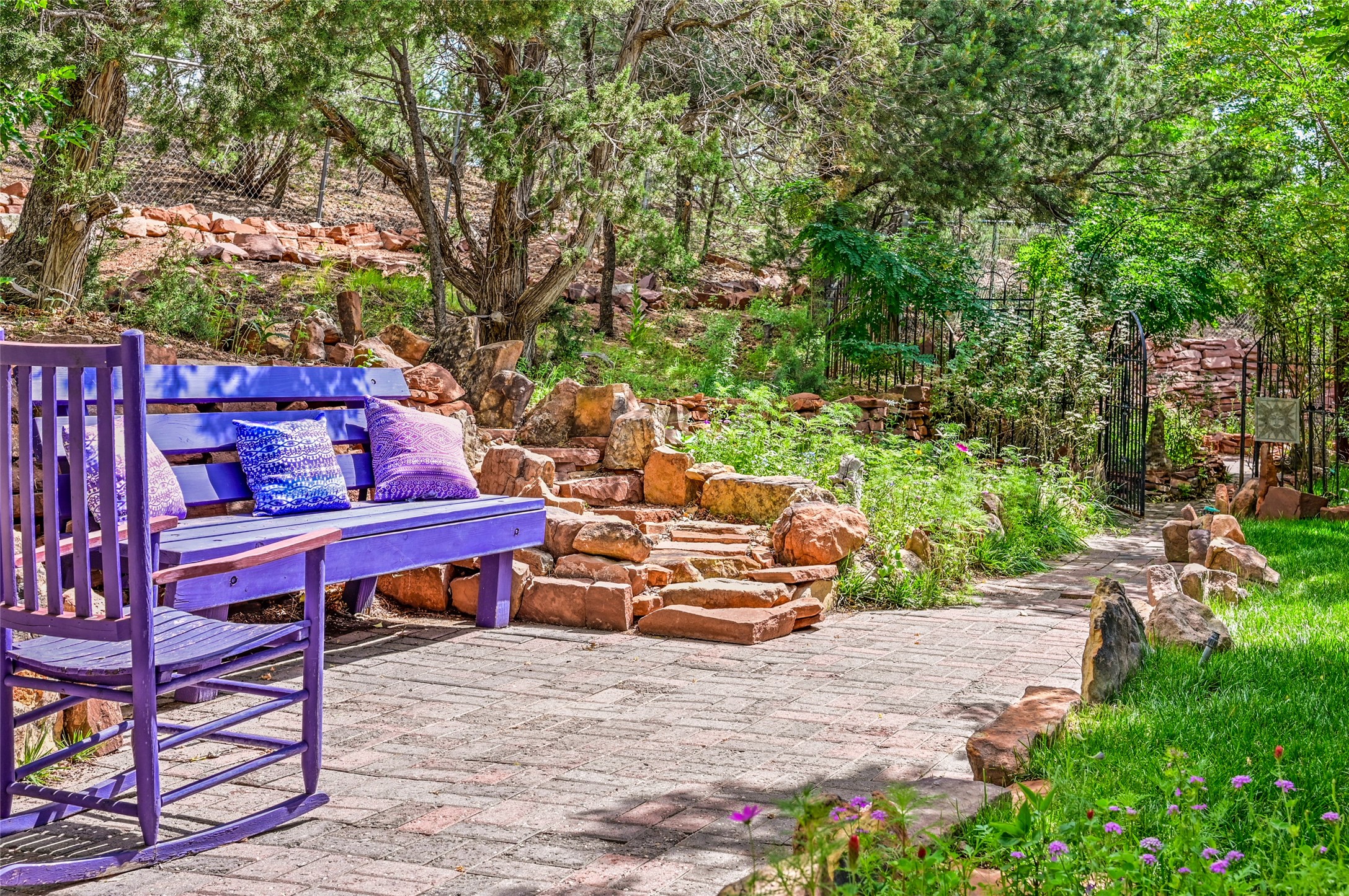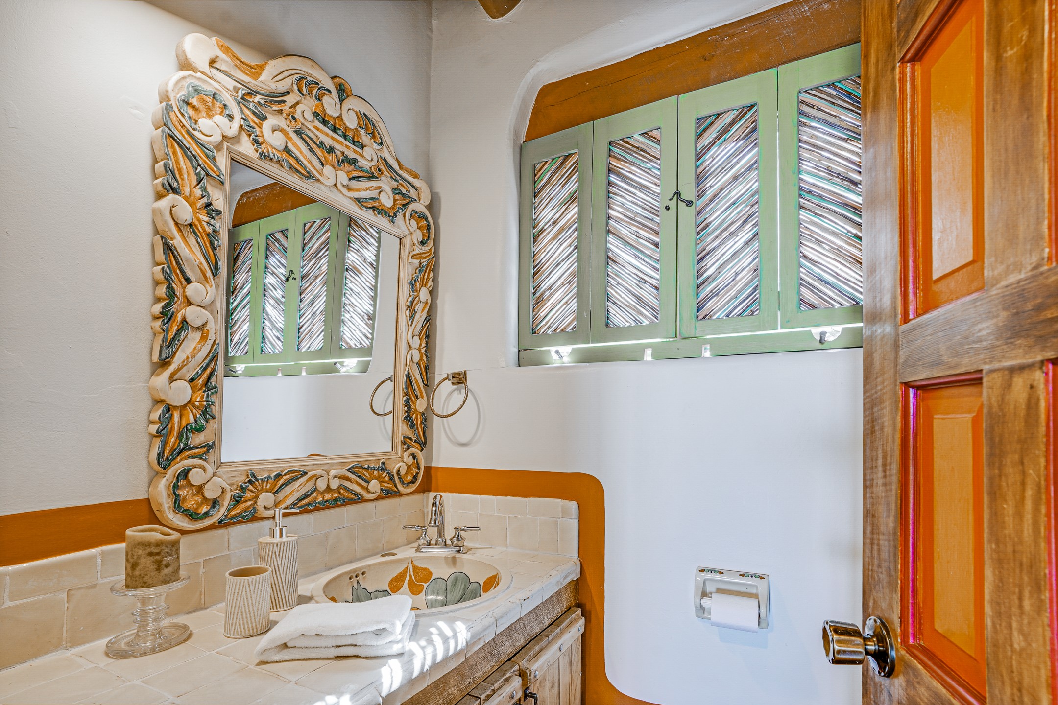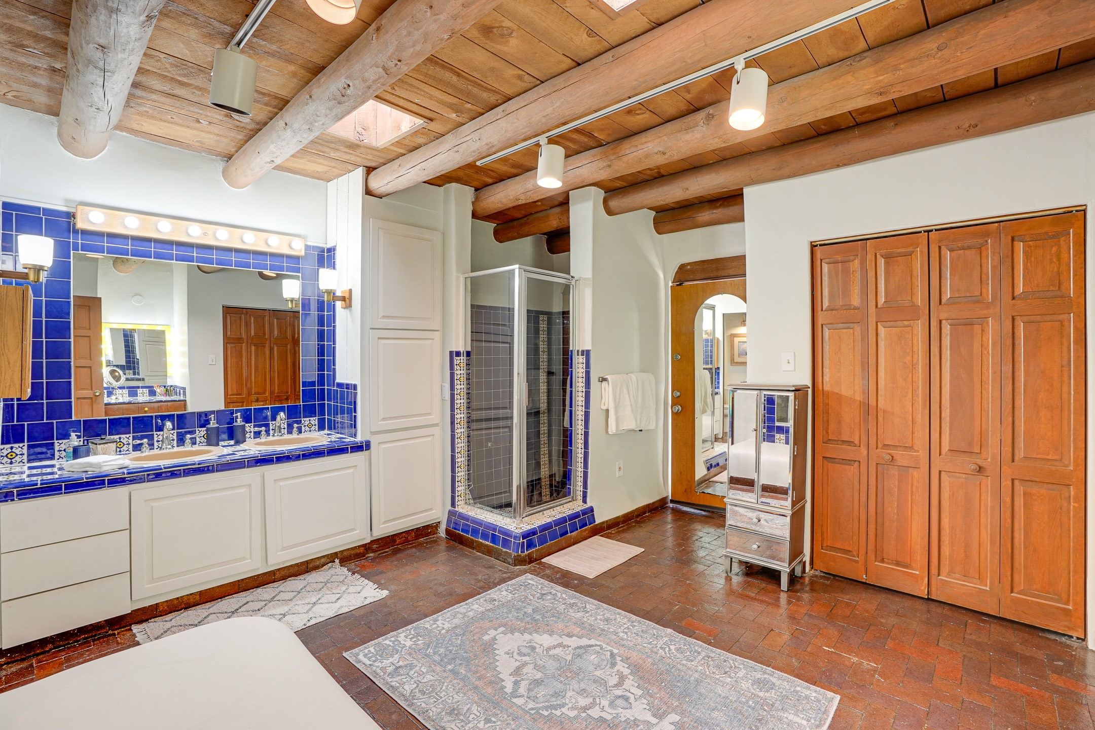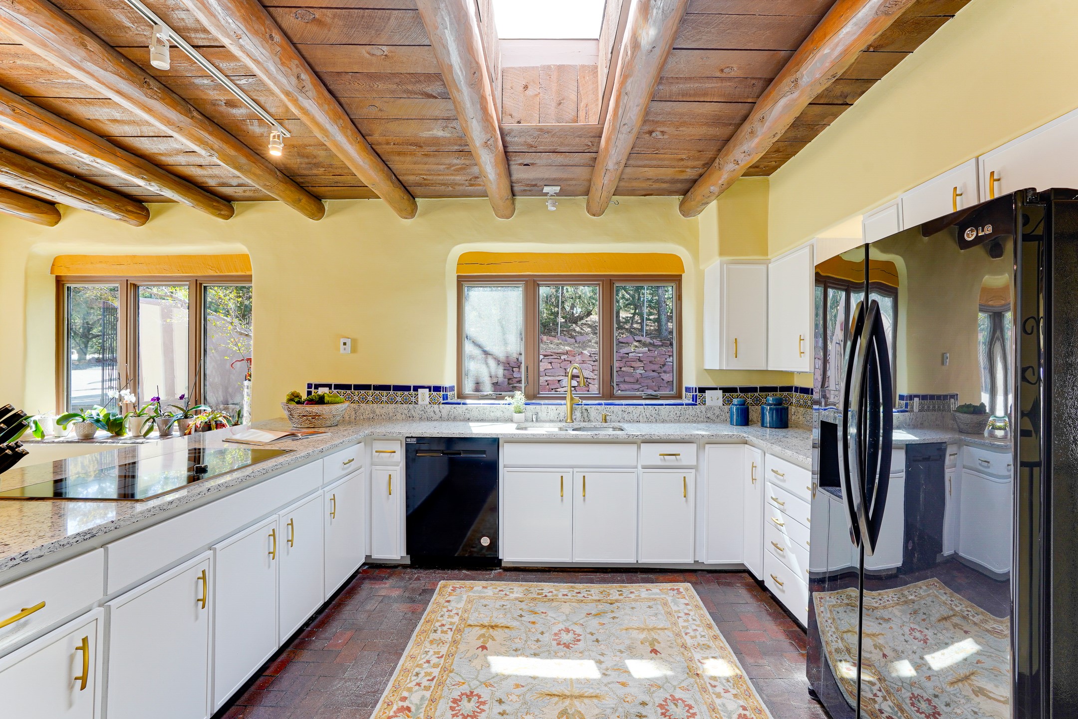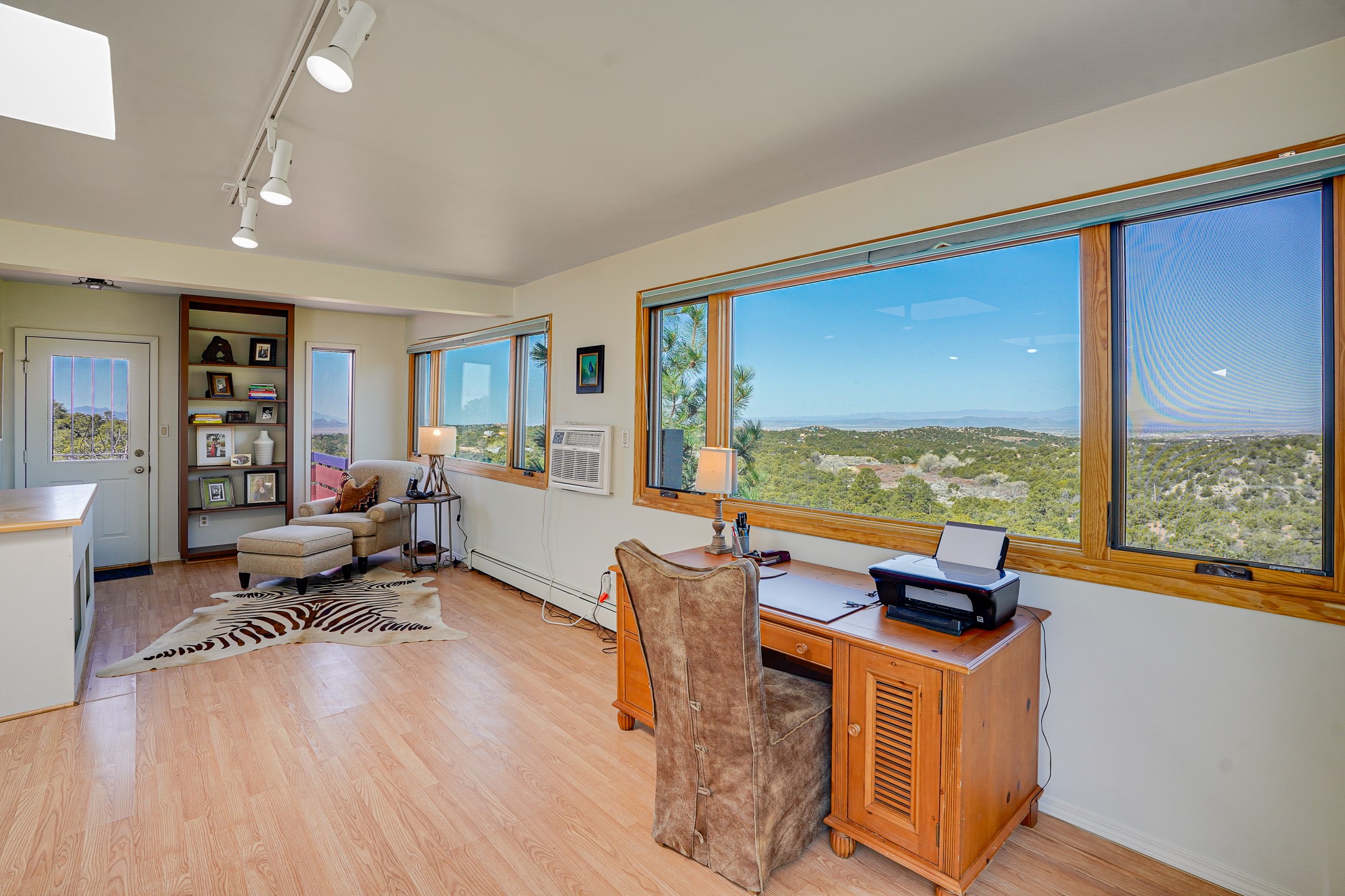 CASA SUNNA LUNA. Nestled just minutes off of the historic Old Santa Fe Trail and only 15 minutes from the heart of downtown Santa Fe, this adobe estate captures the essence of classic Southwestern elegance and modern comfort. Set on 5-acres, the property offers total privacy and breathtaking panoramic vistas of the Jemez Mountains and Santa Fe city lights.The main residence features a grand living and entertaining space adorned with multiple cozy kiva fireplaces, high viga accented ceilings, brick floors, iron work, colorful floral wall motifs, and traditional craftsmanship. Many recent practical improvements to the roof, exterior, and systems have also been made.Four spacious bedrooms make this a comfortable retreat for full-time living or hosting of guests. Not to be missed is the spacious, upstairs artist's retreat with panoramic views - the perfect place to paint, work, write, and create! The primary suite is private and appointed with a large ensuite bathroom, access to the enclosed in-ground spa, patio access, and sweeping sightlines across the high desert landscape. The grounds are equally serene with water features and fountains, multiple garden beds, and private patio enclaves. A long western-facing, covered portal, spanning the length of the main living room is the perfect outdoor extension to the main home's grand indoor living. A detached 1BD-1BA guest house, with its own garage, offers privacy and comfort for visitors, family or invites the potential for rental generating income. Whether you're soaking in the golden hour light from one of the many outdoor living spaces or relaxing by one of the property's four fireplaces, this one-of-a-kind property offers an unparalleled canvas equipped with undeniable tranquility, vistas and convenience to Santa Fe's exquisite destinations.
