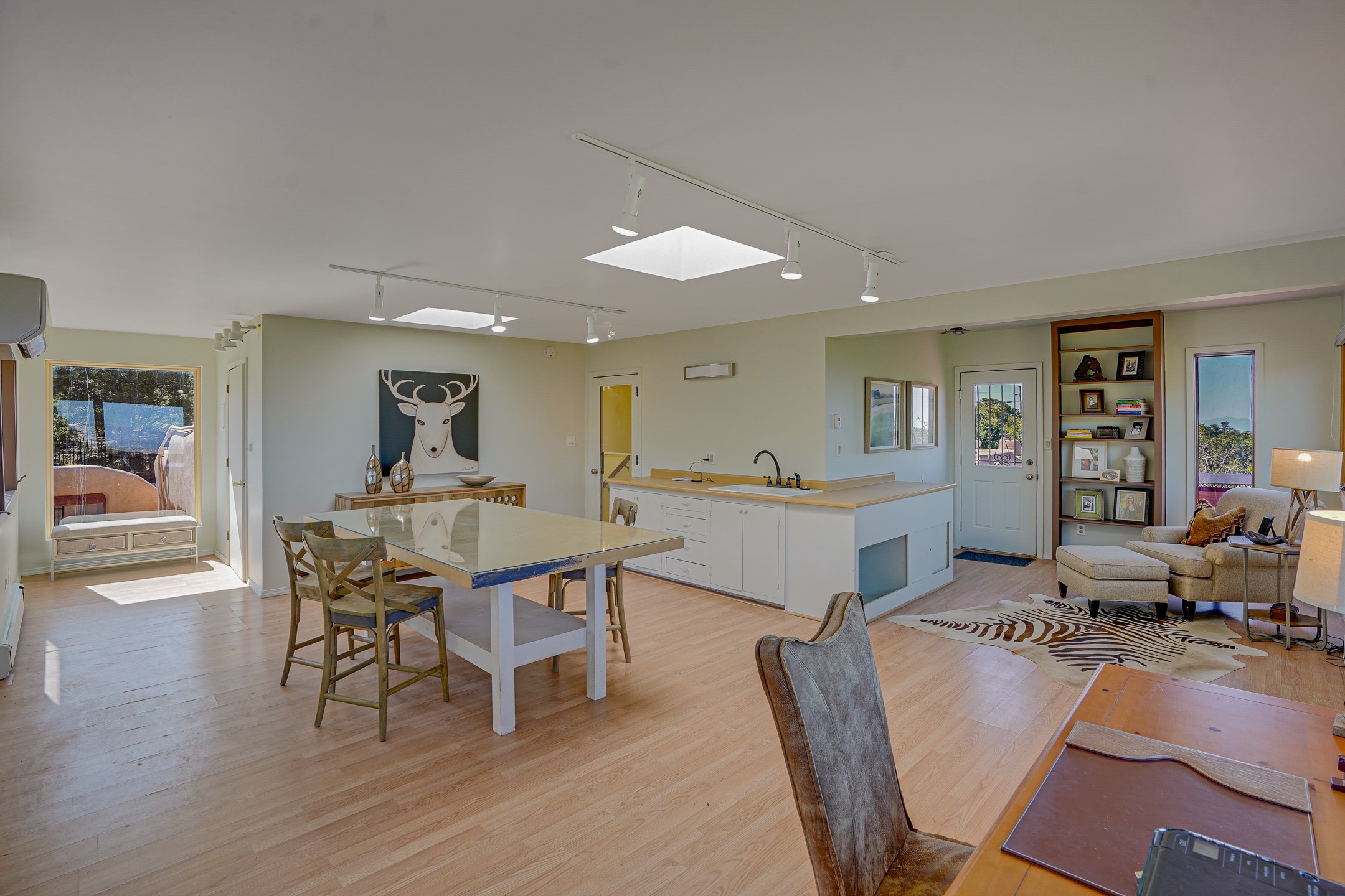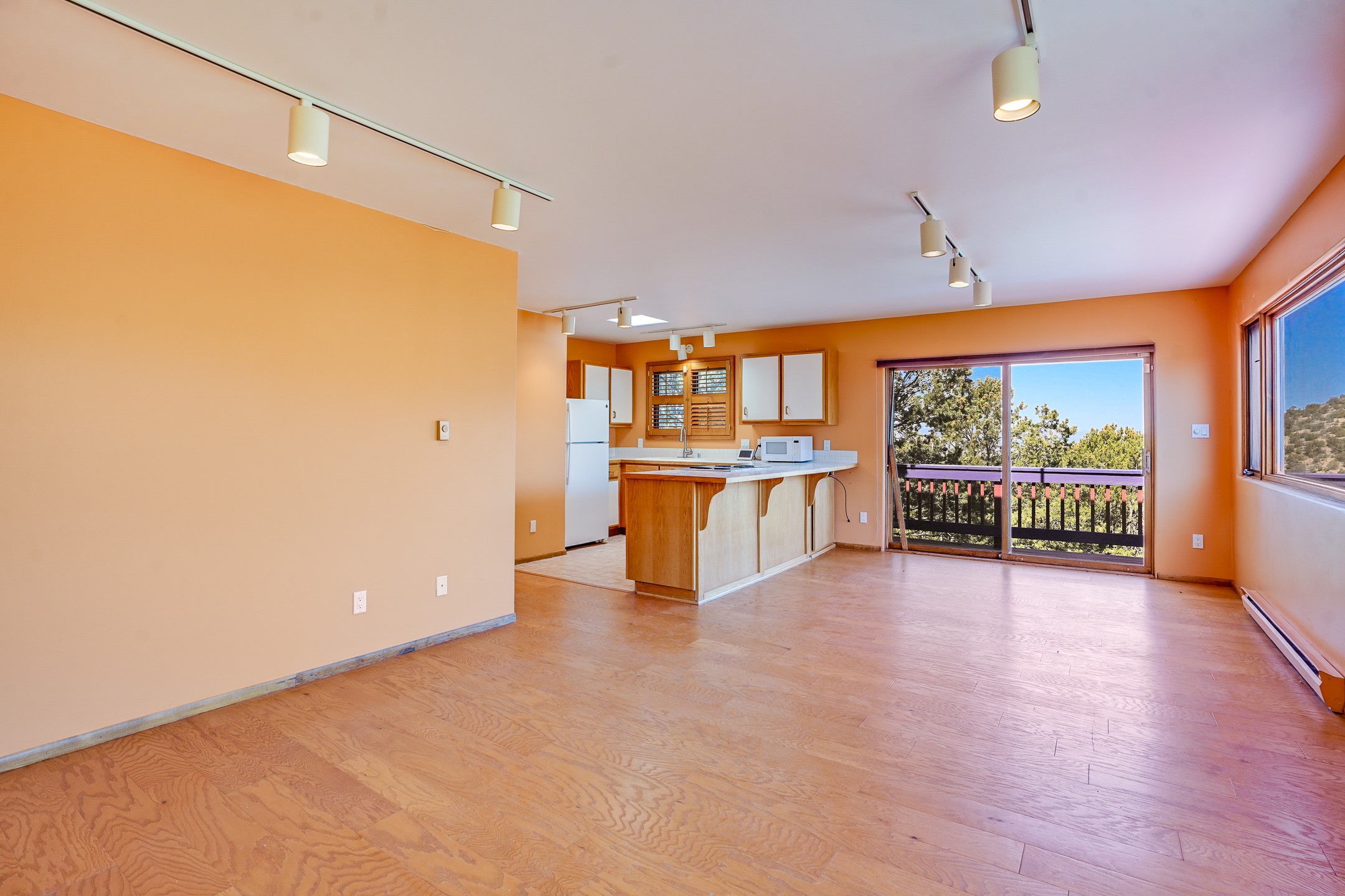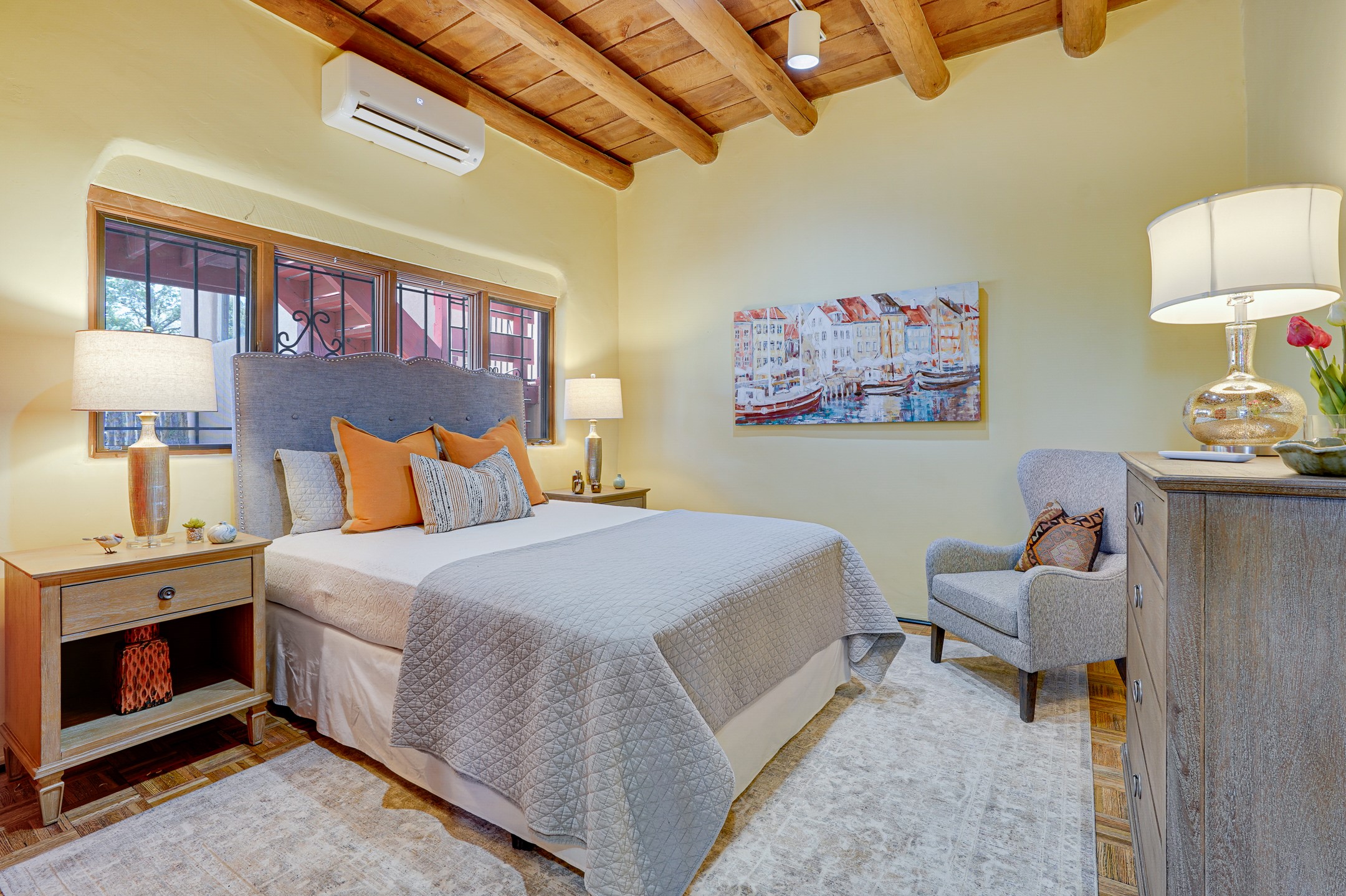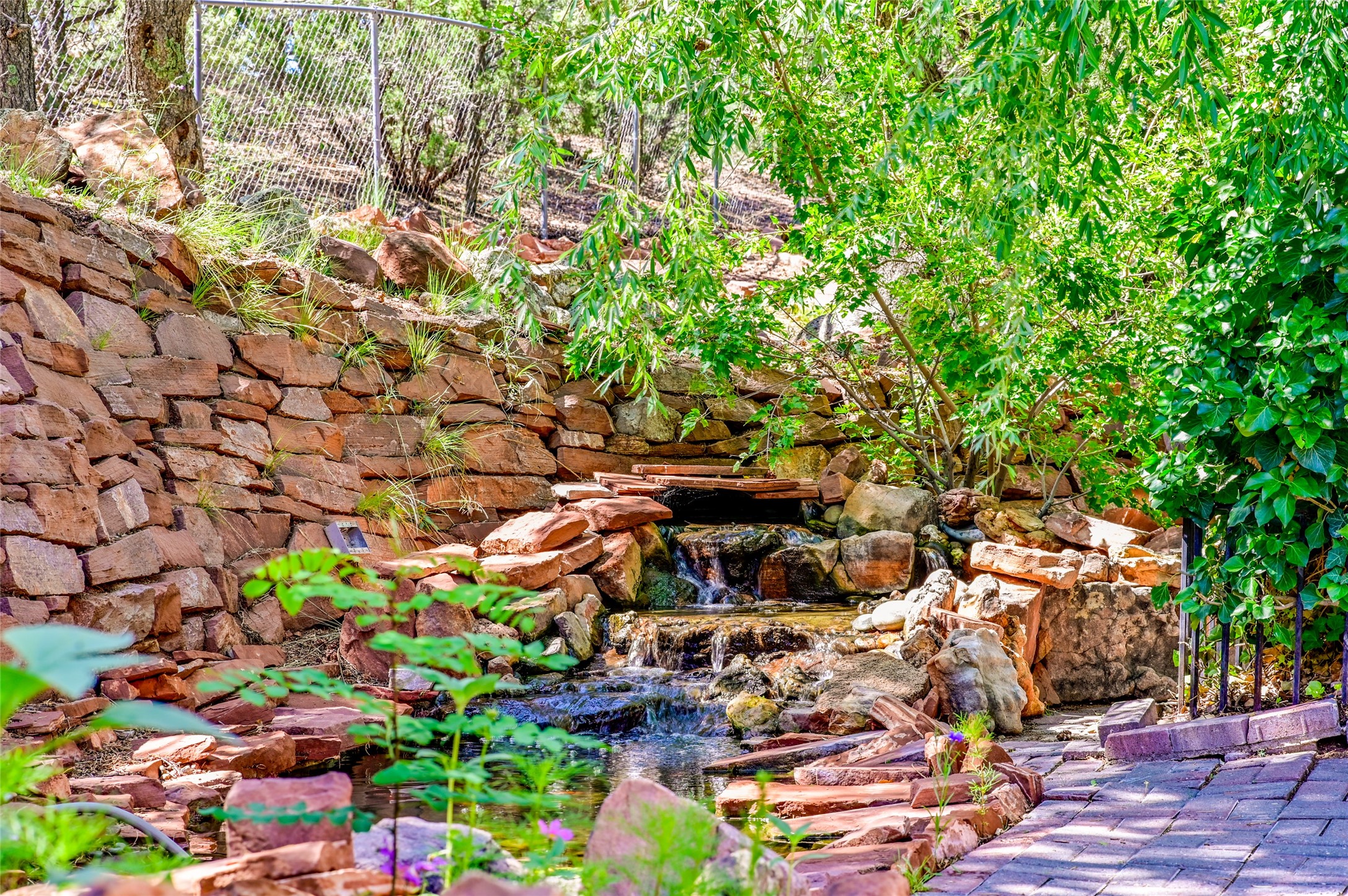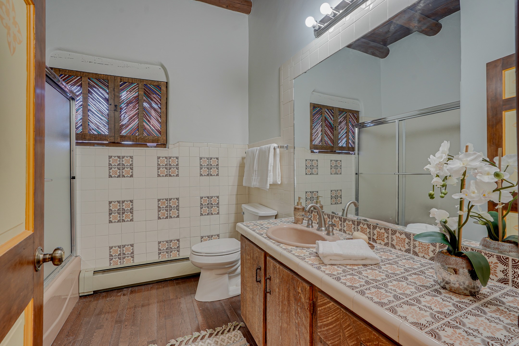 CASA SUNNA LUNA. Nestled just minutes off of the historic Old Santa Fe Trail and only 15 minutes from the heart of downtown Santa Fe, this adobe estate captures the essence of classic Southwestern elegance and modern comfort. Set on 5-acres, the property offers total privacy and breathtaking panoramic vistas of the Jemez Mountains and Santa Fe city lights.The main residence features a grand living and entertaining space adorned with multiple cozy kiva fireplaces, high viga accented ceilings, brick floors, iron work, colorful floral wall motifs, and traditional craftsmanship. Many recent practical improvements to the roof, exterior, and systems have also been made.Four spacious bedrooms make this a comfortable retreat for full-time living or hosting of guests. Not to be missed is the spacious, upstairs artist's retreat with panoramic views - the perfect place to paint, work, write, and create! The primary suite is private and appointed with a large ensuite bathroom, access to the enclosed in-ground spa, patio access, and sweeping sightlines across the high desert landscape. The grounds are equally serene with water features and fountains, multiple garden beds, and private patio enclaves. A long western-facing, covered portal, spanning the length of the main living room is the perfect outdoor extension to the main home's grand indoor living. A detached 1BD-1BA guest house, with its own garage, offers privacy and comfort for visitors, family or invites the potential for rental generating income. Whether you're soaking in the golden hour light from one of the many outdoor living spaces or relaxing by one of the property's four fireplaces, this one-of-a-kind property offers an unparalleled canvas equipped with undeniable tranquility, vistas and convenience to Santa Fe's exquisite destinations.