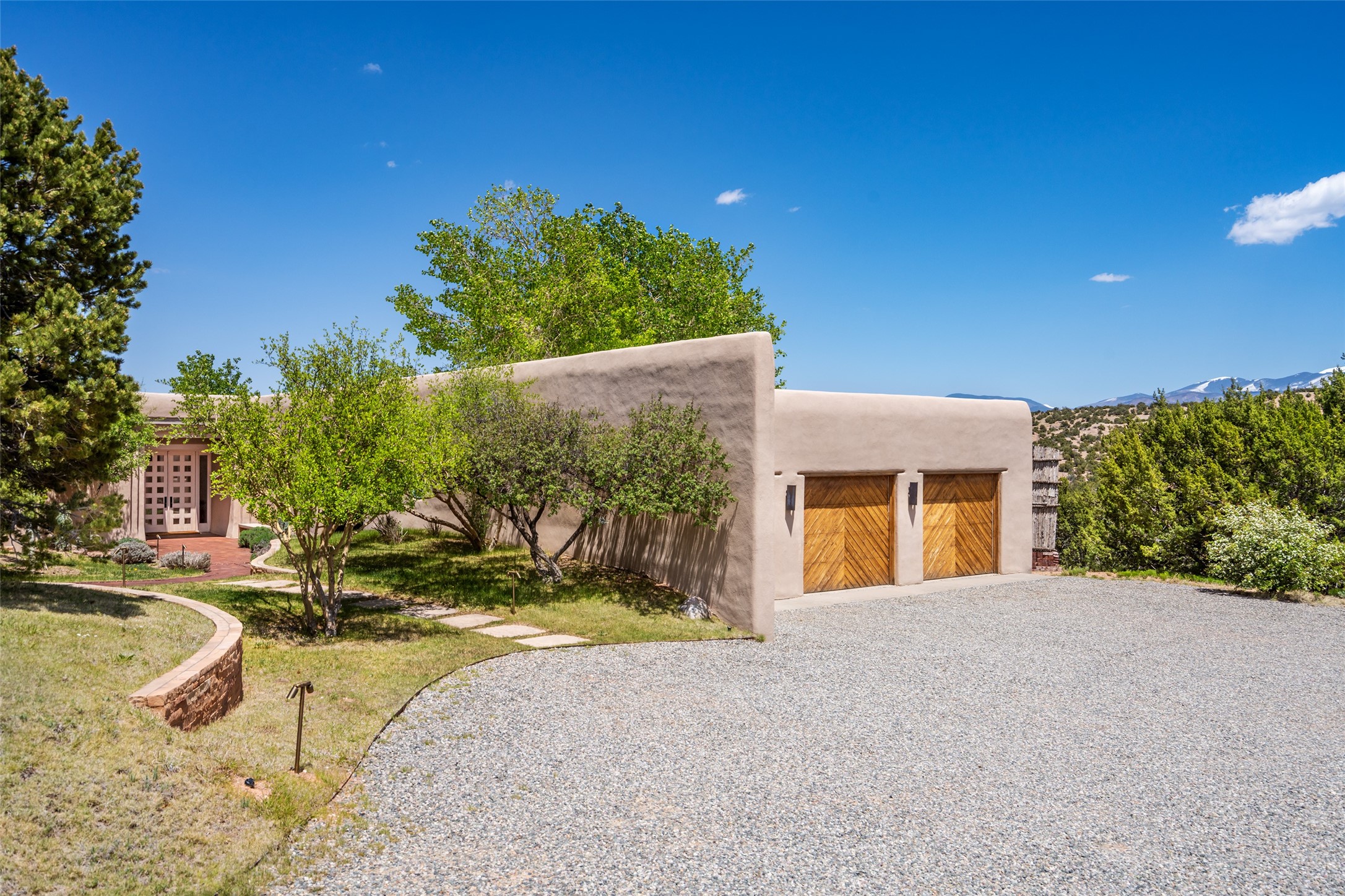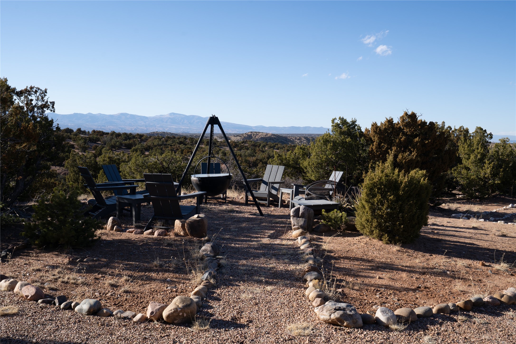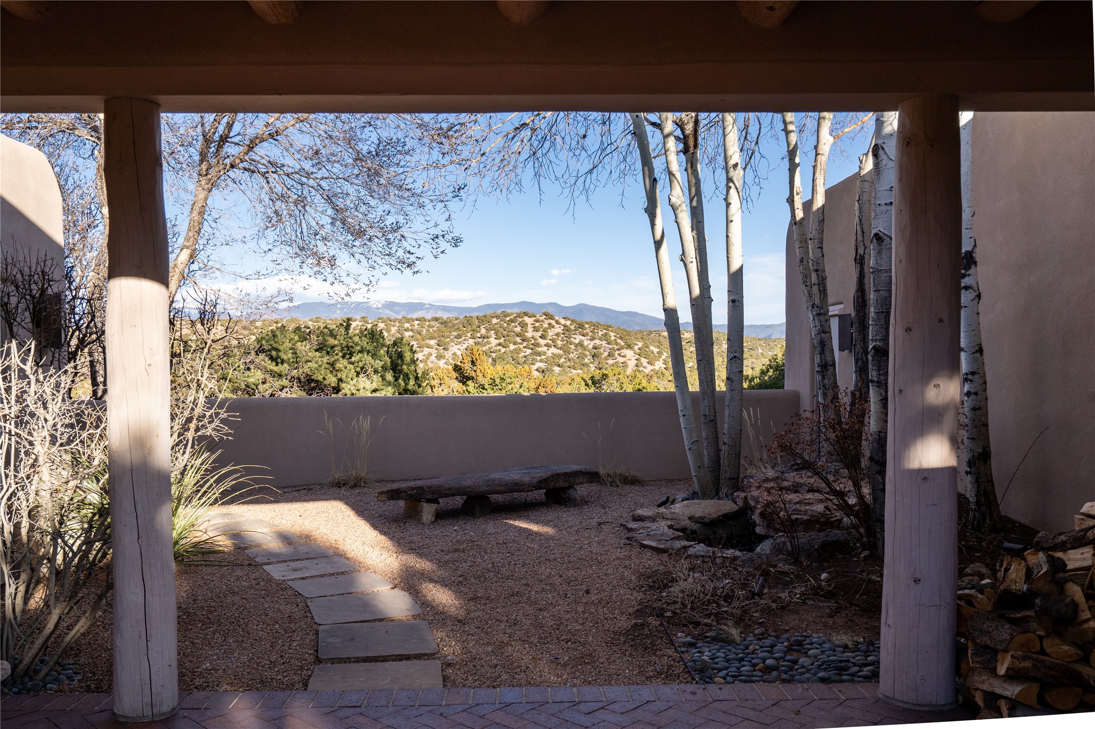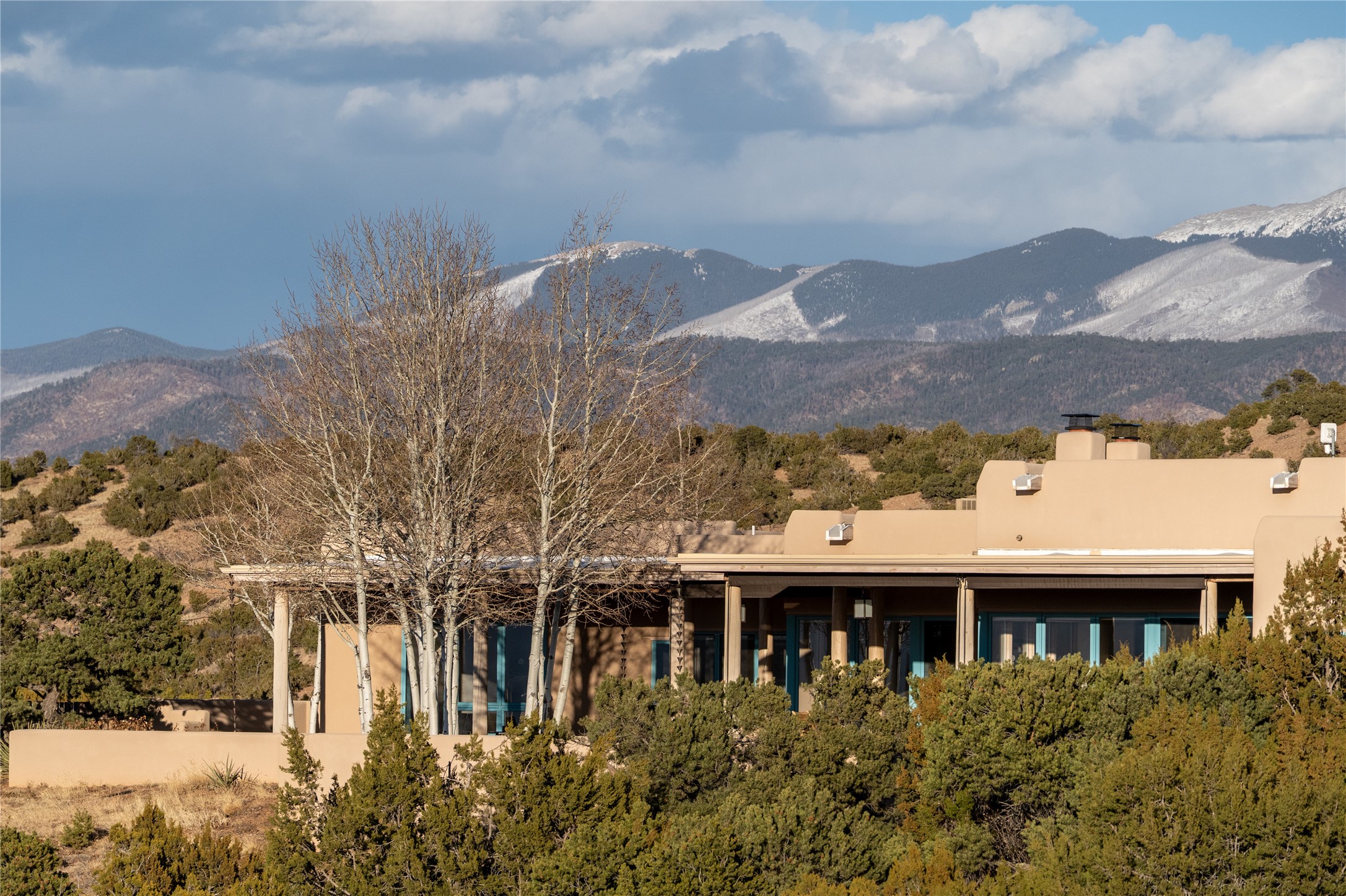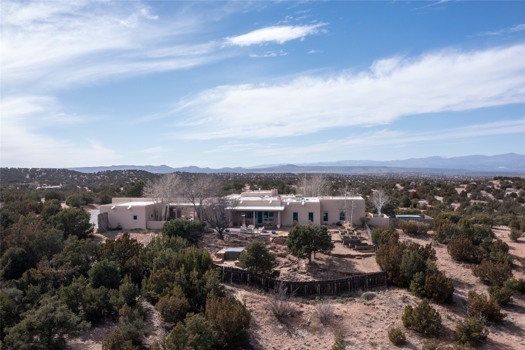Set on 13.5 acres of pristine land bordering open space, this striking estate offers a seamless blend of modern elegance and natural beauty. Designed for those who appreciate clean lines and open, light-filled spaces, the property includes a main house, a private guest house, versatile studio and multiple outdoor living spaces--all thoughtfully positioned to capture breathtaking views of the Santa Fe landscape and surrounding mountains. The 3,867 sq. ft. main residence is a masterpiece of understated sophistication, featuring an open floor plan enhanced by coved ceilings, smooth plaster walls, and flagstone flooring. Expansive floor-to-ceiling windows invite soft, natural light while framing the ever-changing beauty of the surrounding scenery. The living room, anchored by a commanding fireplace, offers the perfect setting for large-scale artwork and intimate gatherings. Designed for both comfort and functionality, the primary suite includes separate his-and-hers closets and baths. The family room could also double as an office and/or library. The kitchen is a chef's dream, equipped with high-end appliances, a very large island and a spacious walk-in pantry. Tucked away along a charming pathway is a 665 sf, one bed, one bath guest house which provides a peaceful retreat. Meanwhile, the impressive 1,440 sf studio is currently being used as a dedicated artist studio and personal gym. Spacious enough, it could also be a car collector's dream space or RV Storage. Don't miss this rare opportunity to own an exceptional home that balances contemporary design with the tranquility of nature, this estate is an inspiring sanctuary just waiting to be discovered.