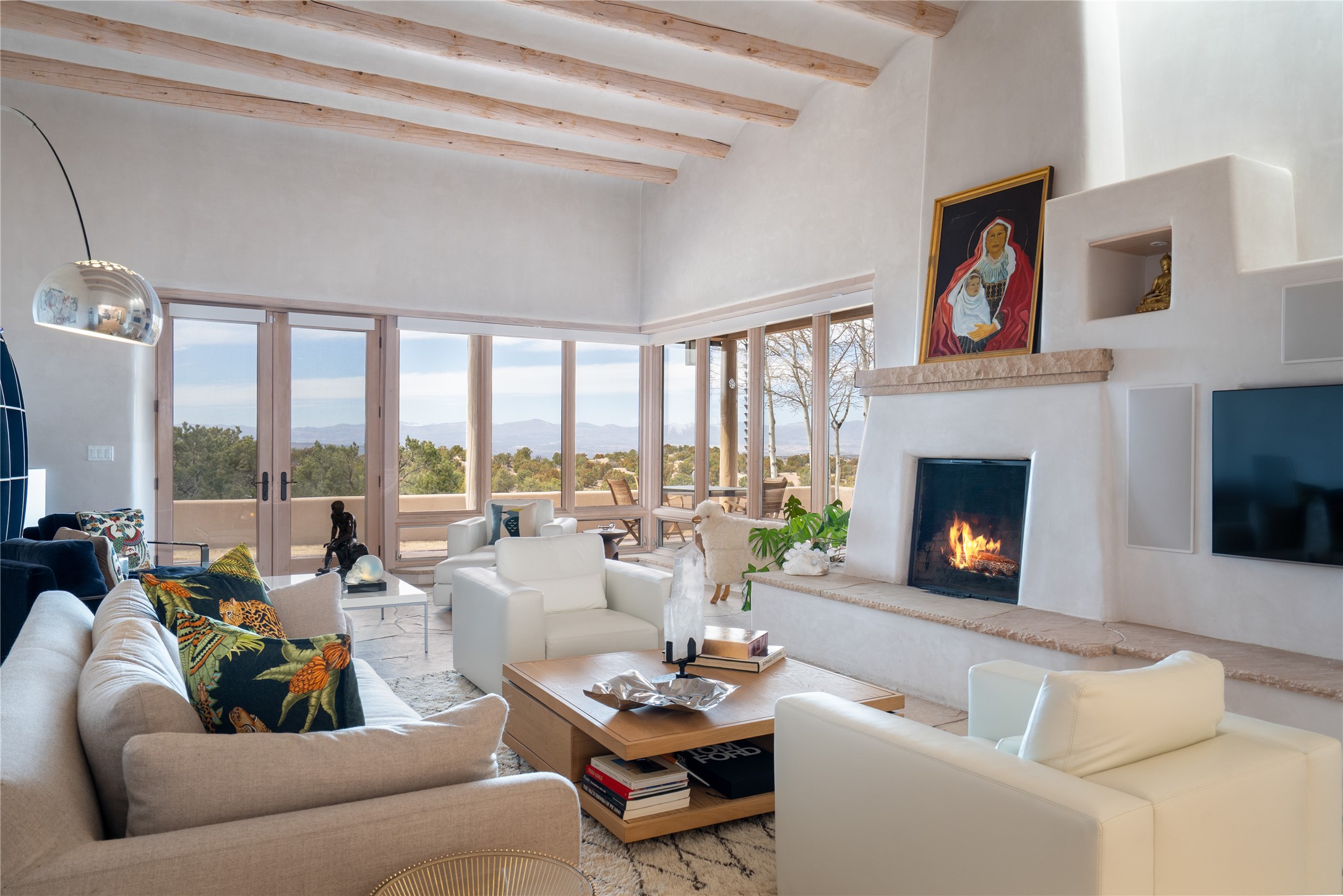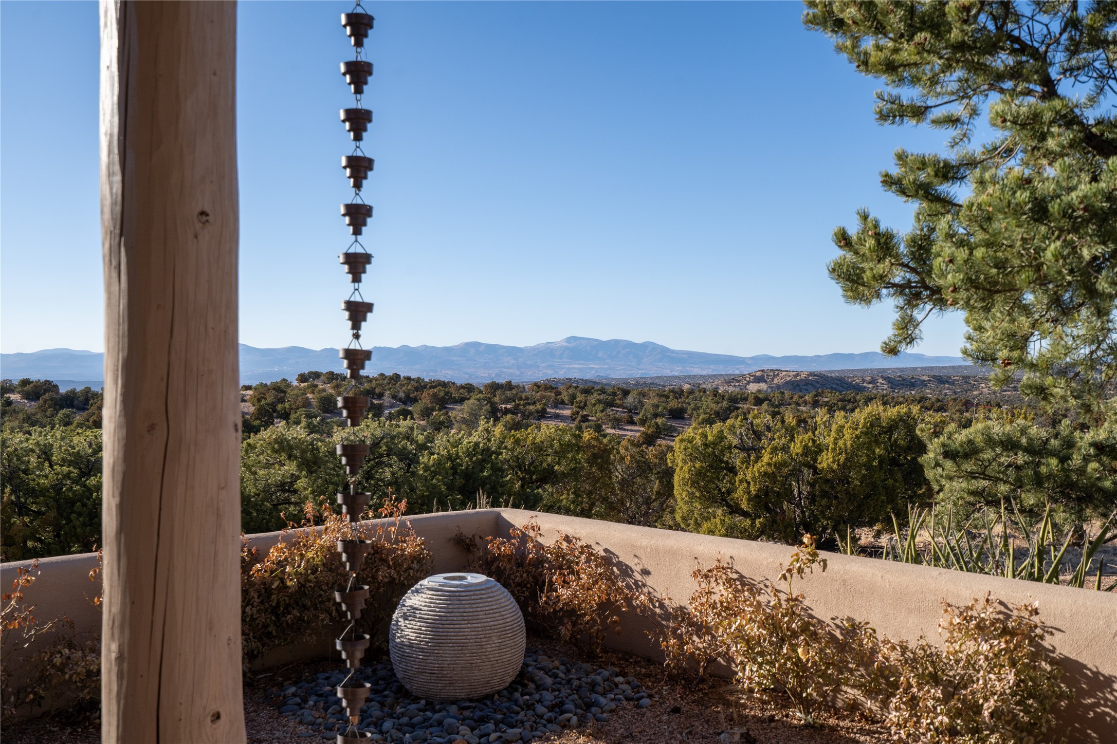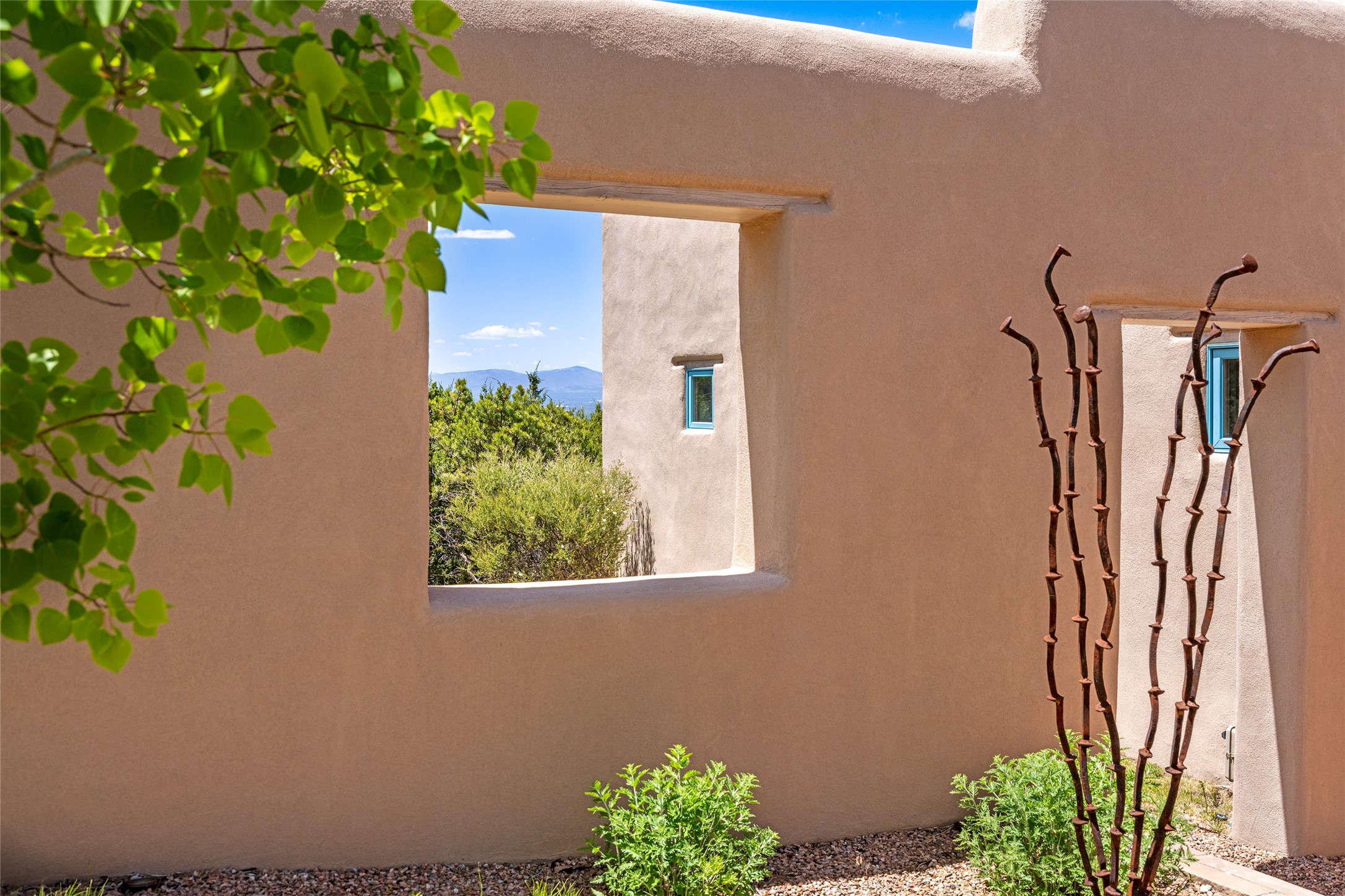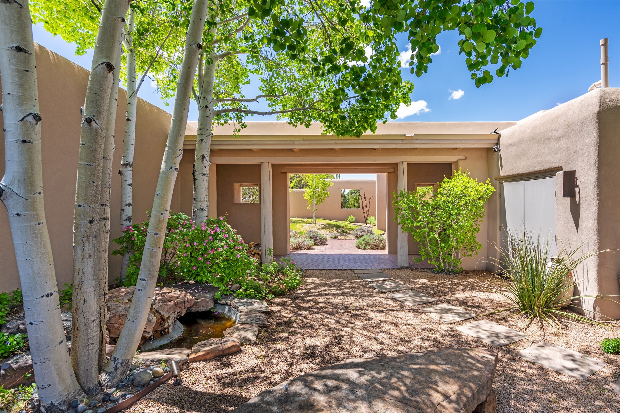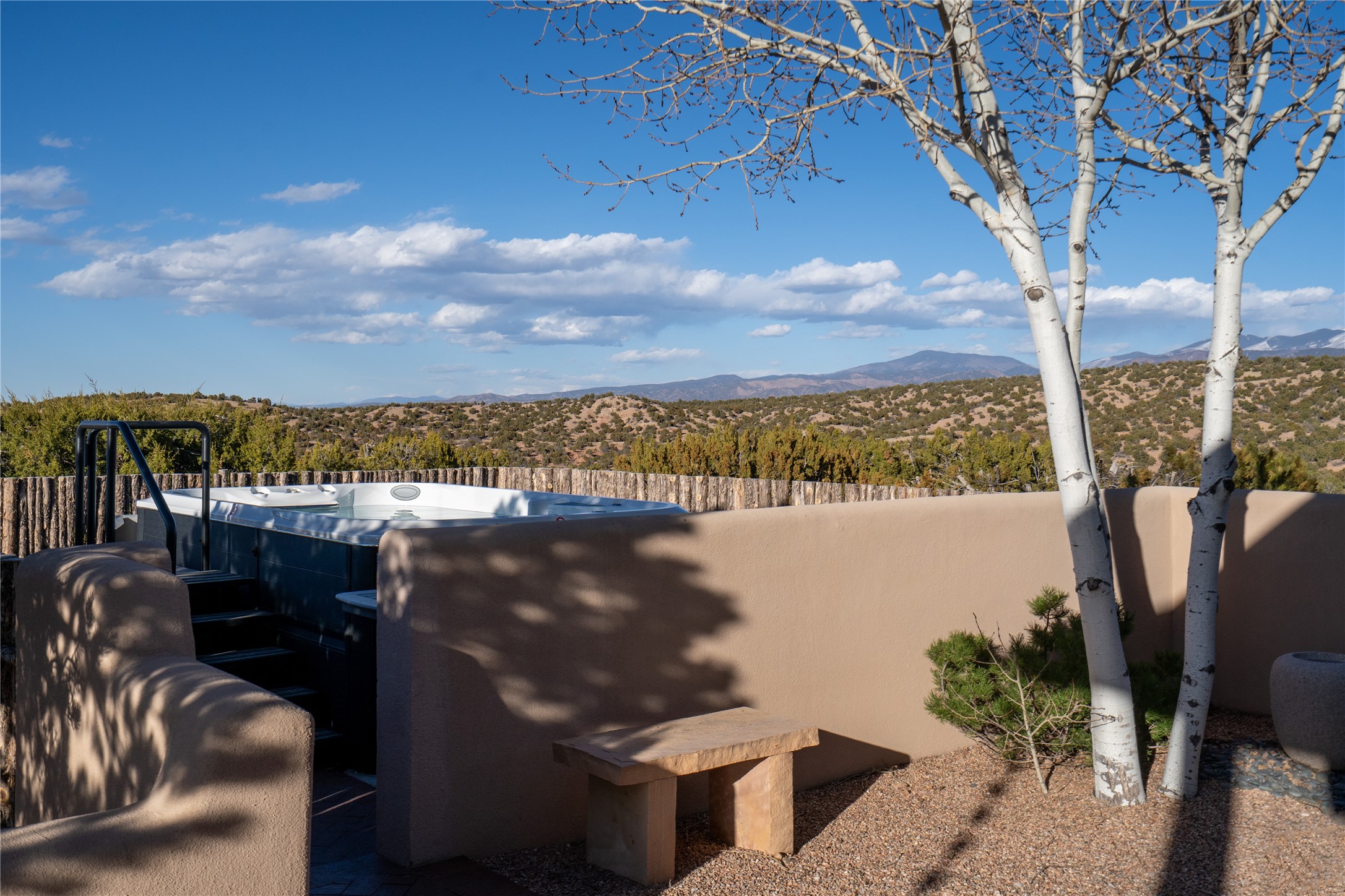 Set on 13.5 acres of pristine land bordering open space, this striking estate offers a seamless blend of modern elegance and natural beauty. Designed for those who appreciate clean lines and open, light-filled spaces, the property includes a main house, a private guest house, versatile studio and multiple outdoor living spaces--all thoughtfully positioned to capture breathtaking views of the Santa Fe landscape and surrounding mountains. The 3,867 sq. ft. main residence is a masterpiece of understated sophistication, featuring an open floor plan enhanced by coved ceilings, smooth plaster walls, and flagstone flooring. Expansive floor-to-ceiling windows invite soft, natural light while framing the ever-changing beauty of the surrounding scenery. The living room, anchored by a commanding fireplace, offers the perfect setting for large-scale artwork and intimate gatherings. Designed for both comfort and functionality, the primary suite includes separate his-and-hers closets and baths. The family room could also double as an office and/or library. The kitchen is a chef's dream, equipped with high-end appliances, a very large island and a spacious walk-in pantry. Tucked away along a charming pathway is a 665 sf, one bed, one bath guest house which provides a peaceful retreat. Meanwhile, the impressive 1,440 sf studio is currently being used as a dedicated artist studio and personal gym. Spacious enough, it could also be a car collector's dream space or RV Storage. Don't miss this rare opportunity to own an exceptional home that balances contemporary design with the tranquility of nature, this estate is an inspiring sanctuary just waiting to be discovered.