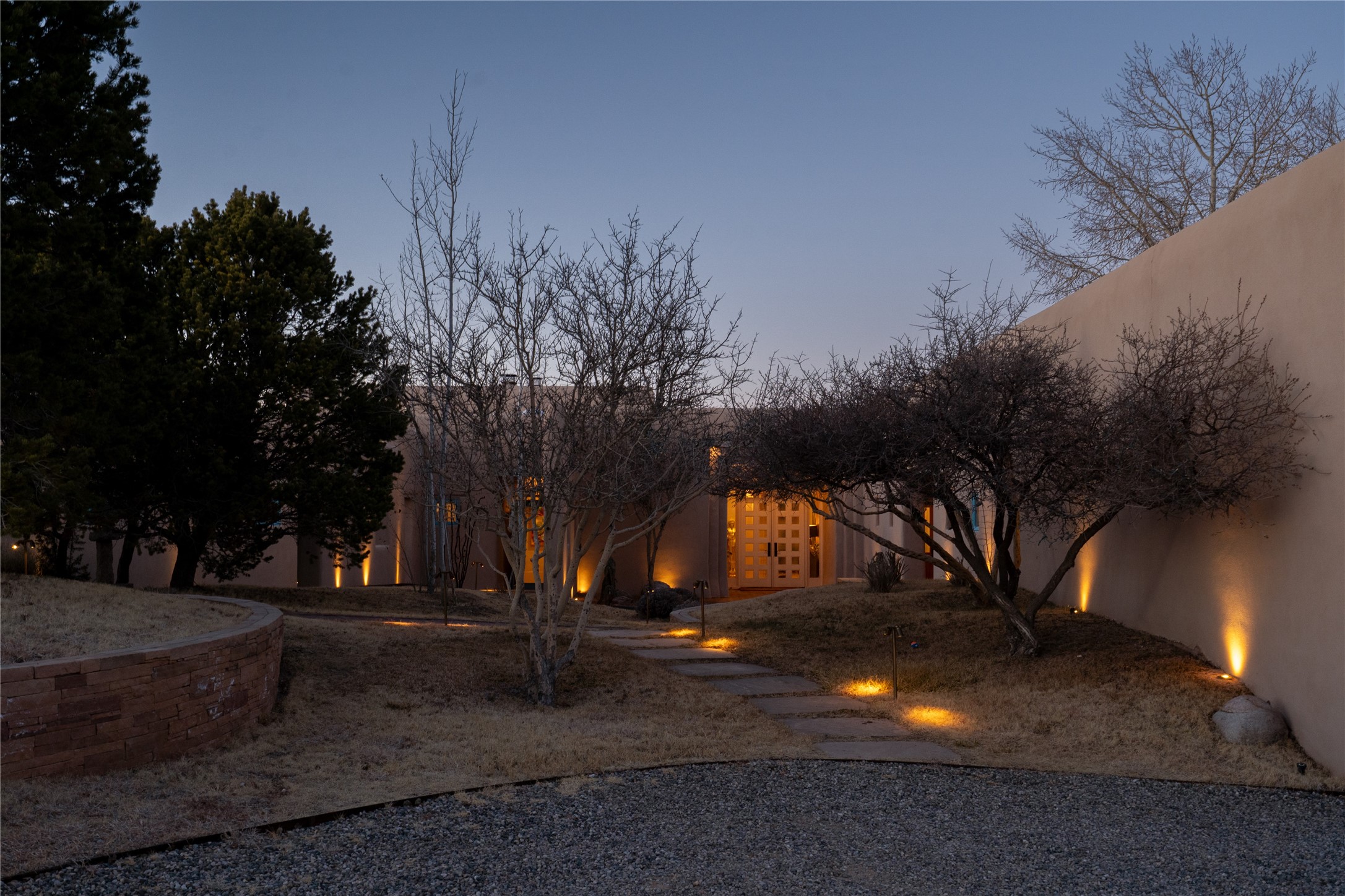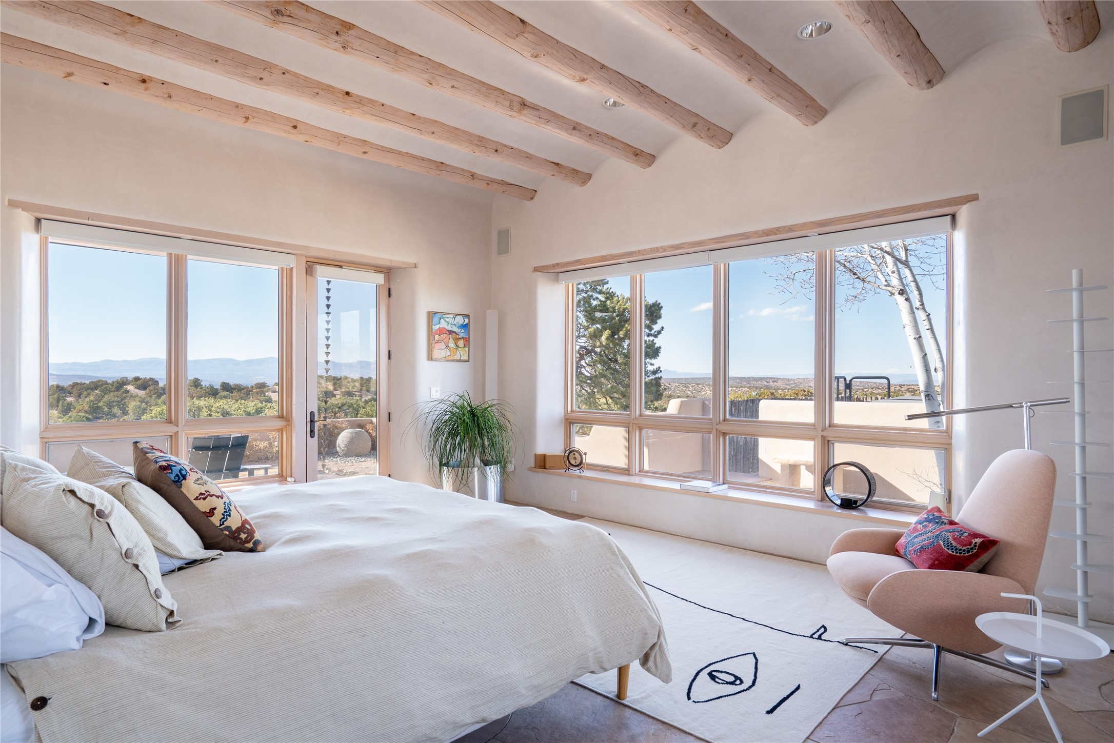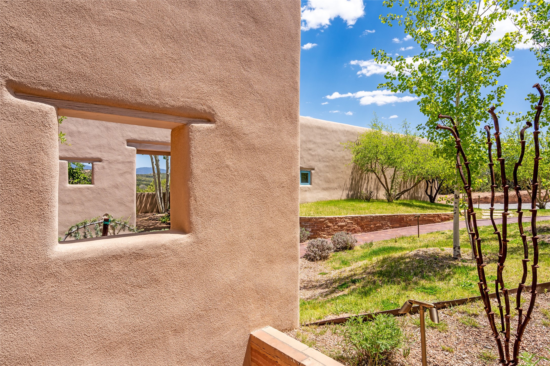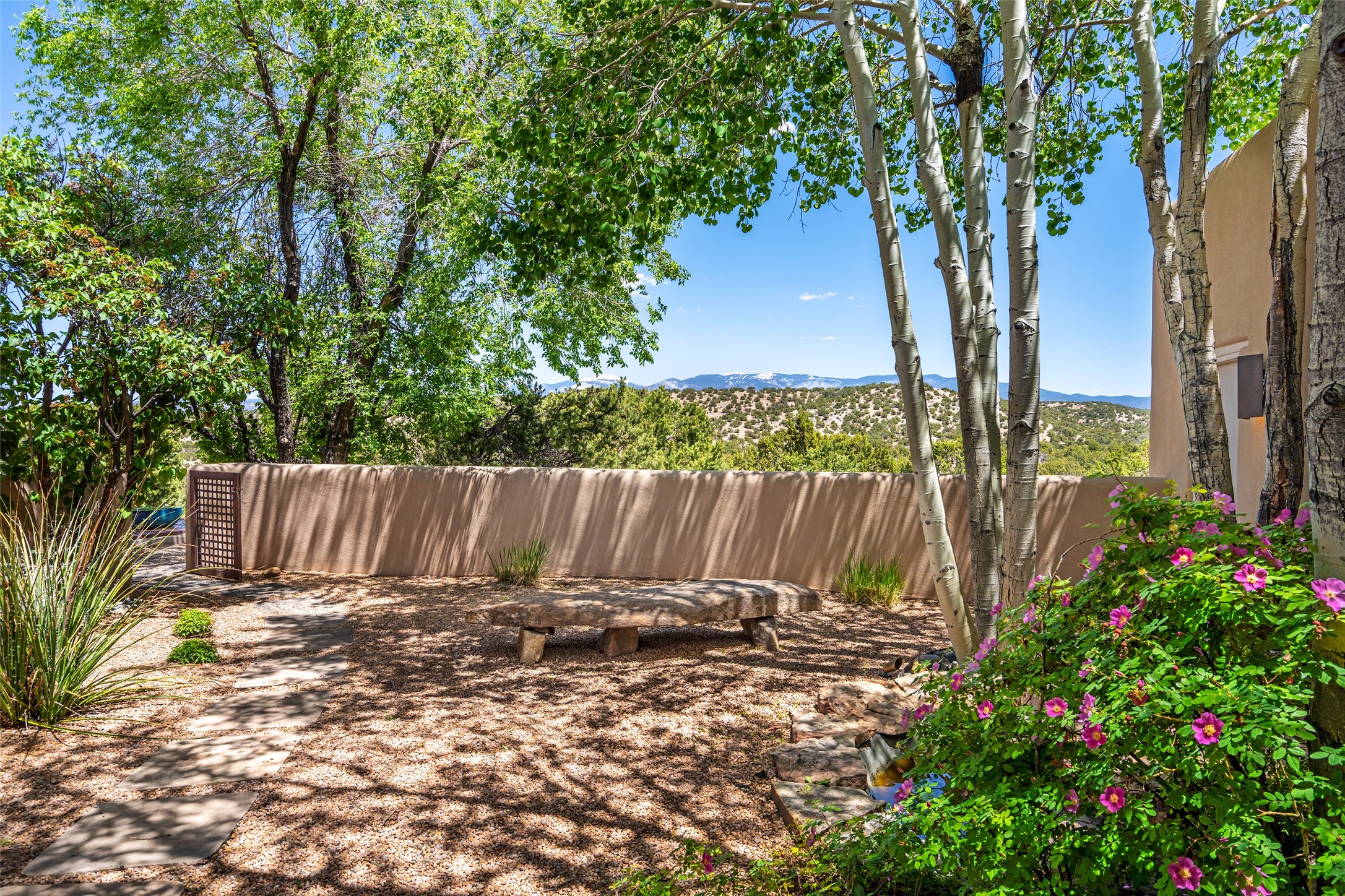Set on 13.5 acres of pristine land bordering open space, this striking estate offers a seamless blend of modern elegance and natural beauty. Designed for those who appreciate clean lines and open, light-filled spaces, the property includes a main house, a private guest house, versatile studio and multiple outdoor living spaces--all thoughtfully positioned to capture breathtaking views of the Santa Fe landscape and surrounding mountains. The 3,867 sq. ft. main residence is a masterpiece of understated sophistication, featuring an open floor plan enhanced by coved ceilings, smooth plaster walls, and flagstone flooring. Expansive floor-to-ceiling windows invite soft, natural light while framing the ever-changing beauty of the surrounding scenery. The living room, anchored by a commanding fireplace, offers the perfect setting for large-scale artwork and intimate gatherings. Designed for both comfort and functionality, the primary suite includes separate his-and-hers closets and baths. The family room could also double as an office and/or library. The kitchen is a chef's dream, equipped with high-end appliances, a very large island and a spacious walk-in pantry. Tucked away along a charming pathway is a 665 sf, one bed, one bath guest house which provides a peaceful retreat. Meanwhile, the impressive 1,440 sf studio is currently being used as a dedicated artist studio and personal gym. Spacious enough, it could also be a car collector's dream space or RV Storage. Don't miss this rare opportunity to own an exceptional home that balances contemporary design with the tranquility of nature, this estate is an inspiring sanctuary just waiting to be discovered.
