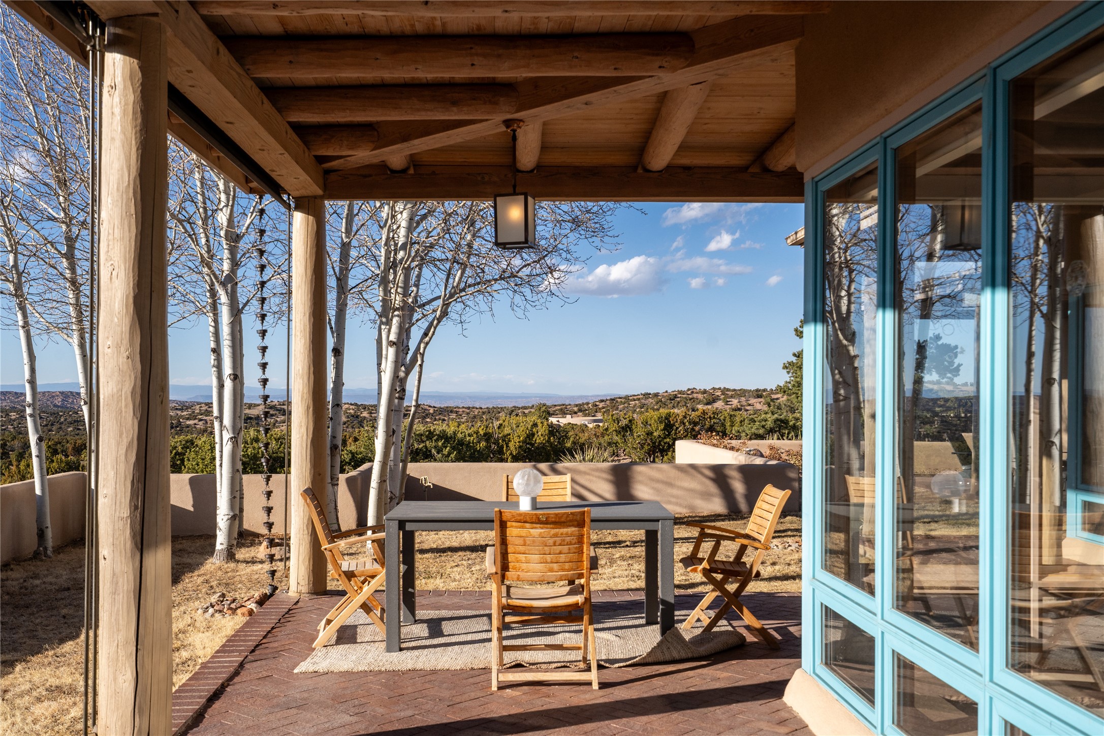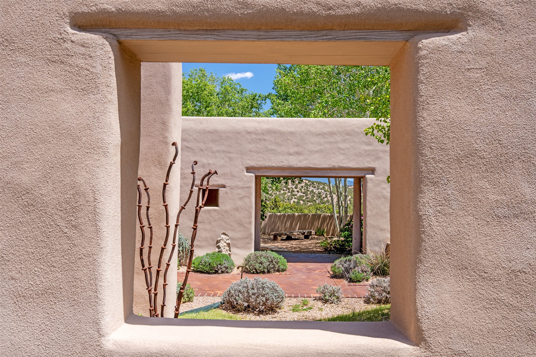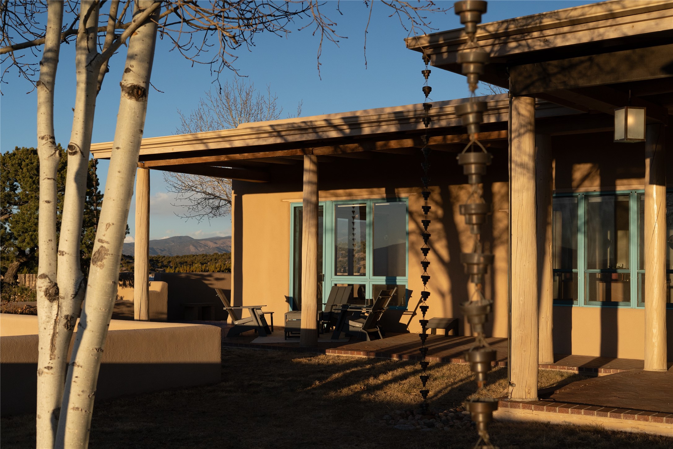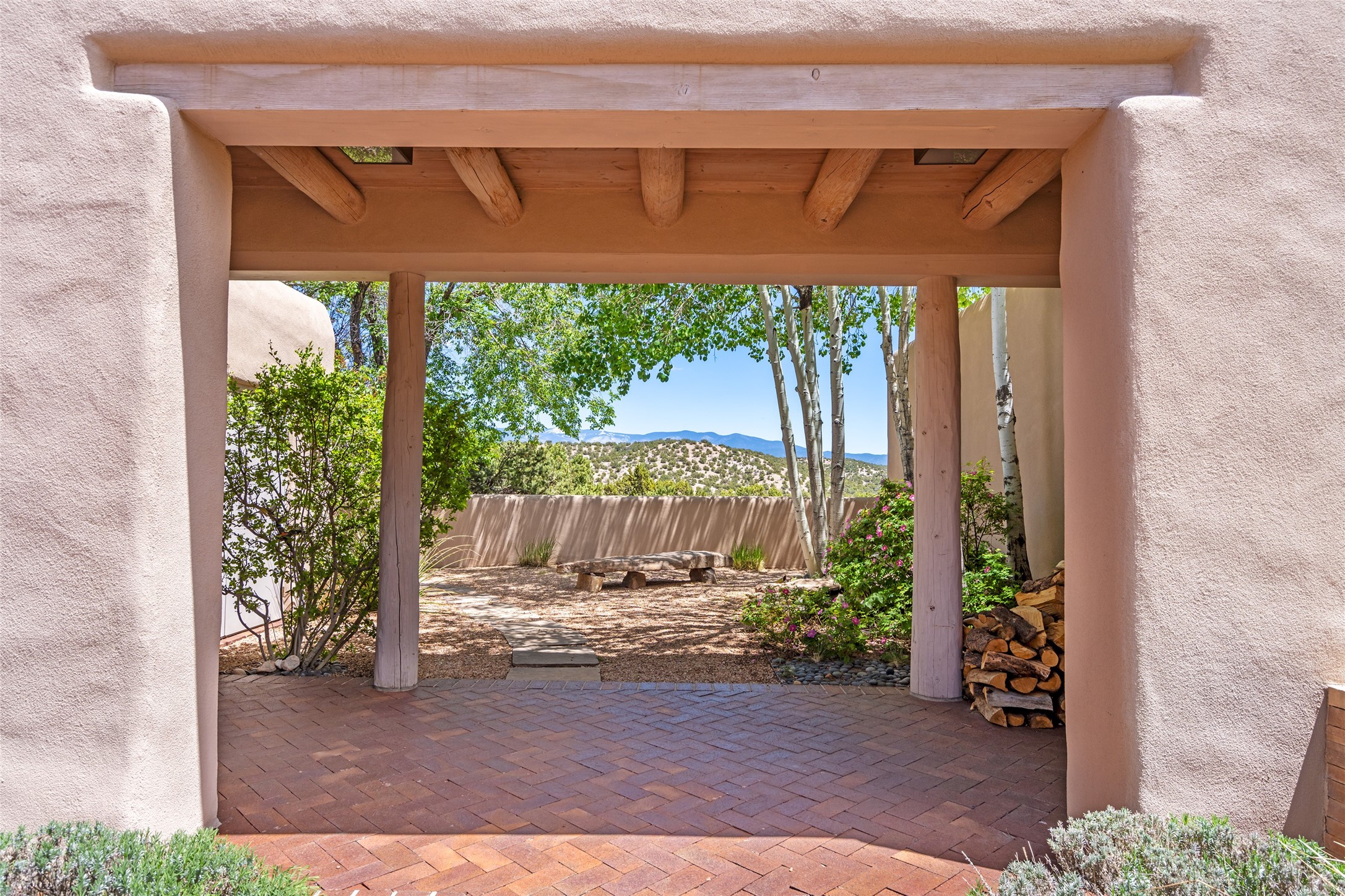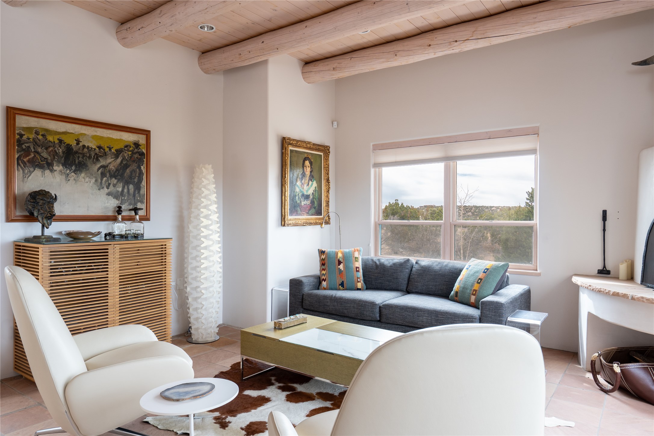 Set on 13.5 acres of pristine land bordering open space, this striking estate offers a seamless blend of modern elegance and natural beauty. Designed for those who appreciate clean lines and open, light-filled spaces, the property includes a main house, a private guest house, versatile studio and multiple outdoor living spaces--all thoughtfully positioned to capture breathtaking views of the Santa Fe landscape and surrounding mountains. The 3,867 sq. ft. main residence is a masterpiece of understated sophistication, featuring an open floor plan enhanced by coved ceilings, smooth plaster walls, and flagstone flooring. Expansive floor-to-ceiling windows invite soft, natural light while framing the ever-changing beauty of the surrounding scenery. The living room, anchored by a commanding fireplace, offers the perfect setting for large-scale artwork and intimate gatherings. Designed for both comfort and functionality, the primary suite includes separate his-and-hers closets and baths. The family room could also double as an office and/or library. The kitchen is a chef's dream, equipped with high-end appliances, a very large island and a spacious walk-in pantry. Tucked away along a charming pathway is a 665 sf, one bed, one bath guest house which provides a peaceful retreat. Meanwhile, the impressive 1,440 sf studio is currently being used as a dedicated artist studio and personal gym. Spacious enough, it could also be a car collector's dream space or RV Storage. Don't miss this rare opportunity to own an exceptional home that balances contemporary design with the tranquility of nature, this estate is an inspiring sanctuary just waiting to be discovered.
