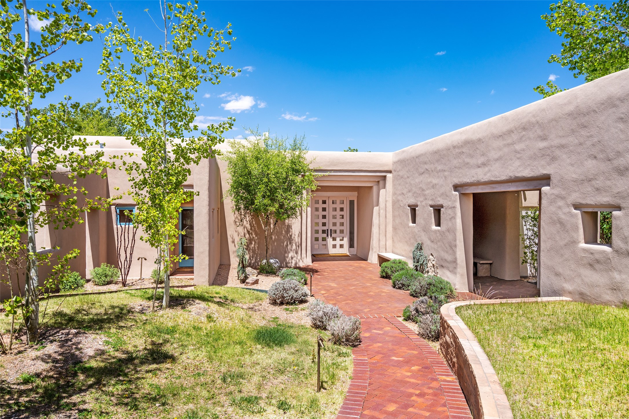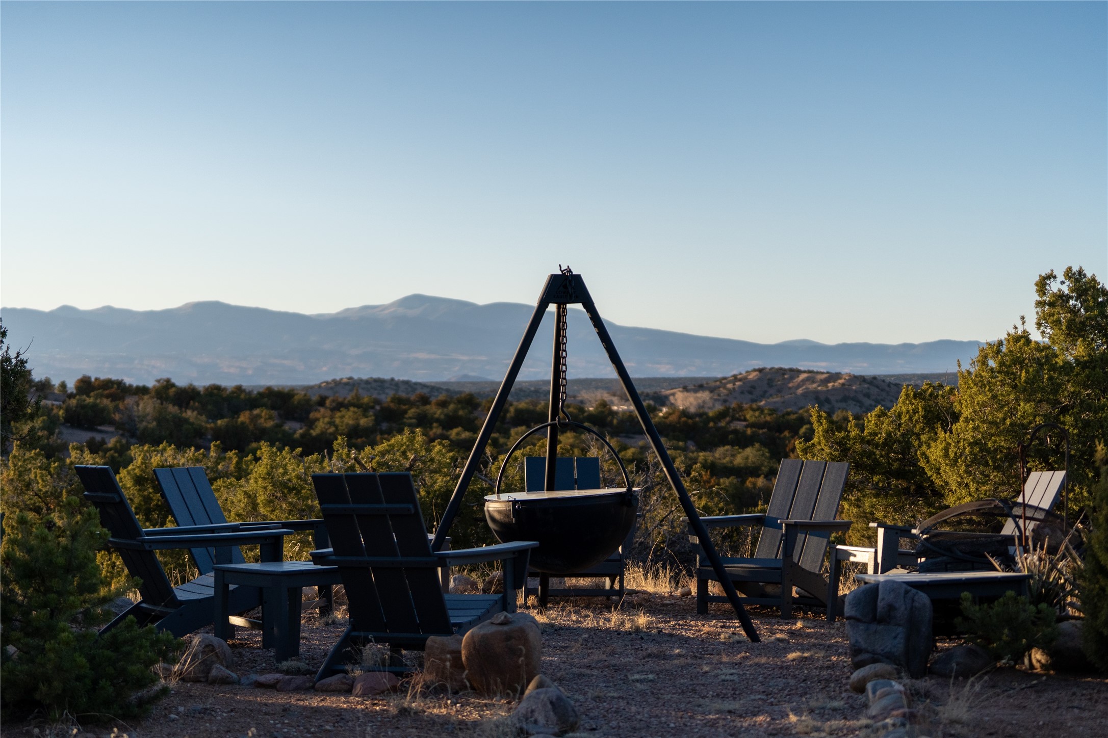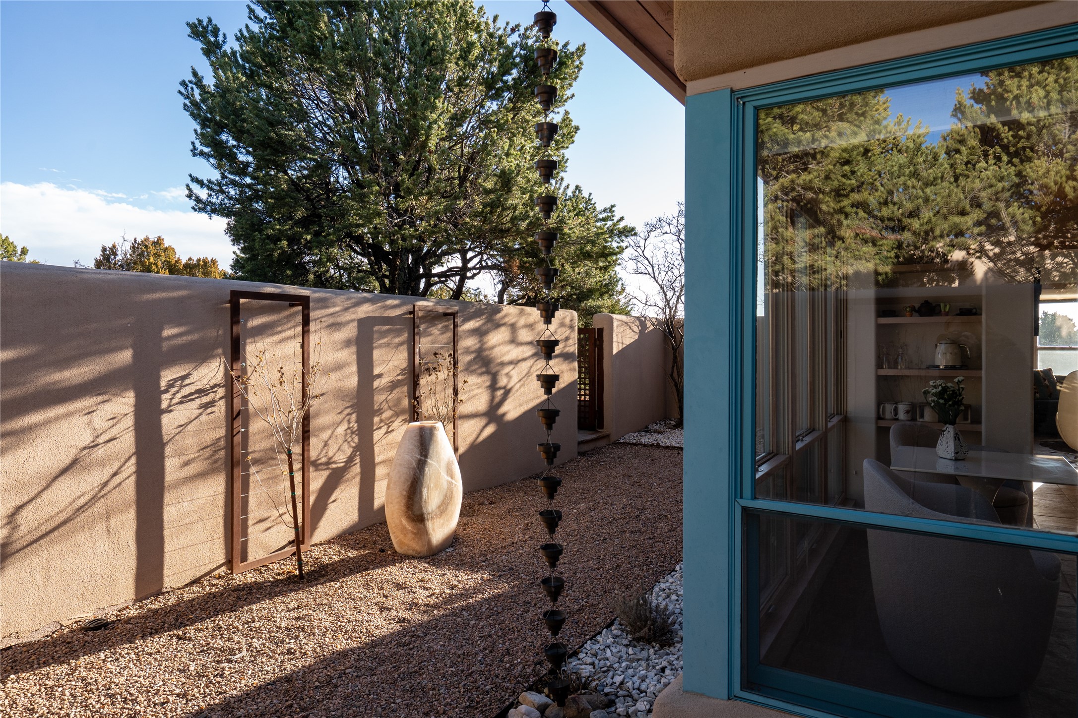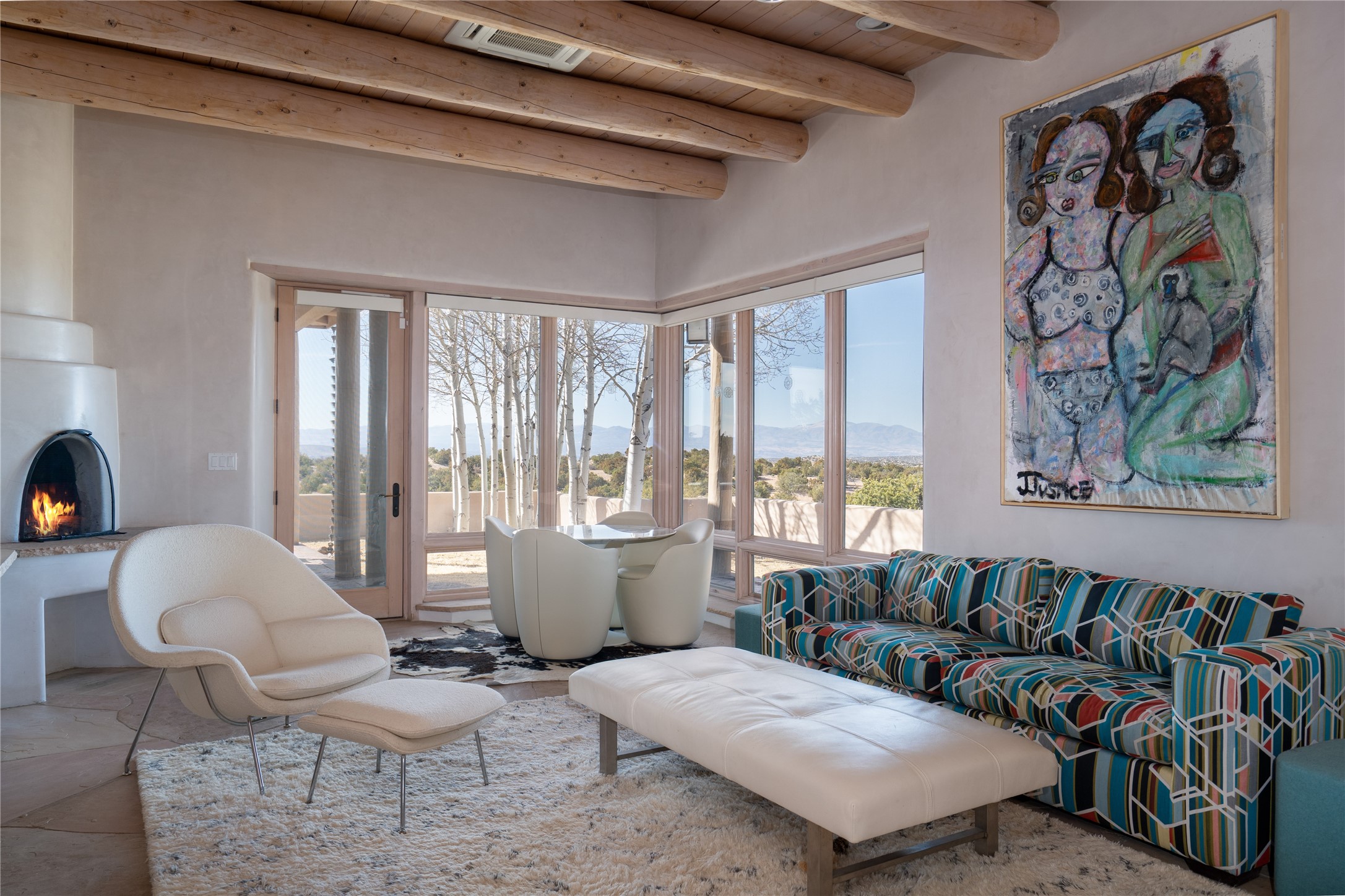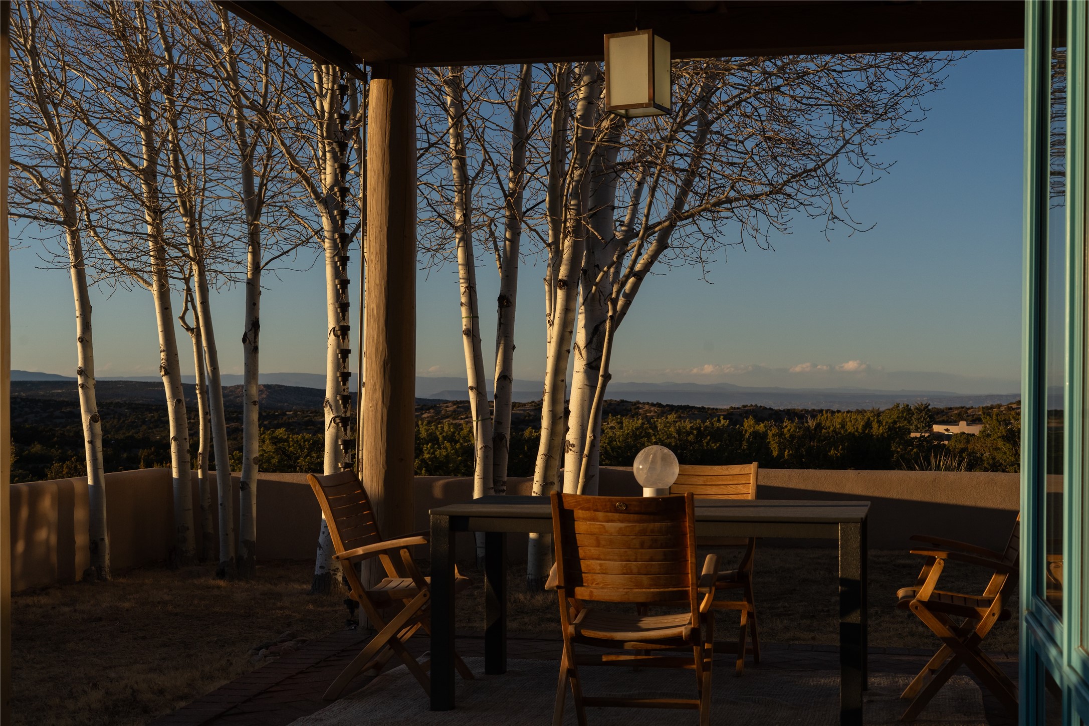 Set on 13.5 acres of pristine land bordering open space, this striking estate offers a seamless blend of modern elegance and natural beauty. Designed for those who appreciate clean lines and open, light-filled spaces, the property includes a main house, a private guest house, versatile studio and multiple outdoor living spaces--all thoughtfully positioned to capture breathtaking views of the Santa Fe landscape and surrounding mountains. The 3,867 sq. ft. main residence is a masterpiece of understated sophistication, featuring an open floor plan enhanced by coved ceilings, smooth plaster walls, and flagstone flooring. Expansive floor-to-ceiling windows invite soft, natural light while framing the ever-changing beauty of the surrounding scenery. The living room, anchored by a commanding fireplace, offers the perfect setting for large-scale artwork and intimate gatherings. Designed for both comfort and functionality, the primary suite includes separate his-and-hers closets and baths. The family room could also double as an office and/or library. The kitchen is a chef's dream, equipped with high-end appliances, a very large island and a spacious walk-in pantry. Tucked away along a charming pathway is a 665 sf, one bed, one bath guest house which provides a peaceful retreat. Meanwhile, the impressive 1,440 sf studio is currently being used as a dedicated artist studio and personal gym. Spacious enough, it could also be a car collector's dream space or RV Storage. Don't miss this rare opportunity to own an exceptional home that balances contemporary design with the tranquility of nature, this estate is an inspiring sanctuary just waiting to be discovered.
