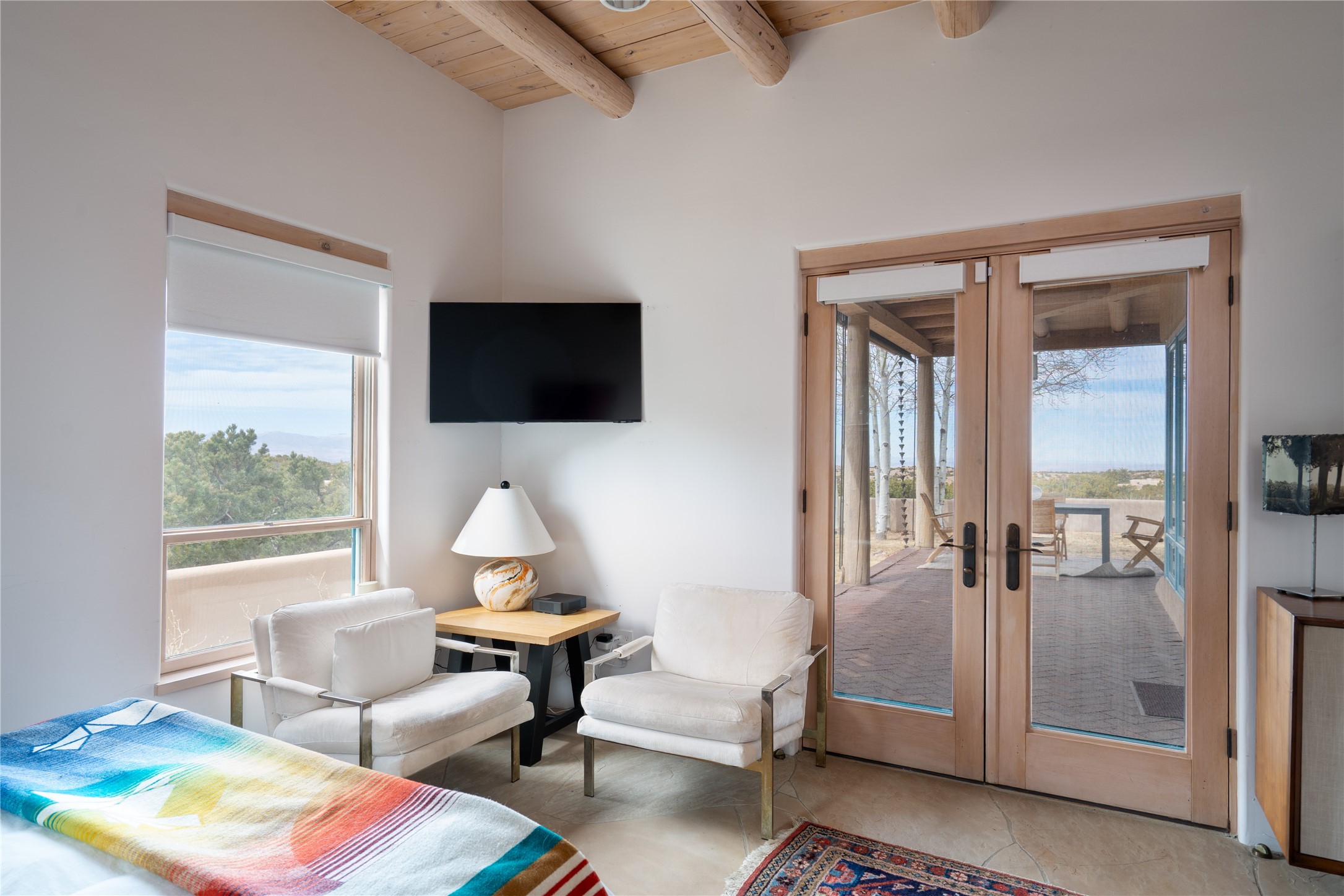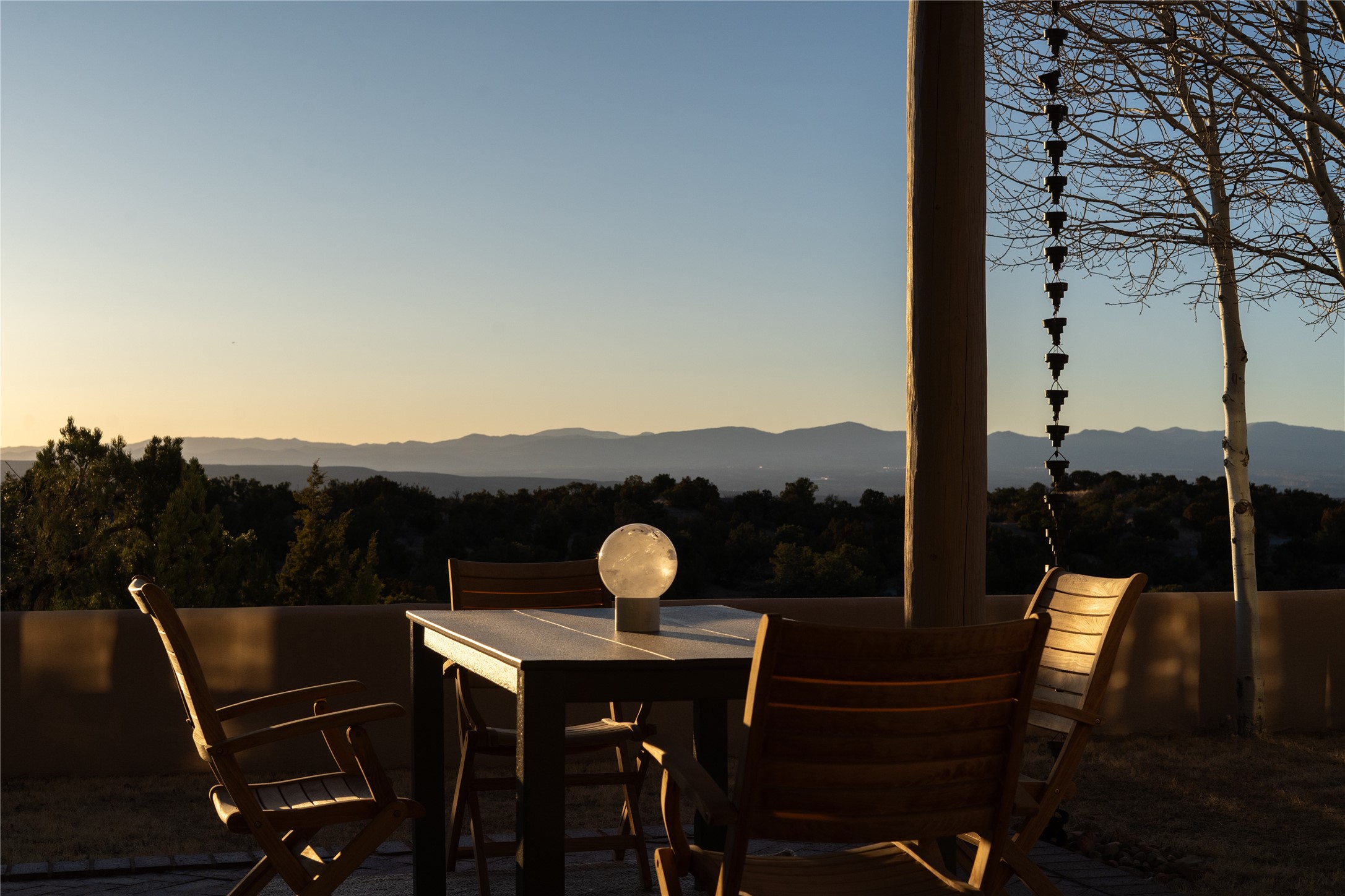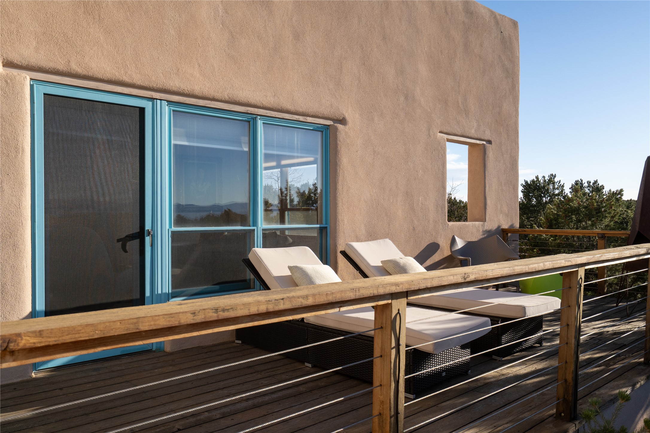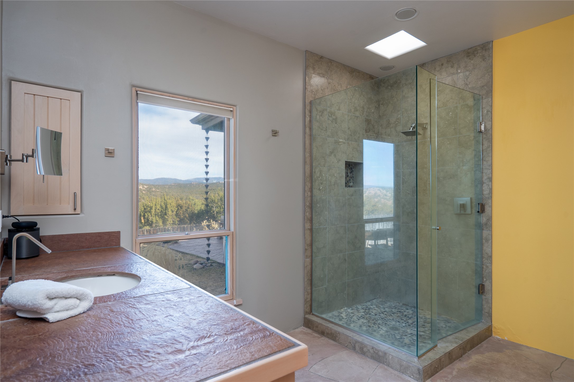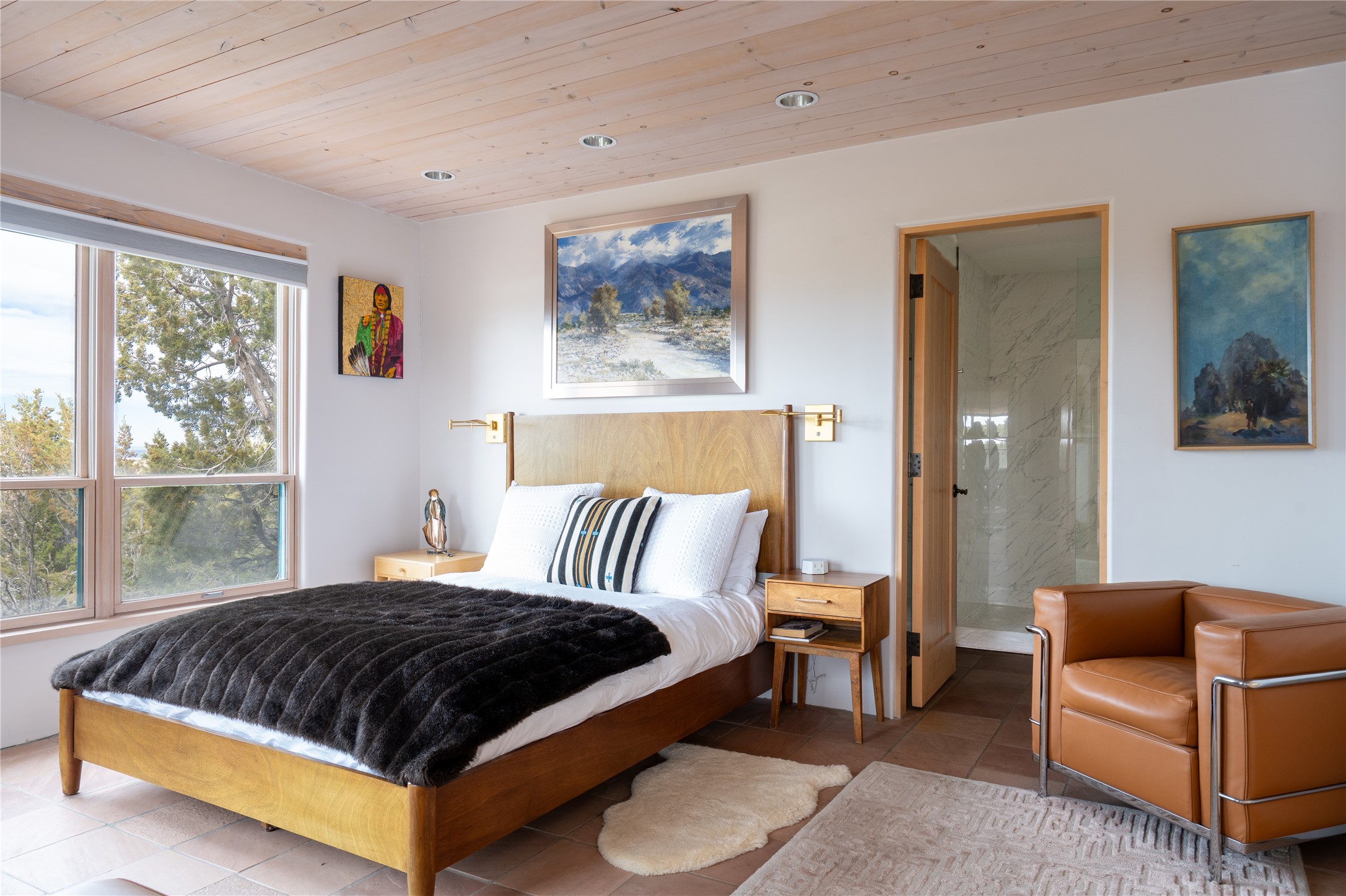 Set on 13.5 acres of pristine land bordering open space, this striking estate offers a seamless blend of modern elegance and natural beauty. Designed for those who appreciate clean lines and open, light-filled spaces, the property includes a main house, a private guest house, versatile studio and multiple outdoor living spaces--all thoughtfully positioned to capture breathtaking views of the Santa Fe landscape and surrounding mountains. The 3,867 sq. ft. main residence is a masterpiece of understated sophistication, featuring an open floor plan enhanced by coved ceilings, smooth plaster walls, and flagstone flooring. Expansive floor-to-ceiling windows invite soft, natural light while framing the ever-changing beauty of the surrounding scenery. The living room, anchored by a commanding fireplace, offers the perfect setting for large-scale artwork and intimate gatherings. Designed for both comfort and functionality, the primary suite includes separate his-and-hers closets and baths. The family room could also double as an office and/or library. The kitchen is a chef's dream, equipped with high-end appliances, a very large island and a spacious walk-in pantry. Tucked away along a charming pathway is a 665 sf, one bed, one bath guest house which provides a peaceful retreat. Meanwhile, the impressive 1,440 sf studio is currently being used as a dedicated artist studio and personal gym. Spacious enough, it could also be a car collector's dream space or RV Storage. Don't miss this rare opportunity to own an exceptional home that balances contemporary design with the tranquility of nature, this estate is an inspiring sanctuary just waiting to be discovered.