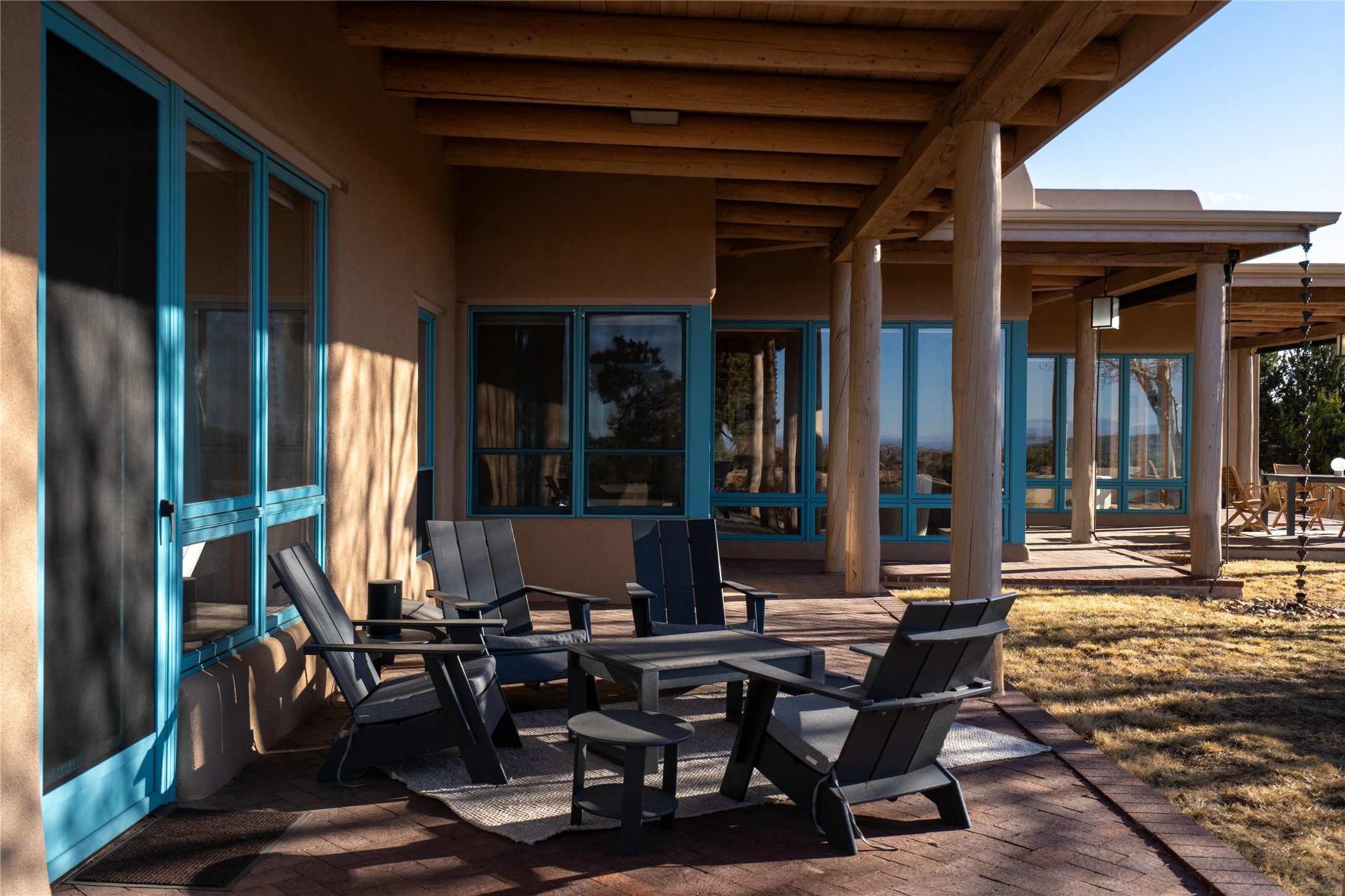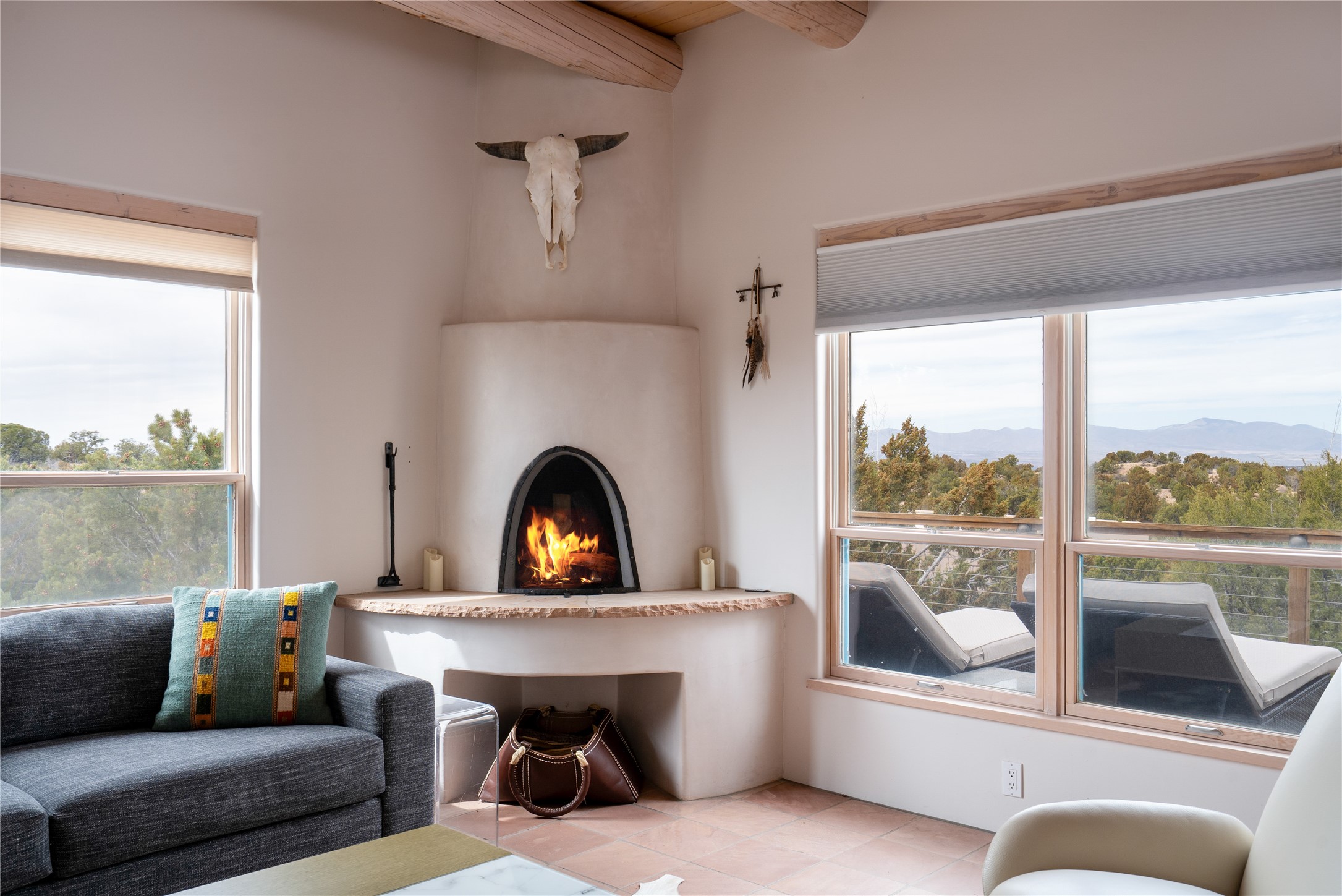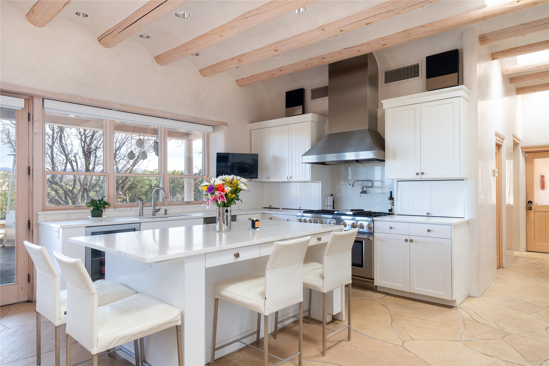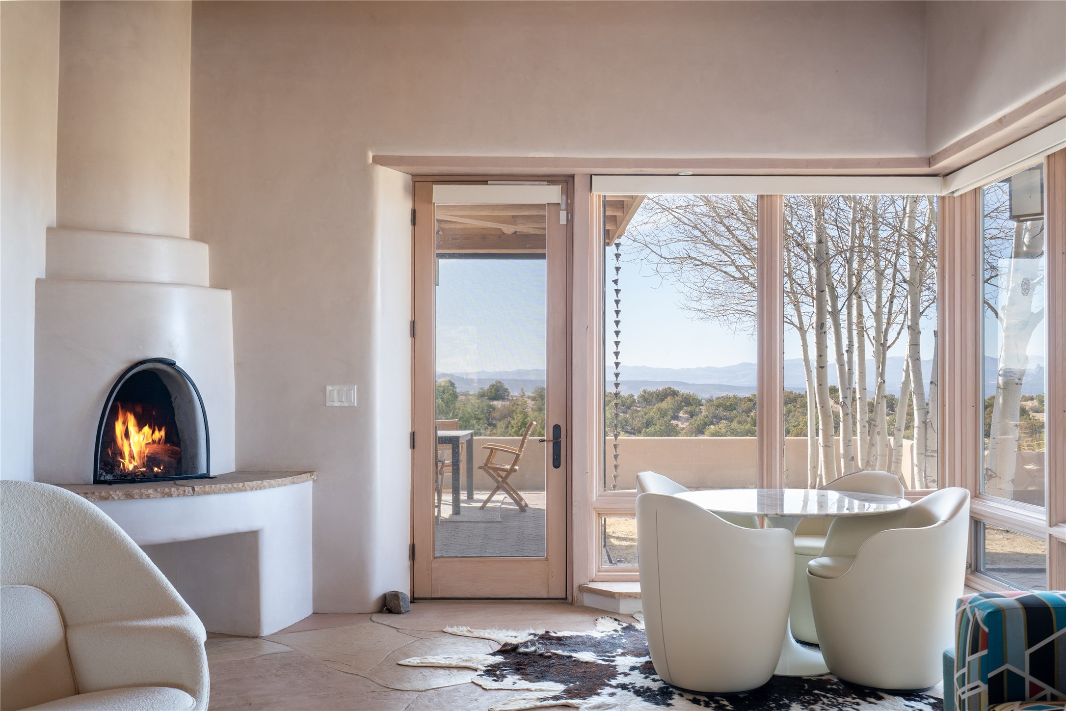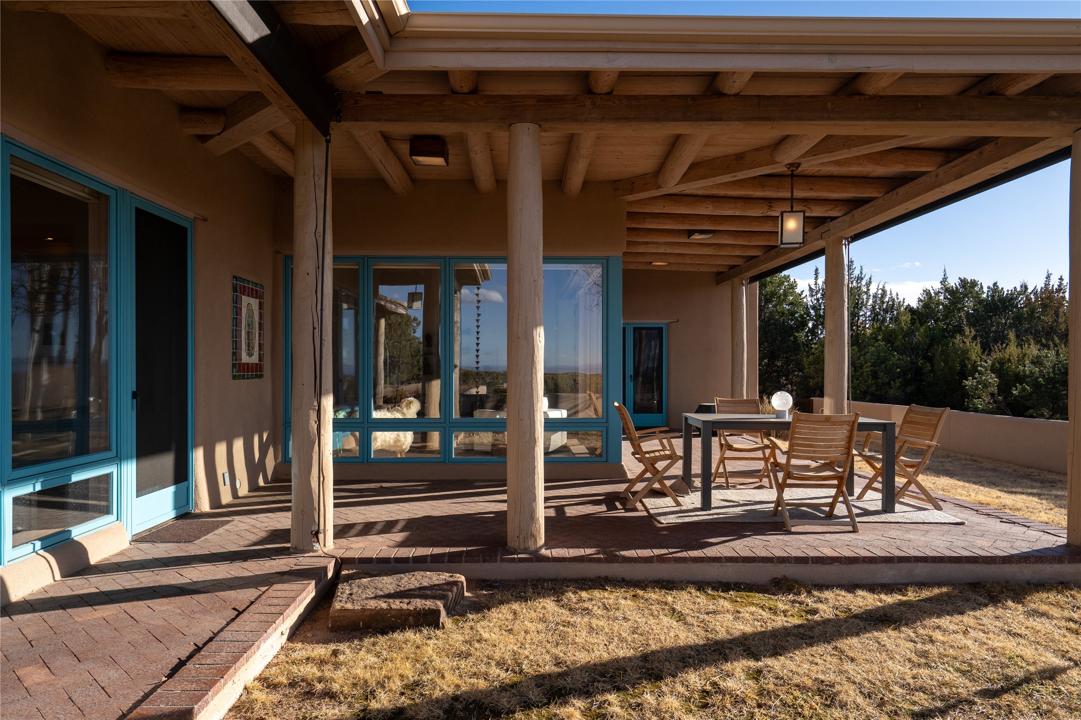 Set on 13.5 acres of pristine land bordering open space, this striking estate offers a seamless blend of modern elegance and natural beauty. Designed for those who appreciate clean lines and open, light-filled spaces, the property includes a main house, a private guest house, versatile studio and multiple outdoor living spaces--all thoughtfully positioned to capture breathtaking views of the Santa Fe landscape and surrounding mountains. The 3,867 sq. ft. main residence is a masterpiece of understated sophistication, featuring an open floor plan enhanced by coved ceilings, smooth plaster walls, and flagstone flooring. Expansive floor-to-ceiling windows invite soft, natural light while framing the ever-changing beauty of the surrounding scenery. The living room, anchored by a commanding fireplace, offers the perfect setting for large-scale artwork and intimate gatherings. Designed for both comfort and functionality, the primary suite includes separate his-and-hers closets and baths. The family room could also double as an office and/or library. The kitchen is a chef's dream, equipped with high-end appliances, a very large island and a spacious walk-in pantry. Tucked away along a charming pathway is a 665 sf, one bed, one bath guest house which provides a peaceful retreat. Meanwhile, the impressive 1,440 sf studio is currently being used as a dedicated artist studio and personal gym. Spacious enough, it could also be a car collector's dream space or RV Storage. Don't miss this rare opportunity to own an exceptional home that balances contemporary design with the tranquility of nature, this estate is an inspiring sanctuary just waiting to be discovered.