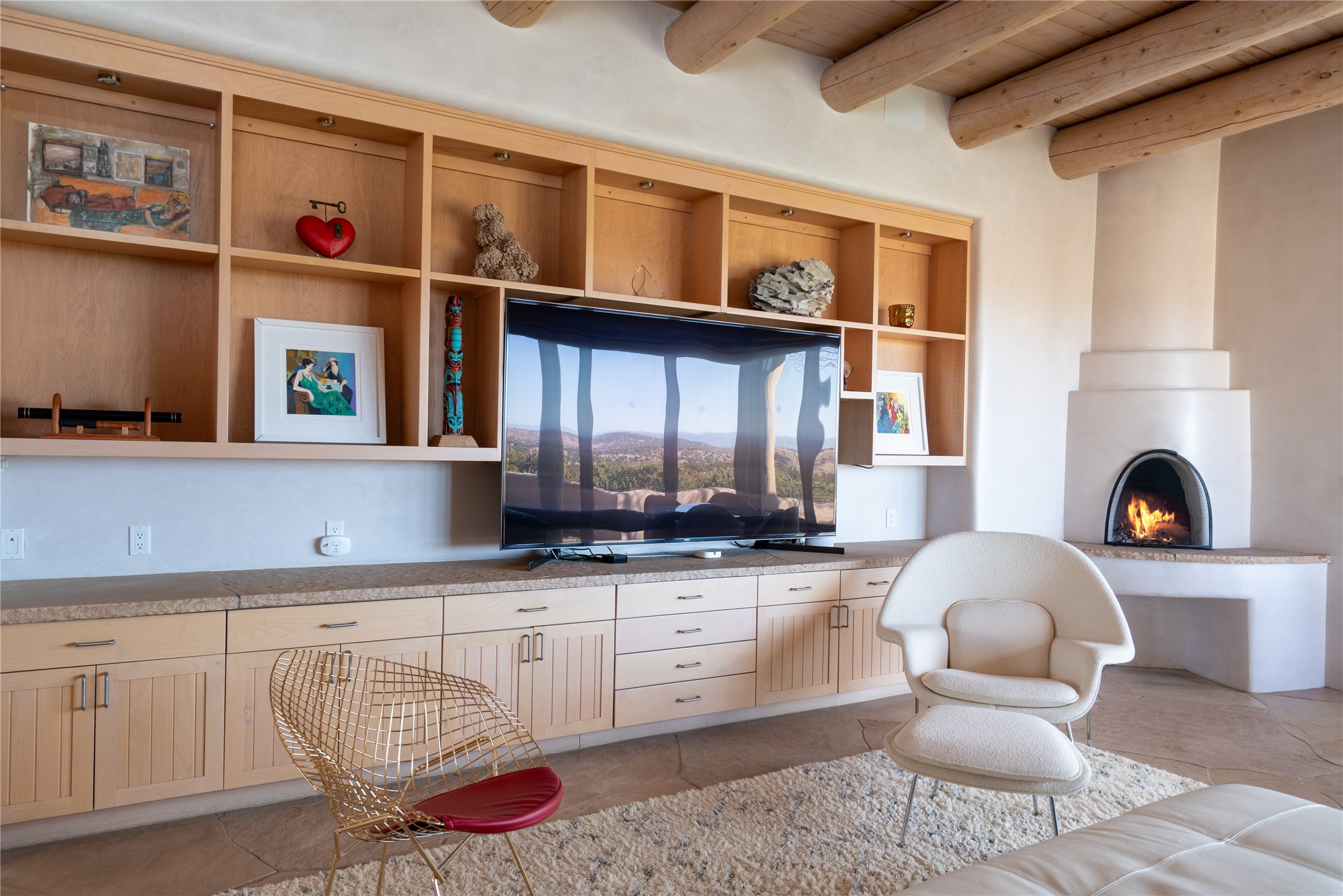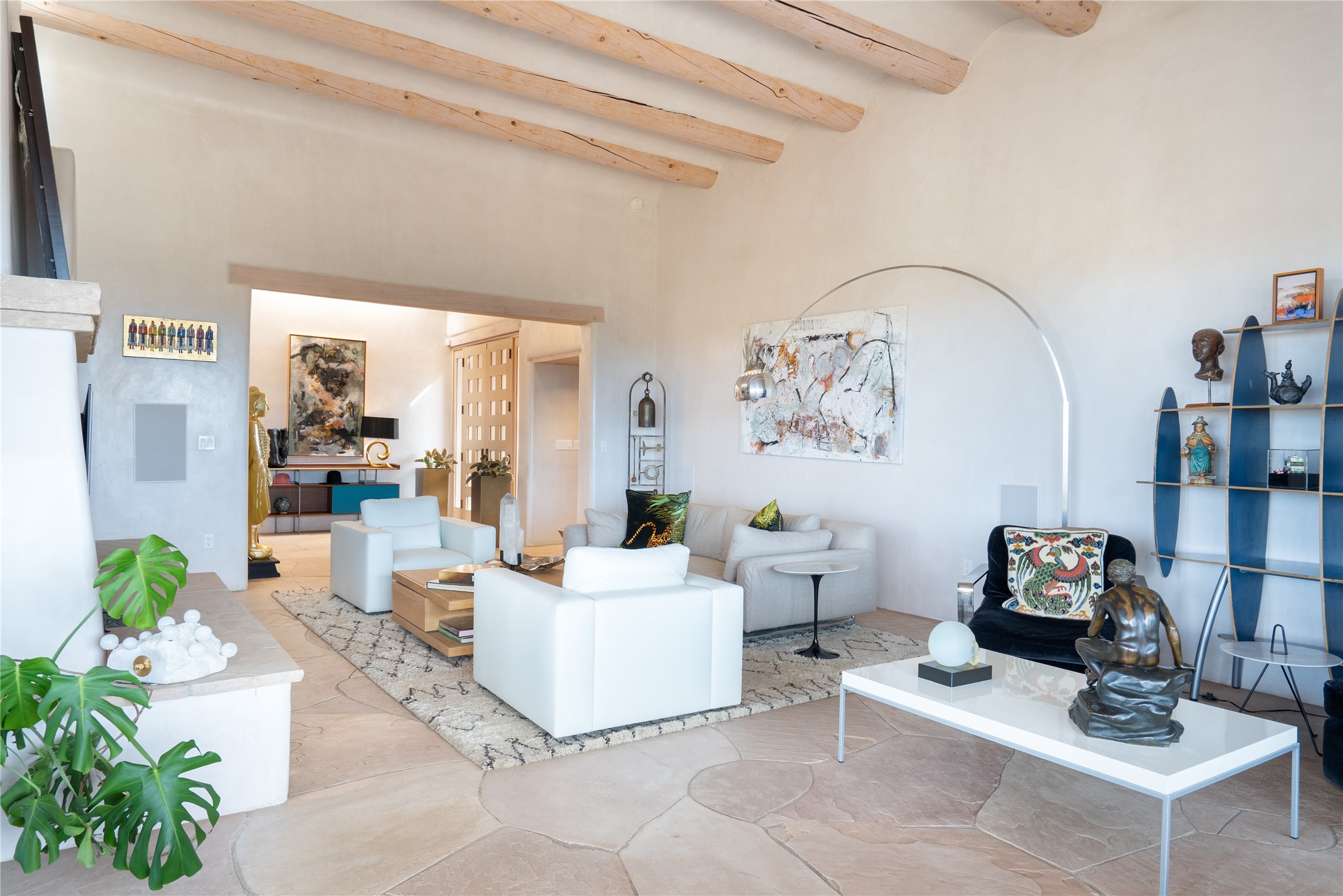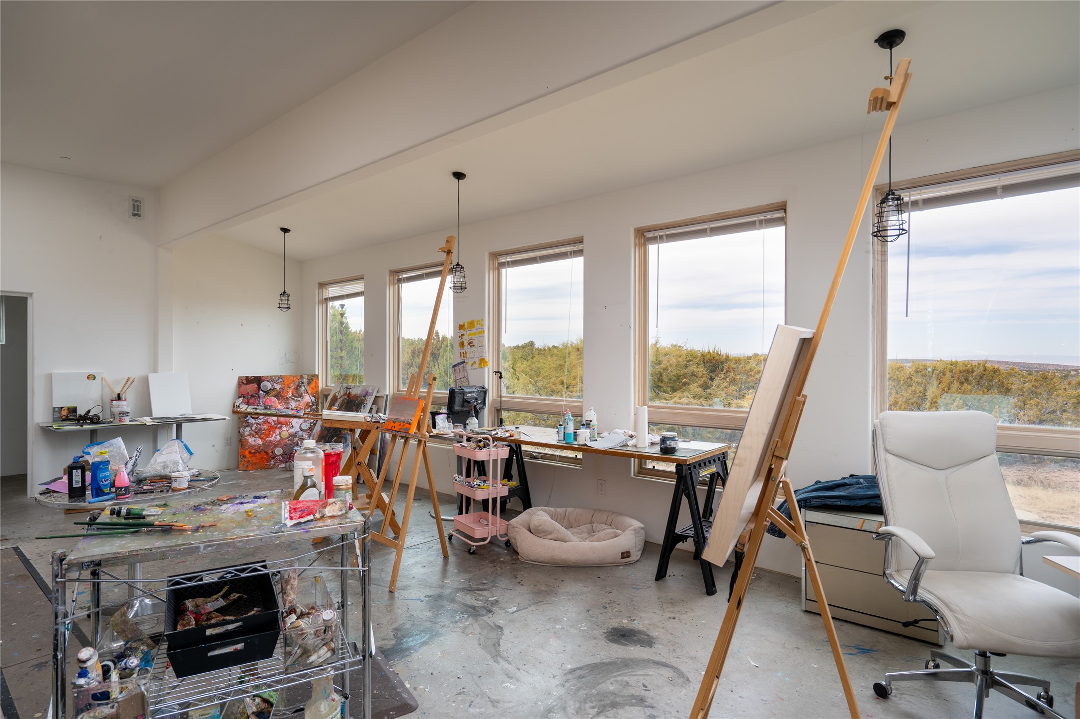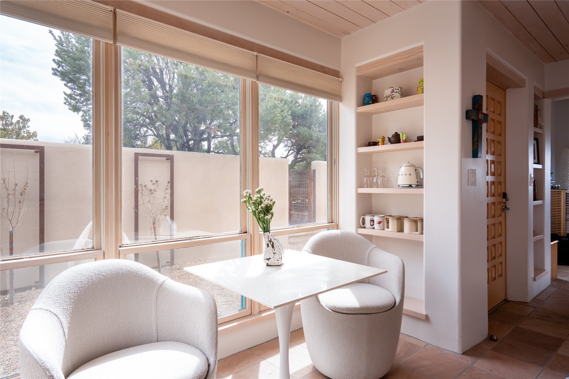 Set on 13.5 acres of pristine land bordering open space, this striking estate offers a seamless blend of modern elegance and natural beauty. Designed for those who appreciate clean lines and open, light-filled spaces, the property includes a main house, a private guest house, versatile studio and multiple outdoor living spaces--all thoughtfully positioned to capture breathtaking views of the Santa Fe landscape and surrounding mountains. The 3,867 sq. ft. main residence is a masterpiece of understated sophistication, featuring an open floor plan enhanced by coved ceilings, smooth plaster walls, and flagstone flooring. Expansive floor-to-ceiling windows invite soft, natural light while framing the ever-changing beauty of the surrounding scenery. The living room, anchored by a commanding fireplace, offers the perfect setting for large-scale artwork and intimate gatherings. Designed for both comfort and functionality, the primary suite includes separate his-and-hers closets and baths. The family room could also double as an office and/or library. The kitchen is a chef's dream, equipped with high-end appliances, a very large island and a spacious walk-in pantry. Tucked away along a charming pathway is a 665 sf, one bed, one bath guest house which provides a peaceful retreat. Meanwhile, the impressive 1,440 sf studio is currently being used as a dedicated artist studio and personal gym. Spacious enough, it could also be a car collector's dream space or RV Storage. Don't miss this rare opportunity to own an exceptional home that balances contemporary design with the tranquility of nature, this estate is an inspiring sanctuary just waiting to be discovered.