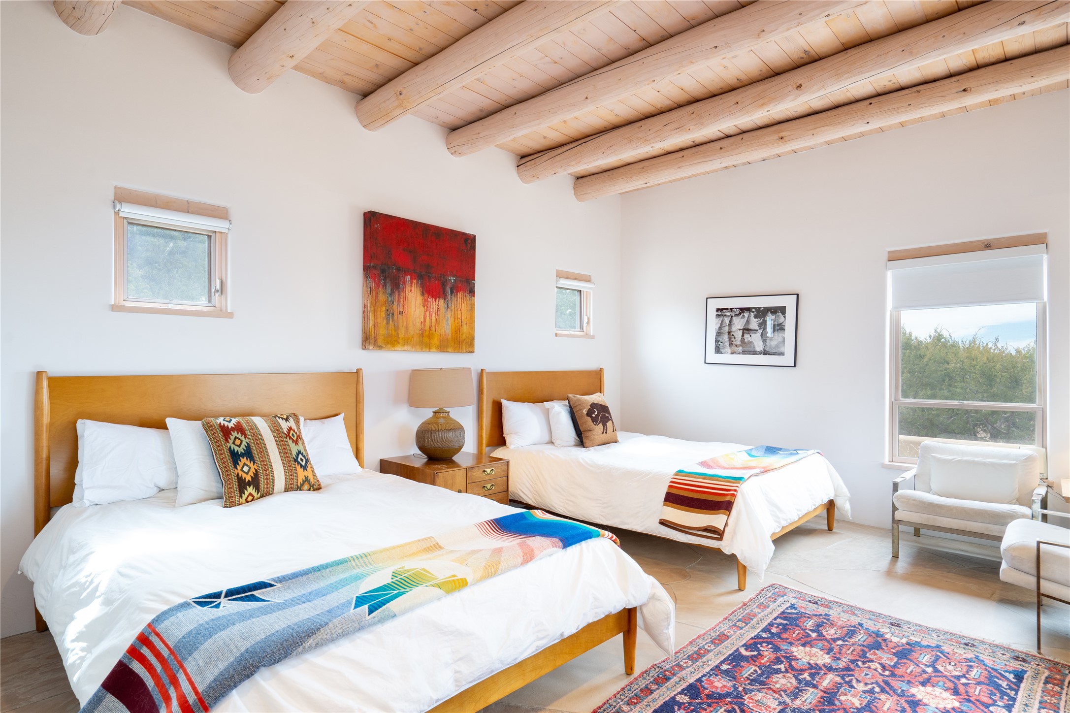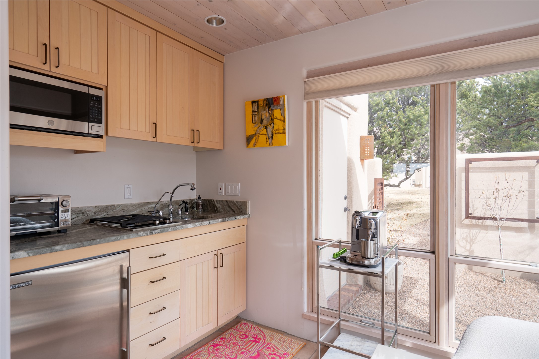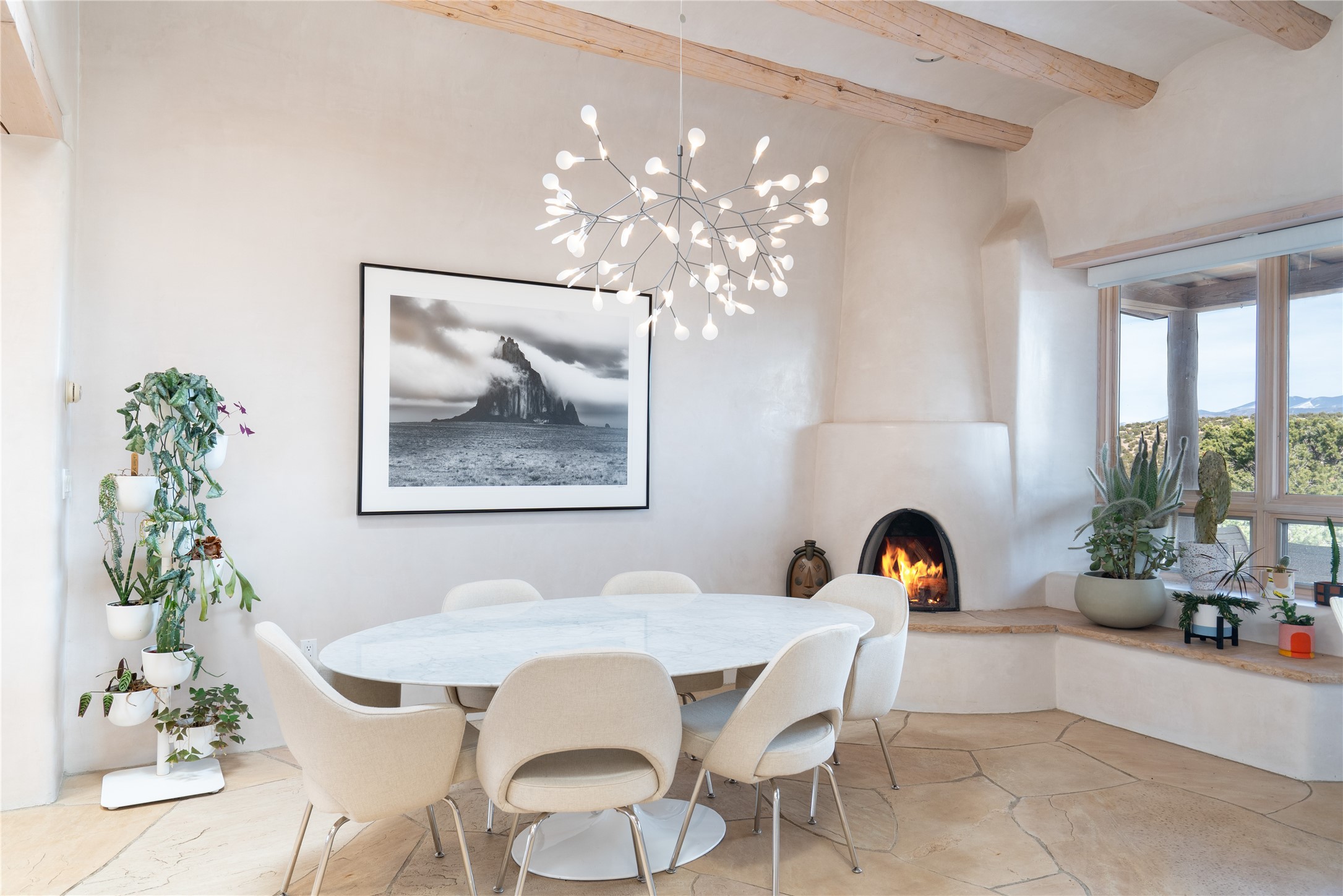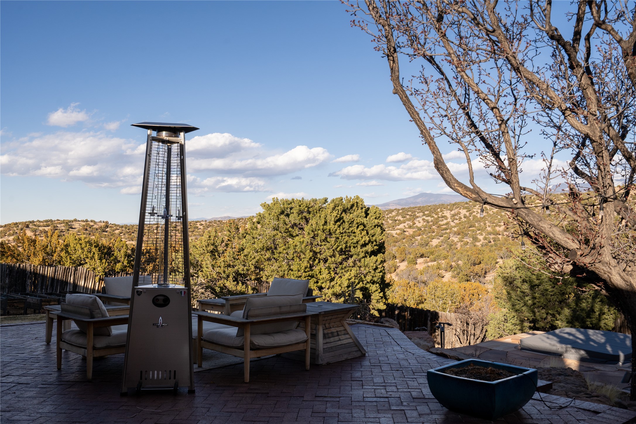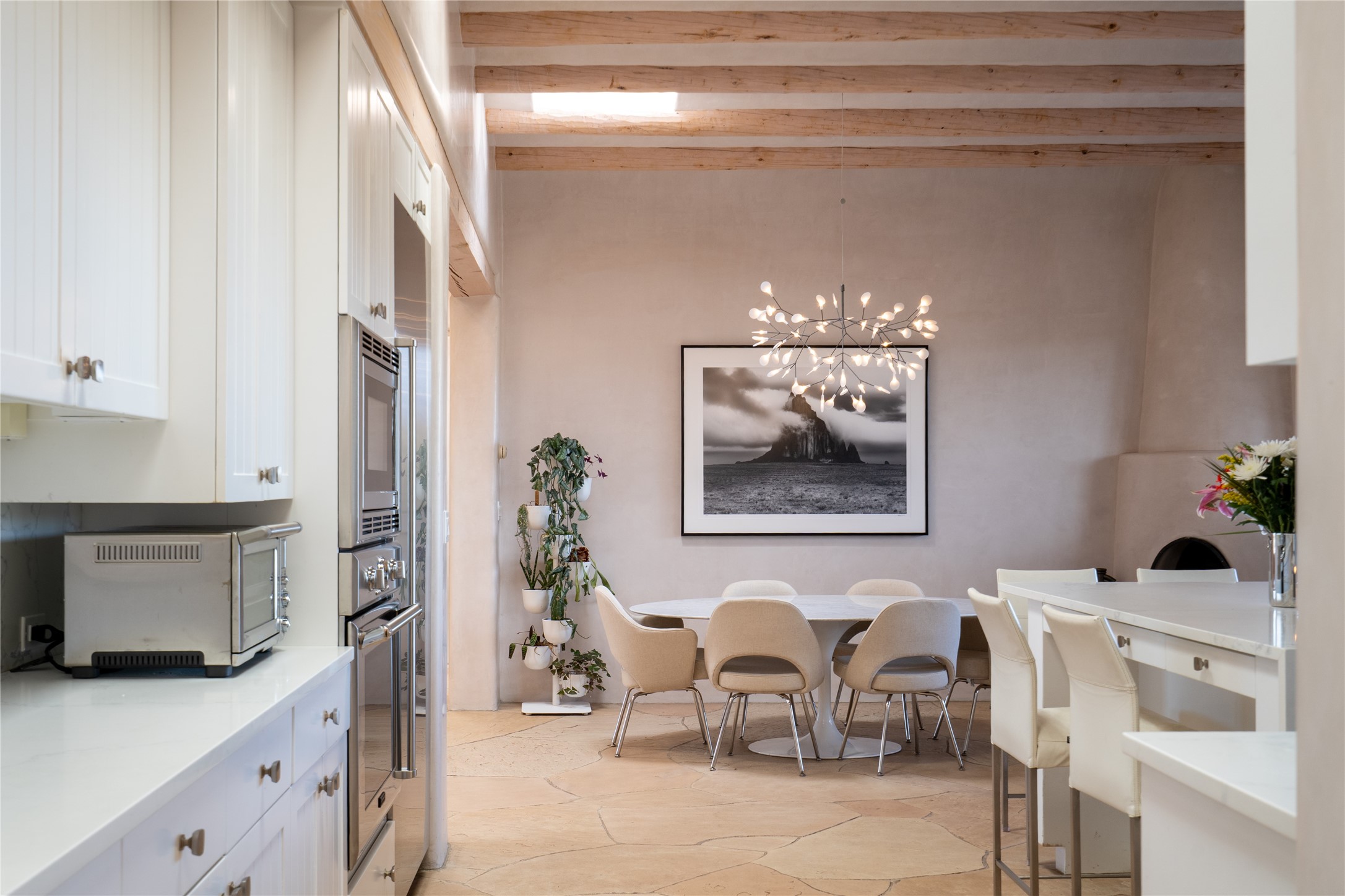 Set on 13.5 acres of pristine land bordering open space, this striking estate offers a seamless blend of modern elegance and natural beauty. Designed for those who appreciate clean lines and open, light-filled spaces, the property includes a main house, a private guest house, versatile studio and multiple outdoor living spaces--all thoughtfully positioned to capture breathtaking views of the Santa Fe landscape and surrounding mountains. The 3,867 sq. ft. main residence is a masterpiece of understated sophistication, featuring an open floor plan enhanced by coved ceilings, smooth plaster walls, and flagstone flooring. Expansive floor-to-ceiling windows invite soft, natural light while framing the ever-changing beauty of the surrounding scenery. The living room, anchored by a commanding fireplace, offers the perfect setting for large-scale artwork and intimate gatherings. Designed for both comfort and functionality, the primary suite includes separate his-and-hers closets and baths. The family room could also double as an office and/or library. The kitchen is a chef's dream, equipped with high-end appliances, a very large island and a spacious walk-in pantry. Tucked away along a charming pathway is a 665 sf, one bed, one bath guest house which provides a peaceful retreat. Meanwhile, the impressive 1,440 sf studio is currently being used as a dedicated artist studio and personal gym. Spacious enough, it could also be a car collector's dream space or RV Storage. Don't miss this rare opportunity to own an exceptional home that balances contemporary design with the tranquility of nature, this estate is an inspiring sanctuary just waiting to be discovered.