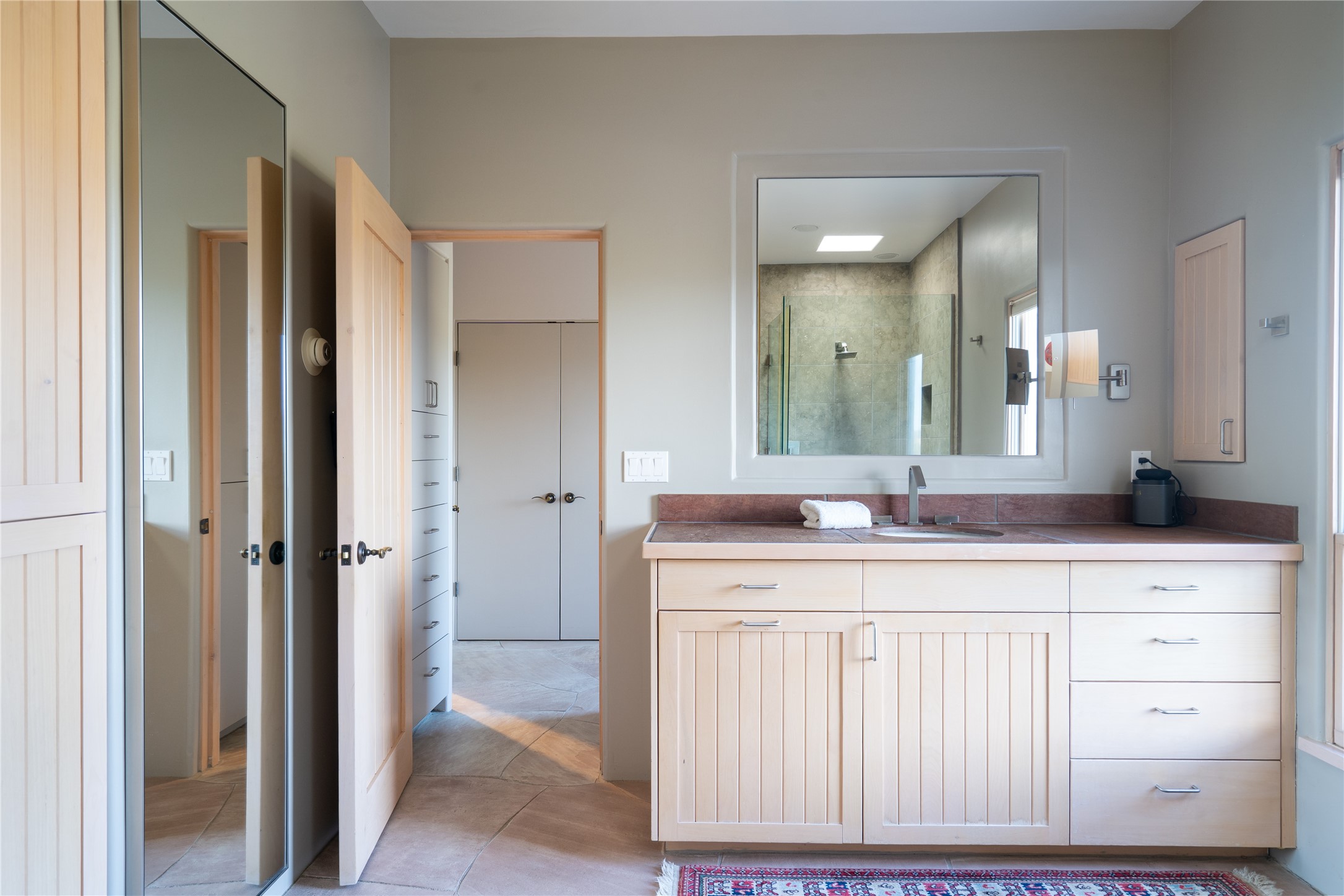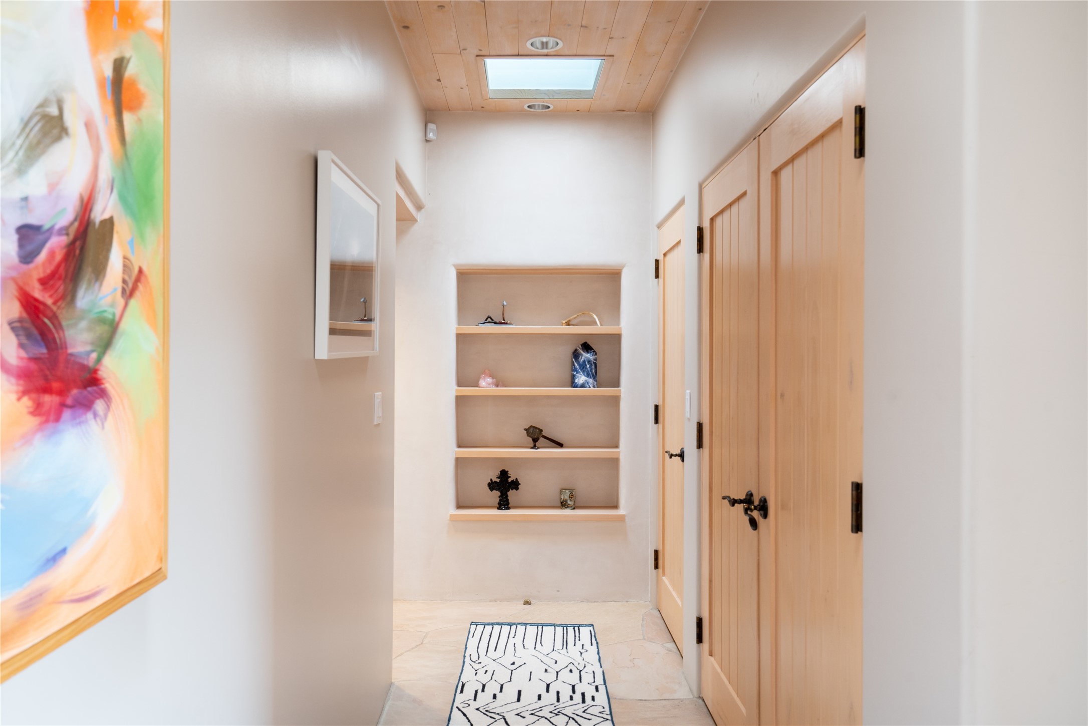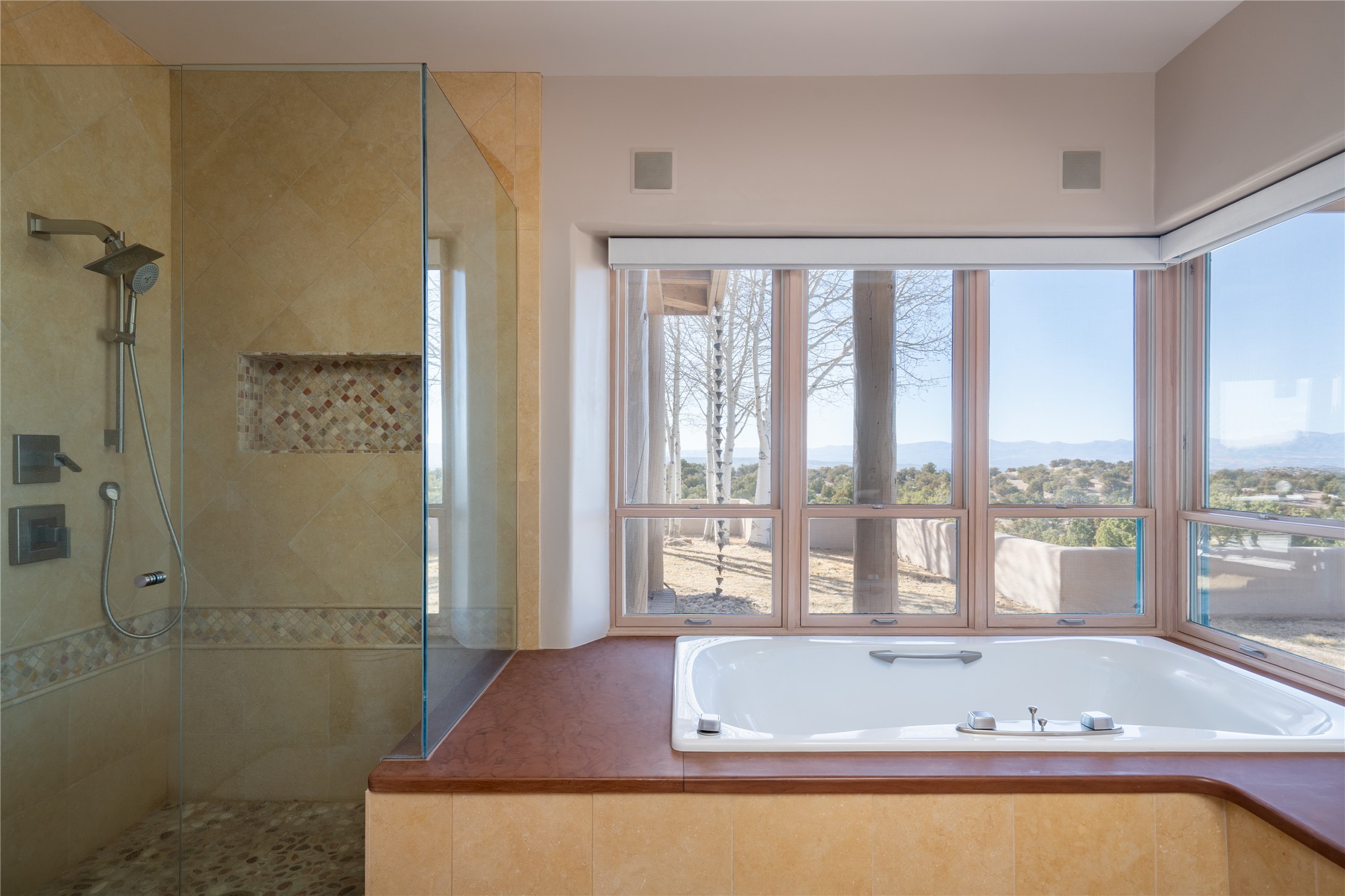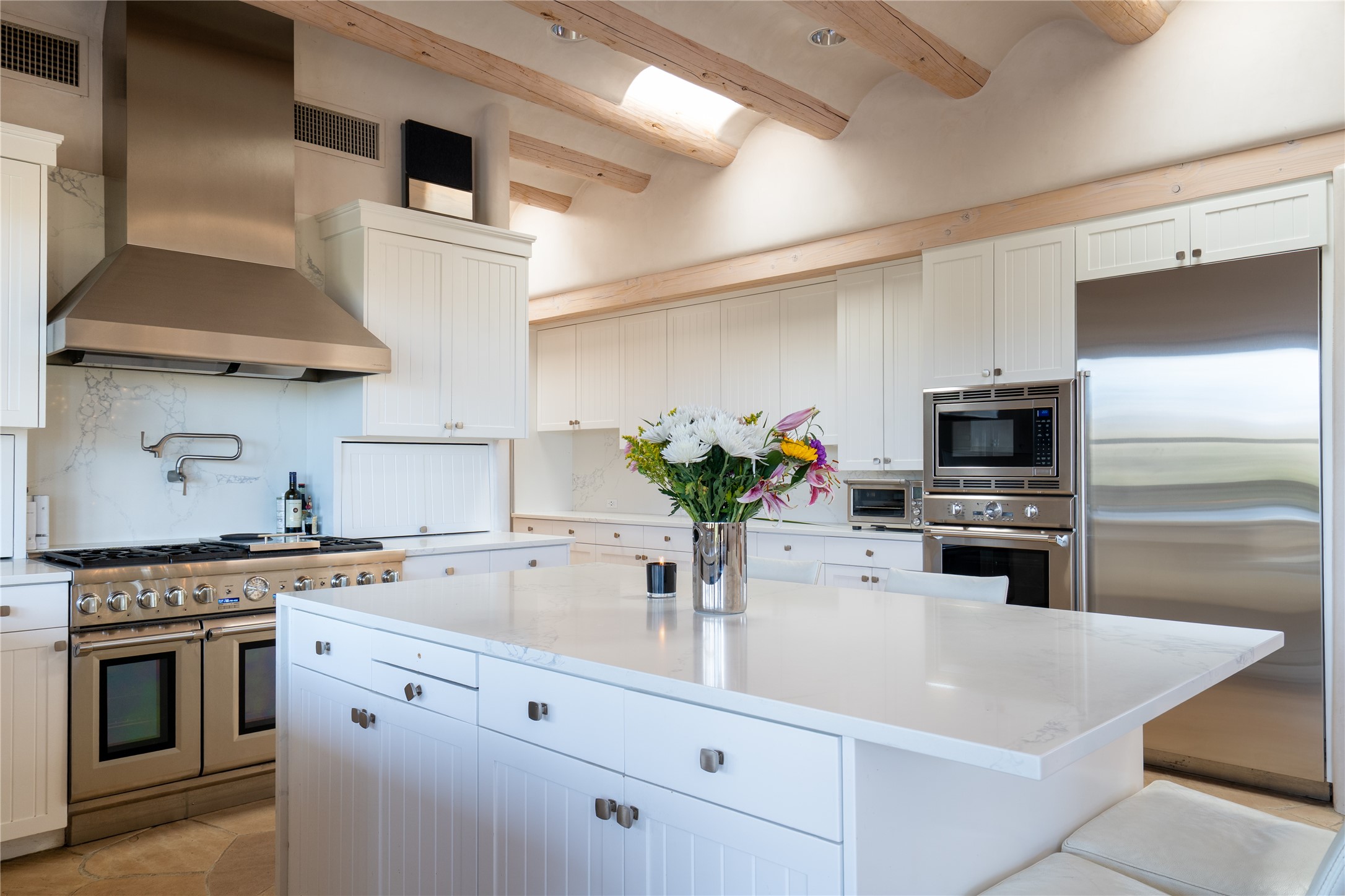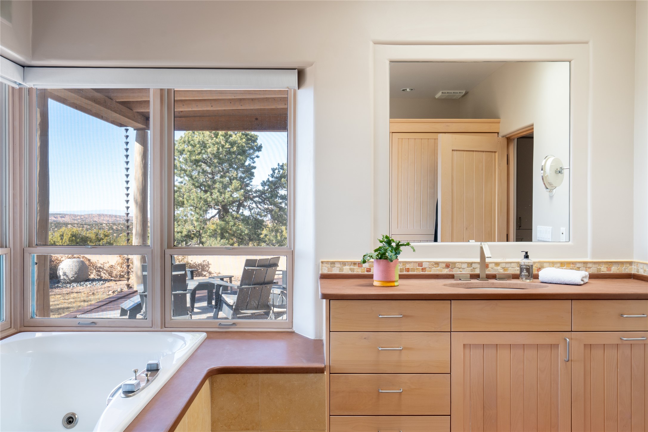 Set on 13.5 acres of pristine land bordering open space, this striking estate offers a seamless blend of modern elegance and natural beauty. Designed for those who appreciate clean lines and open, light-filled spaces, the property includes a main house, a private guest house, versatile studio and multiple outdoor living spaces--all thoughtfully positioned to capture breathtaking views of the Santa Fe landscape and surrounding mountains. The 3,867 sq. ft. main residence is a masterpiece of understated sophistication, featuring an open floor plan enhanced by coved ceilings, smooth plaster walls, and flagstone flooring. Expansive floor-to-ceiling windows invite soft, natural light while framing the ever-changing beauty of the surrounding scenery. The living room, anchored by a commanding fireplace, offers the perfect setting for large-scale artwork and intimate gatherings. Designed for both comfort and functionality, the primary suite includes separate his-and-hers closets and baths. The family room could also double as an office and/or library. The kitchen is a chef's dream, equipped with high-end appliances, a very large island and a spacious walk-in pantry. Tucked away along a charming pathway is a 665 sf, one bed, one bath guest house which provides a peaceful retreat. Meanwhile, the impressive 1,440 sf studio is currently being used as a dedicated artist studio and personal gym. Spacious enough, it could also be a car collector's dream space or RV Storage. Don't miss this rare opportunity to own an exceptional home that balances contemporary design with the tranquility of nature, this estate is an inspiring sanctuary just waiting to be discovered.