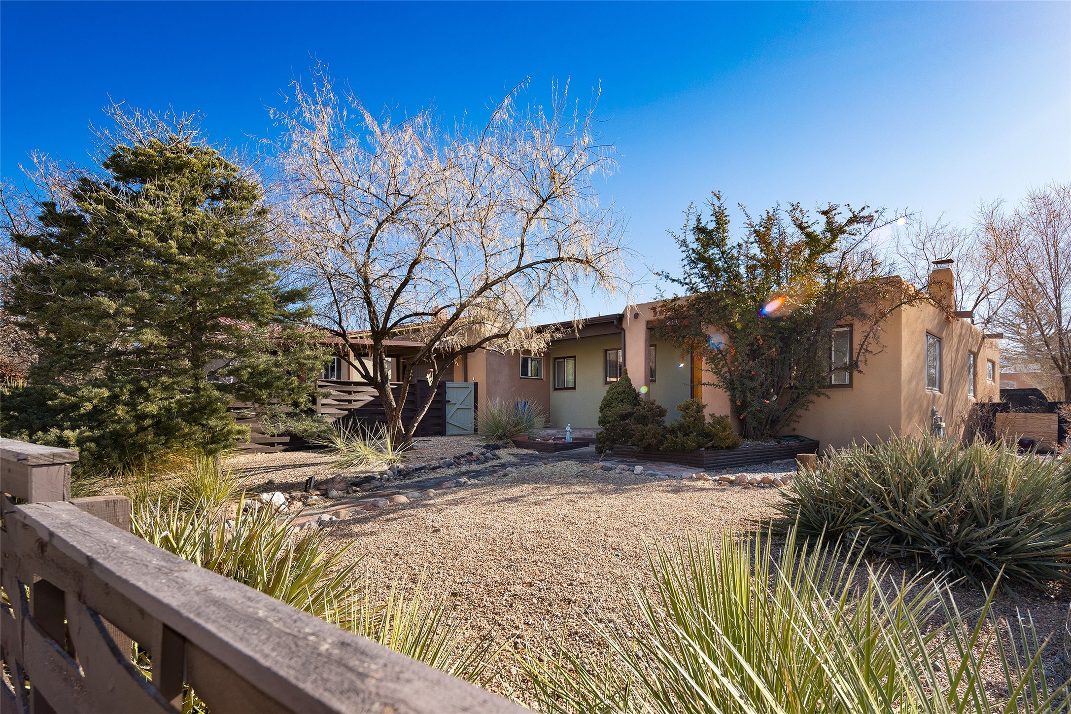 Located on one of the most iconic streets in Casa Solana, within walking distance to the Plaza, shopping and restaurants, this exceptional, updated Stamm-built home, excites and captivates with timeliness Santa Fe architecture, perfectly blended with a modern flare and impresses with updated, expansive front and backyard outdoor living areas. Ideal as a primary residence or the ultimate secondary home retreat, this one of a kind, in-town residence, incorporates the unique blend of contemporary design features and updates, with the inherent warmth of a quality Santa Fe home. This special 3 bedroom, 2 bath home, with a one car garage, plus a carport and an attached heated storage room, is one of the finest homes in Casa Solana. Ideal for entertaining, the open-concept floor plan offers a spacious living room with courtyard views and a cozy kiva fireplace and dining room, located directly off the kitchen, with access to the vast outdoor entertainment areas through sliding glass doors. The updated, well-appointed modern kitchen delights with stainless Samsung appliances and a pantry, accessed from the adjacent laundry room with ample storage. The owner's suite enjoys tranquil views of the beautifully landscaped backyard and an updated ensuite bath. The two guest bedrooms share an updated full bath with spa-like marble-top vanity. The extraordinary outdoor living areas are truly a rarity, starting with the impressive, landscaped, fully enclosed front entrance courtyard and the massive backyard, which is also fully enclosed and ideal for endless outdoor activities. Exceptional features include exquisite hardwood and tile flooring throughout the main living areas, rich wood plank ceilings with vigas in the living room, soft natural light throughout, central heating air conditioning and a one-car garage with an attached workshop space or extra storage. This home is a true rare offering and not to be missed!