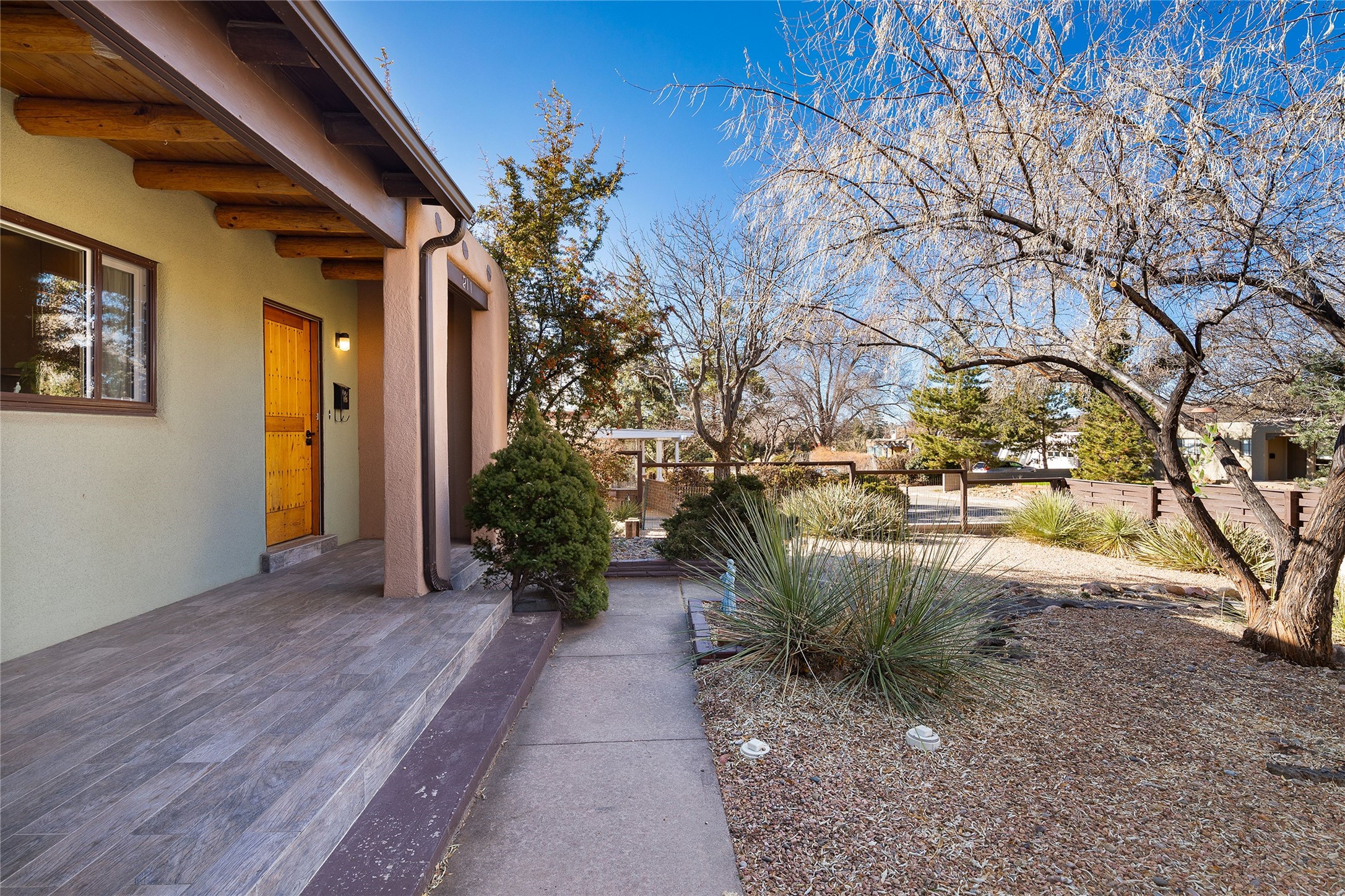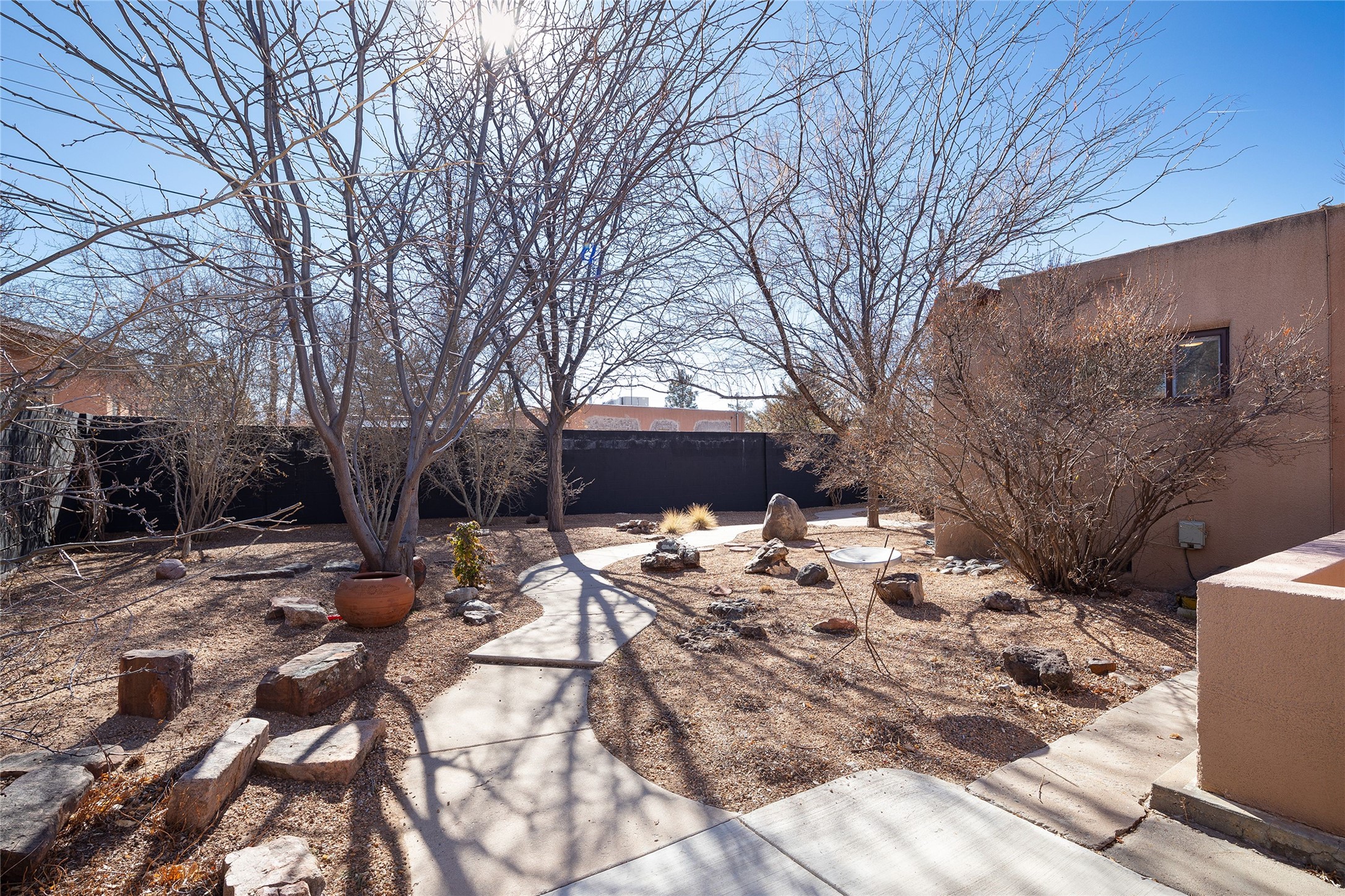 Located on one of the most iconic streets in Casa Solana, within walking distance to the Plaza, shopping and restaurants, this exceptional, updated Stamm-built home, excites and captivates with timeliness Santa Fe architecture, perfectly blended with a modern flare and impresses with updated, expansive front and backyard outdoor living areas. Ideal as a primary residence or the ultimate secondary home retreat, this one of a kind, in-town residence, incorporates the unique blend of contemporary design features and updates, with the inherent warmth of a quality Santa Fe home. This special 3 bedroom, 2 bath home, with a one car garage, plus a carport and an attached heated storage room, is one of the finest homes in Casa Solana. Ideal for entertaining, the open-concept floor plan offers a spacious living room with courtyard views and a cozy kiva fireplace and dining room, located directly off the kitchen, with access to the vast outdoor entertainment areas through sliding glass doors. The updated, well-appointed modern kitchen delights with stainless Samsung appliances and a pantry, accessed from the adjacent laundry room with ample storage. The owner's suite enjoys tranquil views of the beautifully landscaped backyard and an updated ensuite bath. The two guest bedrooms share an updated full bath with spa-like marble-top vanity. The extraordinary outdoor living areas are truly a rarity, starting with the impressive, landscaped, fully enclosed front entrance courtyard and the massive backyard, which is also fully enclosed and ideal for endless outdoor activities. Exceptional features include exquisite hardwood and tile flooring throughout the main living areas, rich wood plank ceilings with vigas in the living room, soft natural light throughout, central heating air conditioning and a one-car garage with an attached workshop space or extra storage. This home is a true rare offering and not to be missed!