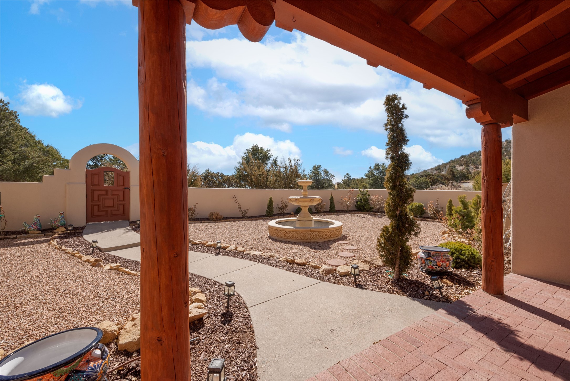 Relaxed southwest elegance in a parklike setting best describes this Dos Griegos home. The hacienda-style floor plan with spacious light-filled living areas is ideal for entertaining or quiet repose. Enclosed courtyards both front and rear offer unrivaled exterior living spaces to enjoy mountain views, starry nights and dramatic New Mexico skies from the private 3+ acre property. Traditional kiva-style fireplaces adorn the living room and primary suite. A spacious and light-filled bonus room with wet-bar and min-frig is ideal for a den, office, studio or media room. The kitchen is a dream featuring expansive granite counters, abundant solid wood cabinetry and top-quality appliances including a Bertazzoni gas range from Italia. The home has been extensively updated both inside and out, from new stucco, windows, landscaping, entry and patio doors to gorgeous bathroom restyling, hardware and fixture upgrades, appliances, and on and on. A complete summary of improvements is available. The home also includes a photovoltaic solar power system providing most if not all of the home's electrical needs. Dos Griegos is located only about 15 minutes from the vibrant and historic City of Santa Fe. Nearby shopping, dining and recreation options are within minutes of the property. This is a special home on a wonderful parcel in a coveted location, the triple crown!