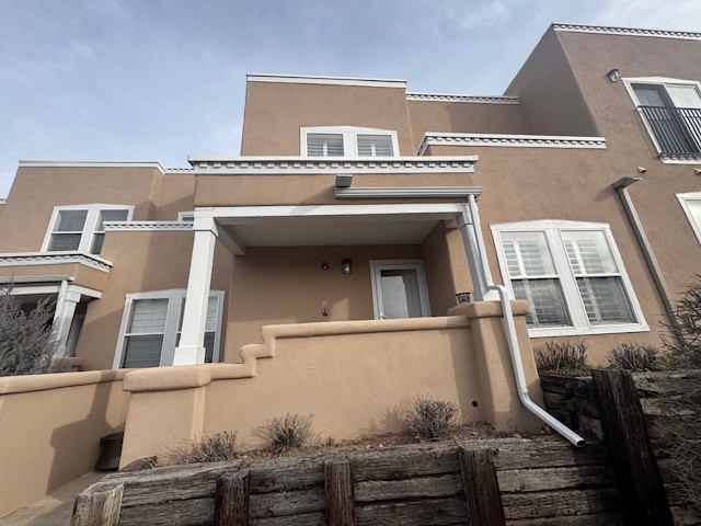 This 2 Bed/2Bath condo is walking distance to the Plaza with full access to restaurants, events, galleries and trails. The home also includes high ceilings with tons of natural light, an open concept living, dining, & kitchen area, with custom cabinetry, high-end appliances, and granite countertops. Walk out patio for entertaining, enjoying the spacious patio with privacy hill behind. There is central air conditioning, fireplace, shuttered windows, bamboo floors. The upstairs, conveniently separated from secondary bedroom has fantastic views and includes an outside balcony with unobstructed views of Zozobra at Ft. Marcy, and stunning Santa Fe skies. There is one reserved carport space plus an extra parking place, all behind a gated entry.