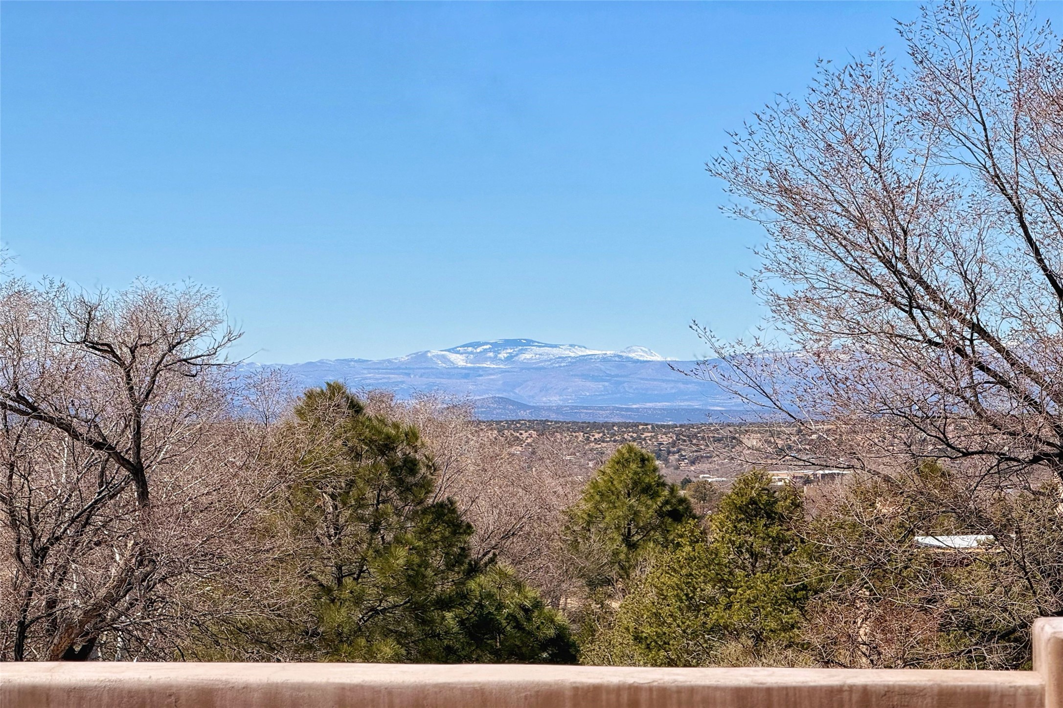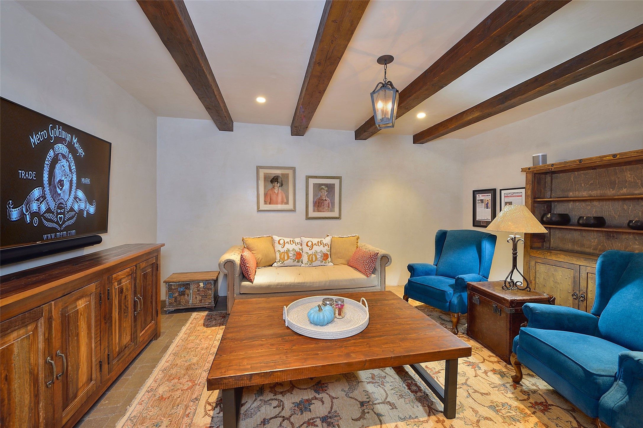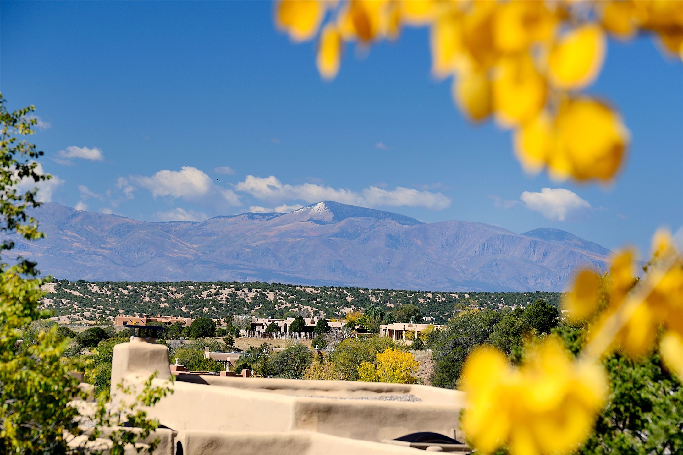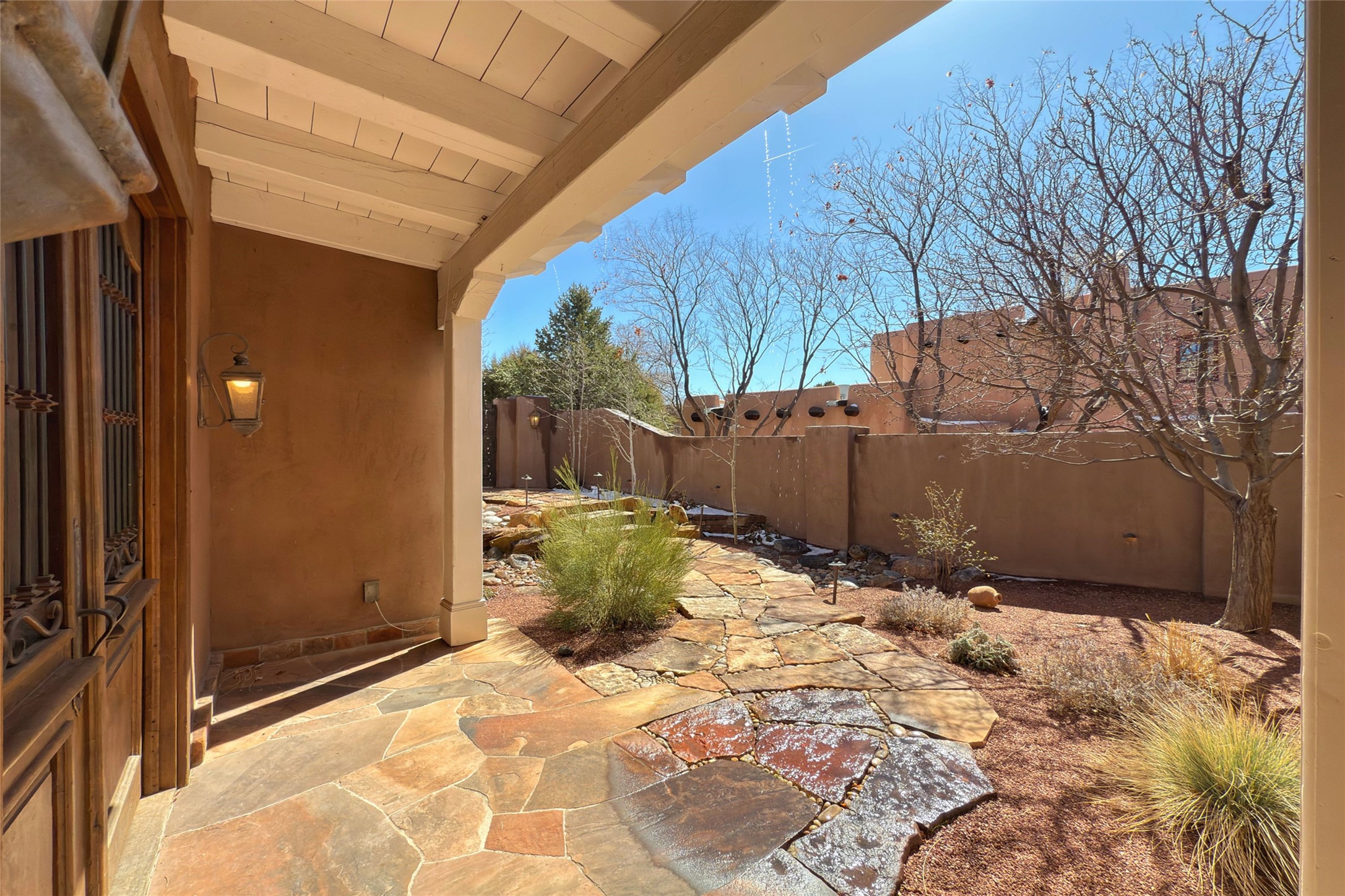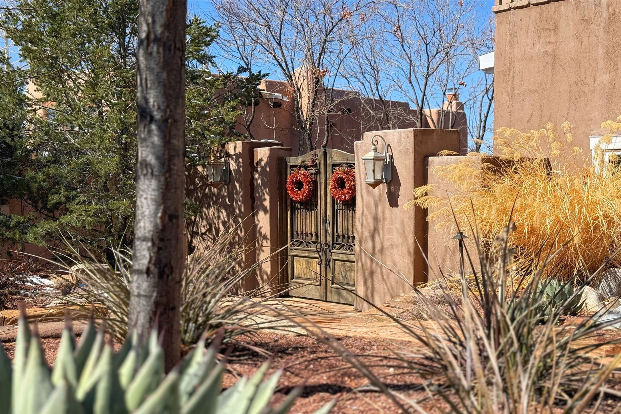 This is a rare opportunity to own a custom-built home in the heart of Santa Fe's cherished Historic Eastside. This elegant territorial-style residence offers sweeping views of the Jemez Mountains' breathtaking sunsets and is perfectly positioned just a short stroll from the famed Canyon Road. Built in 2008, this home features high-insulation pumice-crete construction that beautifully replicates the look and feel of traditional stacked adobe. Every element of the home reflects an unwavering commitment to quality and meticulous attention to detail. The home's three bedrooms, each with its own ensuite bath, provide a harmonious balance of privacy and comfort. In addition, there is an office with a private entrance. The main living areas are conveniently located on one floor, while the lower level is dedicated to guest quarters and a media room. Distressed floors offer a rich, inviting foundation, while handcrafted reclaimed wood doors and intricately carved posts, beams, and corbels evoke the timeless beauty of the territorial style. At the heart of the home lies a gourmet kitchen outfitted with Wolf and Sub-Zero appliances, a butler's pantry, and a wet bar. A private courtyard provides a serene entry, while the expansive wrap-around rear portal framed by a wall of windows, offers an unparalleled vantage point for taking in the majestic mountain vistas with a landscaped garden and fire pit with seating.