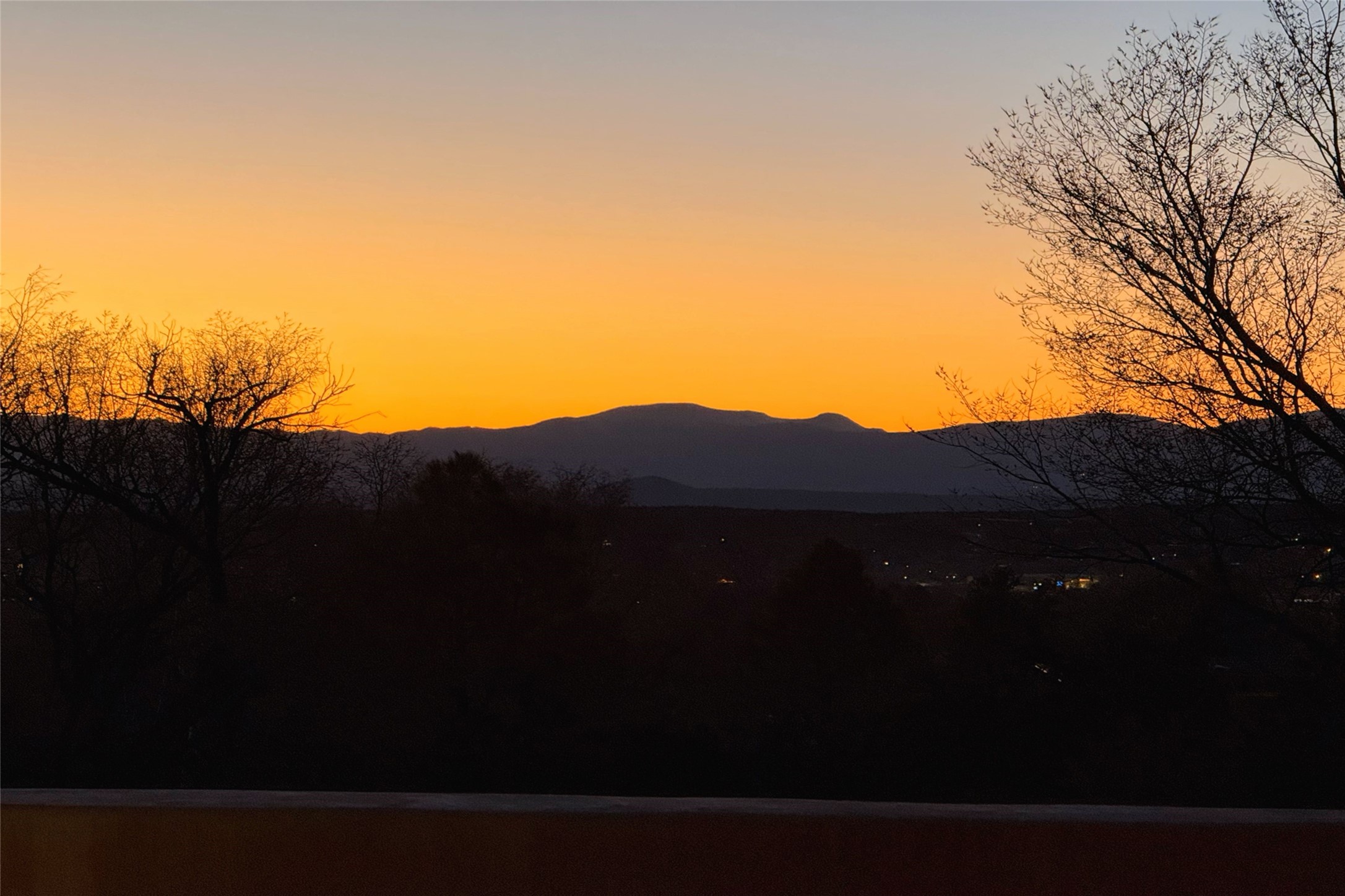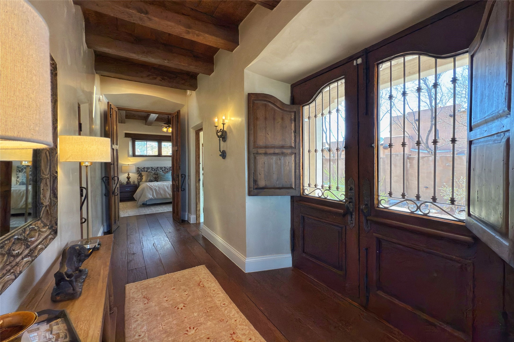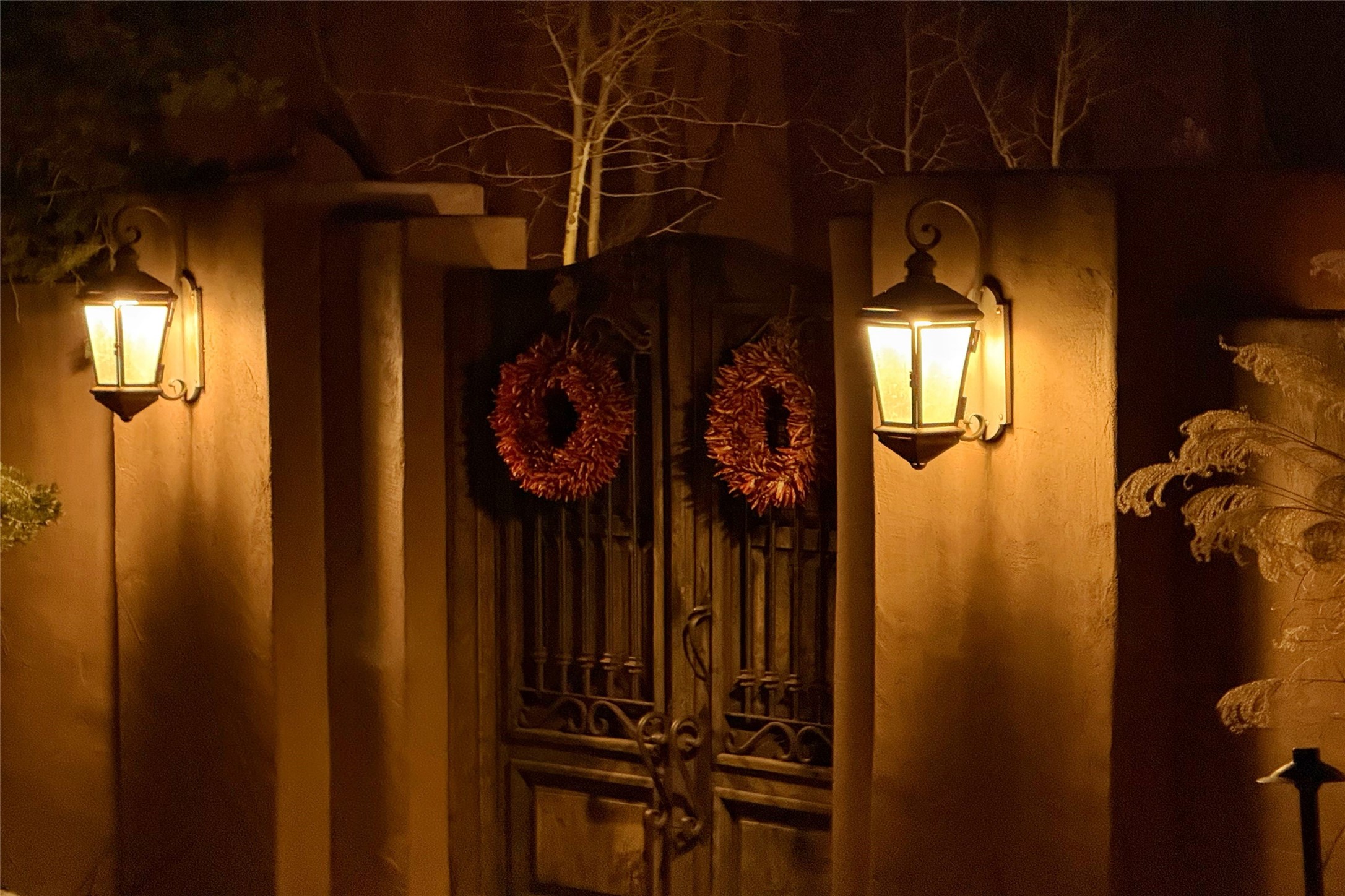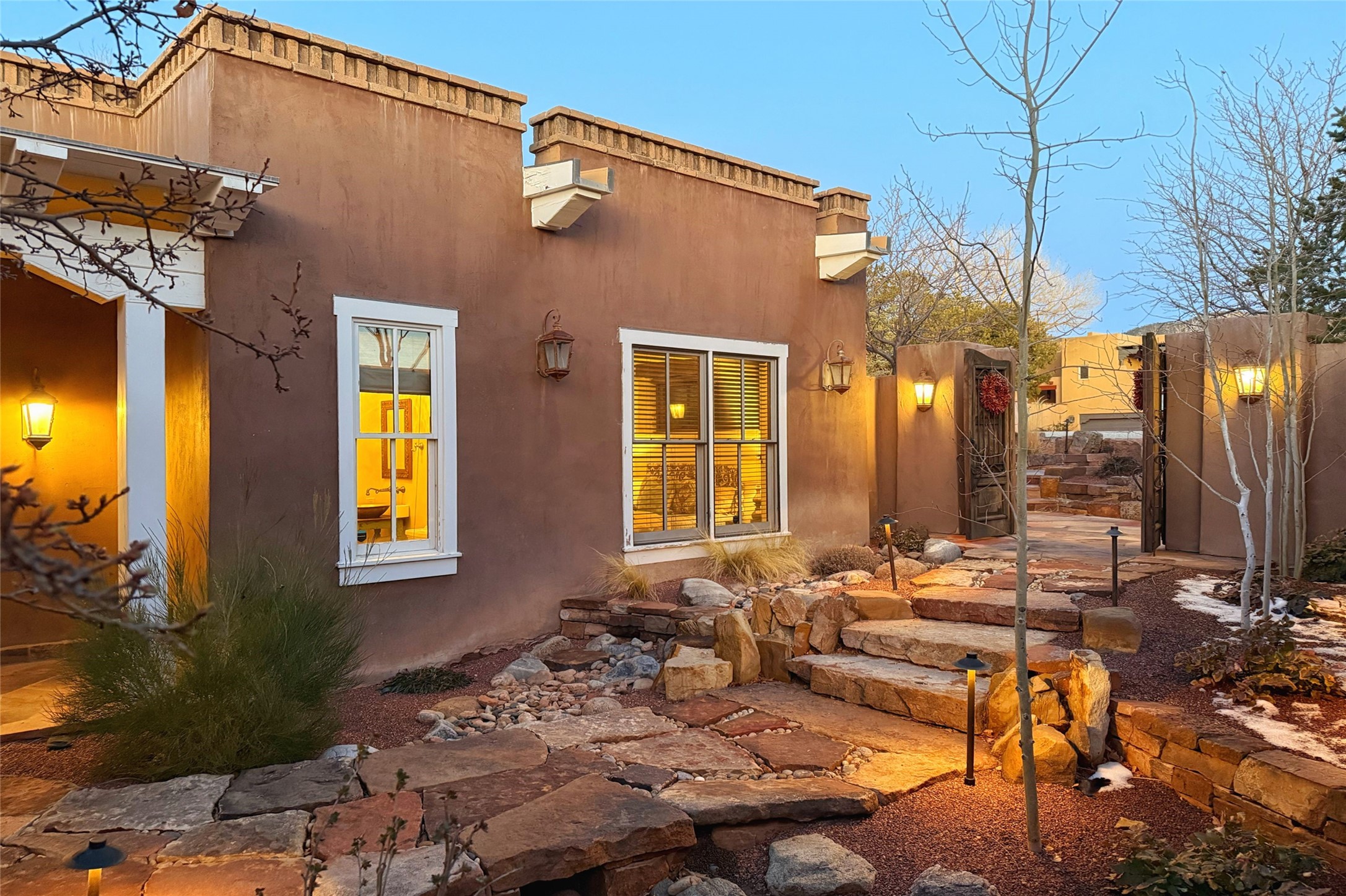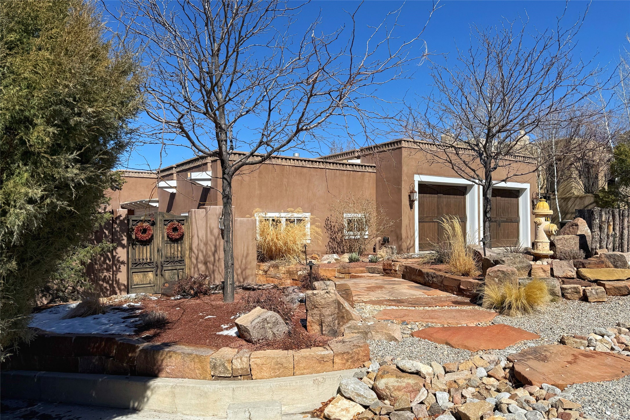 This is a rare opportunity to own a custom-built home in the heart of Santa Fe's cherished Historic Eastside. This elegant territorial-style residence offers sweeping views of the Jemez Mountains' breathtaking sunsets and is perfectly positioned just a short stroll from the famed Canyon Road. Built in 2008, this home features high-insulation pumice-crete construction that beautifully replicates the look and feel of traditional stacked adobe. Every element of the home reflects an unwavering commitment to quality and meticulous attention to detail. The home's three bedrooms, each with its own ensuite bath, provide a harmonious balance of privacy and comfort. In addition, there is an office with a private entrance. The main living areas are conveniently located on one floor, while the lower level is dedicated to guest quarters and a media room. Distressed floors offer a rich, inviting foundation, while handcrafted reclaimed wood doors and intricately carved posts, beams, and corbels evoke the timeless beauty of the territorial style. At the heart of the home lies a gourmet kitchen outfitted with Wolf and Sub-Zero appliances, a butler's pantry, and a wet bar. A private courtyard provides a serene entry, while the expansive wrap-around rear portal framed by a wall of windows, offers an unparalleled vantage point for taking in the majestic mountain vistas with a landscaped garden and fire pit with seating.