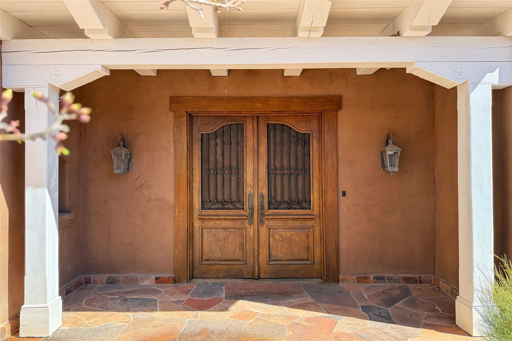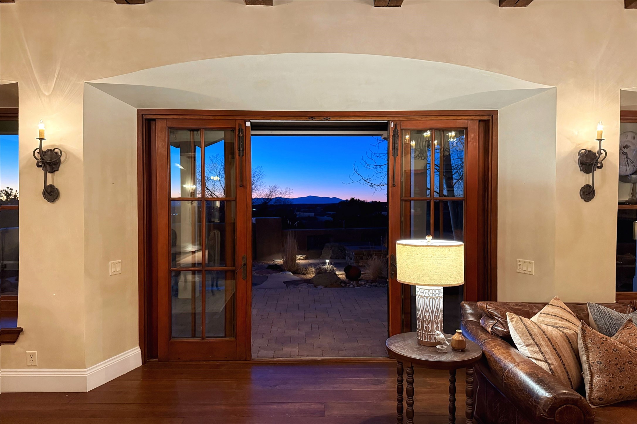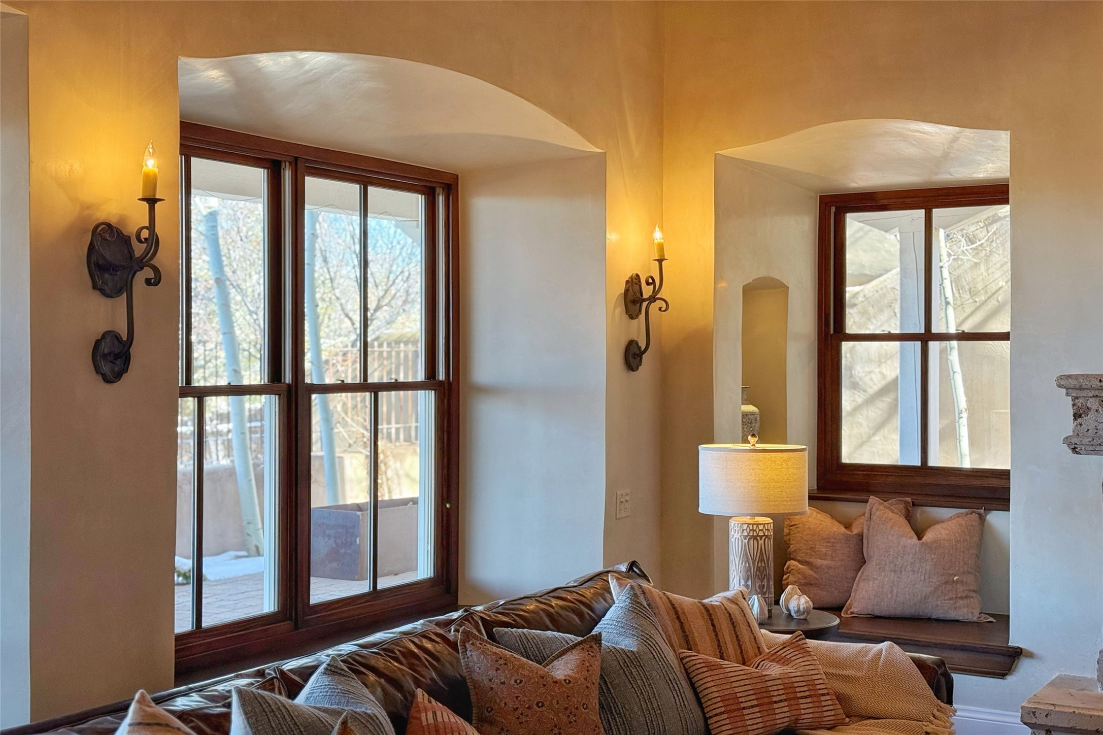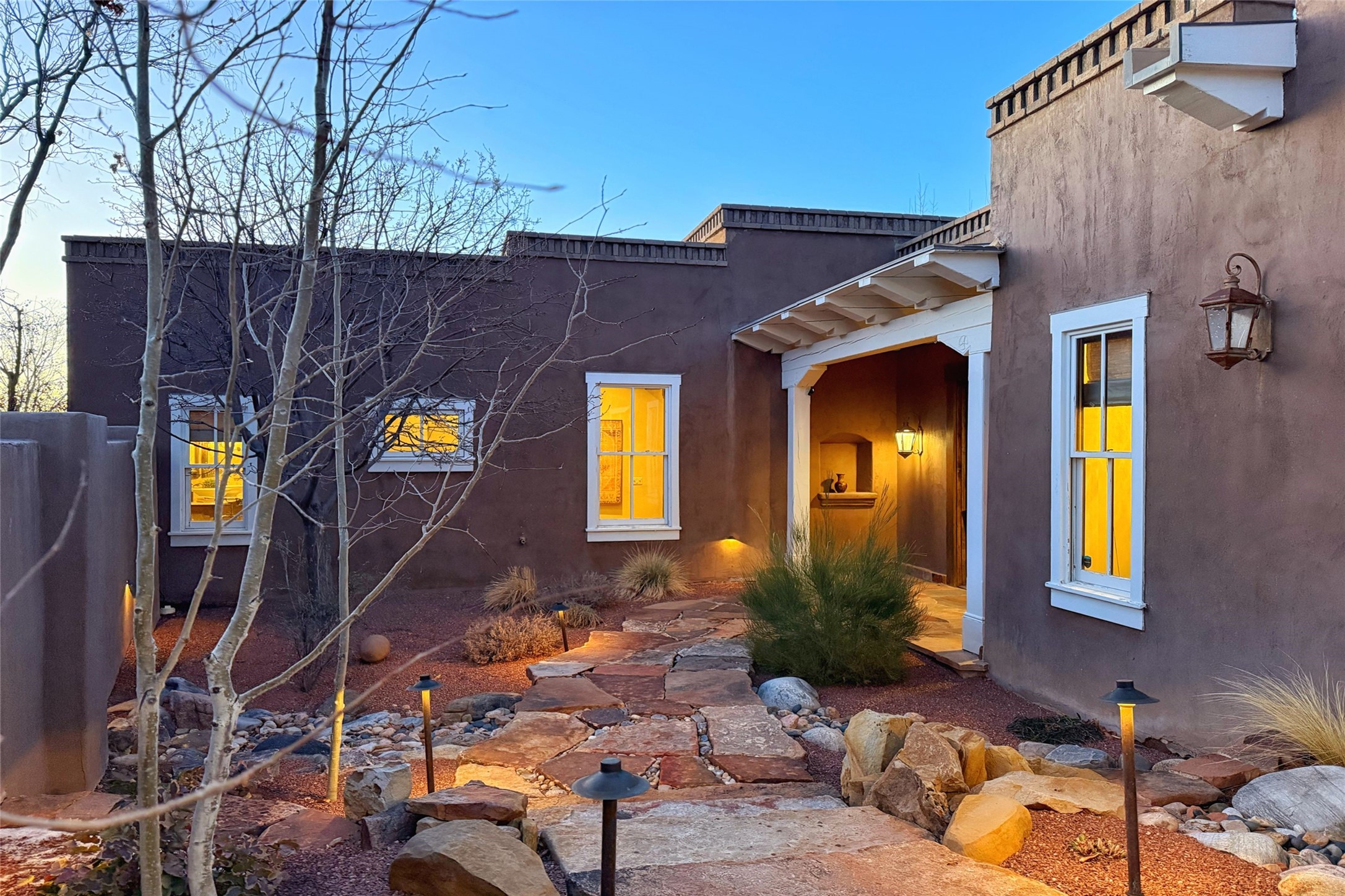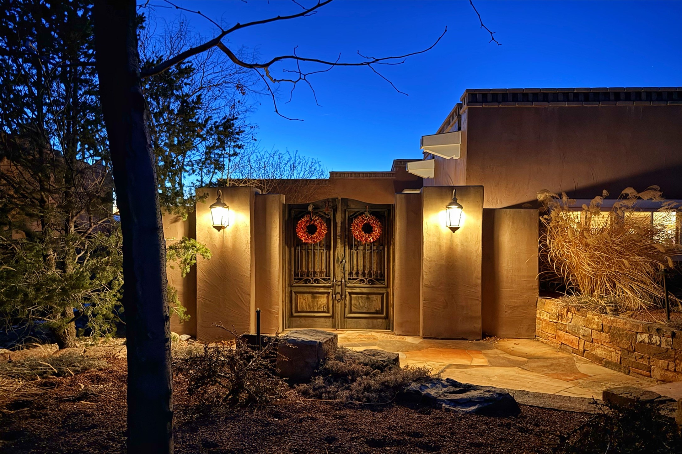 This is a rare opportunity to own a custom-built home in the heart of Santa Fe's cherished Historic Eastside. This elegant territorial-style residence offers sweeping views of the Jemez Mountains' breathtaking sunsets and is perfectly positioned just a short stroll from the famed Canyon Road. Built in 2008, this home features high-insulation pumice-crete construction that beautifully replicates the look and feel of traditional stacked adobe. Every element of the home reflects an unwavering commitment to quality and meticulous attention to detail. The home's three bedrooms, each with its own ensuite bath, provide a harmonious balance of privacy and comfort. In addition, there is an office with a private entrance. The main living areas are conveniently located on one floor, while the lower level is dedicated to guest quarters and a media room. Distressed floors offer a rich, inviting foundation, while handcrafted reclaimed wood doors and intricately carved posts, beams, and corbels evoke the timeless beauty of the territorial style. At the heart of the home lies a gourmet kitchen outfitted with Wolf and Sub-Zero appliances, a butler's pantry, and a wet bar. A private courtyard provides a serene entry, while the expansive wrap-around rear portal framed by a wall of windows, offers an unparalleled vantage point for taking in the majestic mountain vistas with a landscaped garden and fire pit with seating.