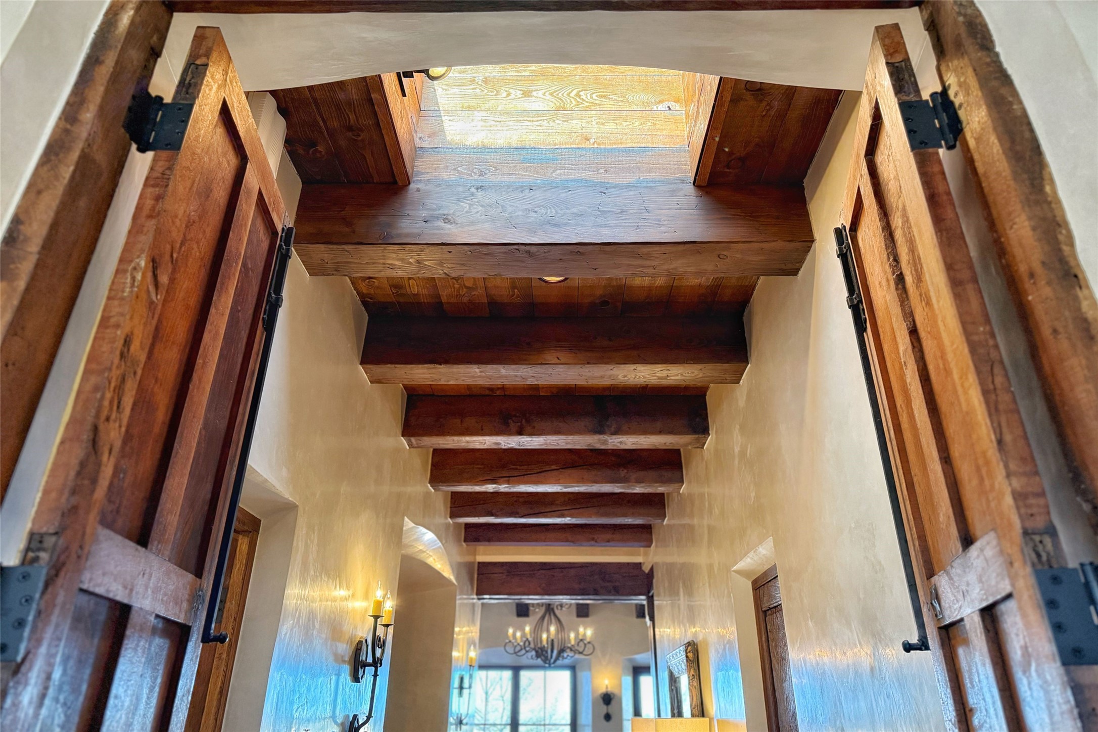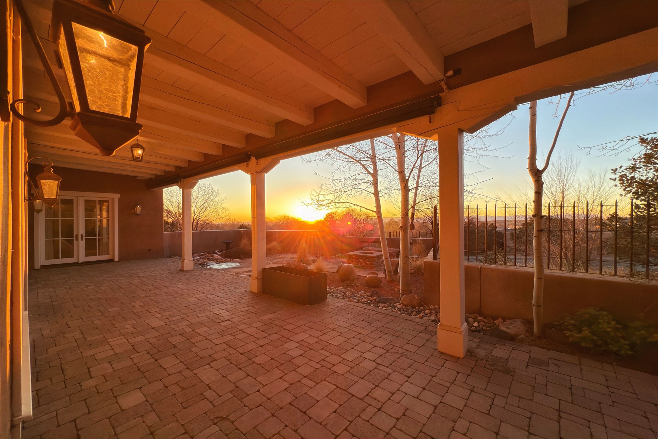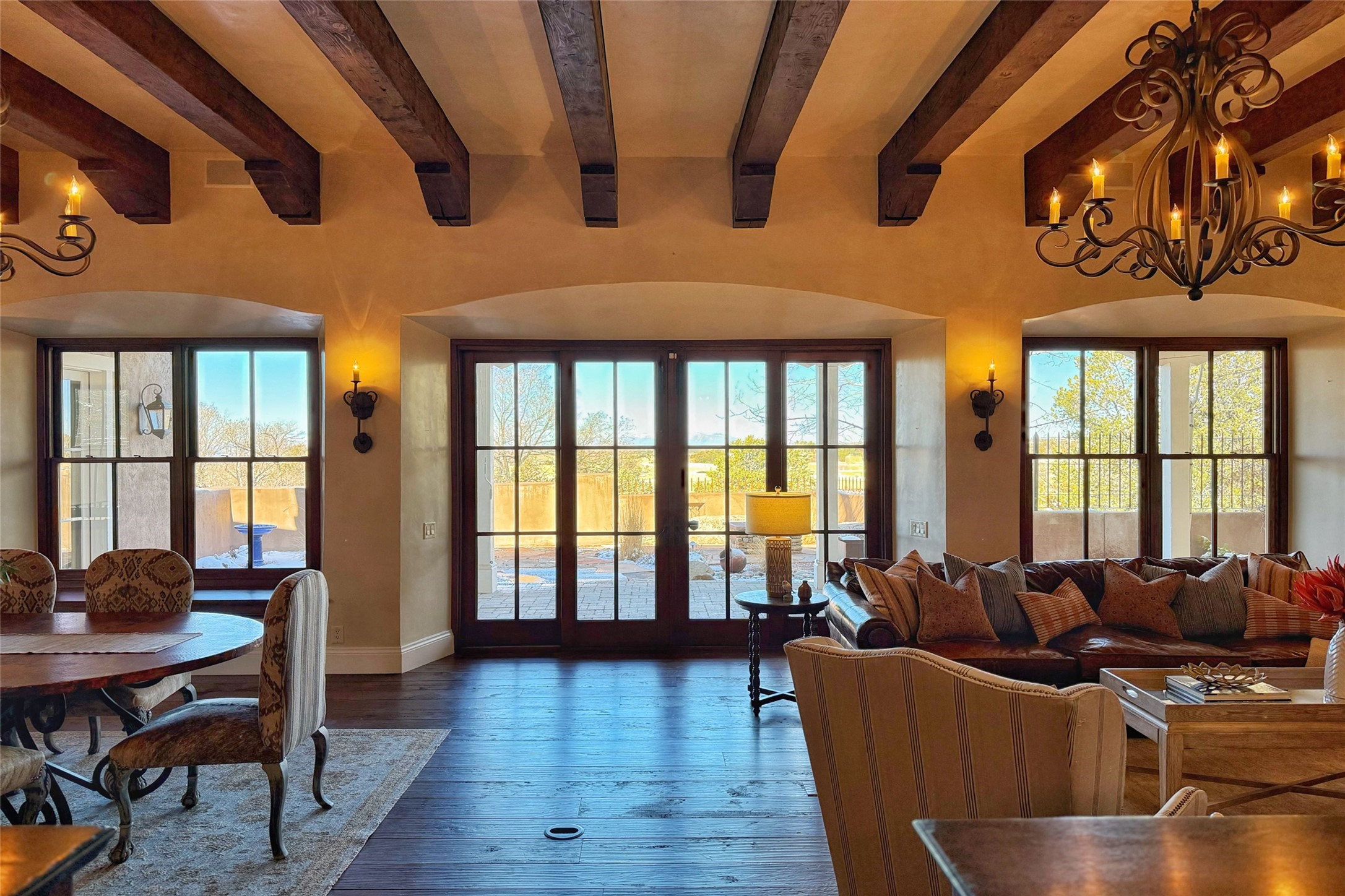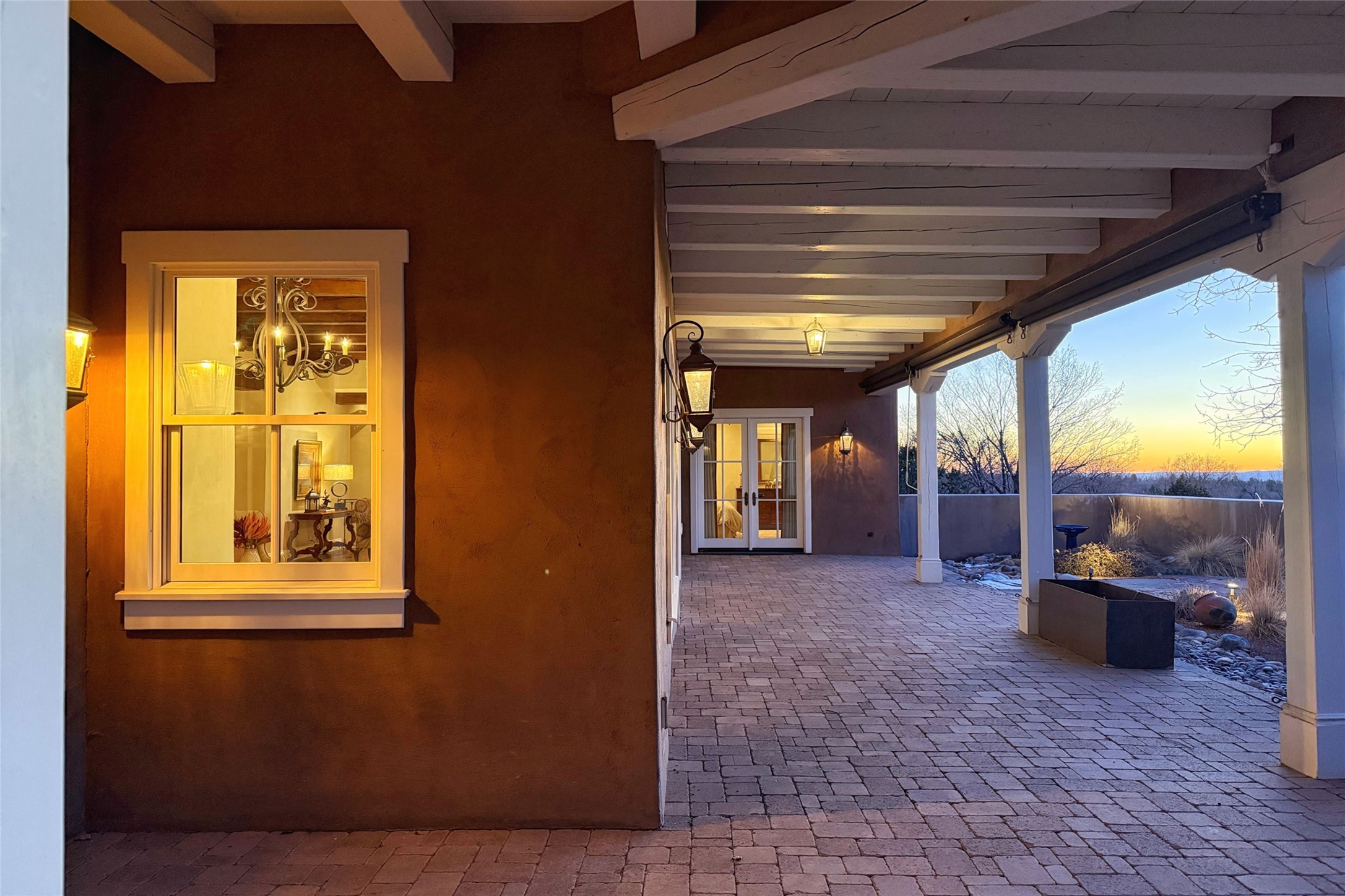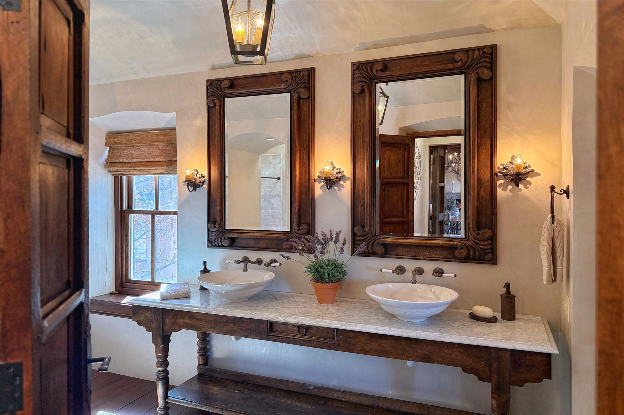 This is a rare opportunity to own a custom-built home in the heart of Santa Fe's cherished Historic Eastside. This elegant territorial-style residence offers sweeping views of the Jemez Mountains' breathtaking sunsets and is perfectly positioned just a short stroll from the famed Canyon Road. Built in 2008, this home features high-insulation pumice-crete construction that beautifully replicates the look and feel of traditional stacked adobe. Every element of the home reflects an unwavering commitment to quality and meticulous attention to detail. The home's three bedrooms, each with its own ensuite bath, provide a harmonious balance of privacy and comfort. In addition, there is an office with a private entrance. The main living areas are conveniently located on one floor, while the lower level is dedicated to guest quarters and a media room. Distressed floors offer a rich, inviting foundation, while handcrafted reclaimed wood doors and intricately carved posts, beams, and corbels evoke the timeless beauty of the territorial style. At the heart of the home lies a gourmet kitchen outfitted with Wolf and Sub-Zero appliances, a butler's pantry, and a wet bar. A private courtyard provides a serene entry, while the expansive wrap-around rear portal framed by a wall of windows, offers an unparalleled vantage point for taking in the majestic mountain vistas with a landscaped garden and fire pit with seating.