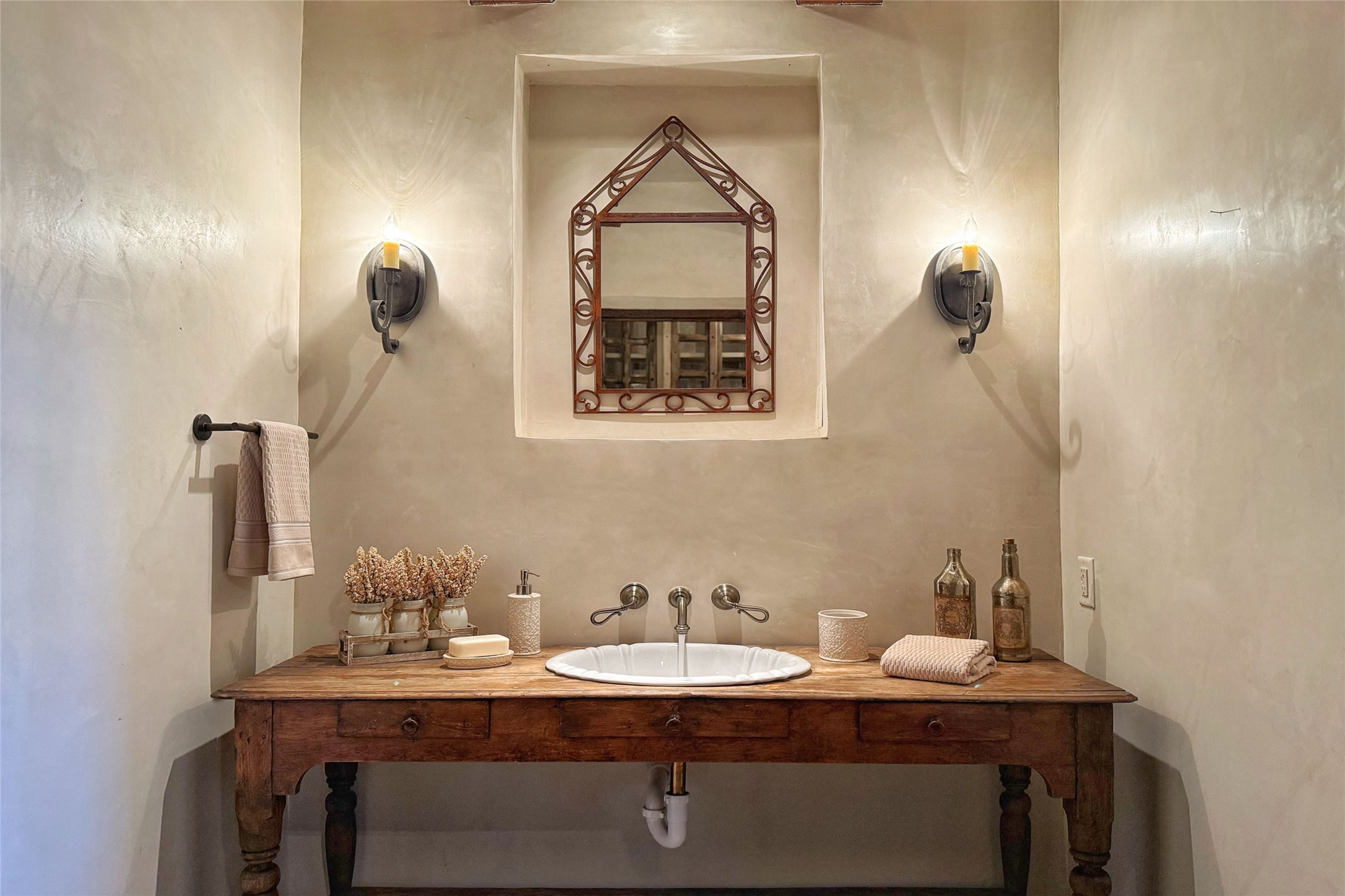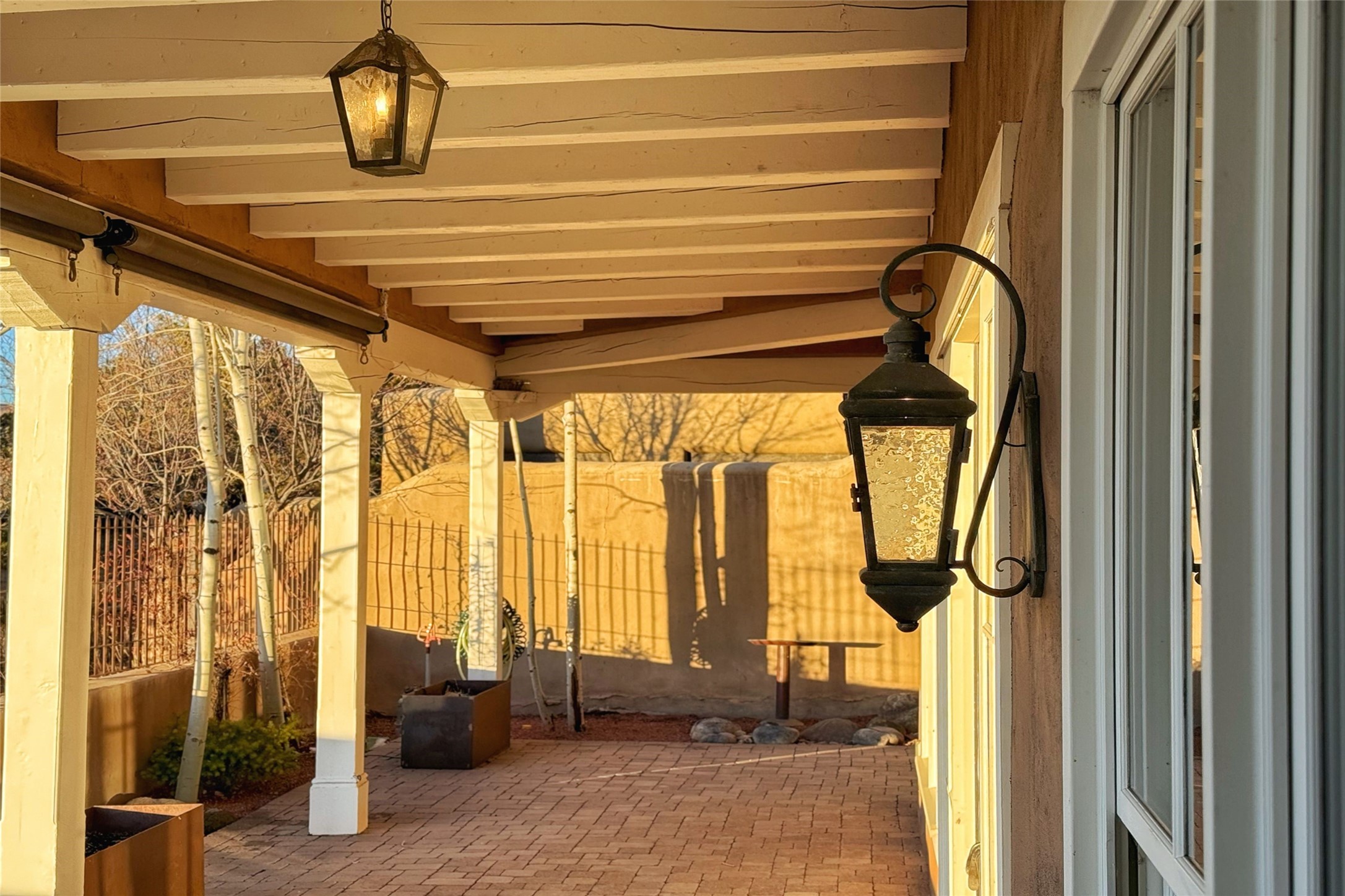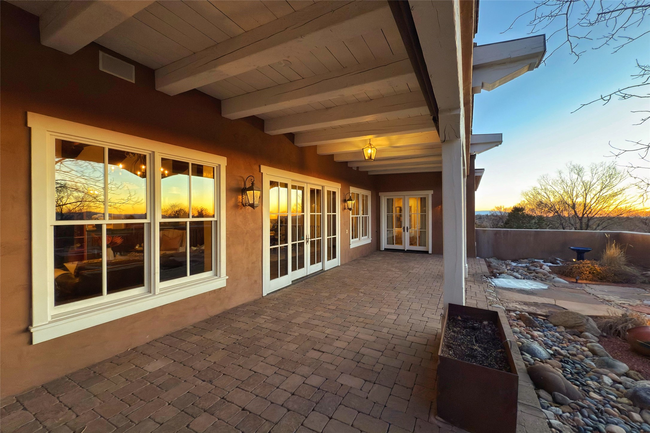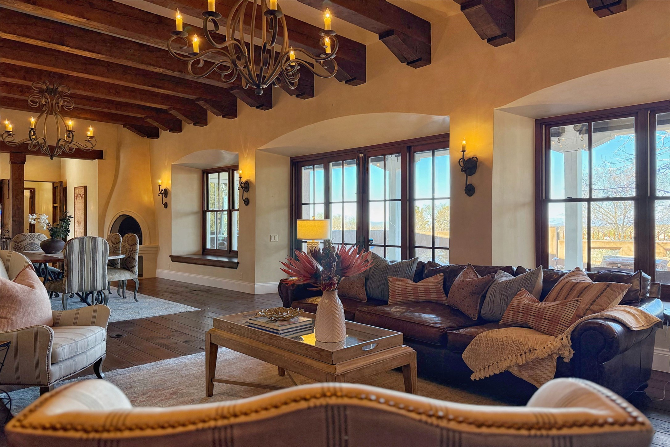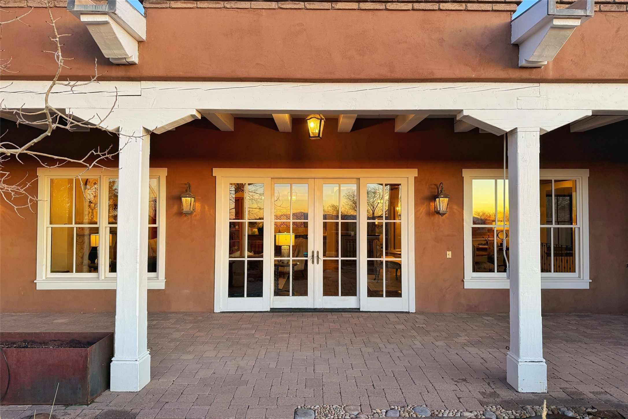 This is a rare opportunity to own a custom-built home in the heart of Santa Fe's cherished Historic Eastside. This elegant territorial-style residence offers sweeping views of the Jemez Mountains' breathtaking sunsets and is perfectly positioned just a short stroll from the famed Canyon Road. Built in 2008, this home features high-insulation pumice-crete construction that beautifully replicates the look and feel of traditional stacked adobe. Every element of the home reflects an unwavering commitment to quality and meticulous attention to detail. The home's three bedrooms, each with its own ensuite bath, provide a harmonious balance of privacy and comfort. In addition, there is an office with a private entrance. The main living areas are conveniently located on one floor, while the lower level is dedicated to guest quarters and a media room. Distressed floors offer a rich, inviting foundation, while handcrafted reclaimed wood doors and intricately carved posts, beams, and corbels evoke the timeless beauty of the territorial style. At the heart of the home lies a gourmet kitchen outfitted with Wolf and Sub-Zero appliances, a butler's pantry, and a wet bar. A private courtyard provides a serene entry, while the expansive wrap-around rear portal framed by a wall of windows, offers an unparalleled vantage point for taking in the majestic mountain vistas with a landscaped garden and fire pit with seating.