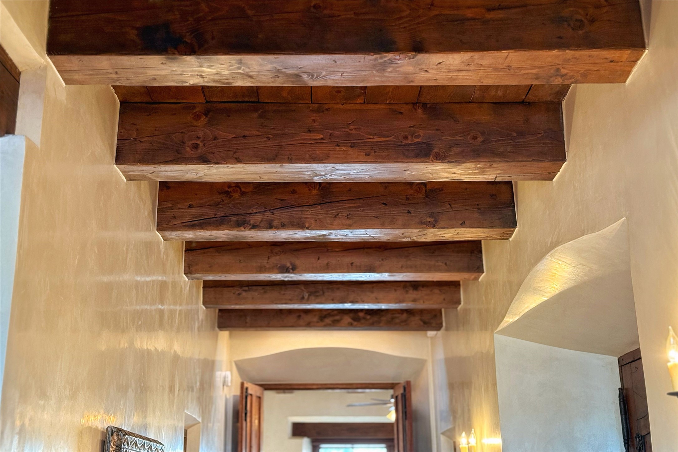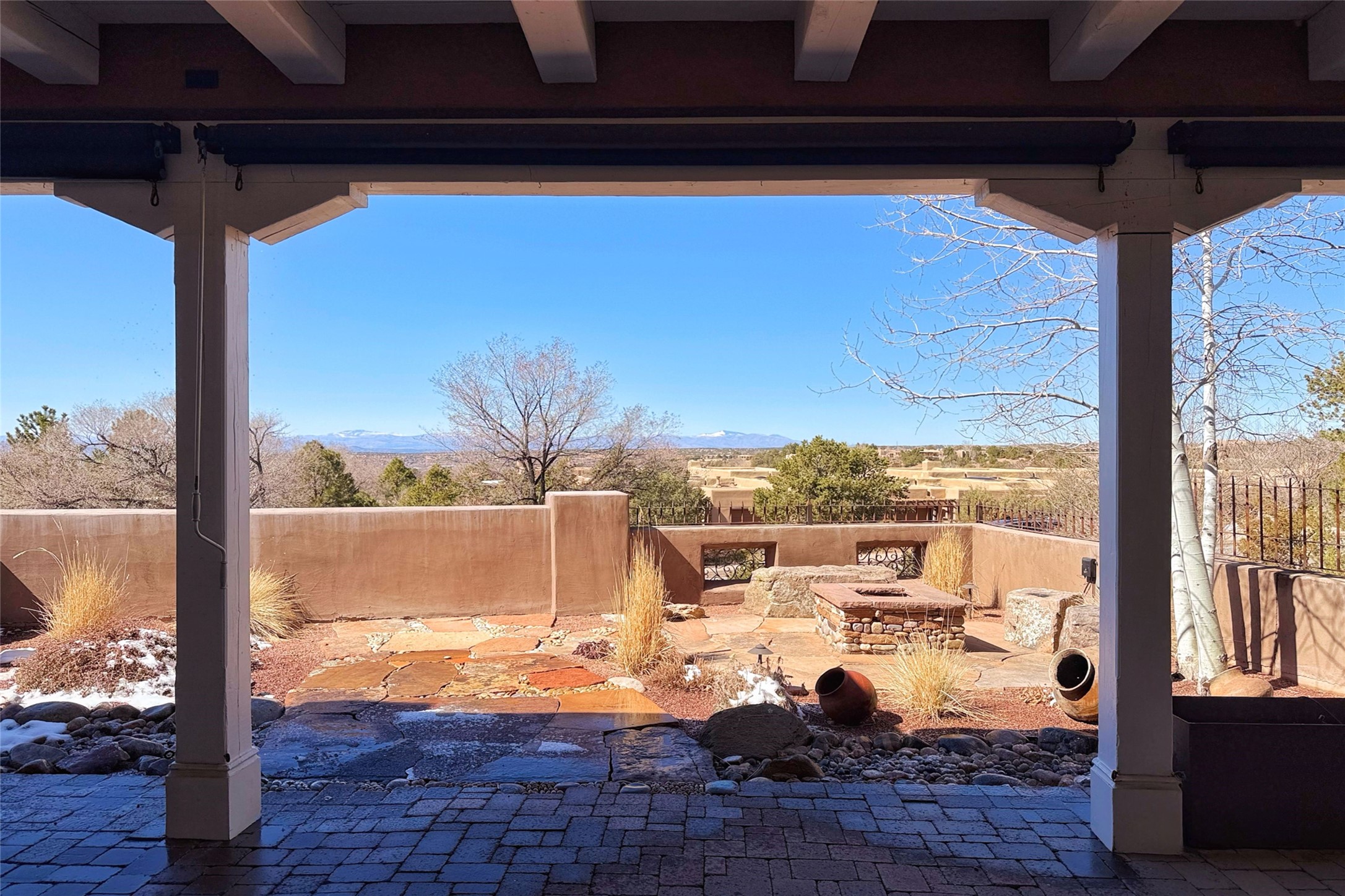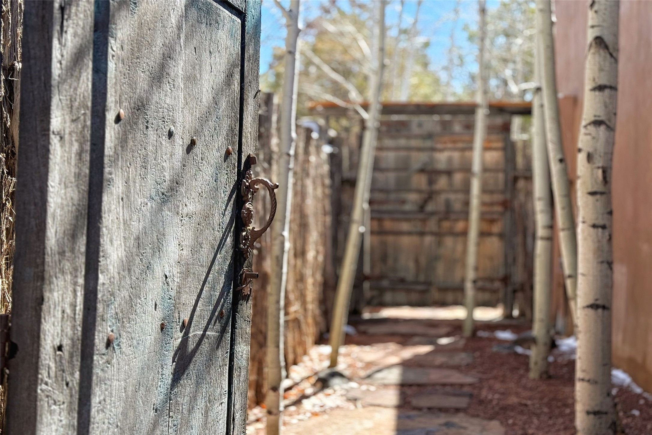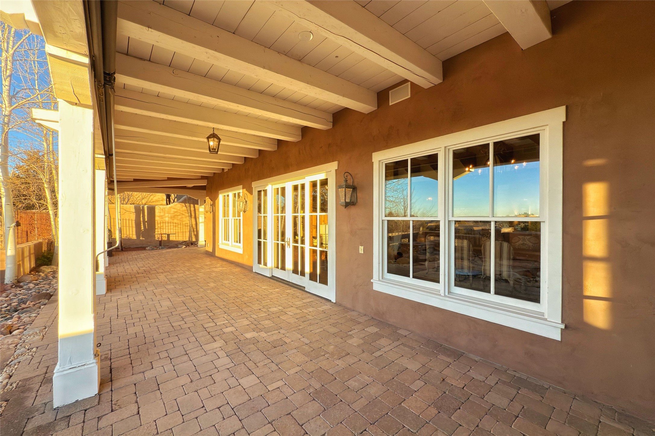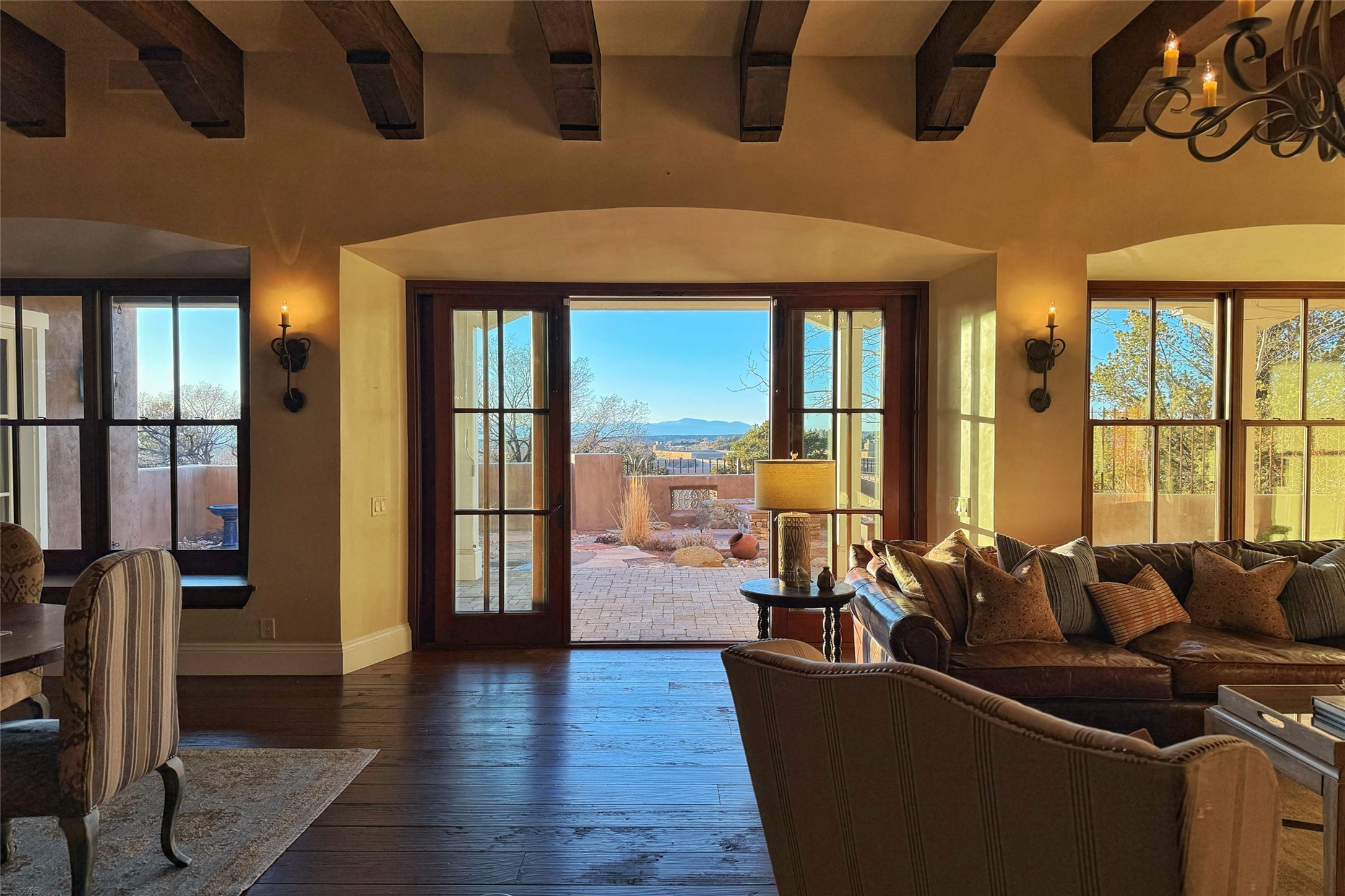 This is a rare opportunity to own a custom-built home in the heart of Santa Fe's cherished Historic Eastside. This elegant territorial-style residence offers sweeping views of the Jemez Mountains' breathtaking sunsets and is perfectly positioned just a short stroll from the famed Canyon Road. Built in 2008, this home features high-insulation pumice-crete construction that beautifully replicates the look and feel of traditional stacked adobe. Every element of the home reflects an unwavering commitment to quality and meticulous attention to detail. The home's three bedrooms, each with its own ensuite bath, provide a harmonious balance of privacy and comfort. In addition, there is an office with a private entrance. The main living areas are conveniently located on one floor, while the lower level is dedicated to guest quarters and a media room. Distressed floors offer a rich, inviting foundation, while handcrafted reclaimed wood doors and intricately carved posts, beams, and corbels evoke the timeless beauty of the territorial style. At the heart of the home lies a gourmet kitchen outfitted with Wolf and Sub-Zero appliances, a butler's pantry, and a wet bar. A private courtyard provides a serene entry, while the expansive wrap-around rear portal framed by a wall of windows, offers an unparalleled vantage point for taking in the majestic mountain vistas with a landscaped garden and fire pit with seating.