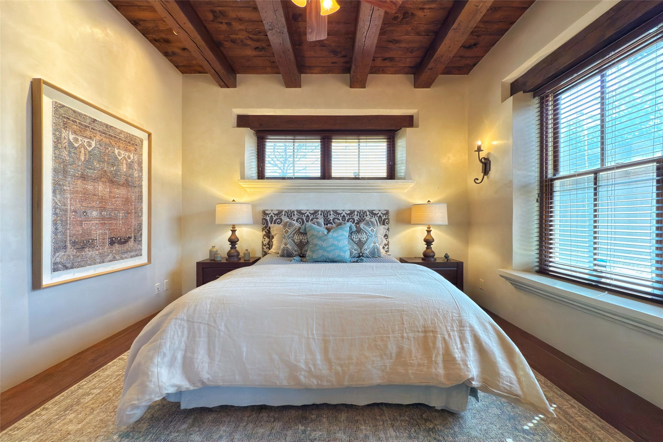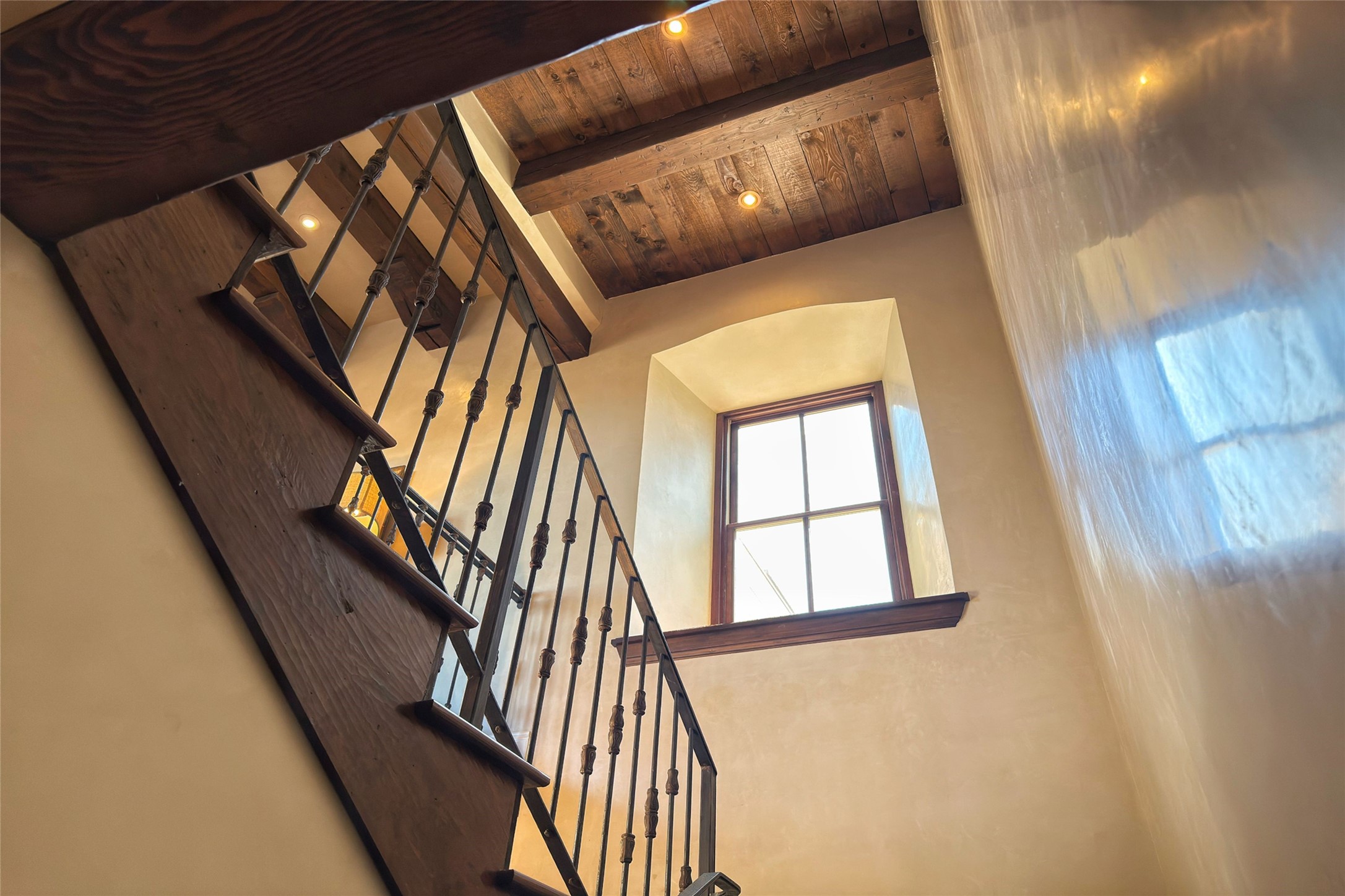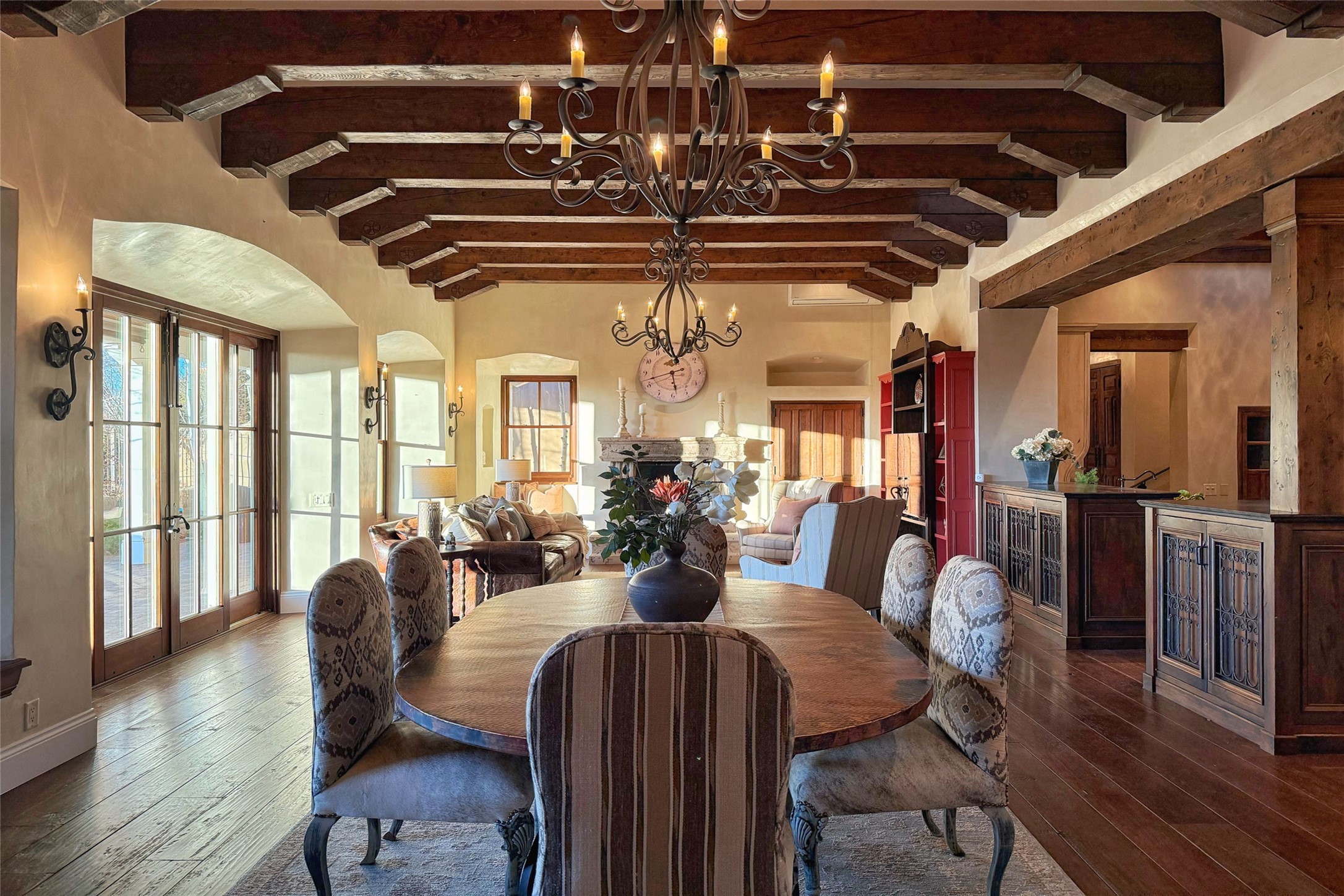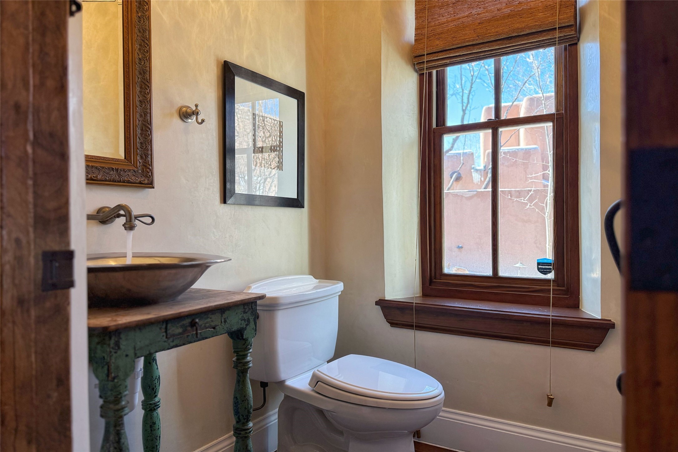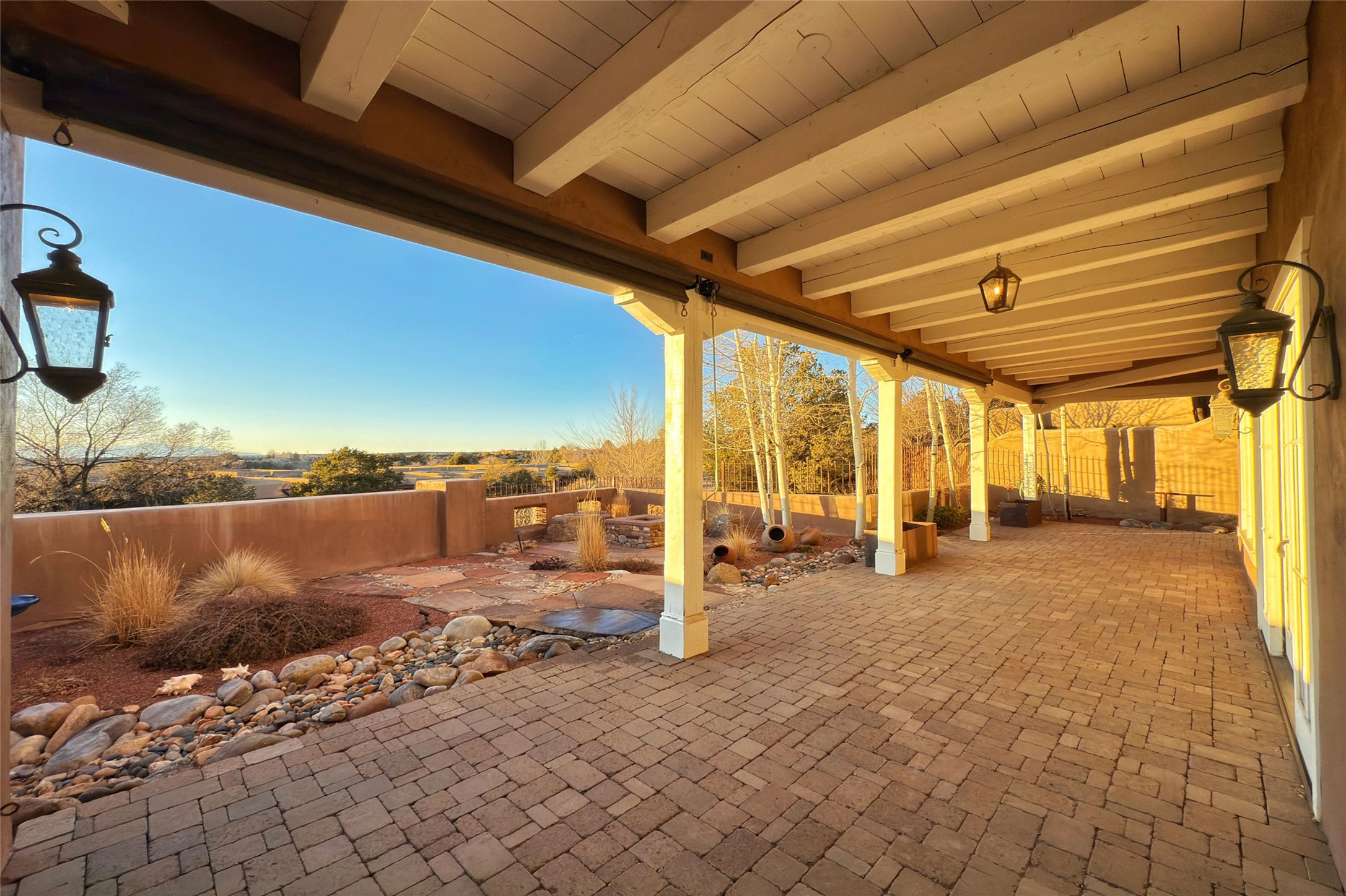 This is a rare opportunity to own a custom-built home in the heart of Santa Fe's cherished Historic Eastside. This elegant territorial-style residence offers sweeping views of the Jemez Mountains' breathtaking sunsets and is perfectly positioned just a short stroll from the famed Canyon Road. Built in 2008, this home features high-insulation pumice-crete construction that beautifully replicates the look and feel of traditional stacked adobe. Every element of the home reflects an unwavering commitment to quality and meticulous attention to detail. The home's three bedrooms, each with its own ensuite bath, provide a harmonious balance of privacy and comfort. In addition, there is an office with a private entrance. The main living areas are conveniently located on one floor, while the lower level is dedicated to guest quarters and a media room. Distressed floors offer a rich, inviting foundation, while handcrafted reclaimed wood doors and intricately carved posts, beams, and corbels evoke the timeless beauty of the territorial style. At the heart of the home lies a gourmet kitchen outfitted with Wolf and Sub-Zero appliances, a butler's pantry, and a wet bar. A private courtyard provides a serene entry, while the expansive wrap-around rear portal framed by a wall of windows, offers an unparalleled vantage point for taking in the majestic mountain vistas with a landscaped garden and fire pit with seating.
