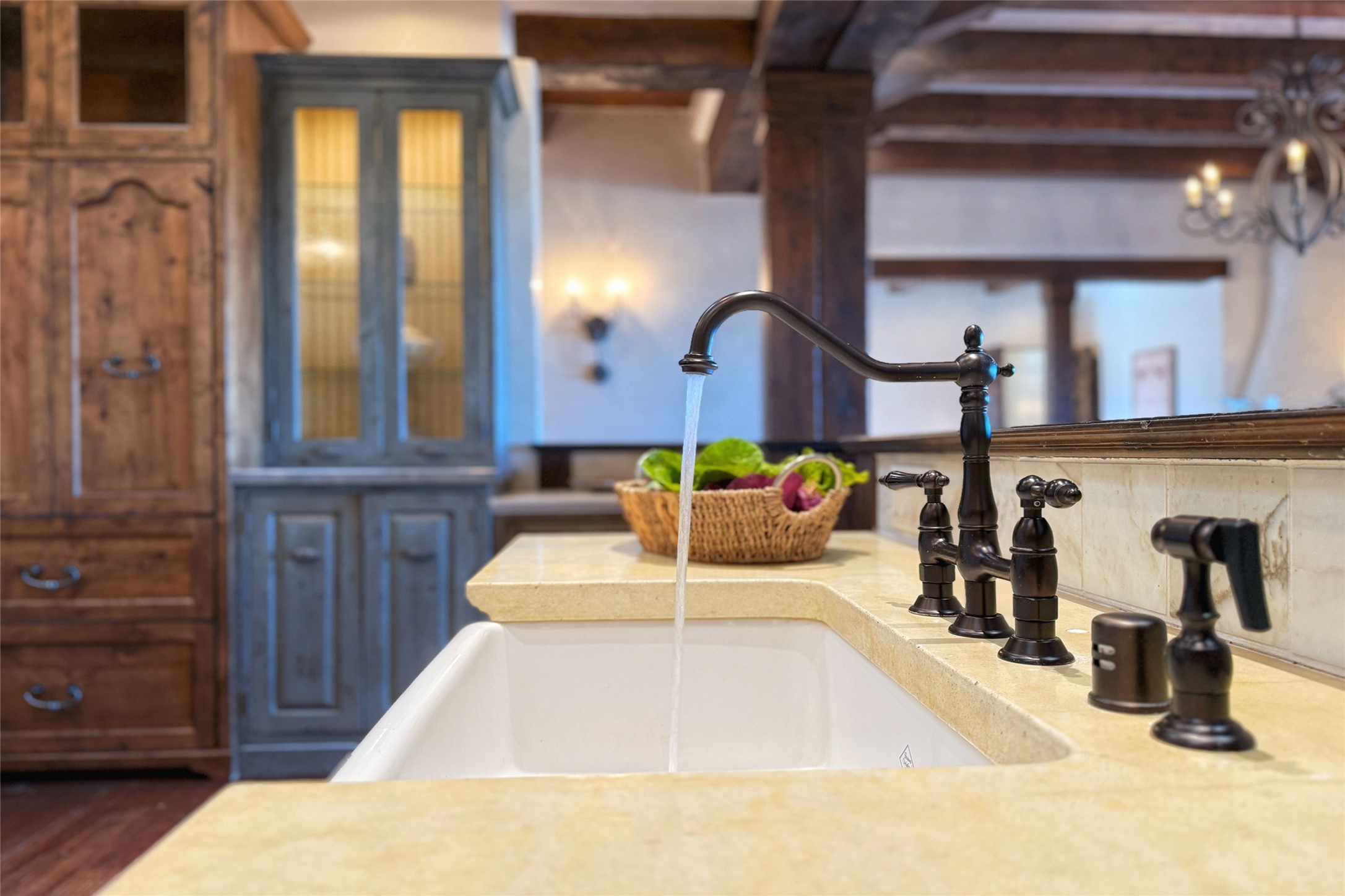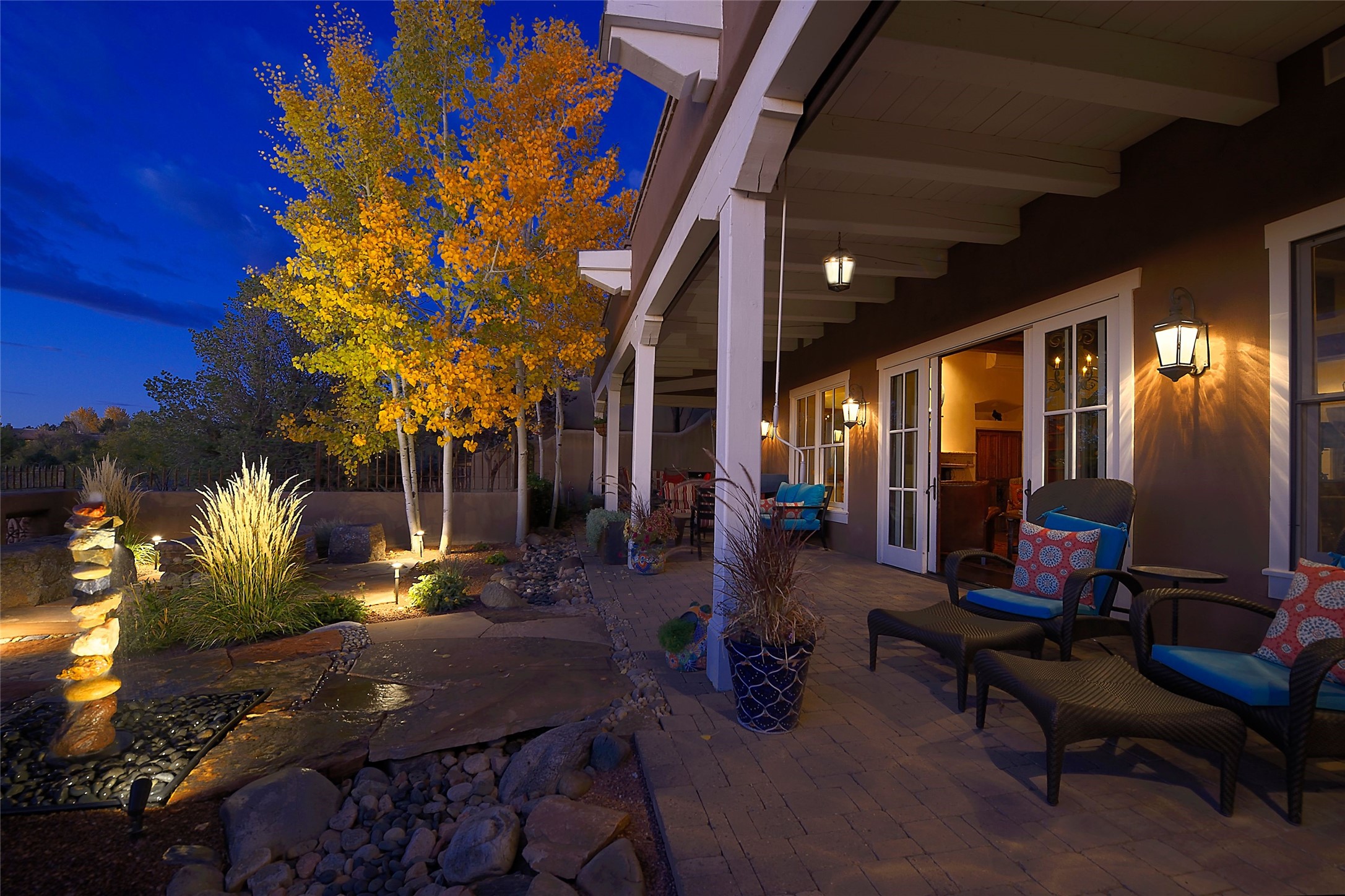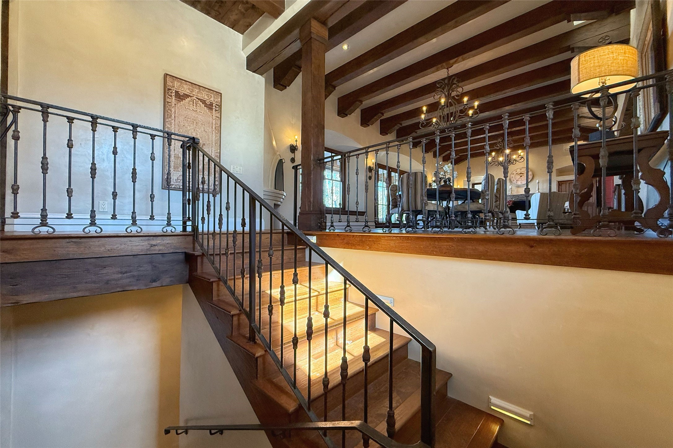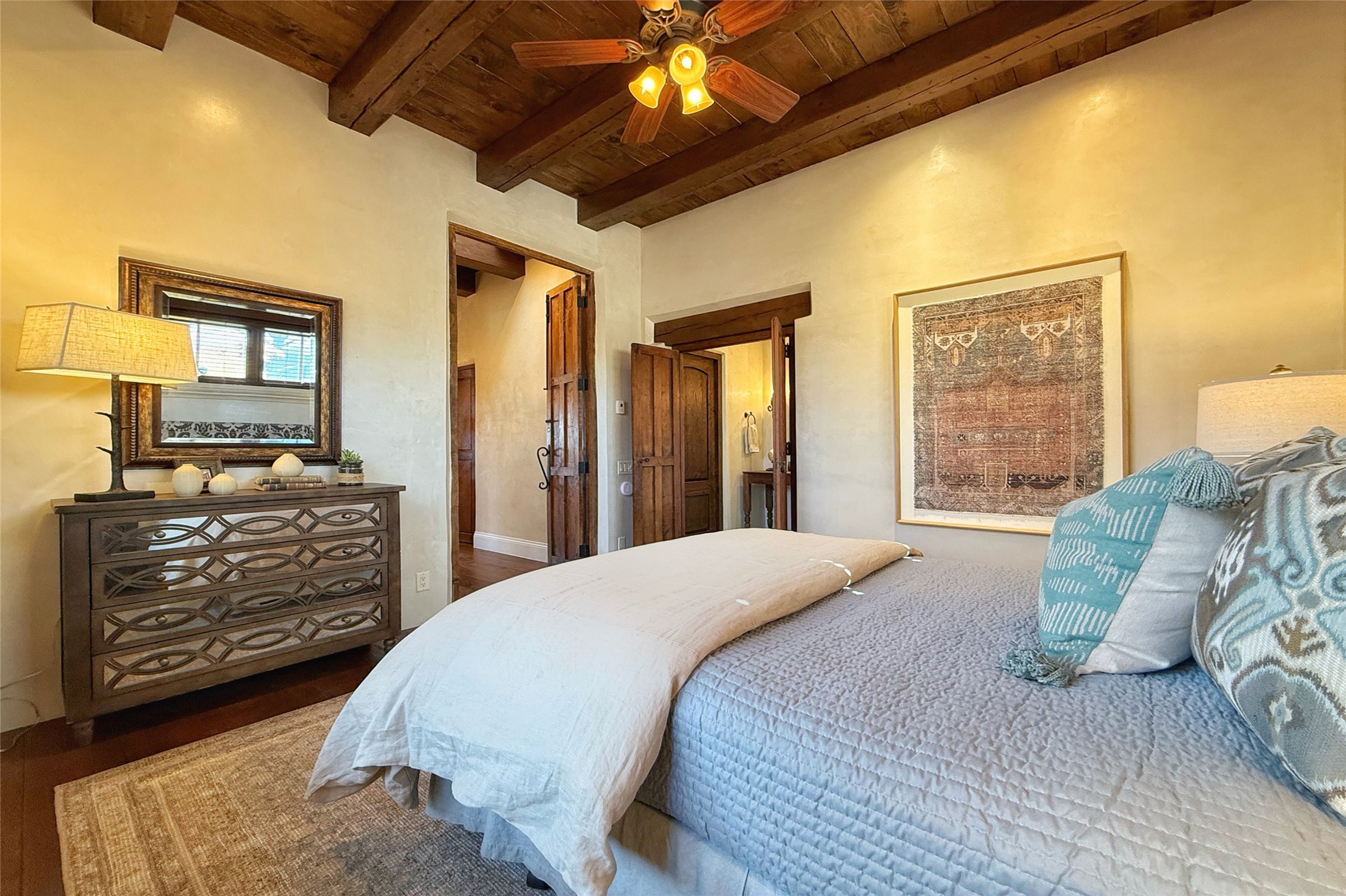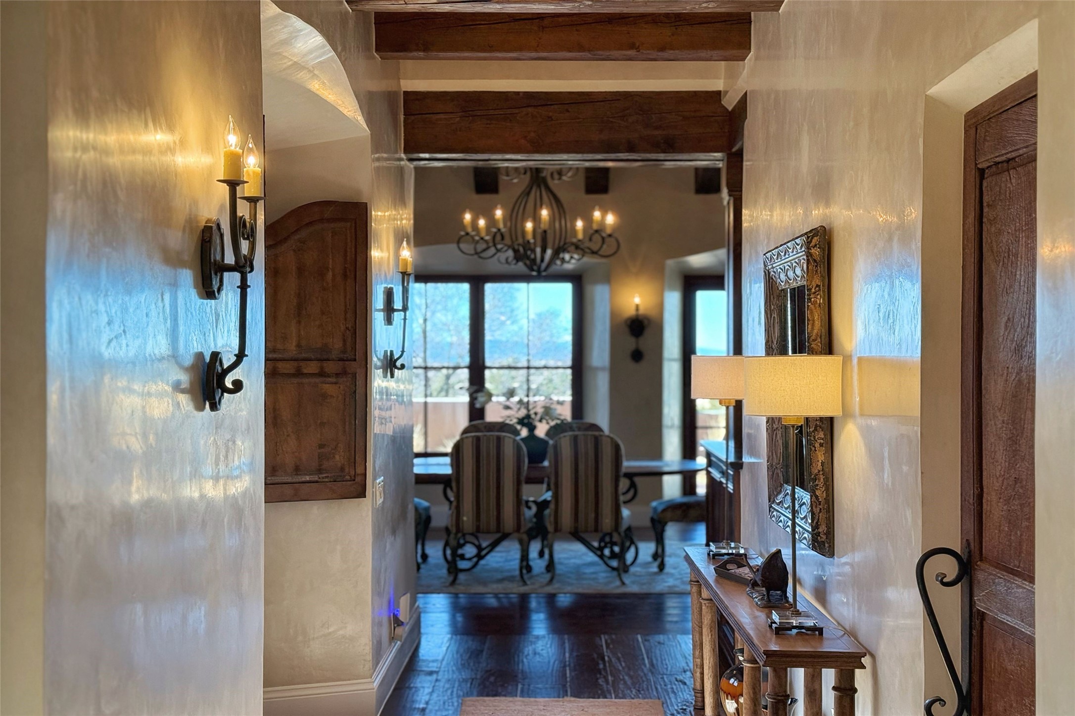 This is a rare opportunity to own a custom-built home in the heart of Santa Fe's cherished Historic Eastside. This elegant territorial-style residence offers sweeping views of the Jemez Mountains' breathtaking sunsets and is perfectly positioned just a short stroll from the famed Canyon Road. Built in 2008, this home features high-insulation pumice-crete construction that beautifully replicates the look and feel of traditional stacked adobe. Every element of the home reflects an unwavering commitment to quality and meticulous attention to detail. The home's three bedrooms, each with its own ensuite bath, provide a harmonious balance of privacy and comfort. In addition, there is an office with a private entrance. The main living areas are conveniently located on one floor, while the lower level is dedicated to guest quarters and a media room. Distressed floors offer a rich, inviting foundation, while handcrafted reclaimed wood doors and intricately carved posts, beams, and corbels evoke the timeless beauty of the territorial style. At the heart of the home lies a gourmet kitchen outfitted with Wolf and Sub-Zero appliances, a butler's pantry, and a wet bar. A private courtyard provides a serene entry, while the expansive wrap-around rear portal framed by a wall of windows, offers an unparalleled vantage point for taking in the majestic mountain vistas with a landscaped garden and fire pit with seating.