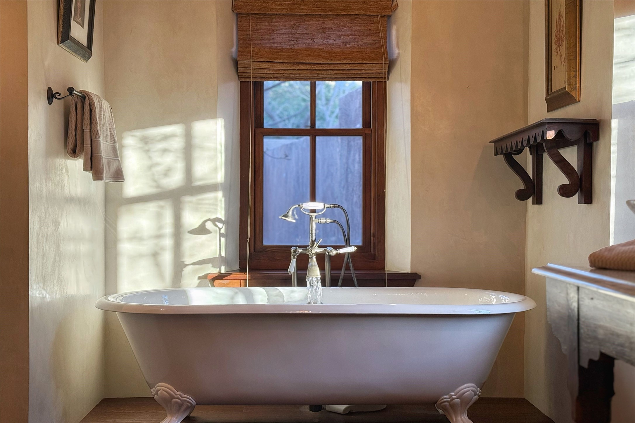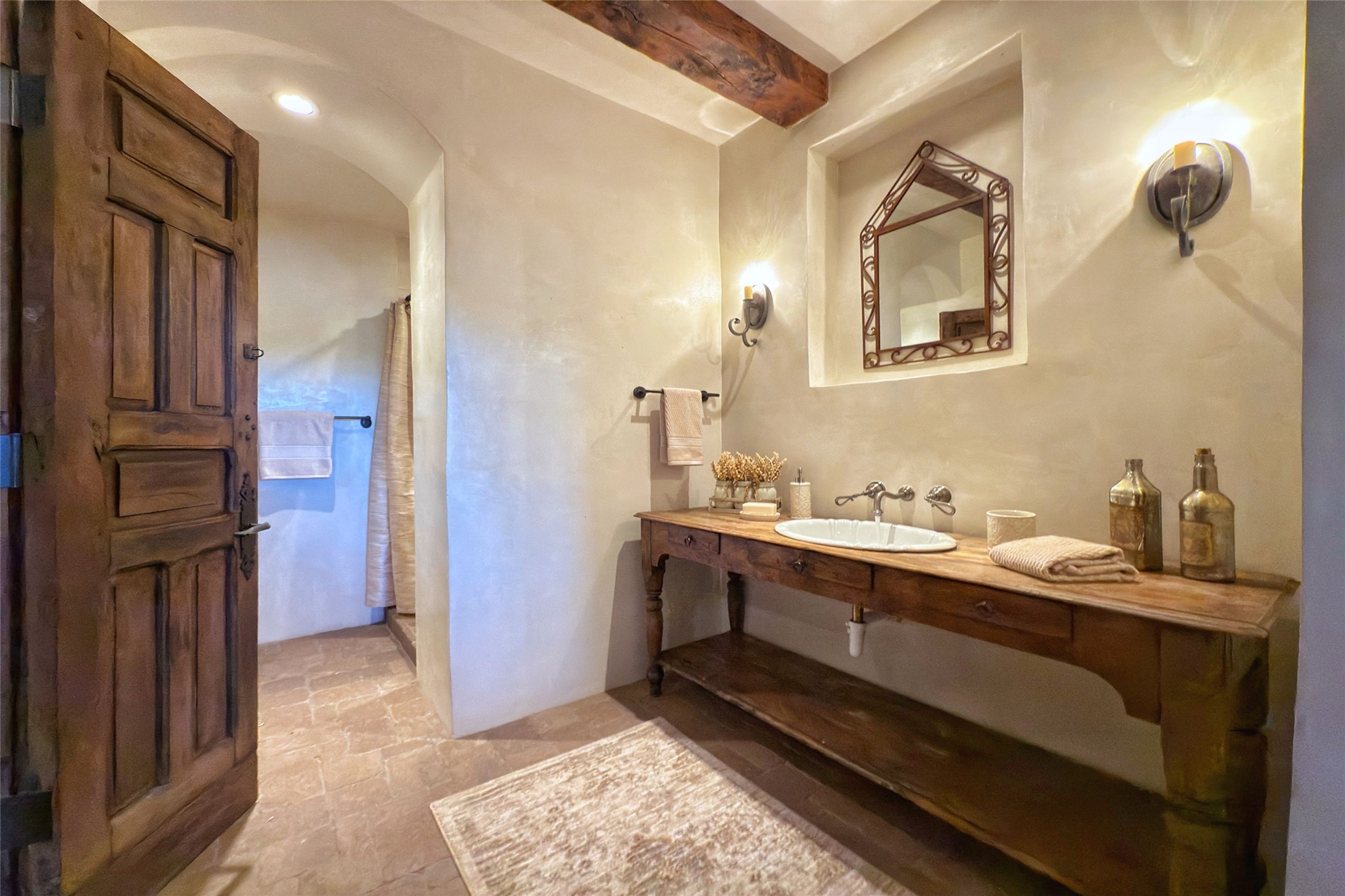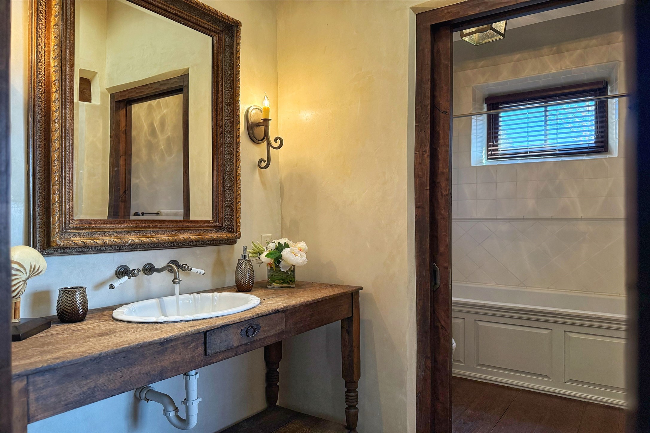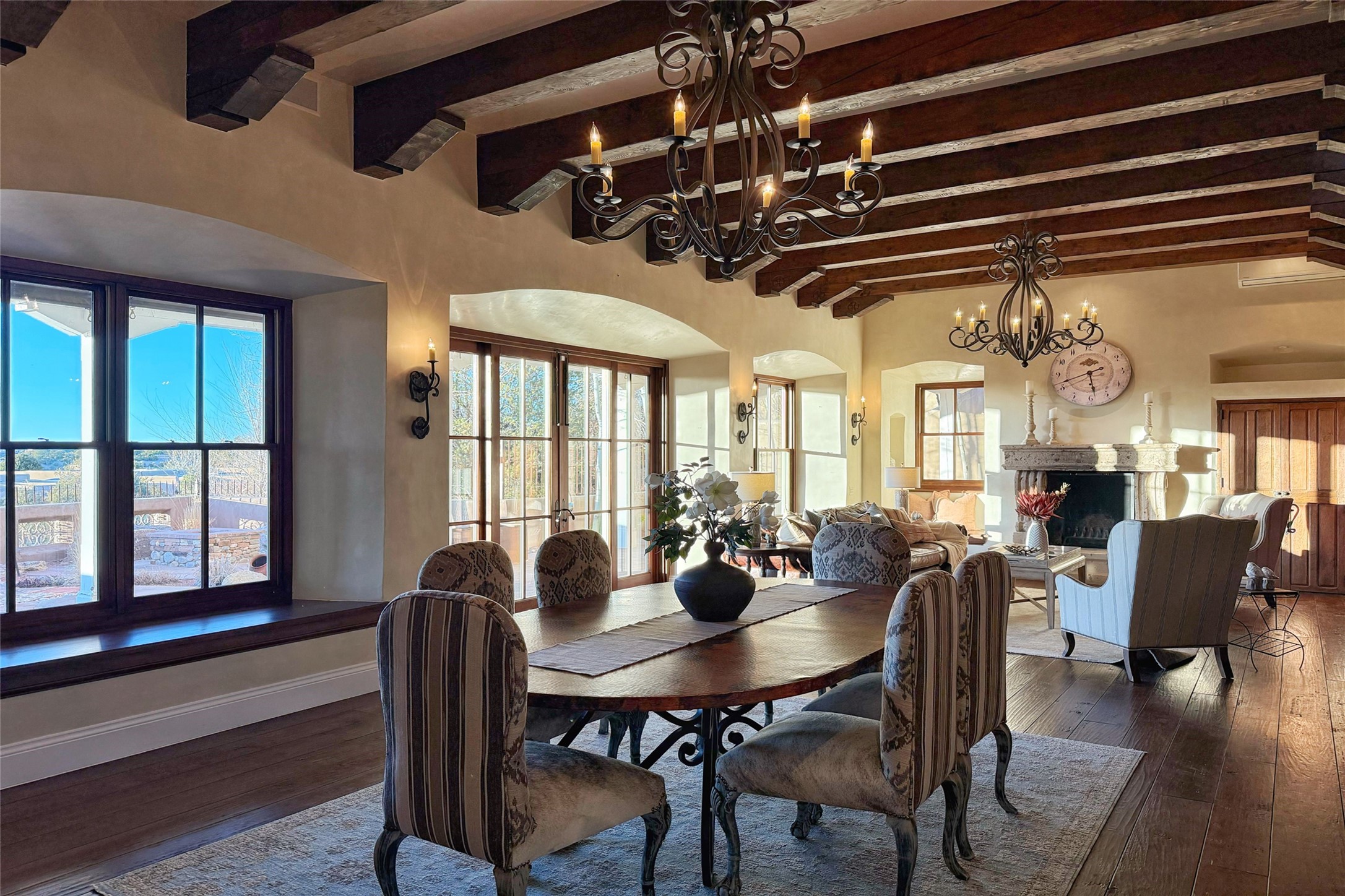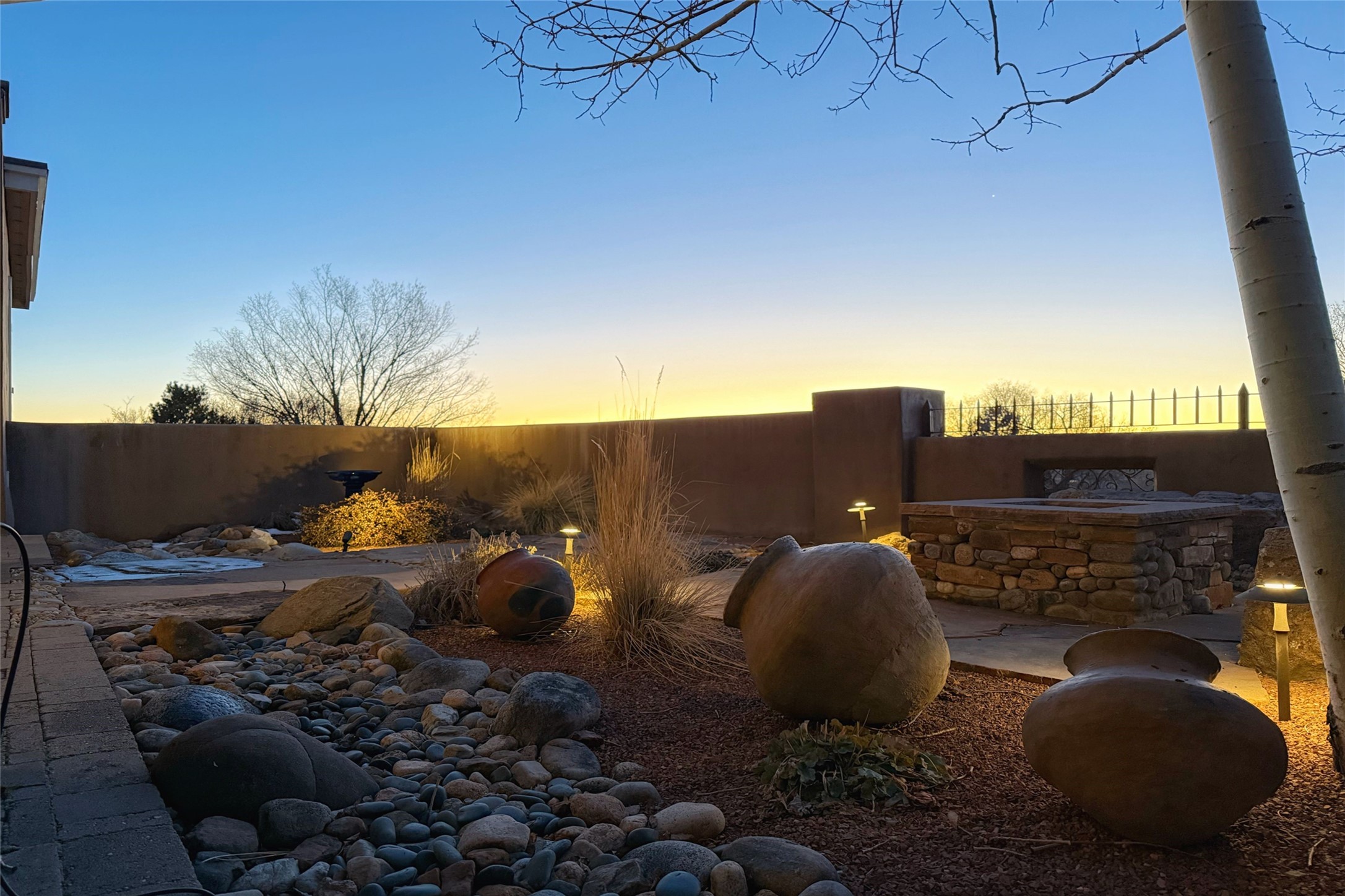 This is a rare opportunity to own a custom-built home in the heart of Santa Fe's cherished Historic Eastside. This elegant territorial-style residence offers sweeping views of the Jemez Mountains' breathtaking sunsets and is perfectly positioned just a short stroll from the famed Canyon Road. Built in 2008, this home features high-insulation pumice-crete construction that beautifully replicates the look and feel of traditional stacked adobe. Every element of the home reflects an unwavering commitment to quality and meticulous attention to detail. The home's three bedrooms, each with its own ensuite bath, provide a harmonious balance of privacy and comfort. In addition, there is an office with a private entrance. The main living areas are conveniently located on one floor, while the lower level is dedicated to guest quarters and a media room. Distressed floors offer a rich, inviting foundation, while handcrafted reclaimed wood doors and intricately carved posts, beams, and corbels evoke the timeless beauty of the territorial style. At the heart of the home lies a gourmet kitchen outfitted with Wolf and Sub-Zero appliances, a butler's pantry, and a wet bar. A private courtyard provides a serene entry, while the expansive wrap-around rear portal framed by a wall of windows, offers an unparalleled vantage point for taking in the majestic mountain vistas with a landscaped garden and fire pit with seating.
