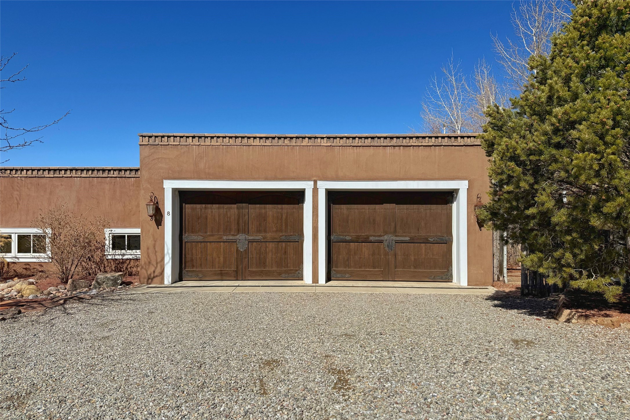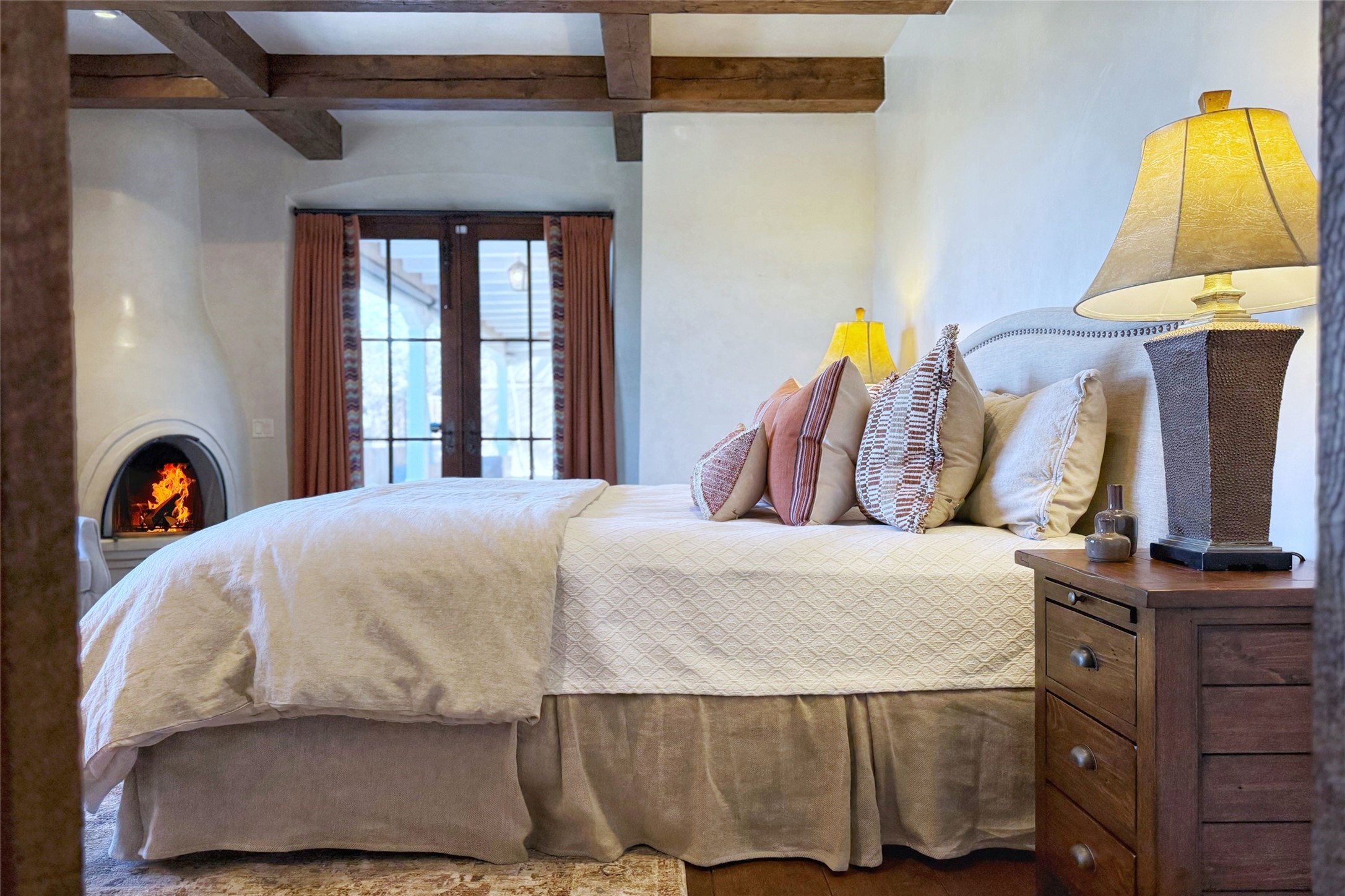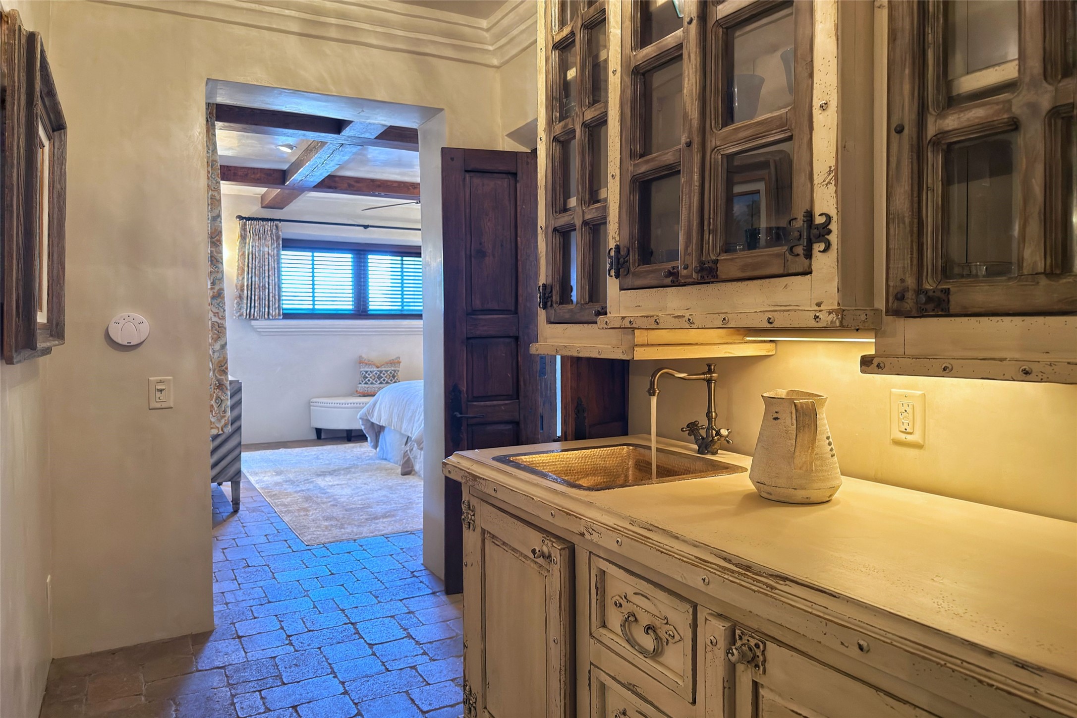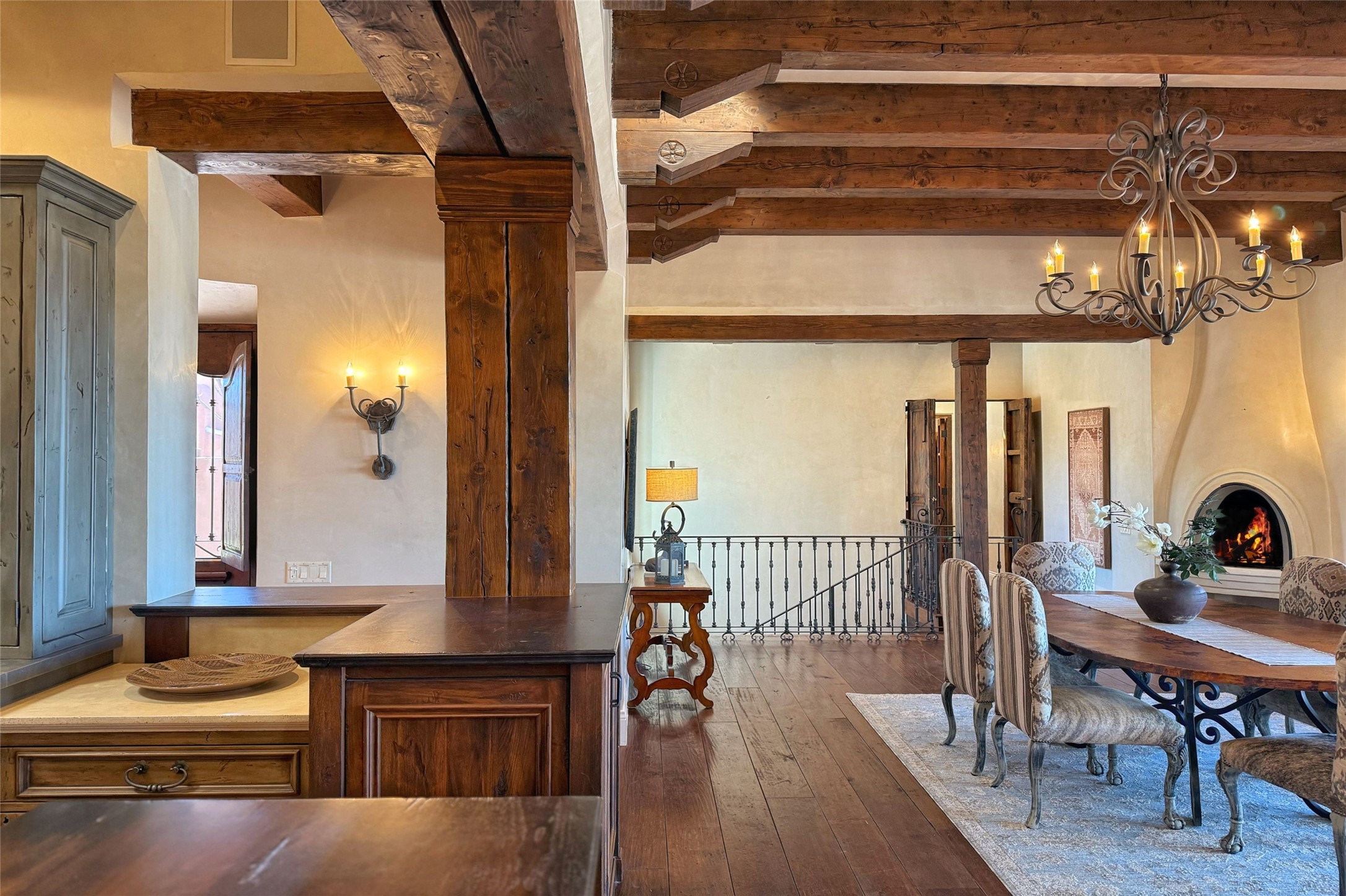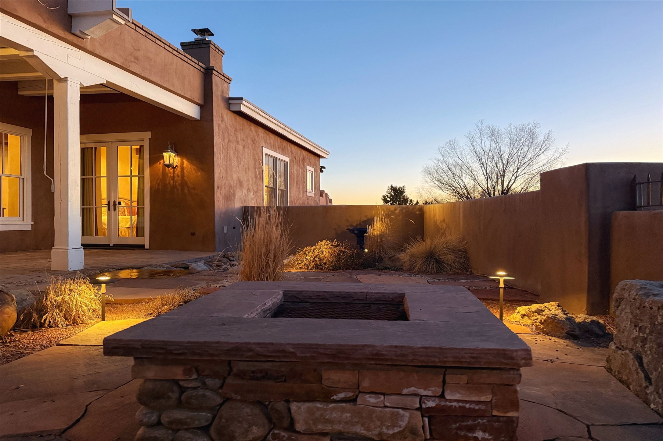 This is a rare opportunity to own a custom-built home in the heart of Santa Fe's cherished Historic Eastside. This elegant territorial-style residence offers sweeping views of the Jemez Mountains' breathtaking sunsets and is perfectly positioned just a short stroll from the famed Canyon Road. Built in 2008, this home features high-insulation pumice-crete construction that beautifully replicates the look and feel of traditional stacked adobe. Every element of the home reflects an unwavering commitment to quality and meticulous attention to detail. The home's three bedrooms, each with its own ensuite bath, provide a harmonious balance of privacy and comfort. In addition, there is an office with a private entrance. The main living areas are conveniently located on one floor, while the lower level is dedicated to guest quarters and a media room. Distressed floors offer a rich, inviting foundation, while handcrafted reclaimed wood doors and intricately carved posts, beams, and corbels evoke the timeless beauty of the territorial style. At the heart of the home lies a gourmet kitchen outfitted with Wolf and Sub-Zero appliances, a butler's pantry, and a wet bar. A private courtyard provides a serene entry, while the expansive wrap-around rear portal framed by a wall of windows, offers an unparalleled vantage point for taking in the majestic mountain vistas with a landscaped garden and fire pit with seating.