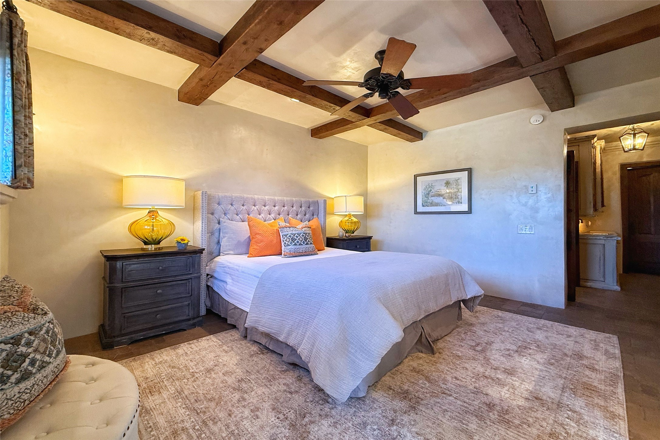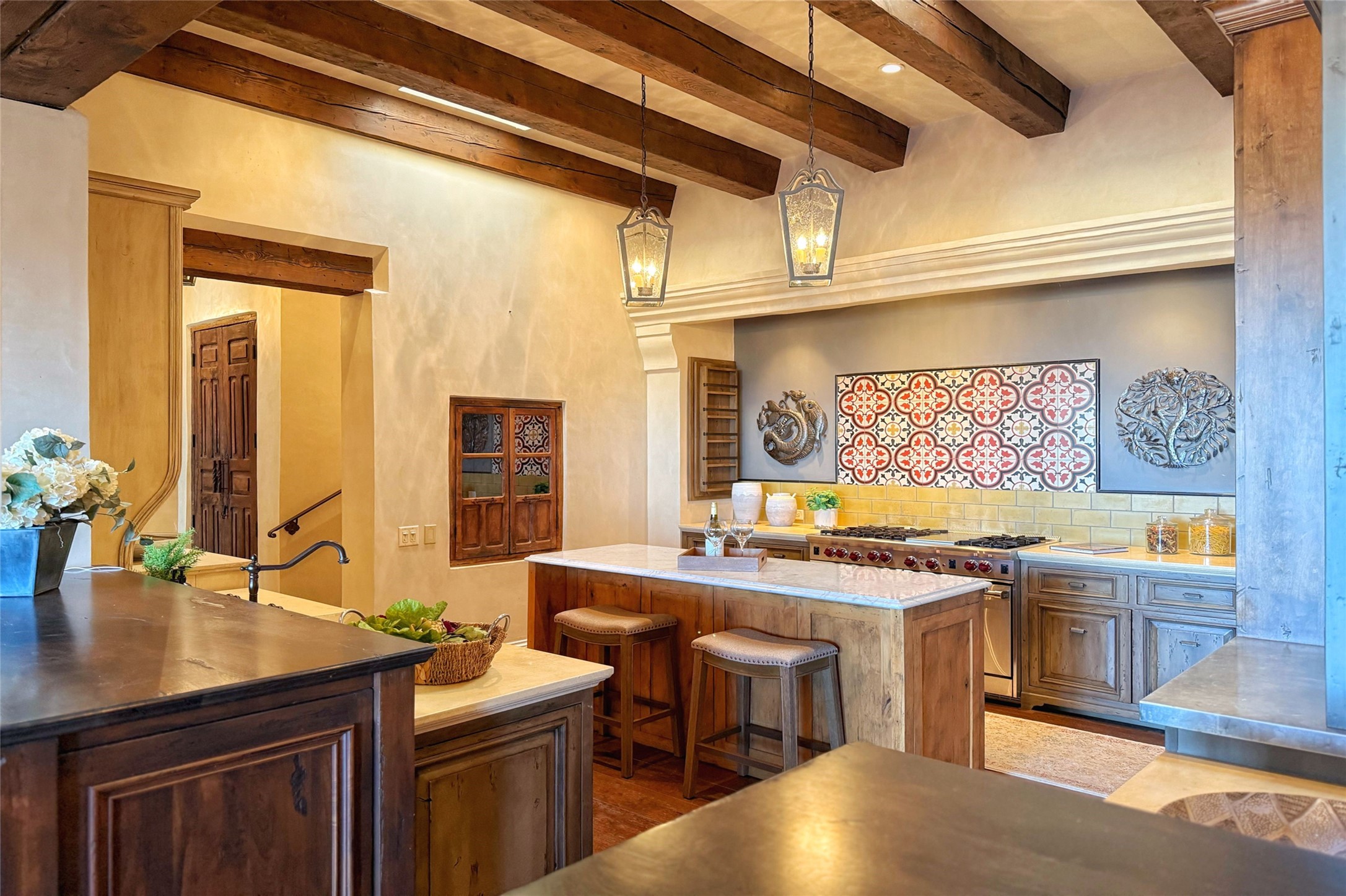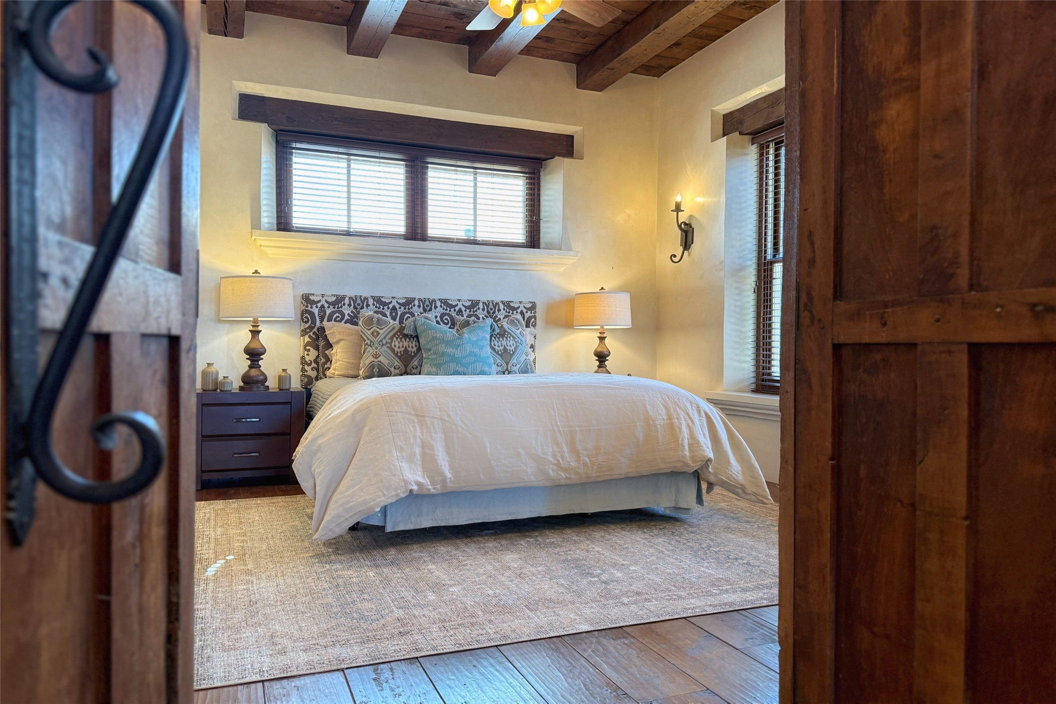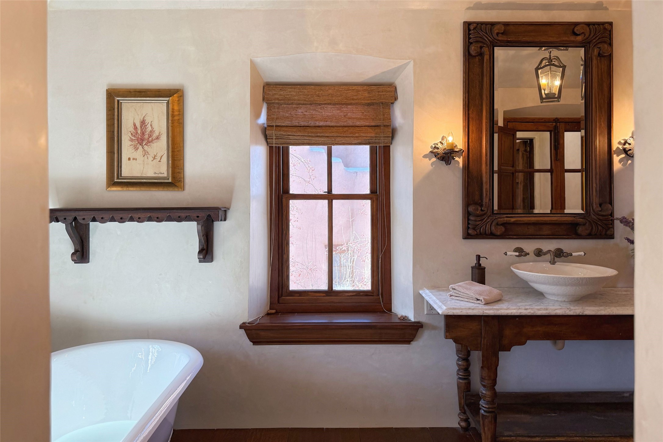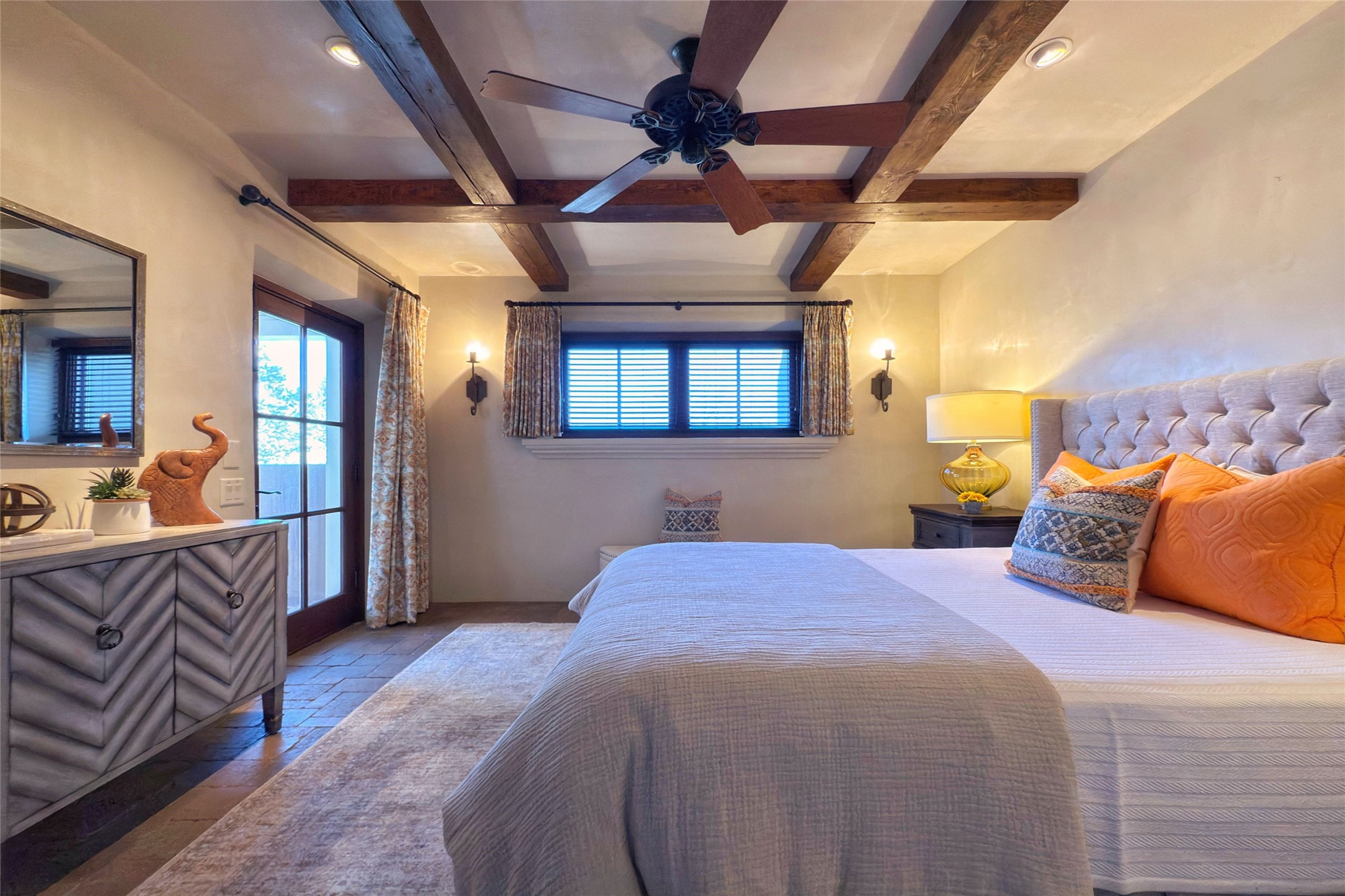 This is a rare opportunity to own a custom-built home in the heart of Santa Fe's cherished Historic Eastside. This elegant territorial-style residence offers sweeping views of the Jemez Mountains' breathtaking sunsets and is perfectly positioned just a short stroll from the famed Canyon Road. Built in 2008, this home features high-insulation pumice-crete construction that beautifully replicates the look and feel of traditional stacked adobe. Every element of the home reflects an unwavering commitment to quality and meticulous attention to detail. The home's three bedrooms, each with its own ensuite bath, provide a harmonious balance of privacy and comfort. In addition, there is an office with a private entrance. The main living areas are conveniently located on one floor, while the lower level is dedicated to guest quarters and a media room. Distressed floors offer a rich, inviting foundation, while handcrafted reclaimed wood doors and intricately carved posts, beams, and corbels evoke the timeless beauty of the territorial style. At the heart of the home lies a gourmet kitchen outfitted with Wolf and Sub-Zero appliances, a butler's pantry, and a wet bar. A private courtyard provides a serene entry, while the expansive wrap-around rear portal framed by a wall of windows, offers an unparalleled vantage point for taking in the majestic mountain vistas with a landscaped garden and fire pit with seating.