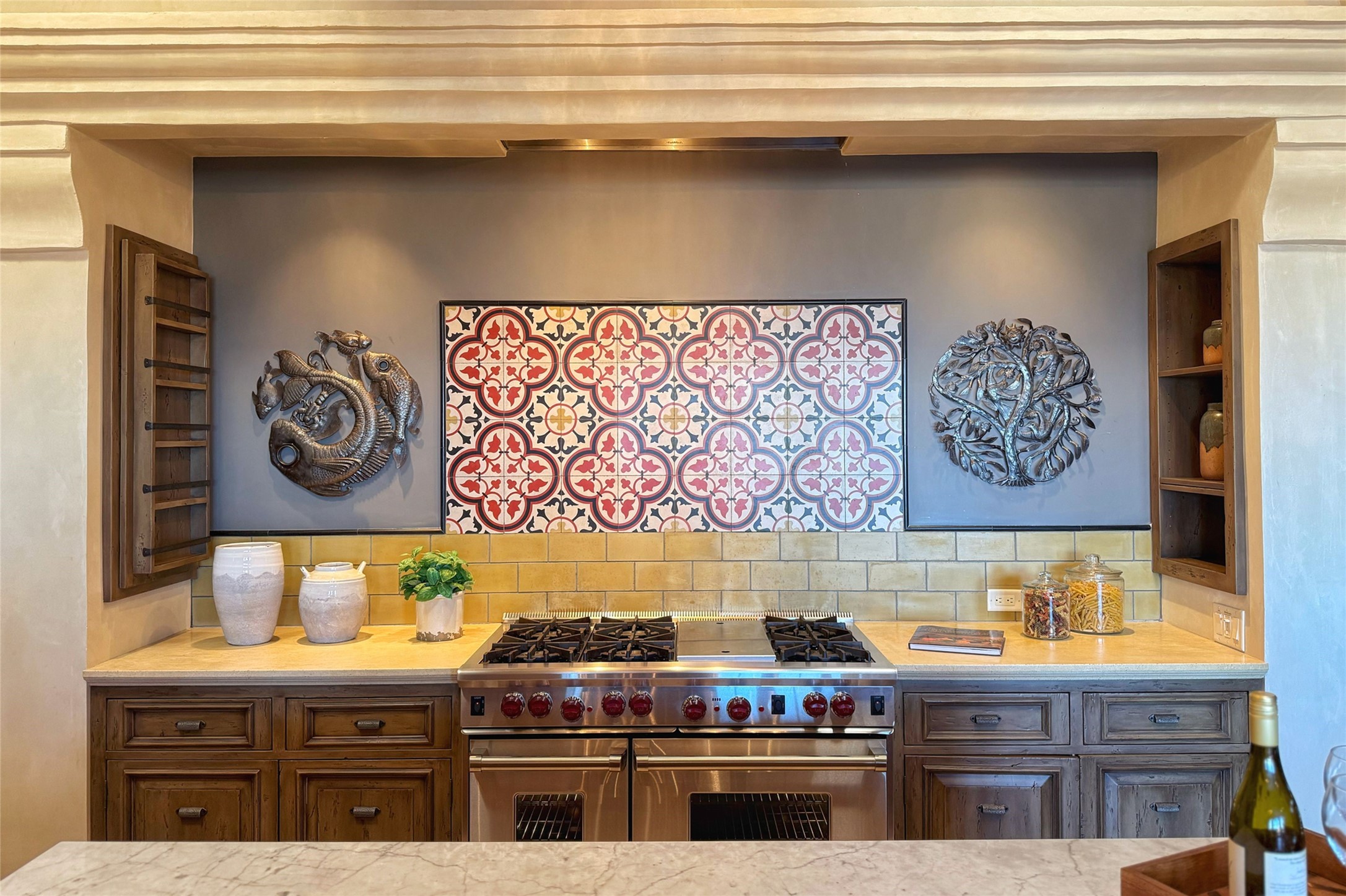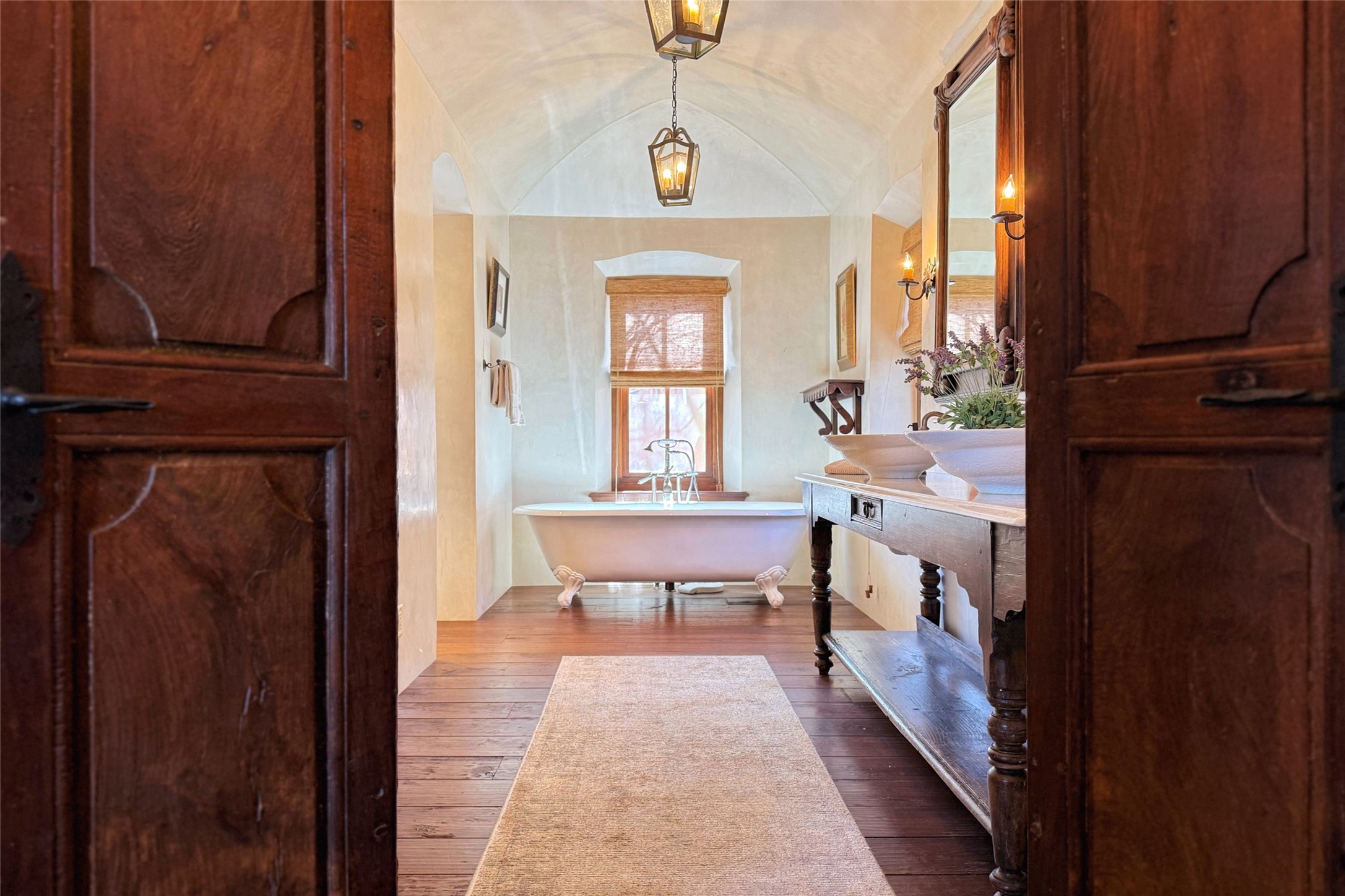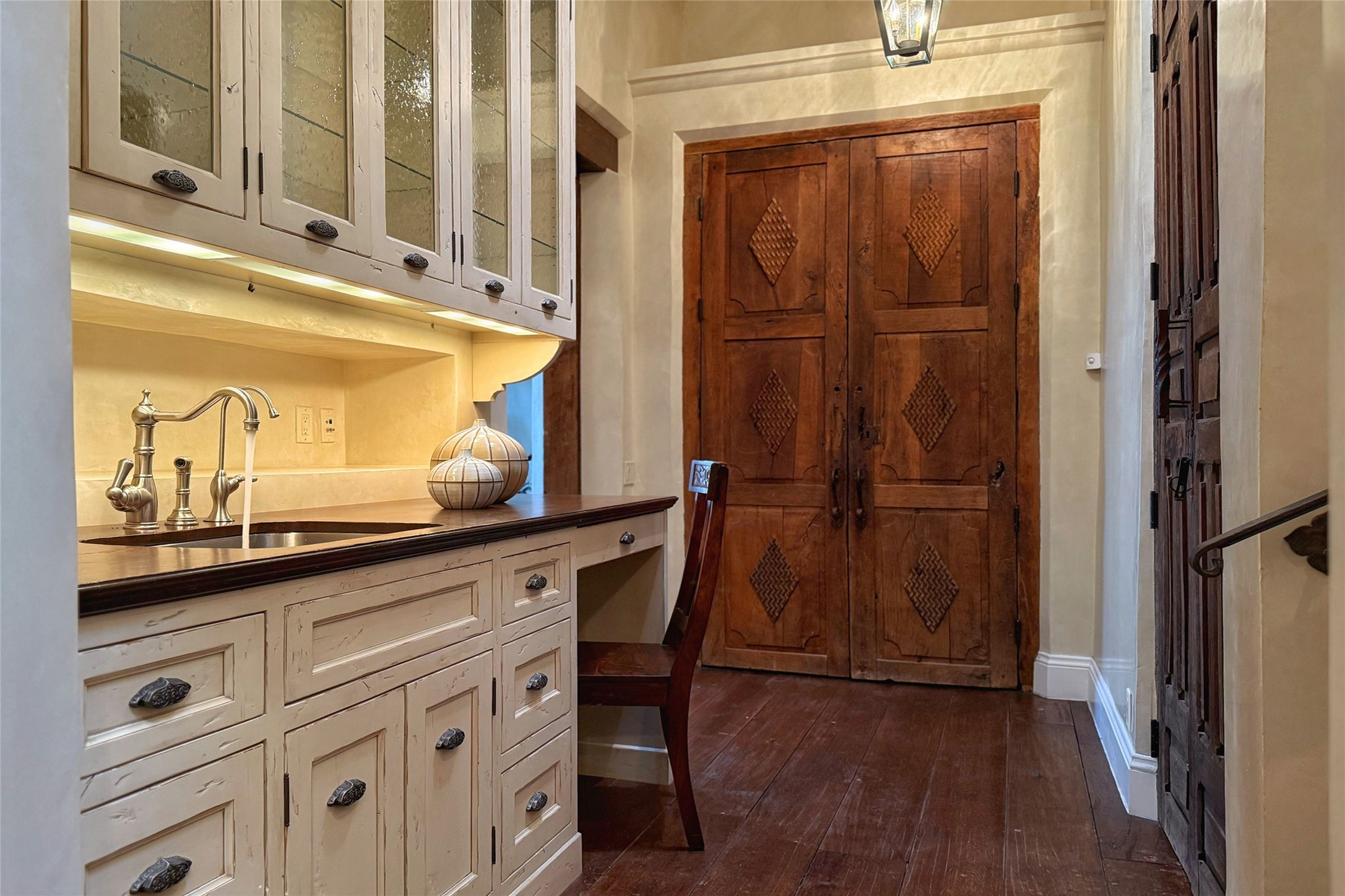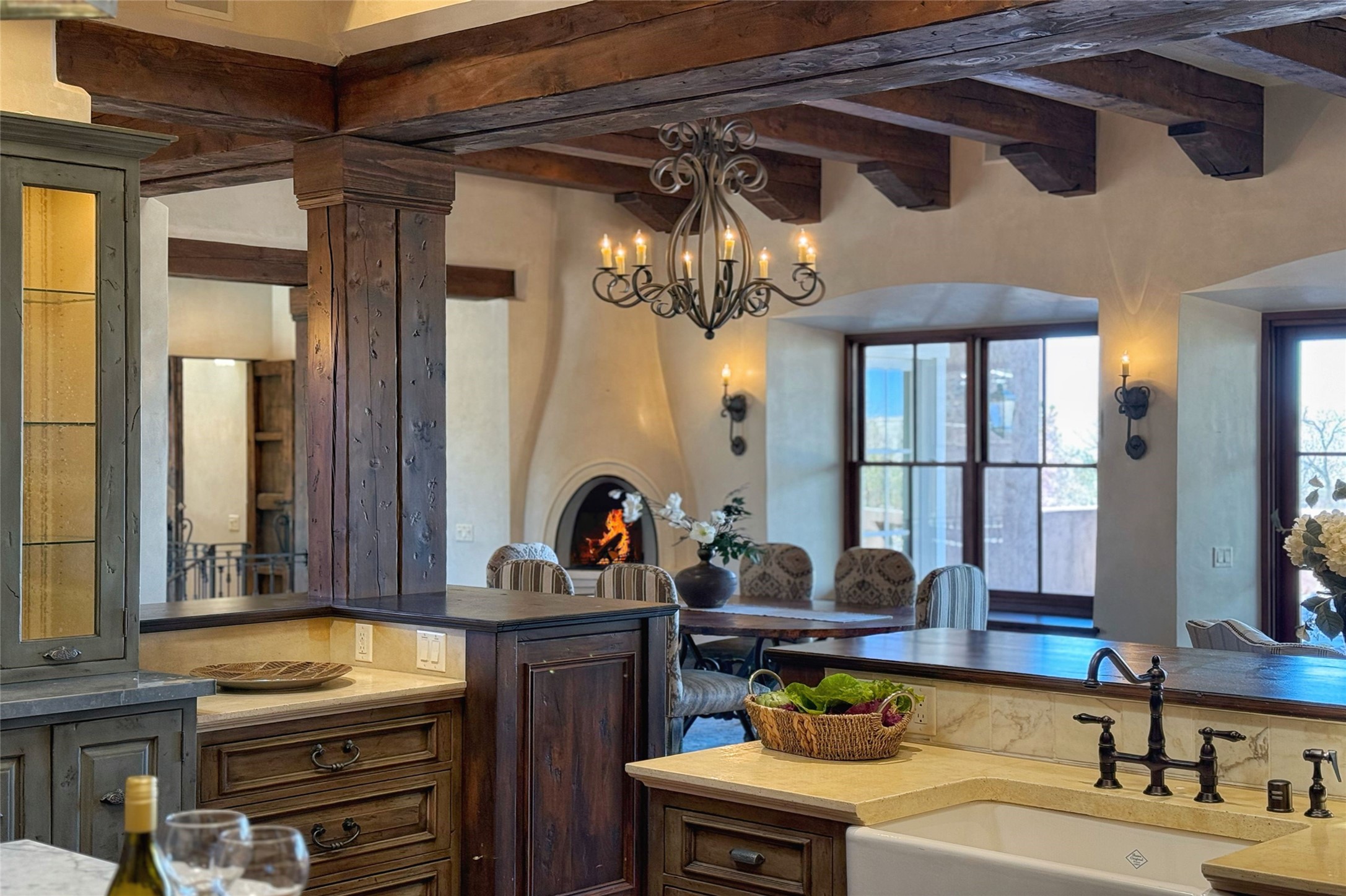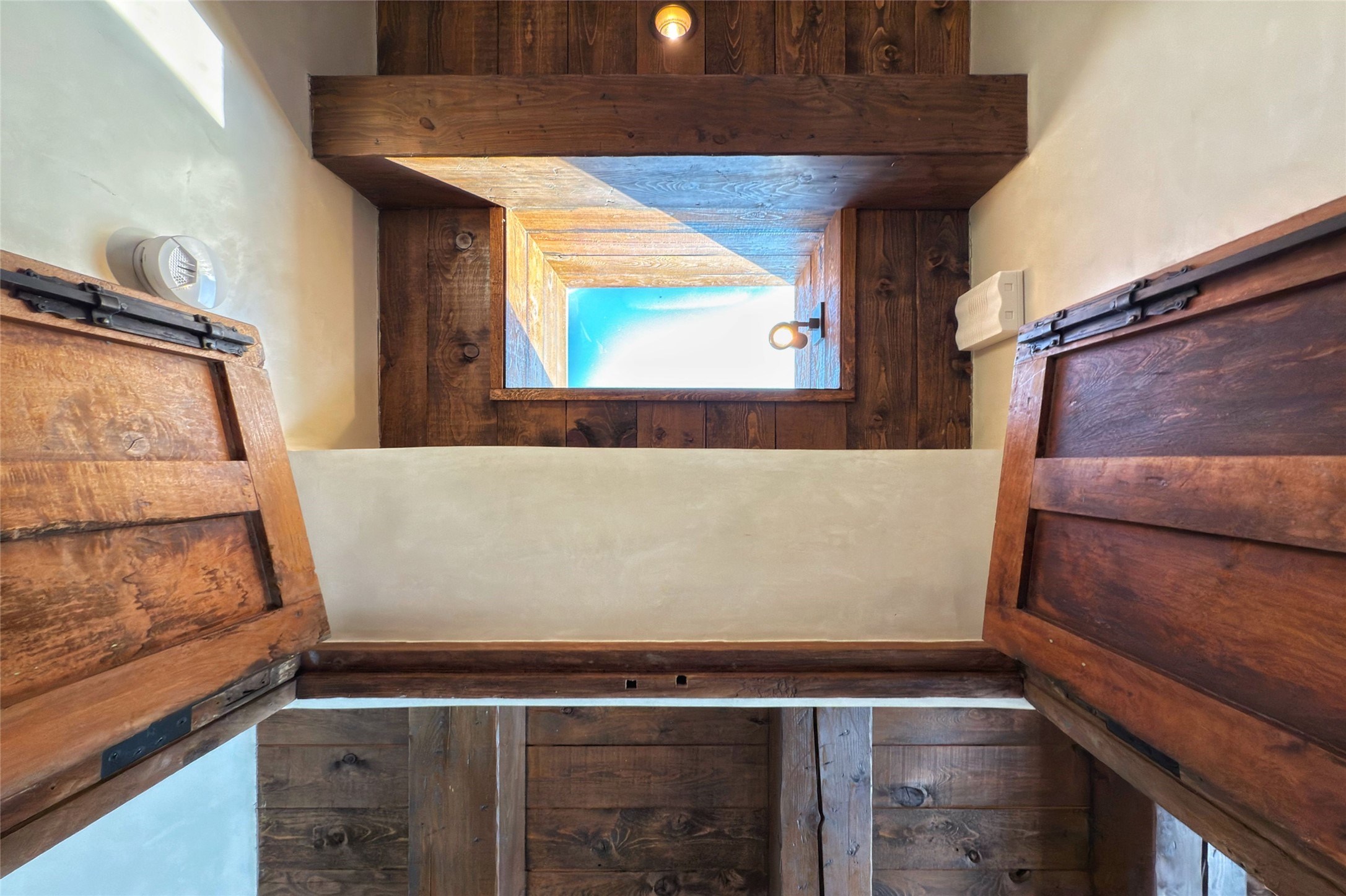 This is a rare opportunity to own a custom-built home in the heart of Santa Fe's cherished Historic Eastside. This elegant territorial-style residence offers sweeping views of the Jemez Mountains' breathtaking sunsets and is perfectly positioned just a short stroll from the famed Canyon Road. Built in 2008, this home features high-insulation pumice-crete construction that beautifully replicates the look and feel of traditional stacked adobe. Every element of the home reflects an unwavering commitment to quality and meticulous attention to detail. The home's three bedrooms, each with its own ensuite bath, provide a harmonious balance of privacy and comfort. In addition, there is an office with a private entrance. The main living areas are conveniently located on one floor, while the lower level is dedicated to guest quarters and a media room. Distressed floors offer a rich, inviting foundation, while handcrafted reclaimed wood doors and intricately carved posts, beams, and corbels evoke the timeless beauty of the territorial style. At the heart of the home lies a gourmet kitchen outfitted with Wolf and Sub-Zero appliances, a butler's pantry, and a wet bar. A private courtyard provides a serene entry, while the expansive wrap-around rear portal framed by a wall of windows, offers an unparalleled vantage point for taking in the majestic mountain vistas with a landscaped garden and fire pit with seating.