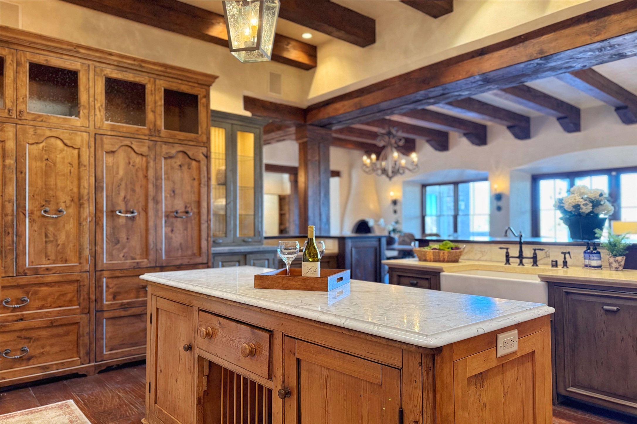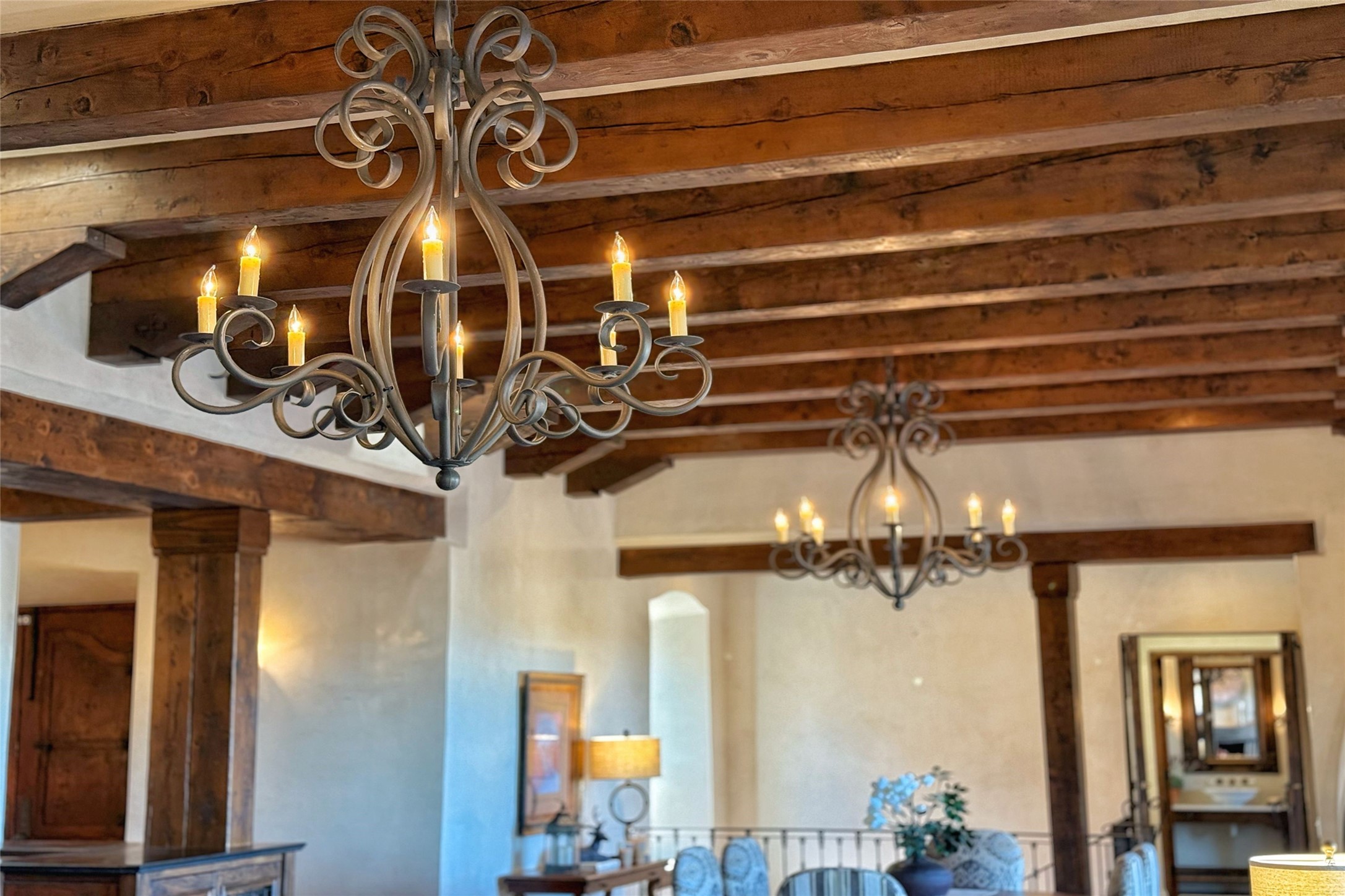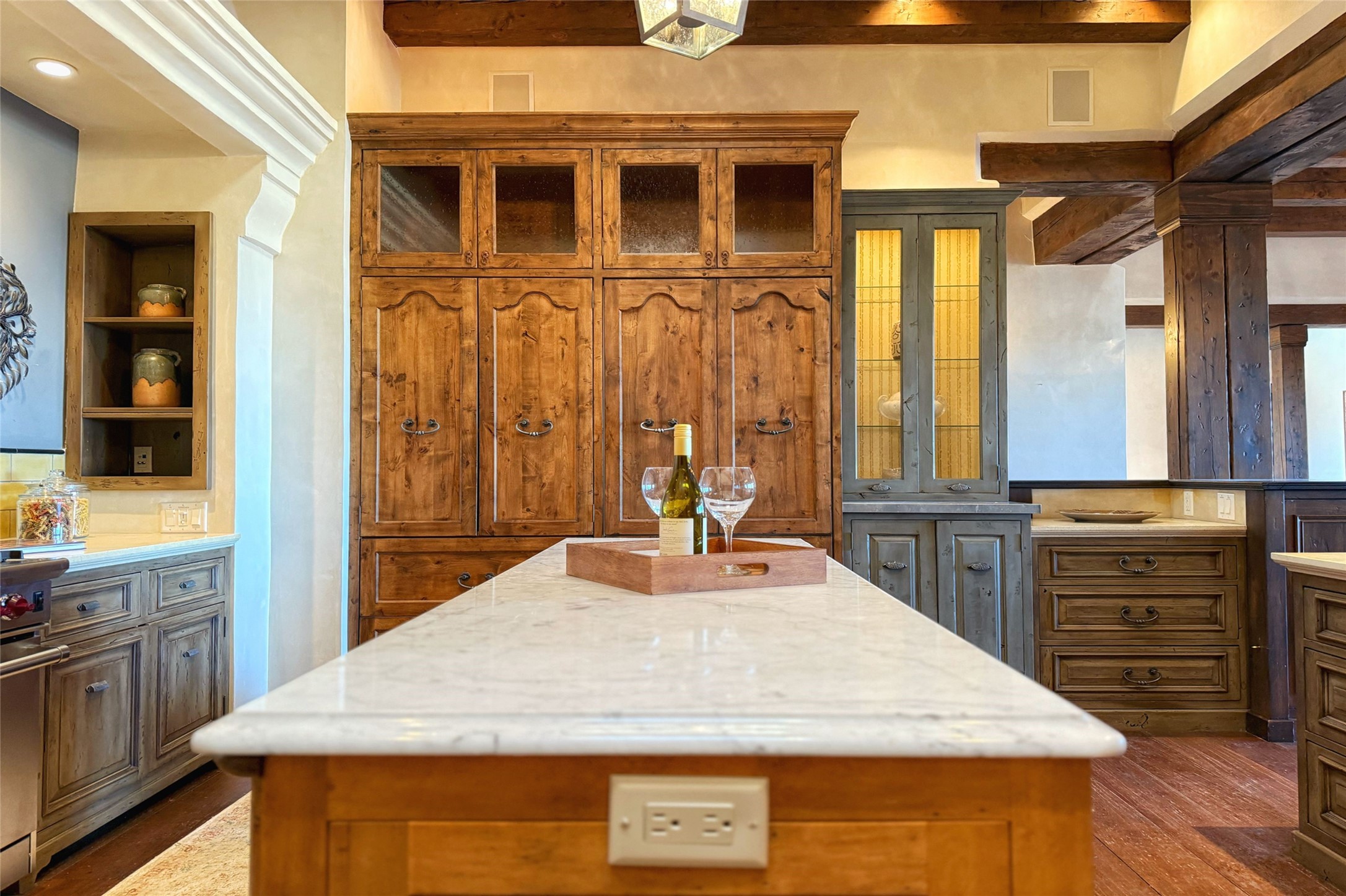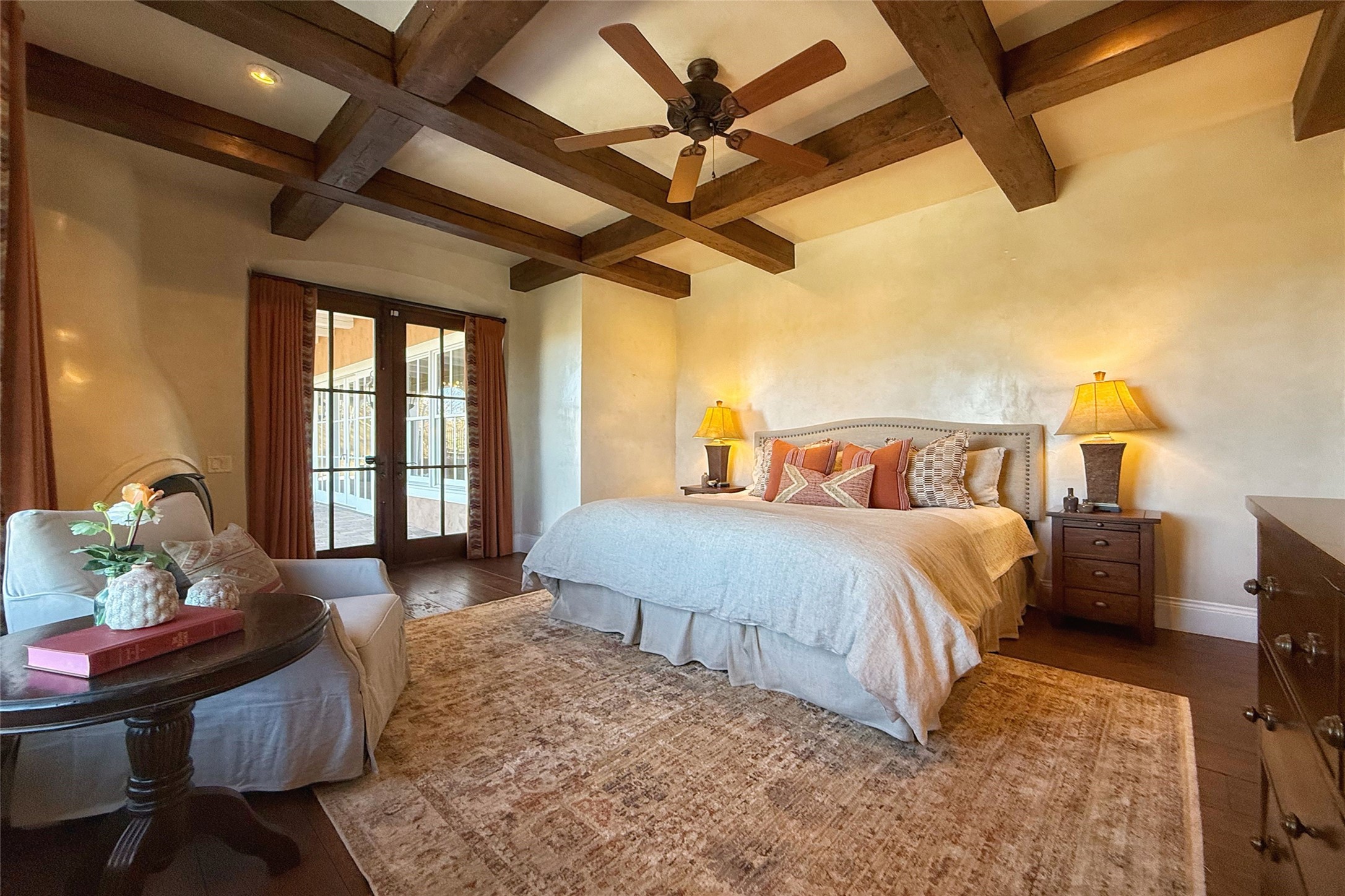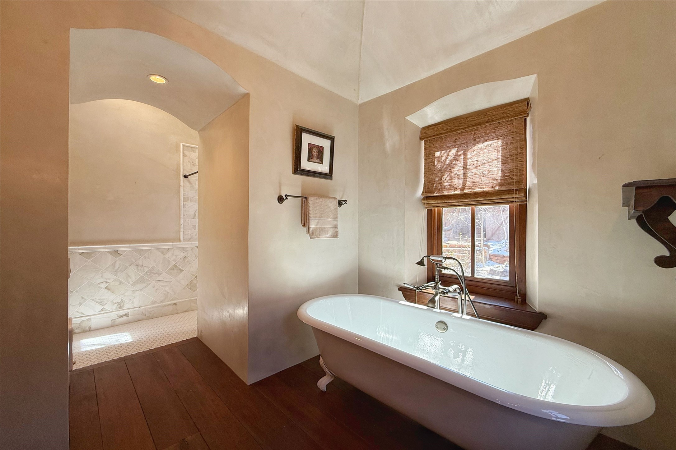 This is a rare opportunity to own a custom-built home in the heart of Santa Fe's cherished Historic Eastside. This elegant territorial-style residence offers sweeping views of the Jemez Mountains' breathtaking sunsets and is perfectly positioned just a short stroll from the famed Canyon Road. Built in 2008, this home features high-insulation pumice-crete construction that beautifully replicates the look and feel of traditional stacked adobe. Every element of the home reflects an unwavering commitment to quality and meticulous attention to detail. The home's three bedrooms, each with its own ensuite bath, provide a harmonious balance of privacy and comfort. In addition, there is an office with a private entrance. The main living areas are conveniently located on one floor, while the lower level is dedicated to guest quarters and a media room. Distressed floors offer a rich, inviting foundation, while handcrafted reclaimed wood doors and intricately carved posts, beams, and corbels evoke the timeless beauty of the territorial style. At the heart of the home lies a gourmet kitchen outfitted with Wolf and Sub-Zero appliances, a butler's pantry, and a wet bar. A private courtyard provides a serene entry, while the expansive wrap-around rear portal framed by a wall of windows, offers an unparalleled vantage point for taking in the majestic mountain vistas with a landscaped garden and fire pit with seating.