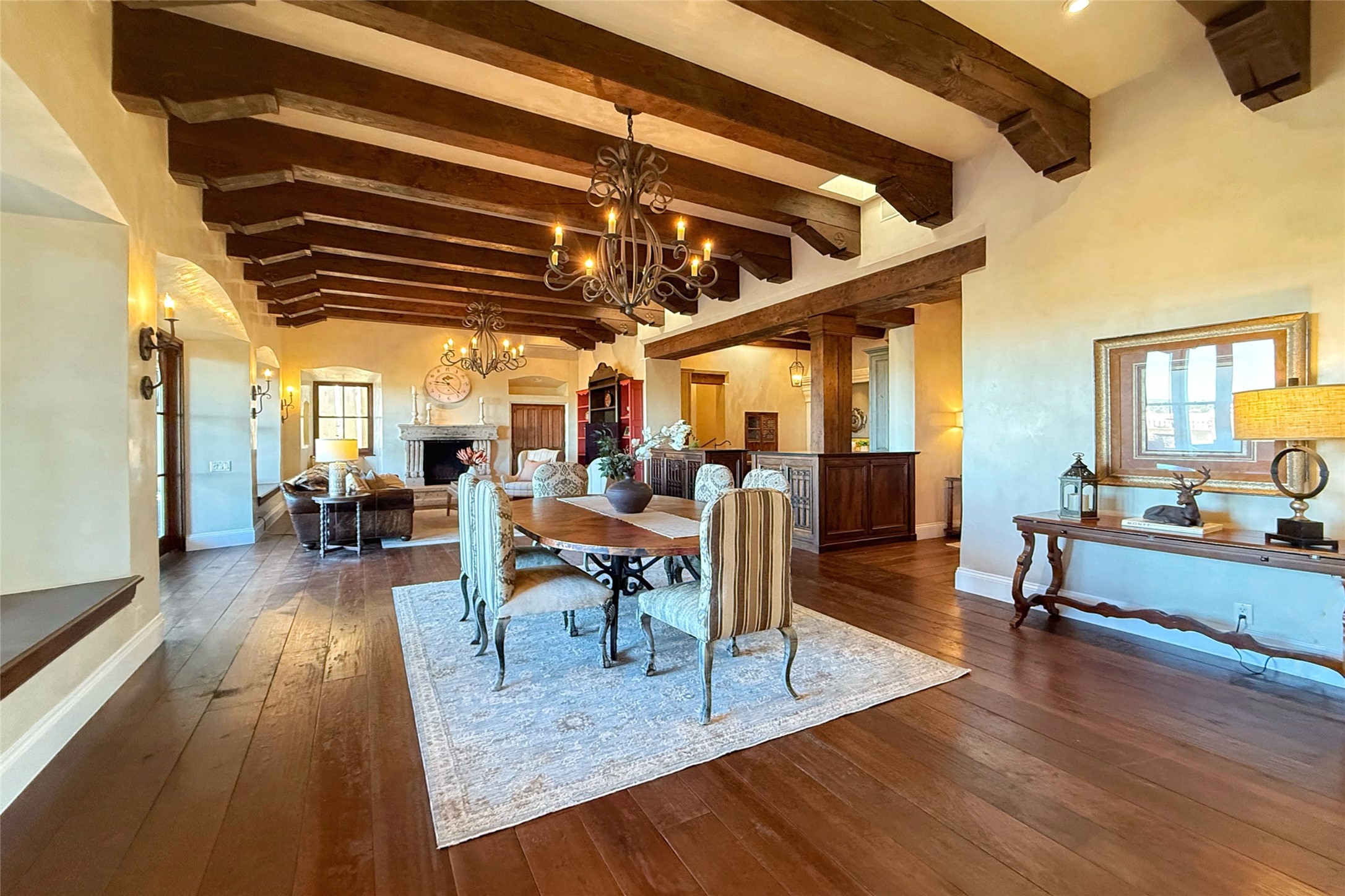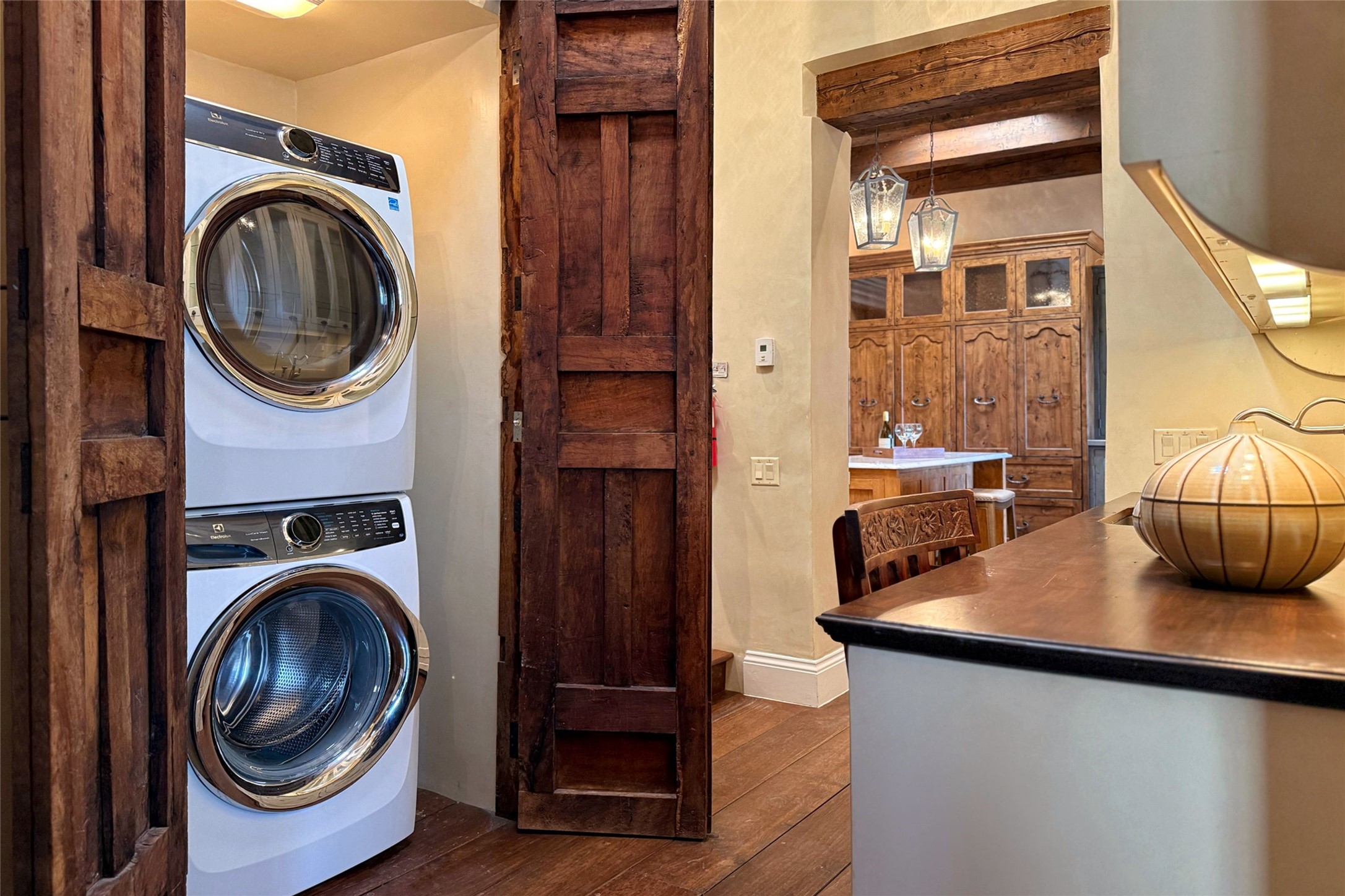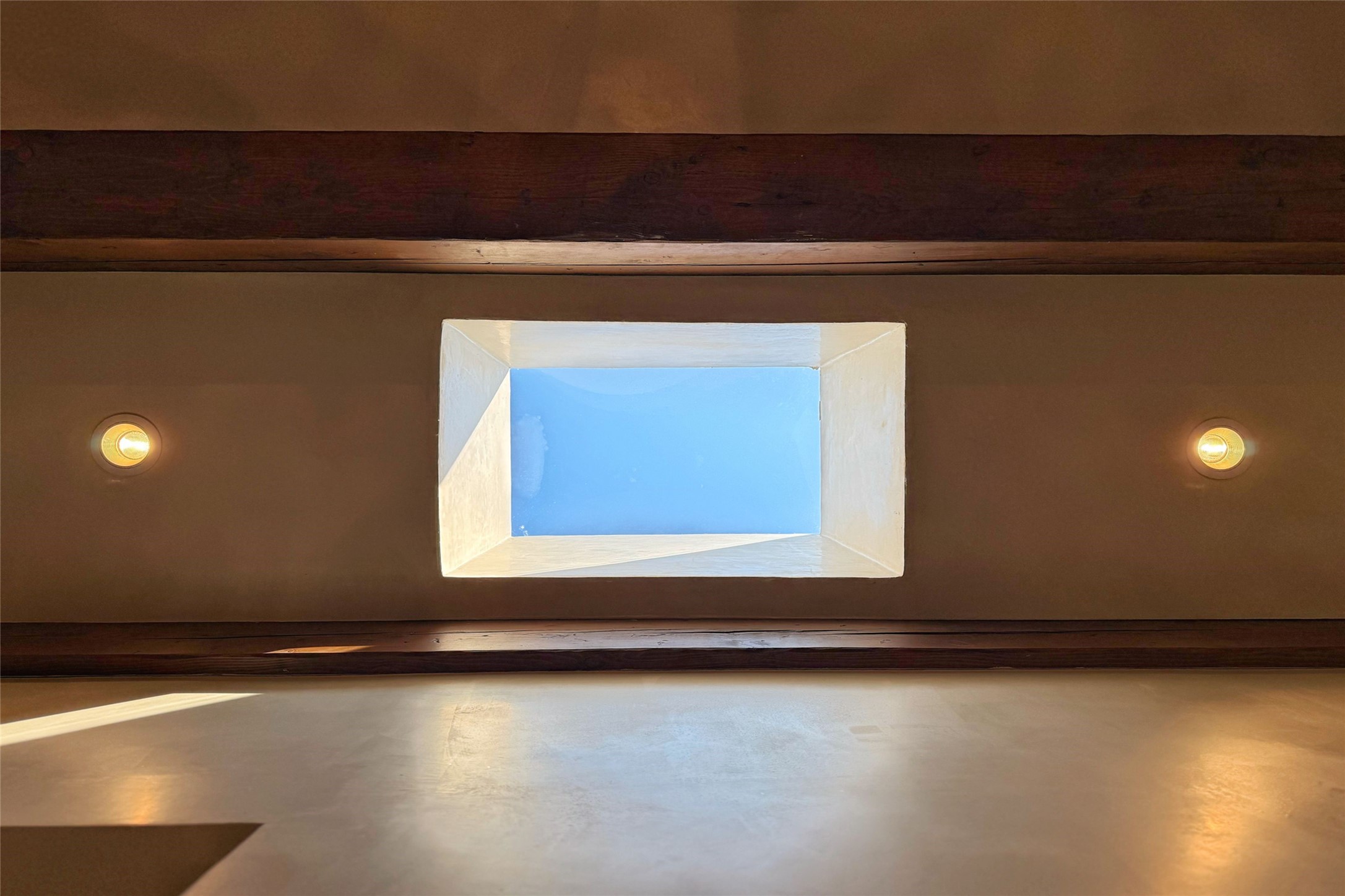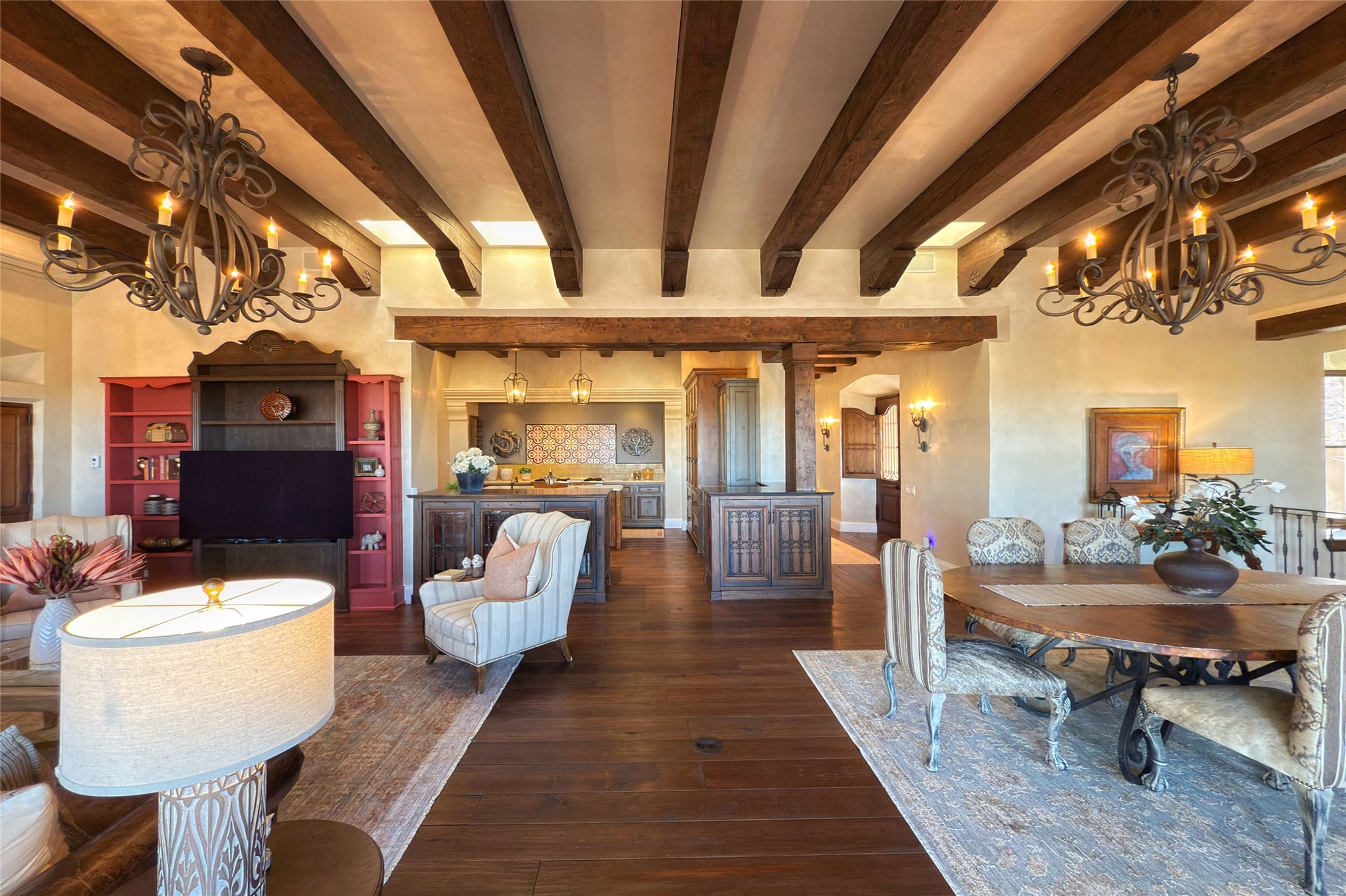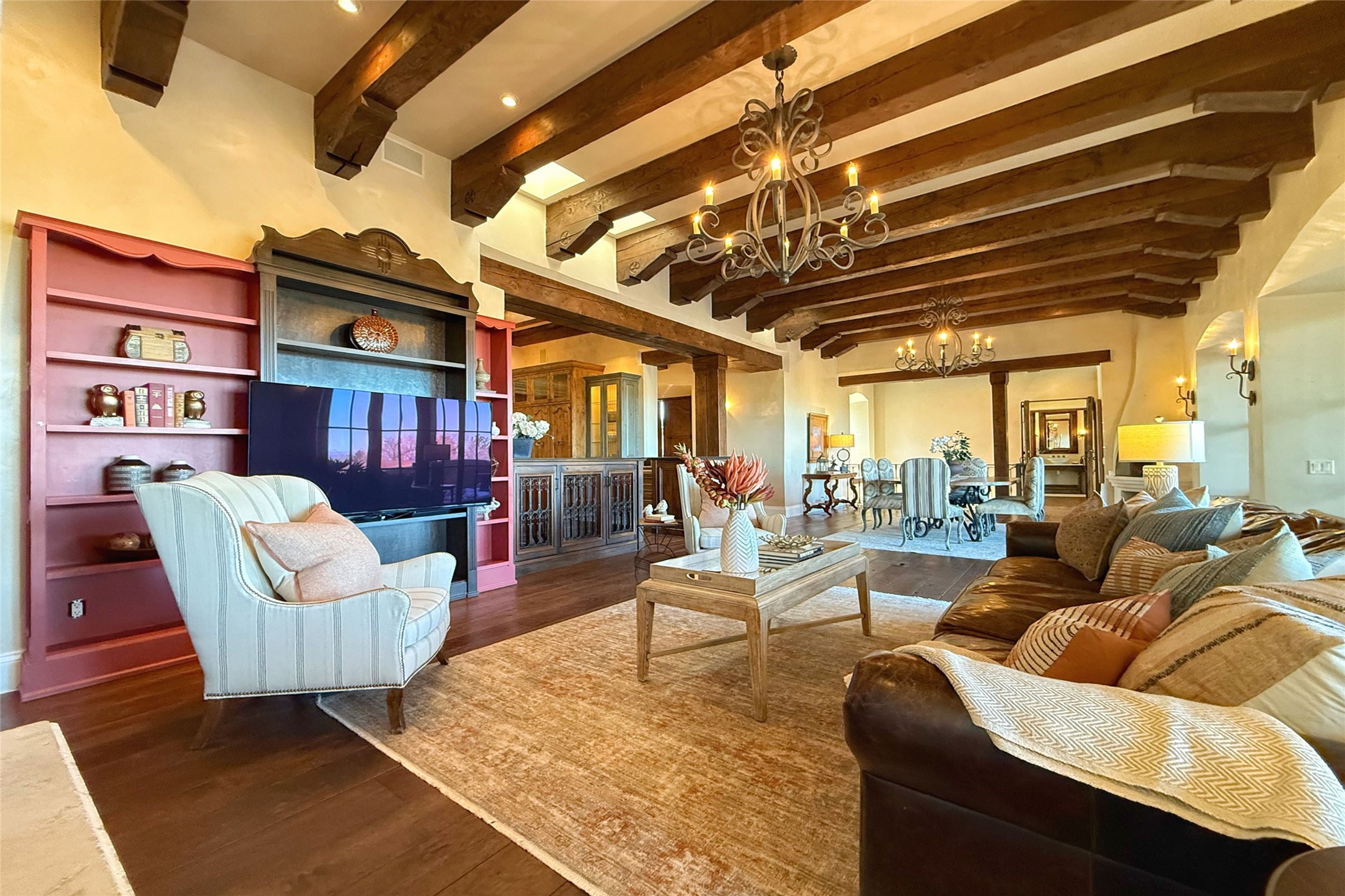 This is a rare opportunity to own a custom-built home in the heart of Santa Fe's cherished Historic Eastside. This elegant territorial-style residence offers sweeping views of the Jemez Mountains' breathtaking sunsets and is perfectly positioned just a short stroll from the famed Canyon Road. Built in 2008, this home features high-insulation pumice-crete construction that beautifully replicates the look and feel of traditional stacked adobe. Every element of the home reflects an unwavering commitment to quality and meticulous attention to detail. The home's three bedrooms, each with its own ensuite bath, provide a harmonious balance of privacy and comfort. In addition, there is an office with a private entrance. The main living areas are conveniently located on one floor, while the lower level is dedicated to guest quarters and a media room. Distressed floors offer a rich, inviting foundation, while handcrafted reclaimed wood doors and intricately carved posts, beams, and corbels evoke the timeless beauty of the territorial style. At the heart of the home lies a gourmet kitchen outfitted with Wolf and Sub-Zero appliances, a butler's pantry, and a wet bar. A private courtyard provides a serene entry, while the expansive wrap-around rear portal framed by a wall of windows, offers an unparalleled vantage point for taking in the majestic mountain vistas with a landscaped garden and fire pit with seating.