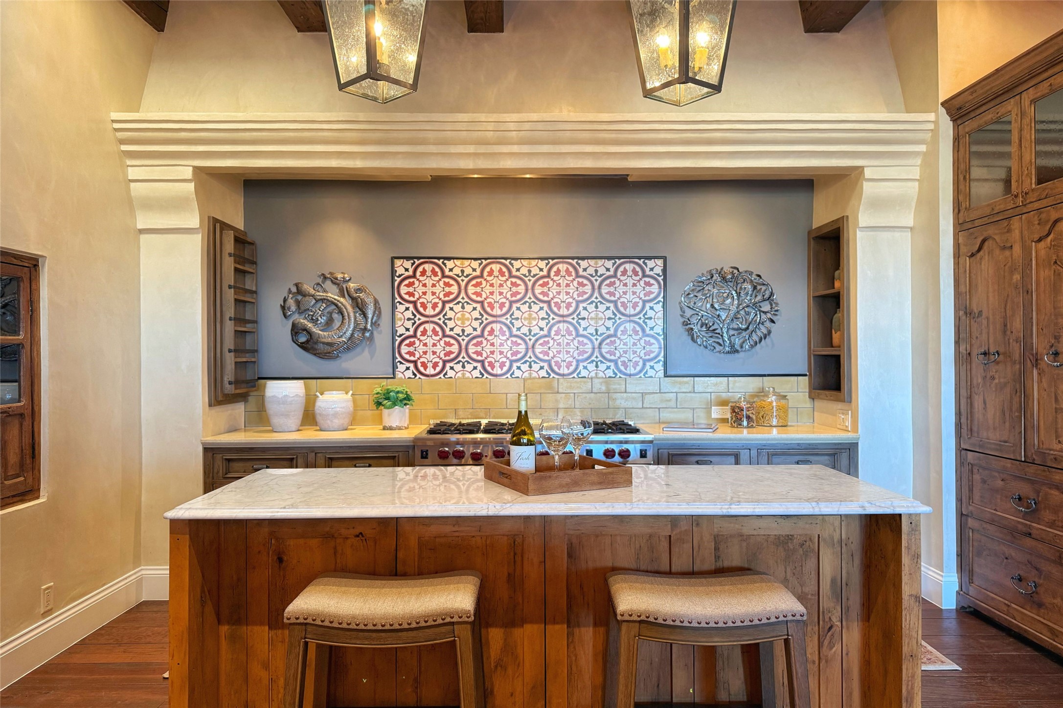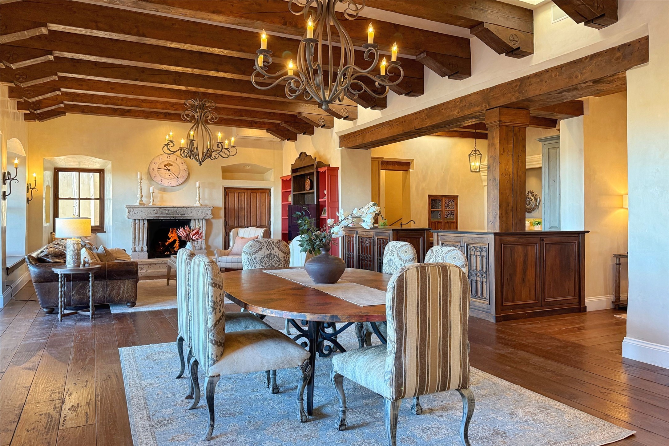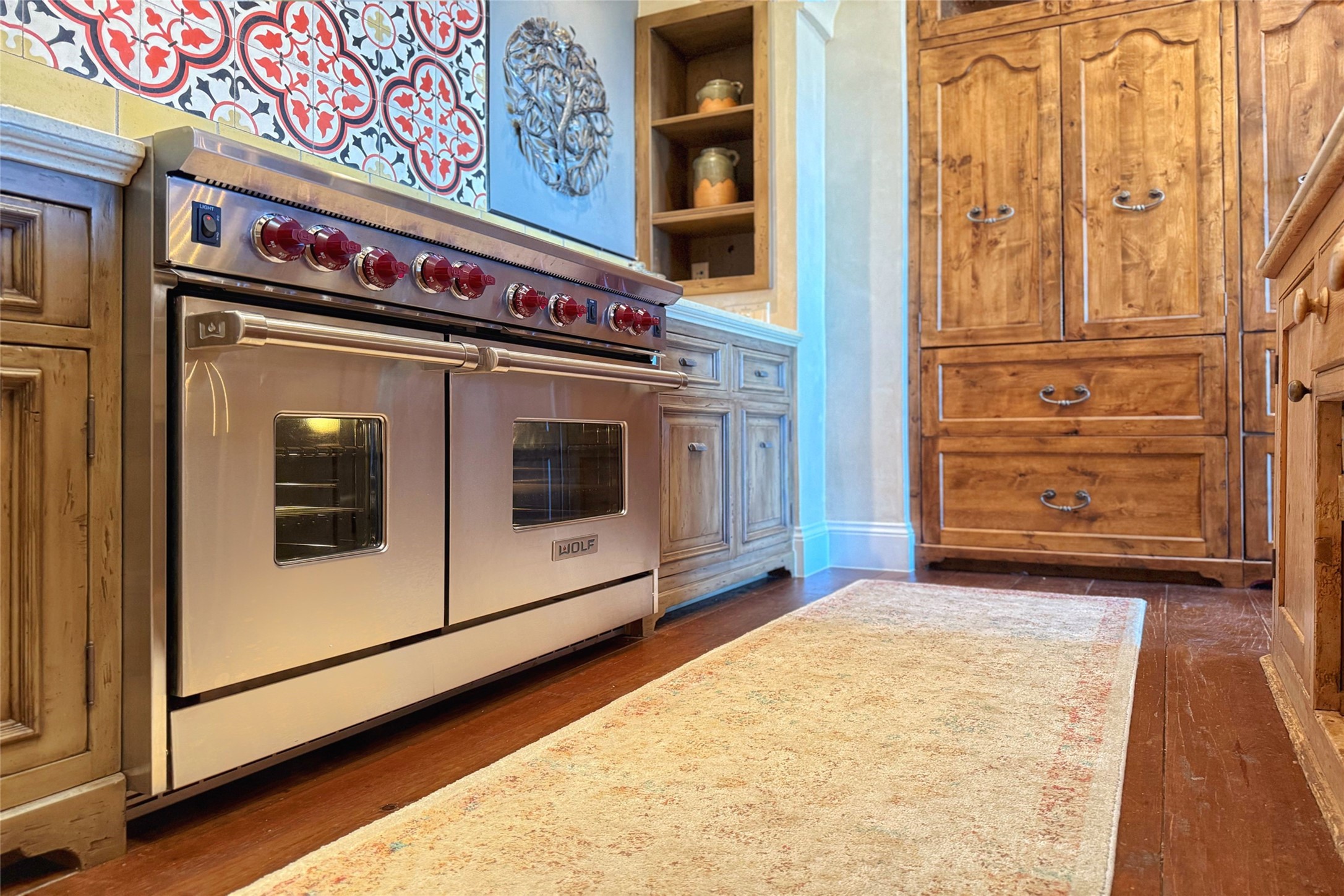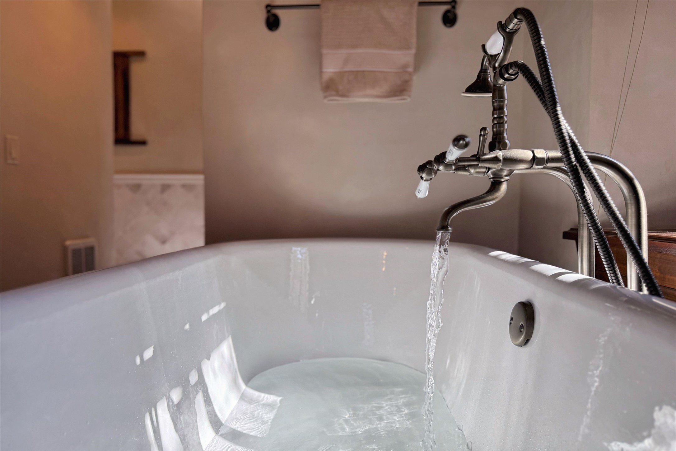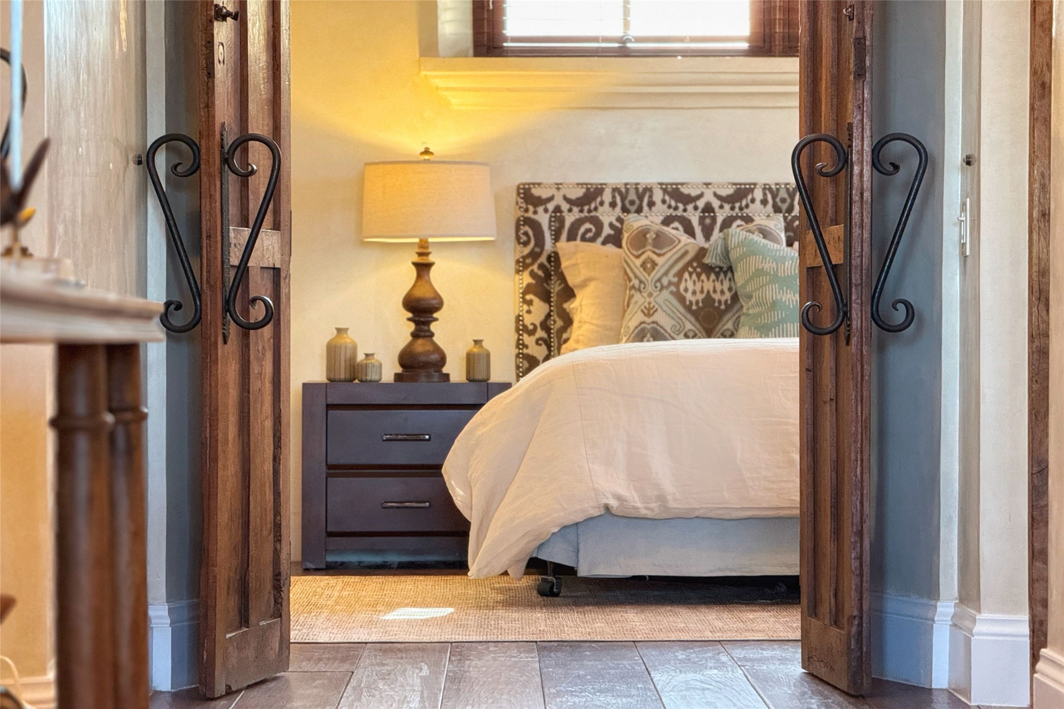 This is a rare opportunity to own a custom-built home in the heart of Santa Fe's cherished Historic Eastside. This elegant territorial-style residence offers sweeping views of the Jemez Mountains' breathtaking sunsets and is perfectly positioned just a short stroll from the famed Canyon Road. Built in 2008, this home features high-insulation pumice-crete construction that beautifully replicates the look and feel of traditional stacked adobe. Every element of the home reflects an unwavering commitment to quality and meticulous attention to detail. The home's three bedrooms, each with its own ensuite bath, provide a harmonious balance of privacy and comfort. In addition, there is an office with a private entrance. The main living areas are conveniently located on one floor, while the lower level is dedicated to guest quarters and a media room. Distressed floors offer a rich, inviting foundation, while handcrafted reclaimed wood doors and intricately carved posts, beams, and corbels evoke the timeless beauty of the territorial style. At the heart of the home lies a gourmet kitchen outfitted with Wolf and Sub-Zero appliances, a butler's pantry, and a wet bar. A private courtyard provides a serene entry, while the expansive wrap-around rear portal framed by a wall of windows, offers an unparalleled vantage point for taking in the majestic mountain vistas with a landscaped garden and fire pit with seating.