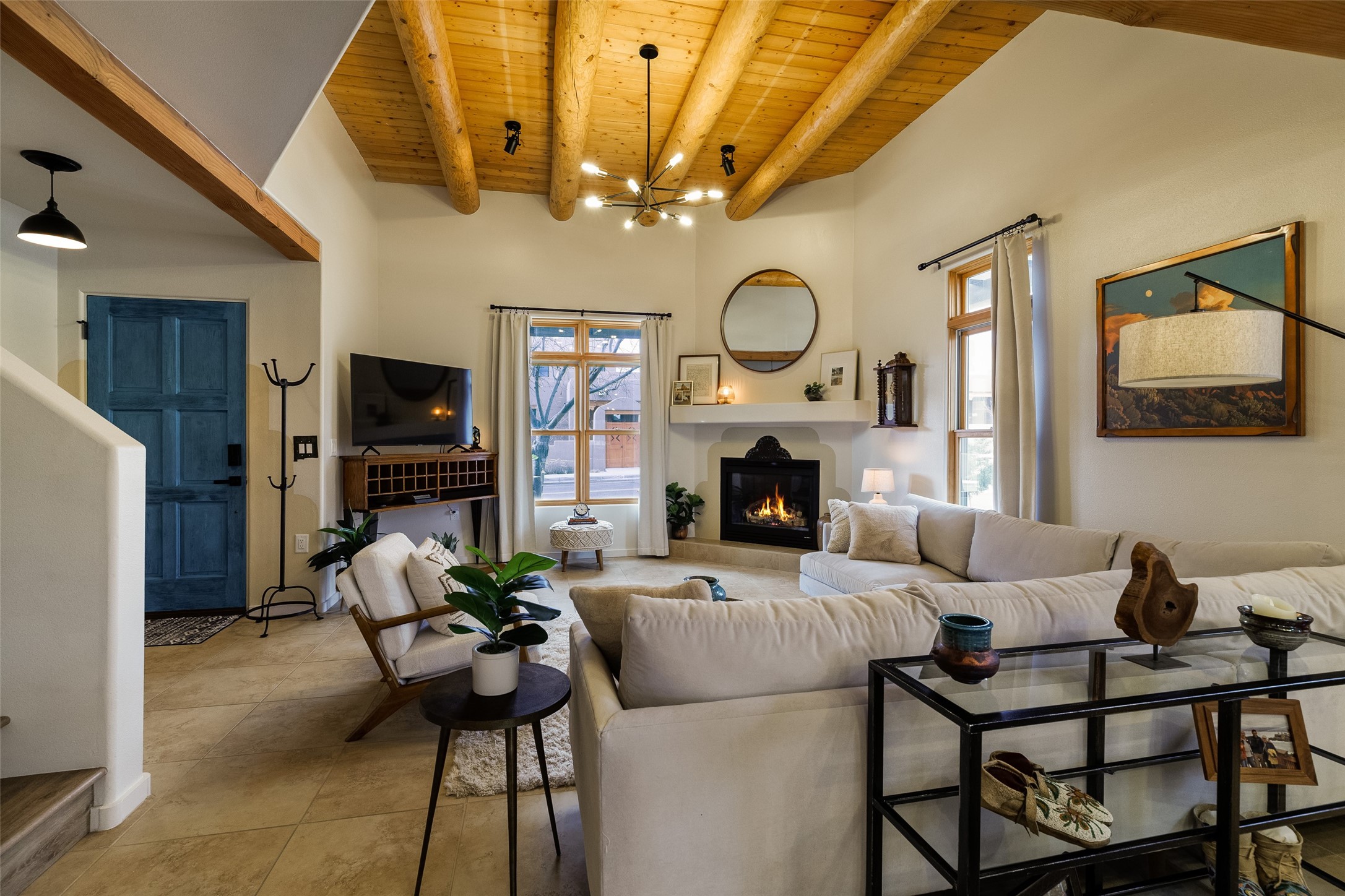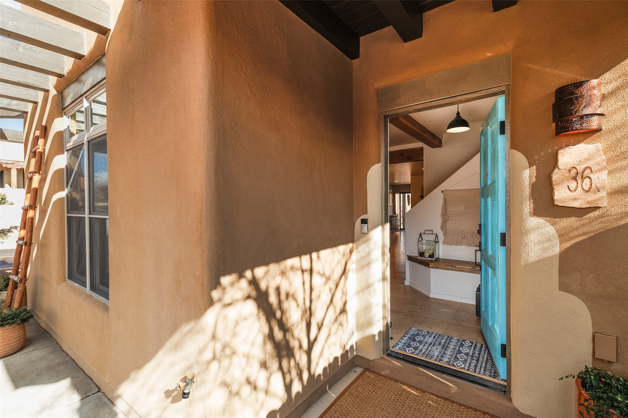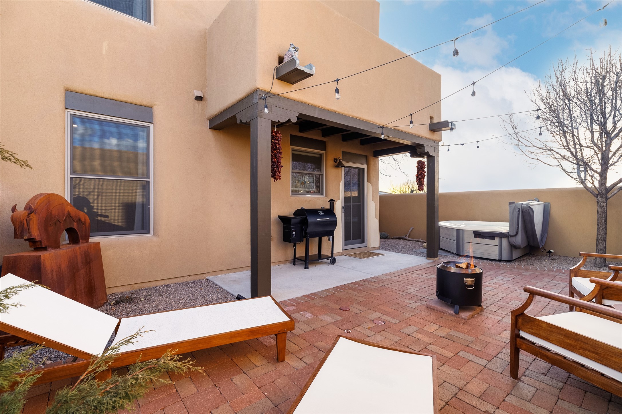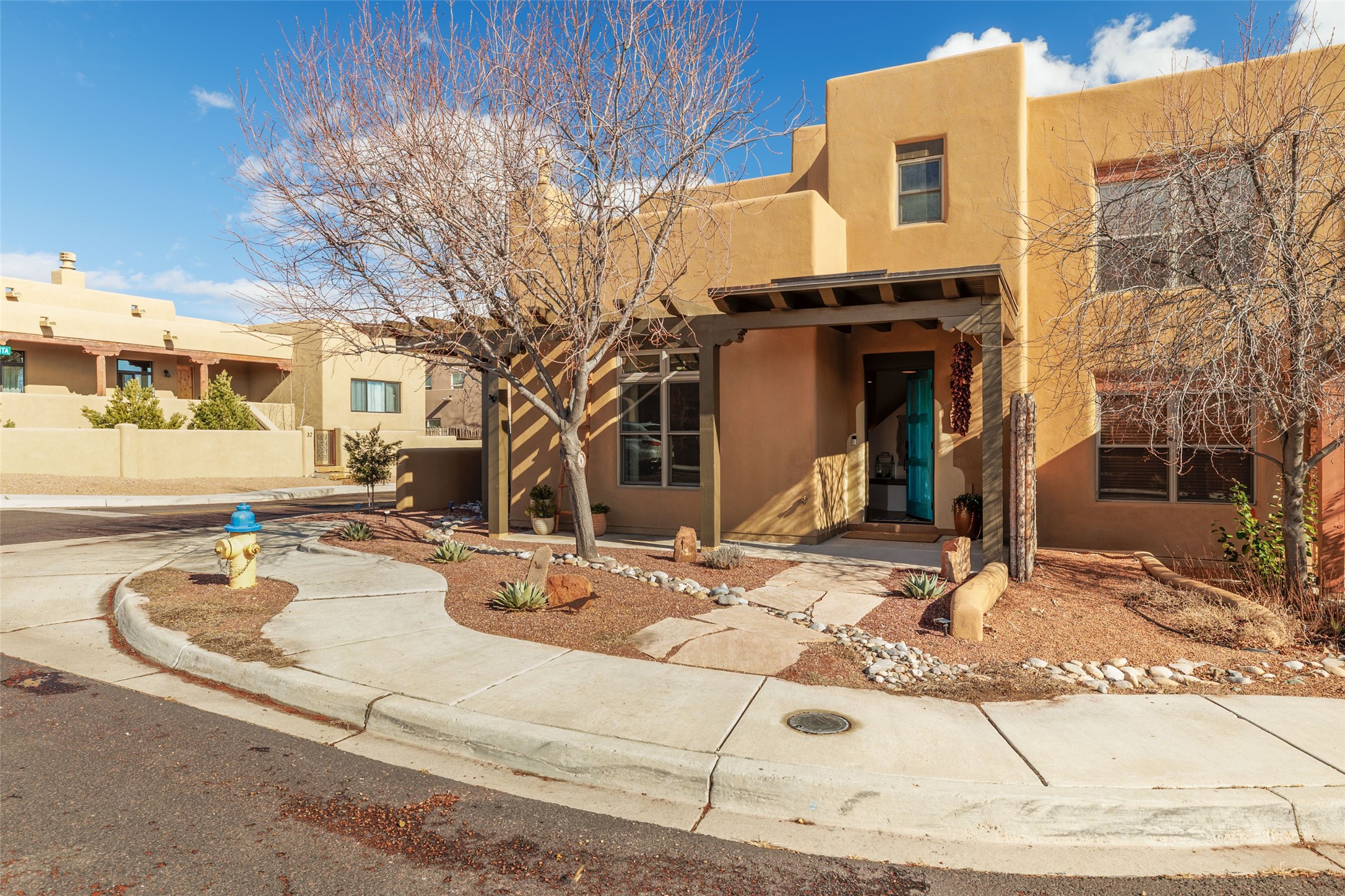 Discover this elegant, light-filled, contemporary-pueblo townhome located in a tranquil neighborhood just 15 minutes from downtown Santa Fe. Situated on a desirable corner lot, this home offers a perfect blend of style, comfort, and convenience. This up-graded property offers custom built-in features in an open floor plan with high ceilings, a spacious living room, a bright and airy dining area, tall windows, a cozy fireplace, and stunning backyard views. The master suite includes a private balcony, custom walk-in closet, and master bath with dual sinks. The well manicured outdoor space boasts mature landscaping, an intimate outdoor hot tub in a picturesque patio area, and a two-car garage for secure parking and storage. Community Amenities include walking trails, fitness room, clubhouse, and peaceful surroundings.