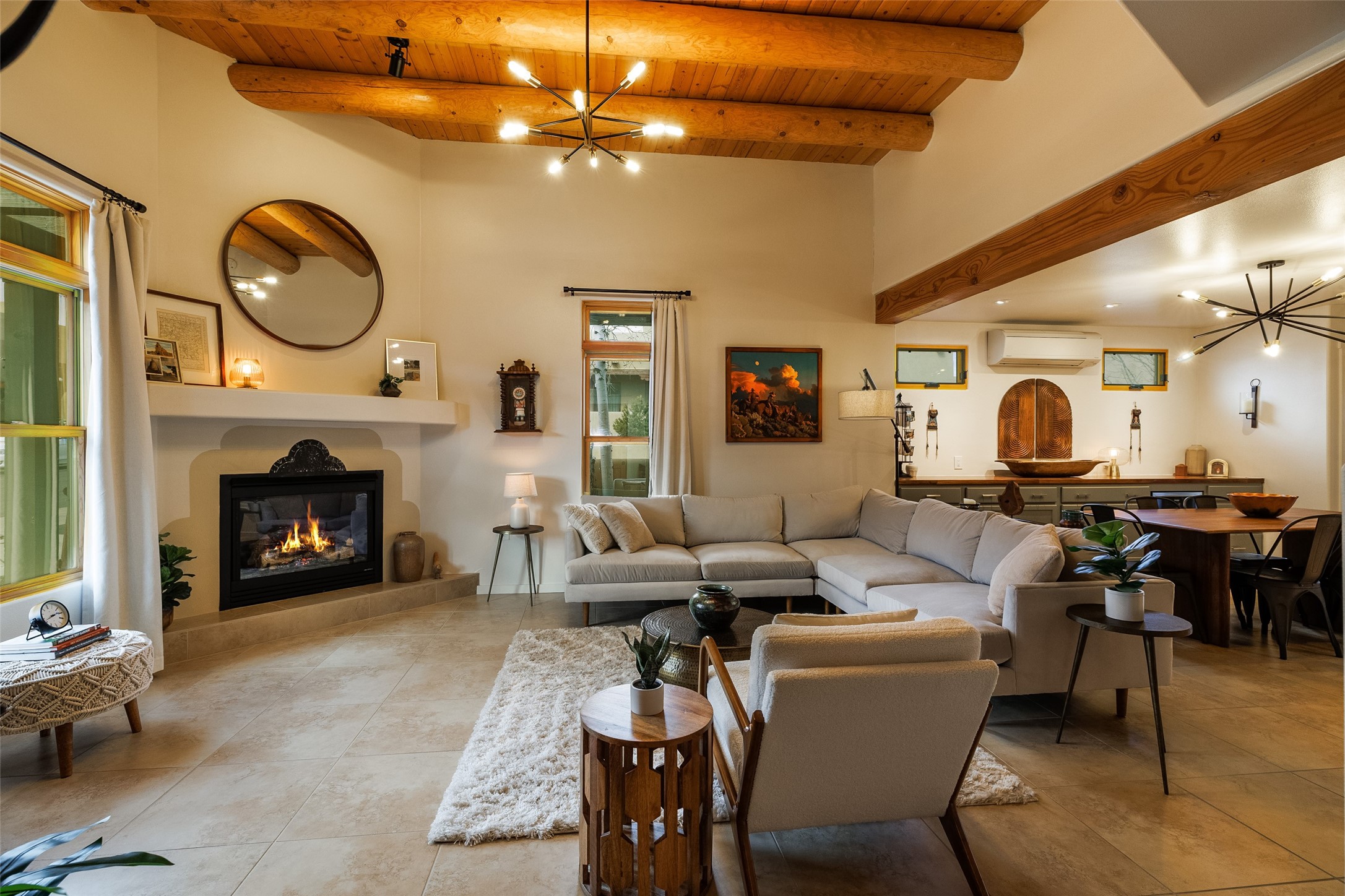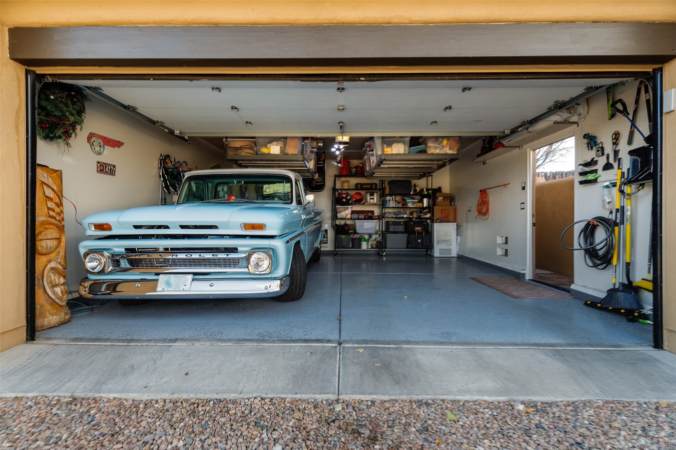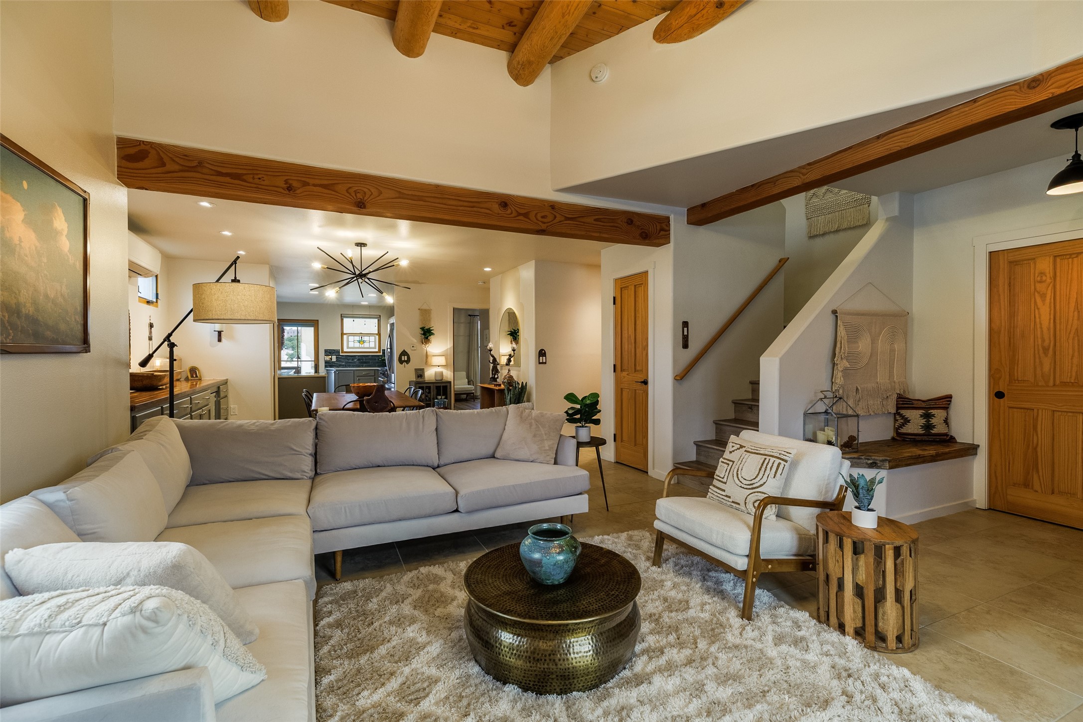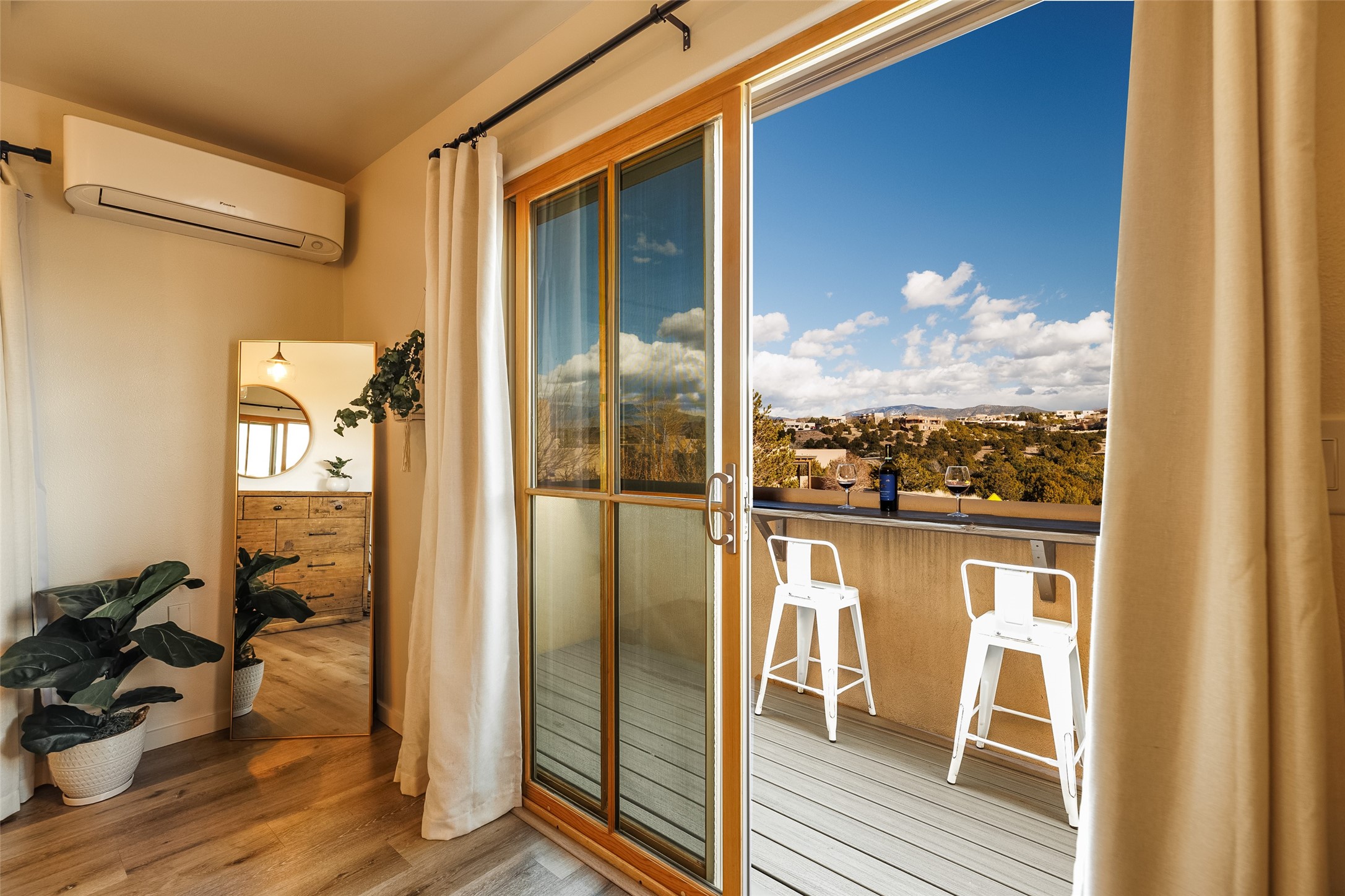Discover this elegant, light-filled, contemporary-pueblo townhome located in a tranquil neighborhood just 15 minutes from downtown Santa Fe. Situated on a desirable corner lot, this home offers a perfect blend of style, comfort, and convenience. This up-graded property offers custom built-in features in an open floor plan with high ceilings, a spacious living room, a bright and airy dining area, tall windows, a cozy fireplace, and stunning backyard views. The master suite includes a private balcony, custom walk-in closet, and master bath with dual sinks. The well manicured outdoor space boasts mature landscaping, an intimate outdoor hot tub in a picturesque patio area, and a two-car garage for secure parking and storage. Community Amenities include walking trails, fitness room, clubhouse, and peaceful surroundings.