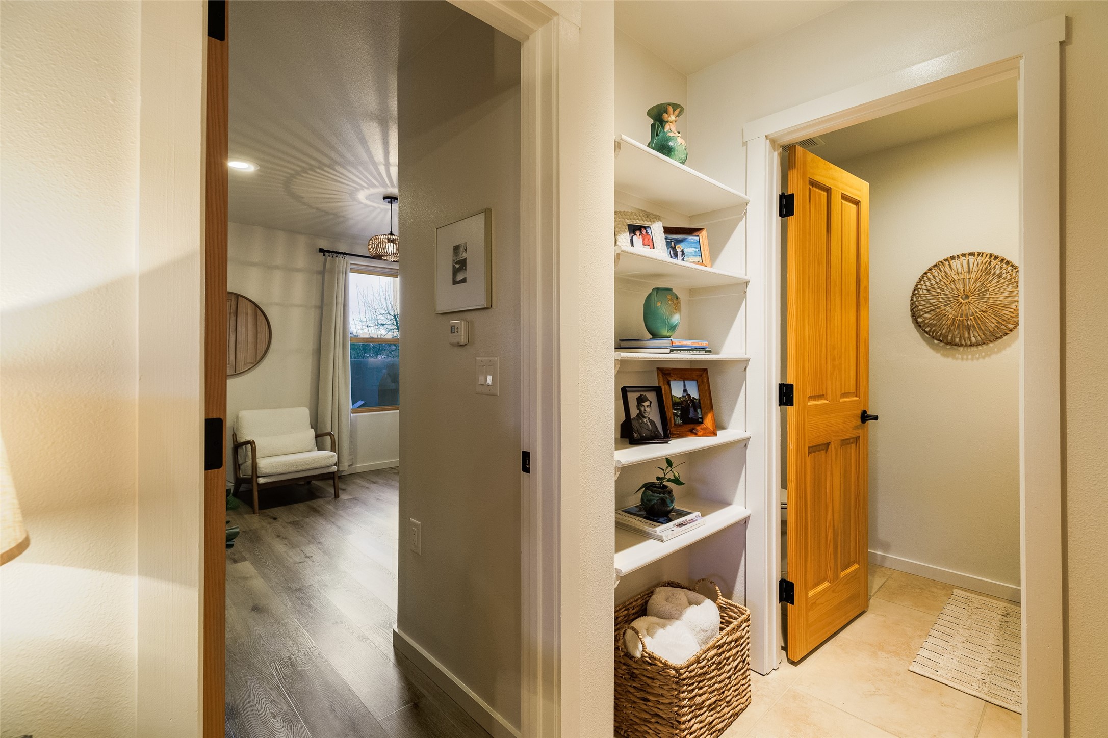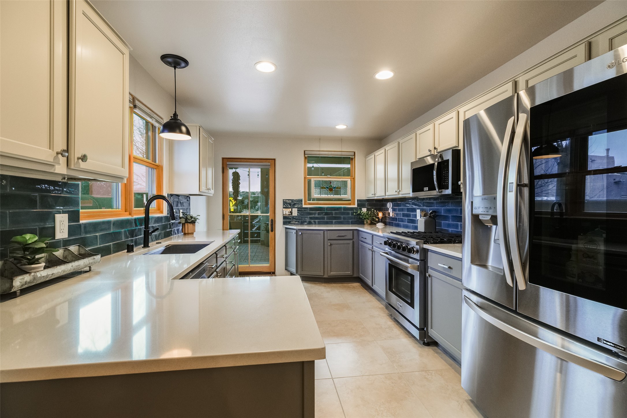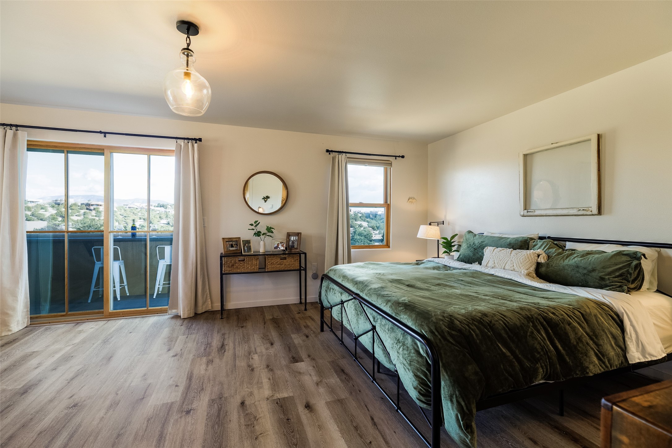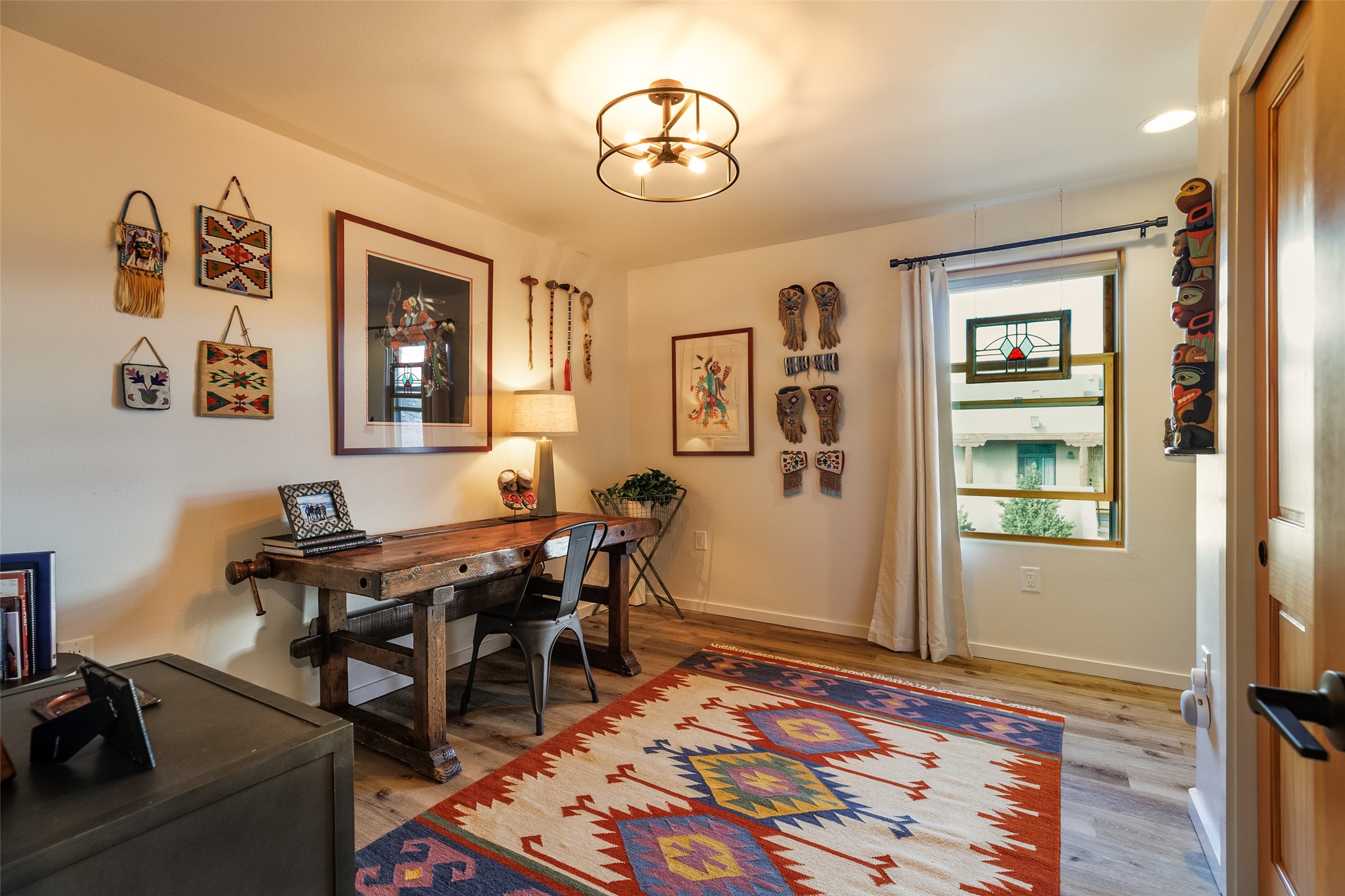 Discover this elegant, light-filled, contemporary-pueblo townhome located in a tranquil neighborhood just 15 minutes from downtown Santa Fe. Situated on a desirable corner lot, this home offers a perfect blend of style, comfort, and convenience. This up-graded property offers custom built-in features in an open floor plan with high ceilings, a spacious living room, a bright and airy dining area, tall windows, a cozy fireplace, and stunning backyard views. The master suite includes a private balcony, custom walk-in closet, and master bath with dual sinks. The well manicured outdoor space boasts mature landscaping, an intimate outdoor hot tub in a picturesque patio area, and a two-car garage for secure parking and storage. Community Amenities include walking trails, fitness room, clubhouse, and peaceful surroundings.