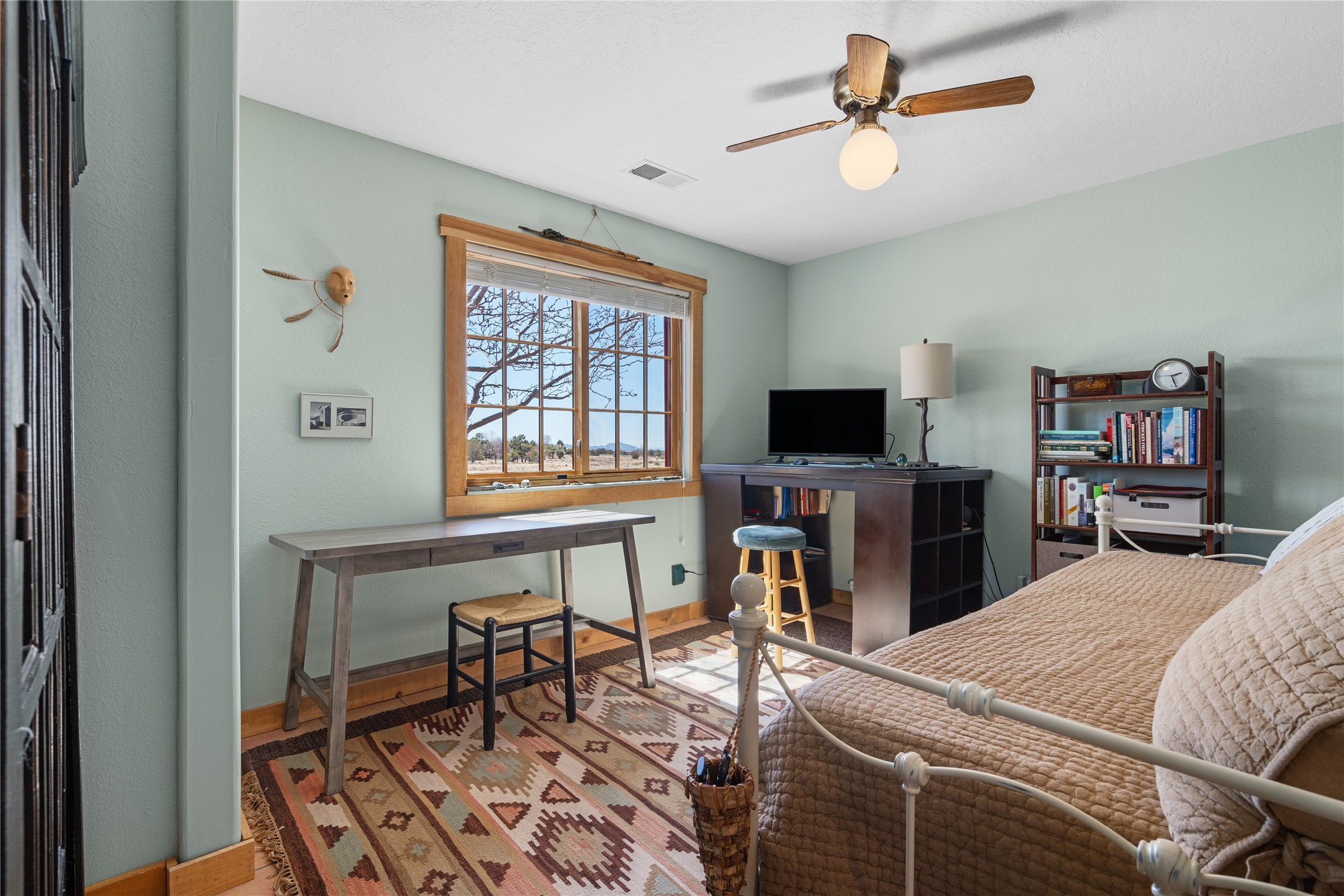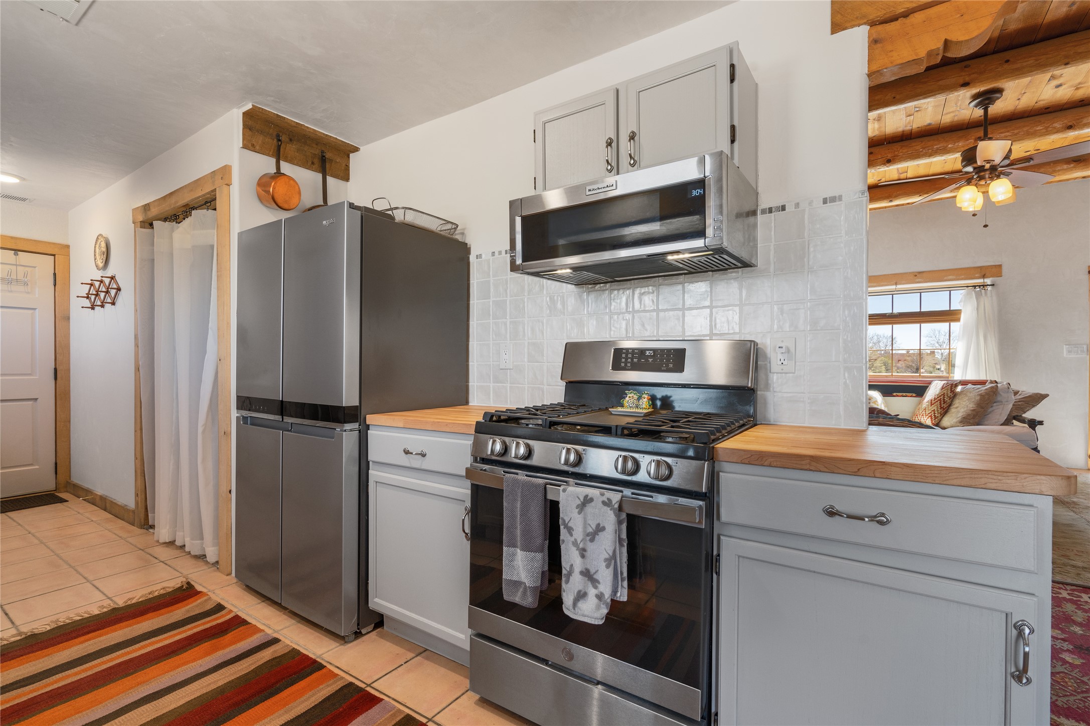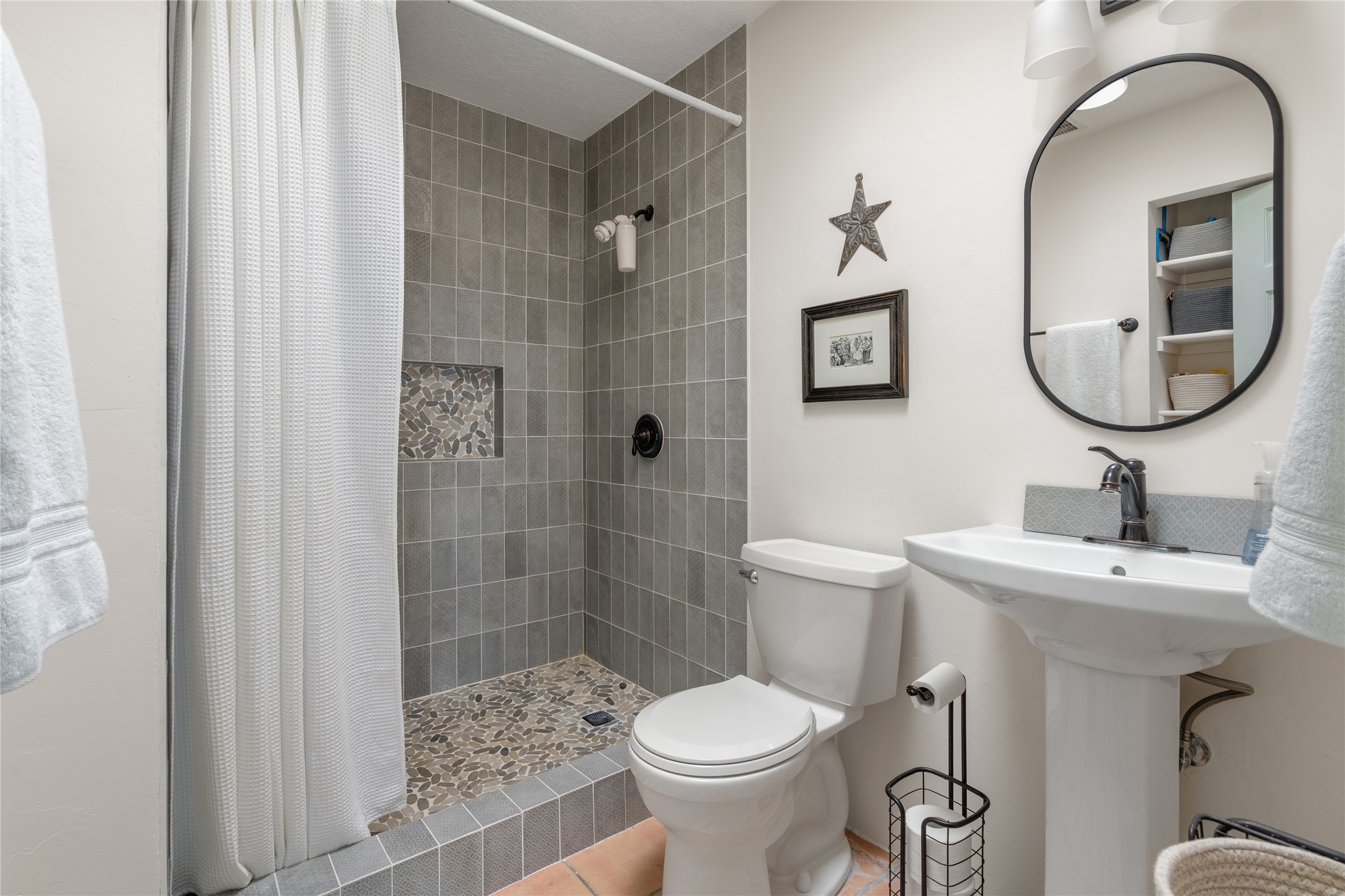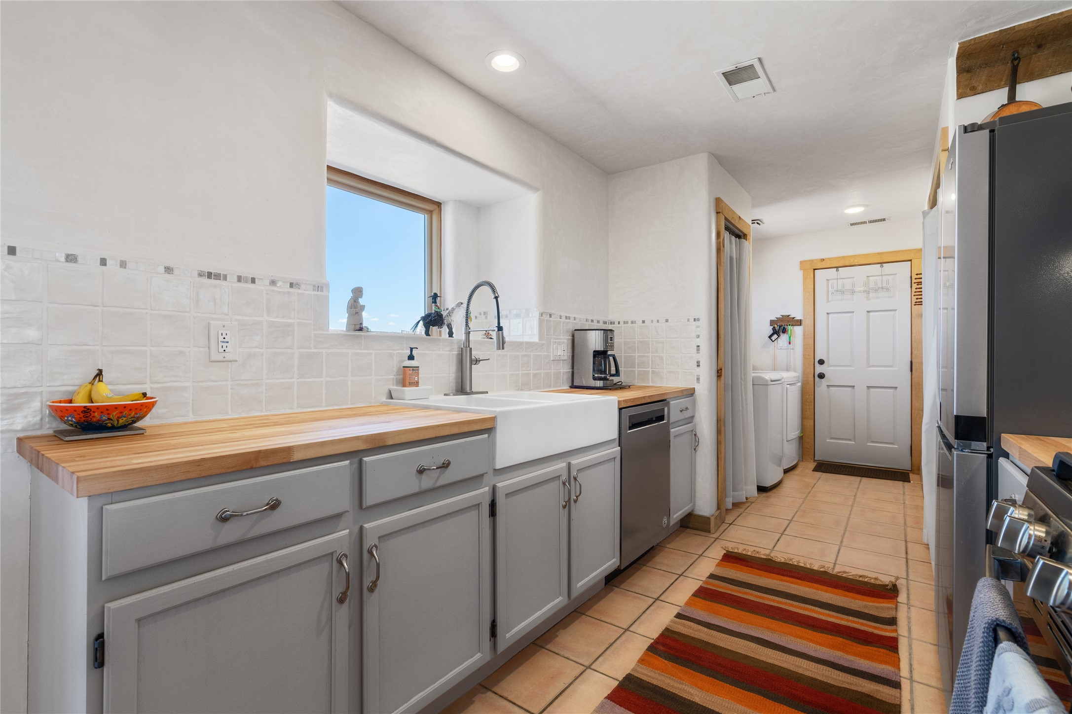 This unique jewel box home at 11 Bosque Loop offers serenity, natural beauty, abundant wildlife, and convenience in one of Santa Fe's most desirable locations. Sited on 1.24 acres on an arroyo green space, the house has been lovingly renovated with design, character, and quality in mind: natural materials and finishes, and hand-crafted traditional features such as high ceiling vigas, door and window lintels, rough sawn beams, corbels, Spanish tile, and diamond plaster walls that reflect abundant sunlight.The split floor plan offers an open living and dining area with views of the Sangre de Christo mountains. The primary suite is separated from the two guest bedrooms. Enjoy year-round comfort from the passive solar siting with forced air heating and air conditioning.The airy kitchen and both full bathrooms have been fully renovated with new Spanish tile, fixtures, and appliances.Step outside and savor the big skies, abundant birdsong, and vibrant landscape. A walled courtyard contains raised garden beds, trees, and plenty of room for your flowering pots. Coyote fencing offers privacy in the backyard.Eldorado community has many amenities. Extensive hike/bike trails, access to the Santa Fe Rail Trail, nearby shopping and service complexes, a gym and day care center, hardware store, cafes and restaurants, and a county library are all within a 5-minute drive.With its gorgeous setting and thoughtful renovation, this turn-key home invites you to experience the best of Santa Fe's relaxing lifestyle, full of beauty and tranquility. Schedule a showing today!