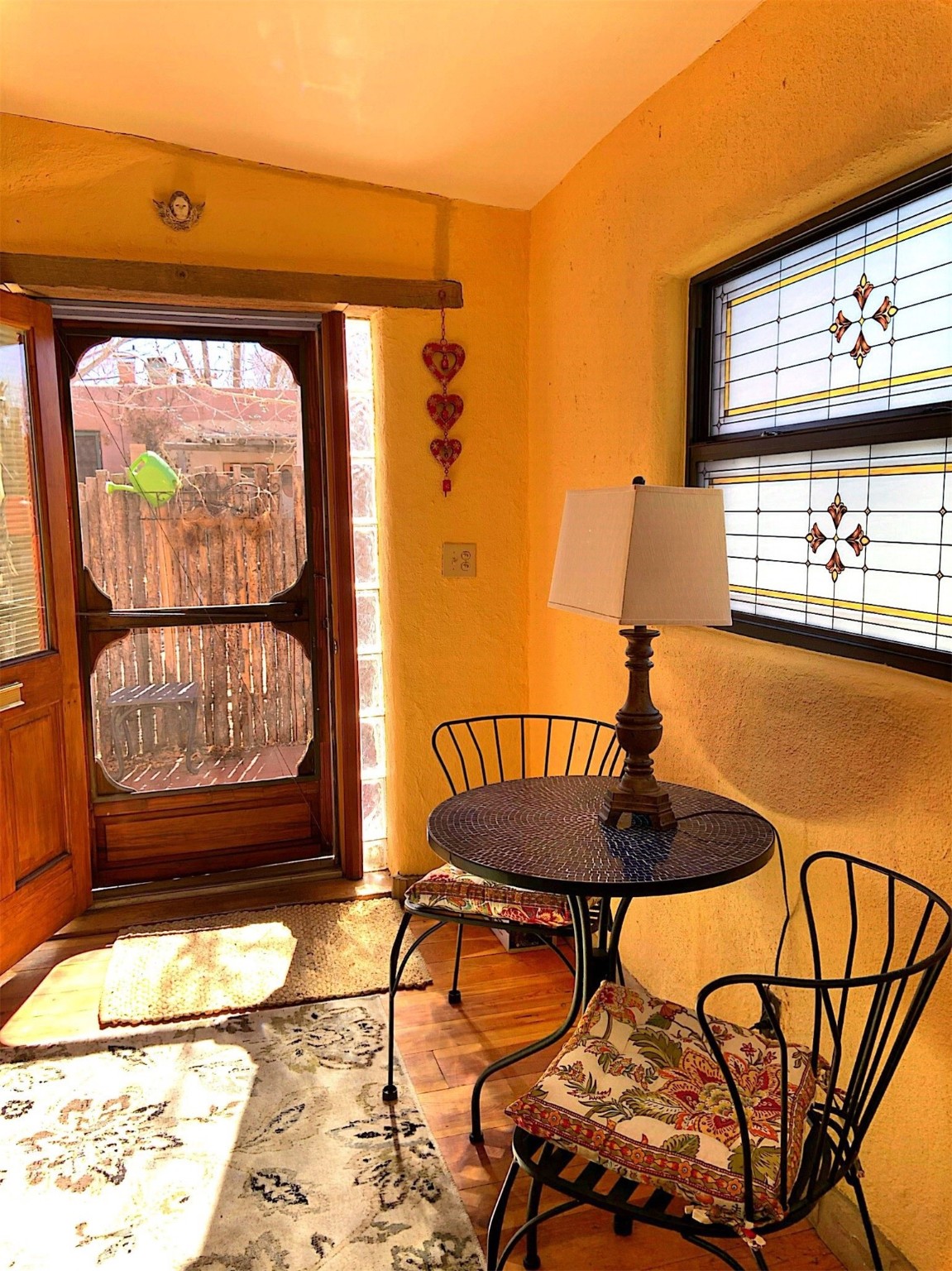 Back on the market - due to rental policy, not fault of sellers, this is your opportunity to own a charming fully furnished pied-a-terre in the gated Larribas Compound. This rare find is walking distance to the vibrant Railyard scene and the Historic Santa Fe Plaza. She packs a punch at just 352 sq feet but with a large basement that can be fashioned to your immediate needs. Other features include a private patio, hardwood floors, vibrant southwest colored walls and updated bath. Furnishings include a queen-sized sleeper sofa, twin overstuffed chair, and two-seater dining table. Unit T enjoys the lovely community features of Larribas Compound including the community garden, fountain, a dedicated parking space and private pedestrian gate and gated entrance. The COA covers community landscaping and roof maintenance. No short-term rentals allowed, dogs not permitted but cats are okay.